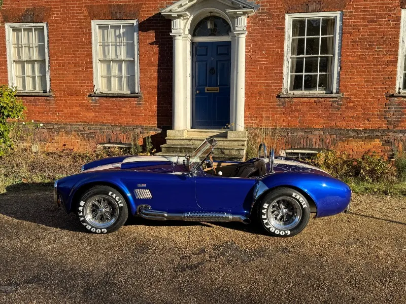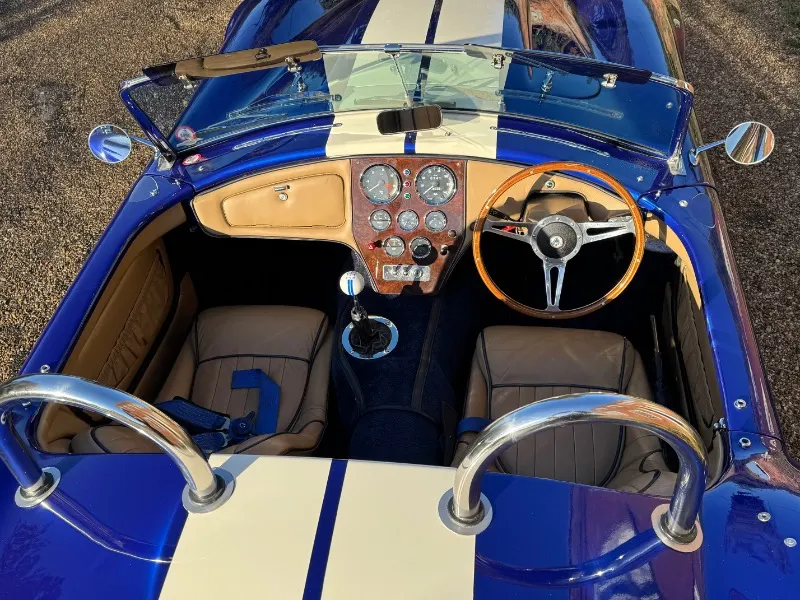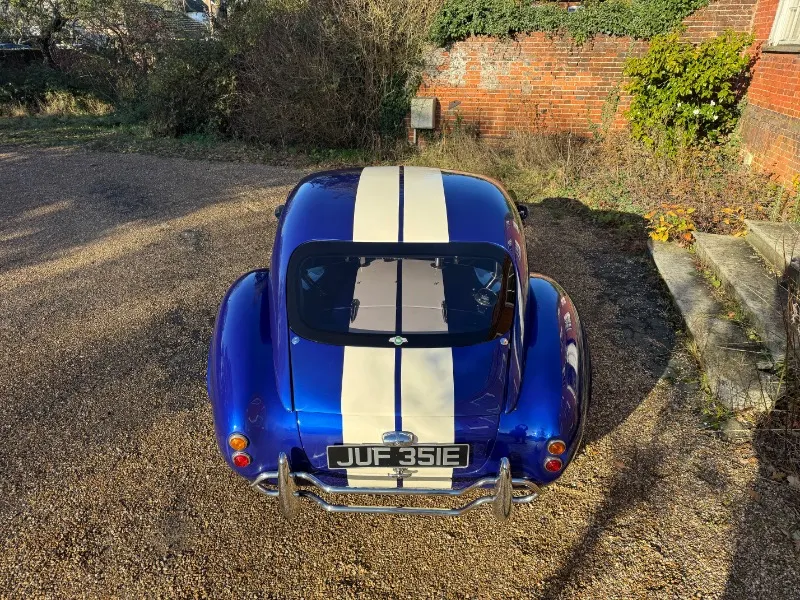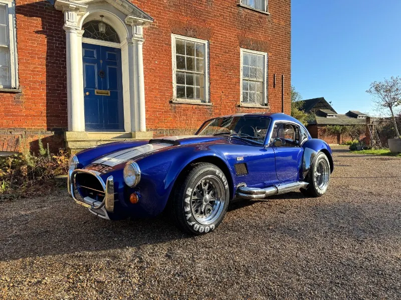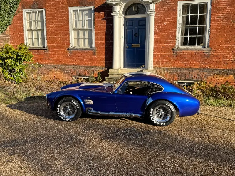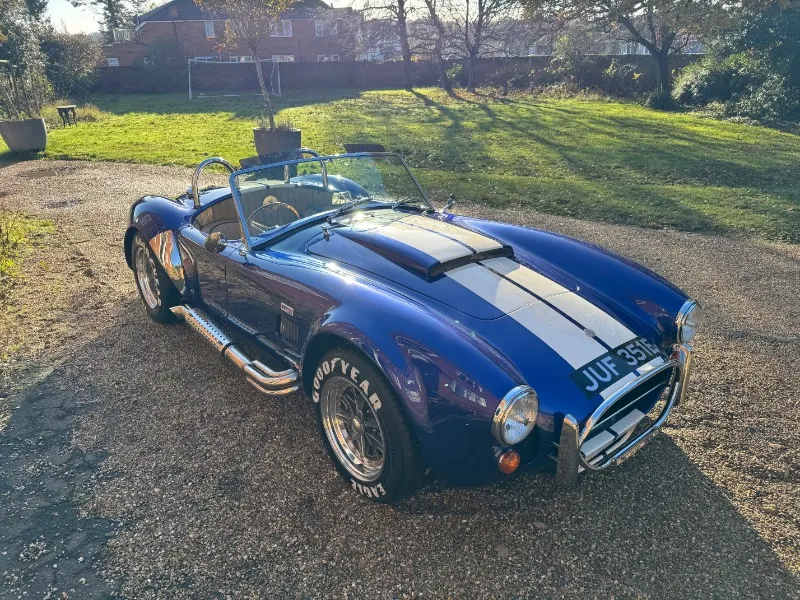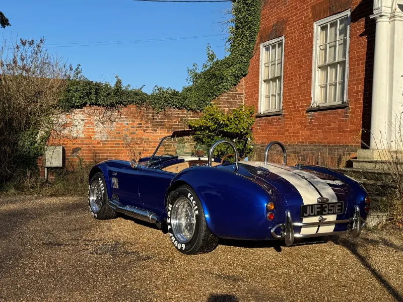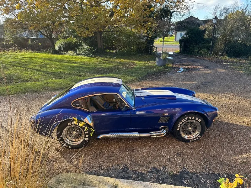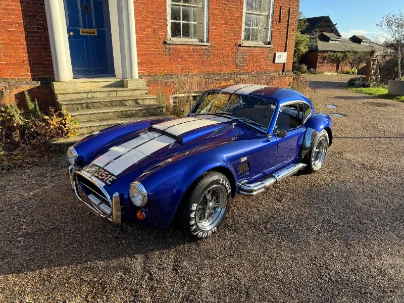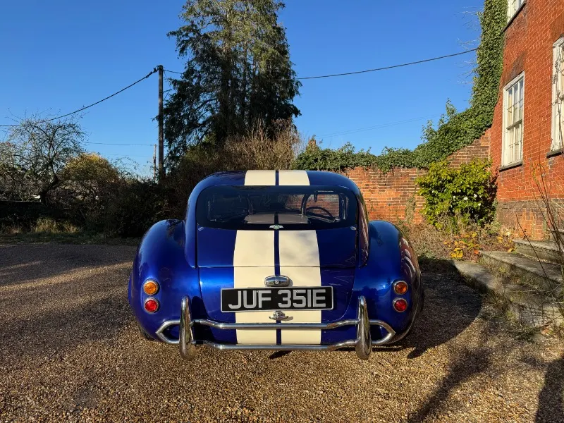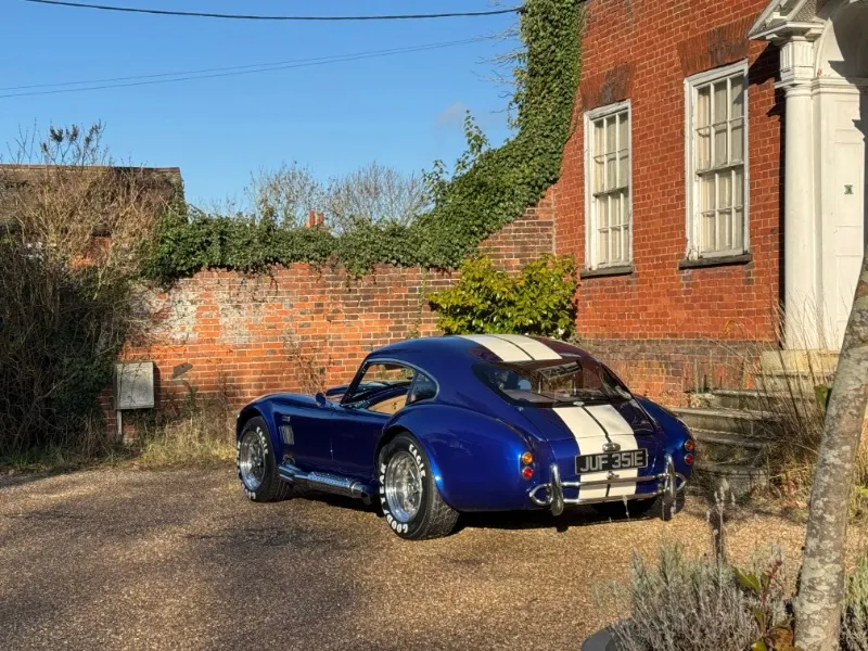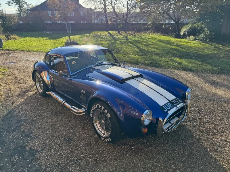 DAX COBRA + 427Hardtops fastback This superb DAX Cobra was correctly registered 21/12/1993 Only 19035 miles Finished in Imperial blue with Wimbledon white stripes Colour coded removable fastback hardtop by 427Hardtops, Grey flocked headlining, Side windows and wind deflectors. Detailed with Chrome bumpers, Stainless steel front splitter, PL700 Headlamps, Cobra badges, Chrome mirrors, Stainless steel wipers, Smoked sun visors, Chrome stone guards, Two single hoop roll bars, Chrome flip top fuel filler. 15” Compomotive Hallibrand alloy wheels with faux aluminium spinners. Tan leather interior with blue piping, Wood dash inlay, Blue wilton carpets, Moto-lita wood rim steering wheel, Smiths instruments, Lucas switches, Cobra gear knob, Willans Harness seat belts. Battery cuts off switch, Fire suppression system . Powered by a 5700cc 350ci H/O Chevrolet V8, See includes Chrome air filter, Holley 4 barrel carburettor, Performance inlet manifold, Aluminium heads, Finned polished aluminium rocker covers, HEI Distributor, Chrome alternator, Chrome pulleys, Braided hoses, Aluminium header tank, Remote oil filter and front oil cooler. Polished aluminium lined engine bay. Stainless steel headers and 4 into 1 stainless steel side pipes with heat shields, 4 Speed top loader manual gear box Powder coated DAX Tojiero chassis Jaguar differential and disc brakes all around Adjustable coil over shock suspension Large history folder with servicing and build recipes including original DAX invoices and registration paperwork Ideal for export as over 30 years since build £44995