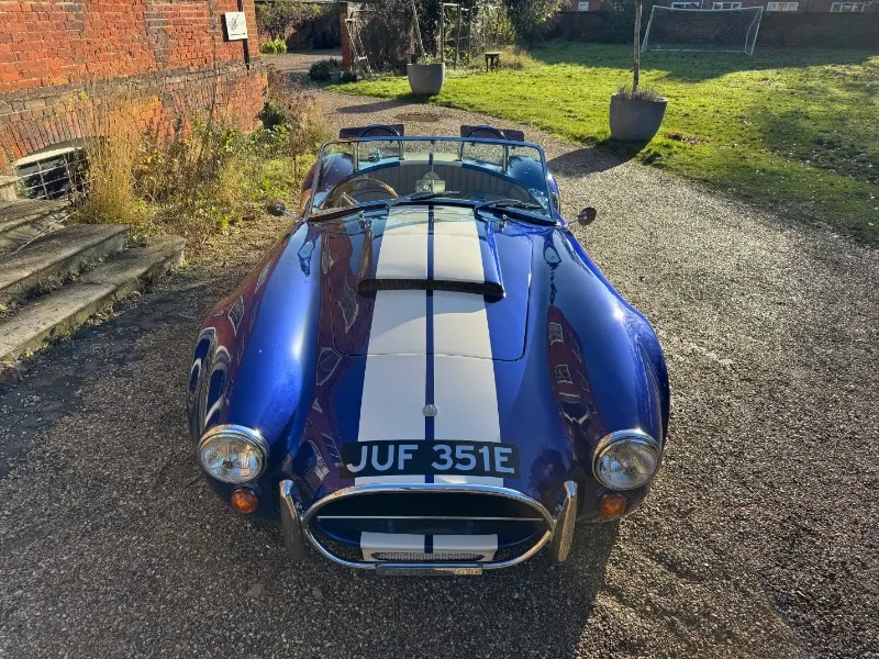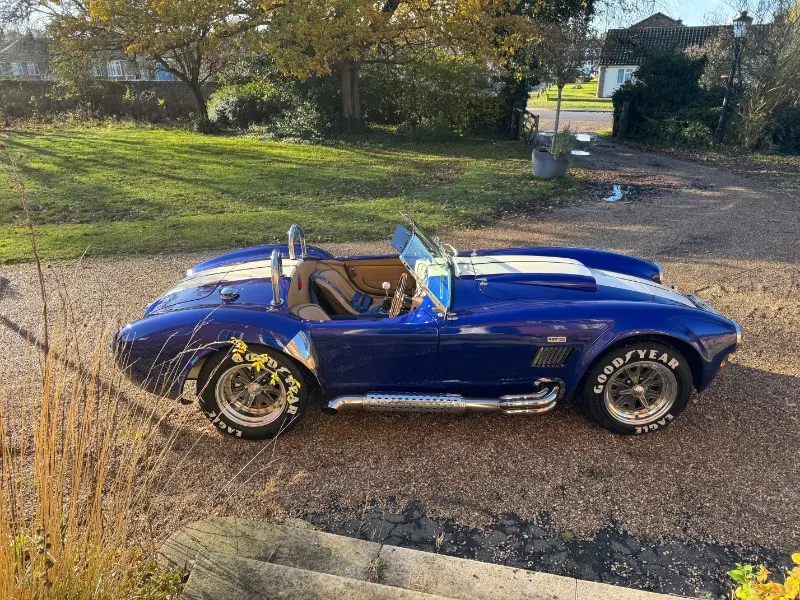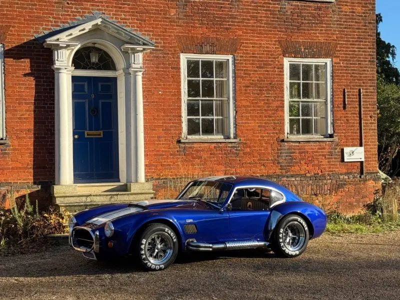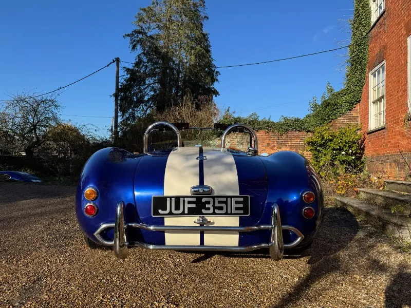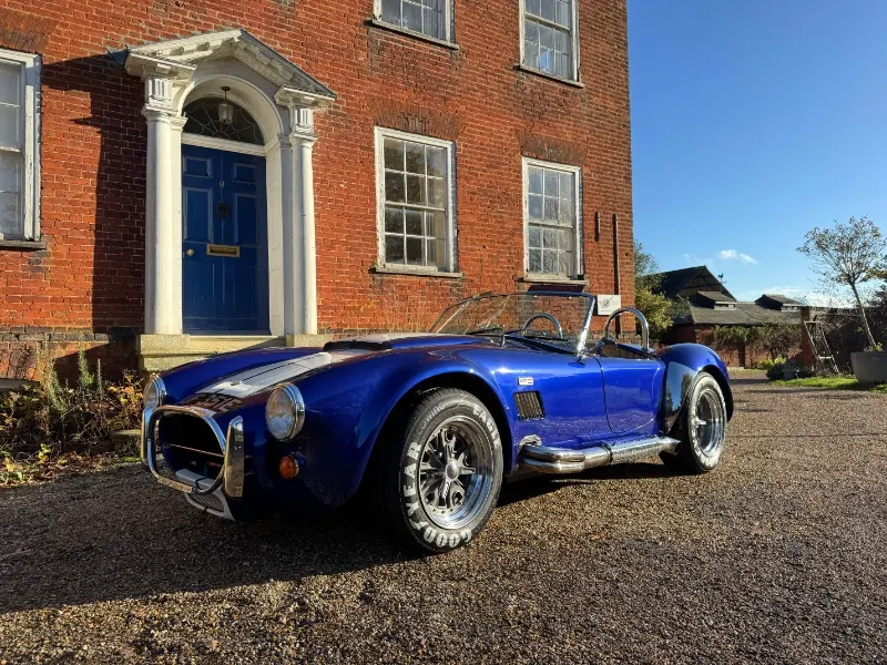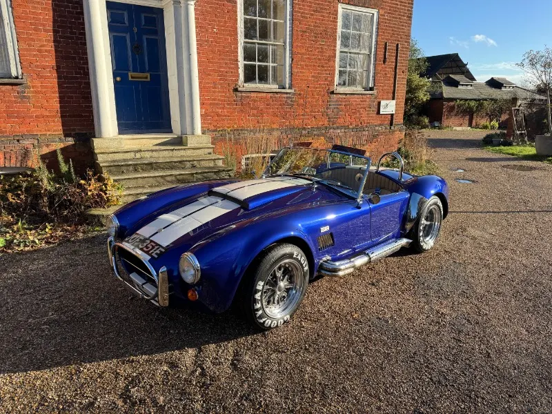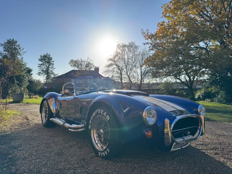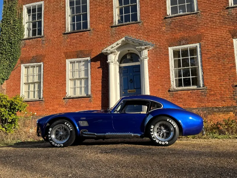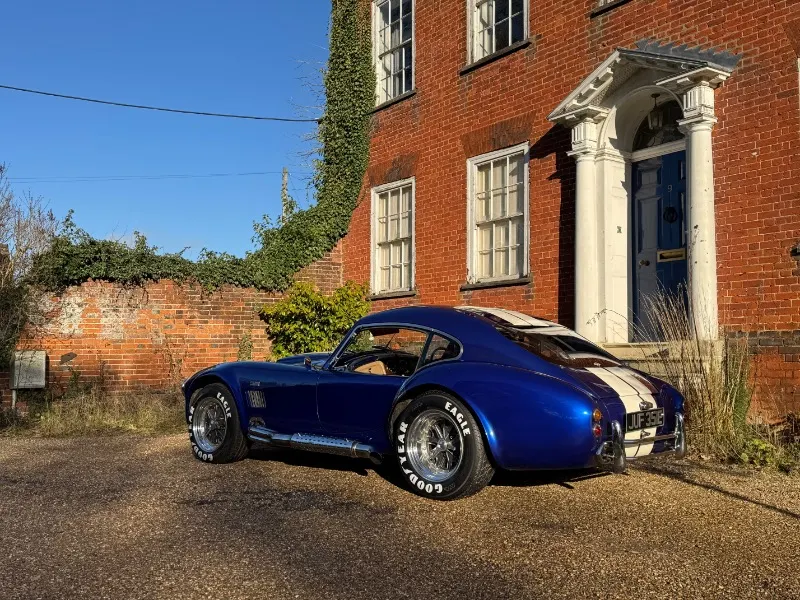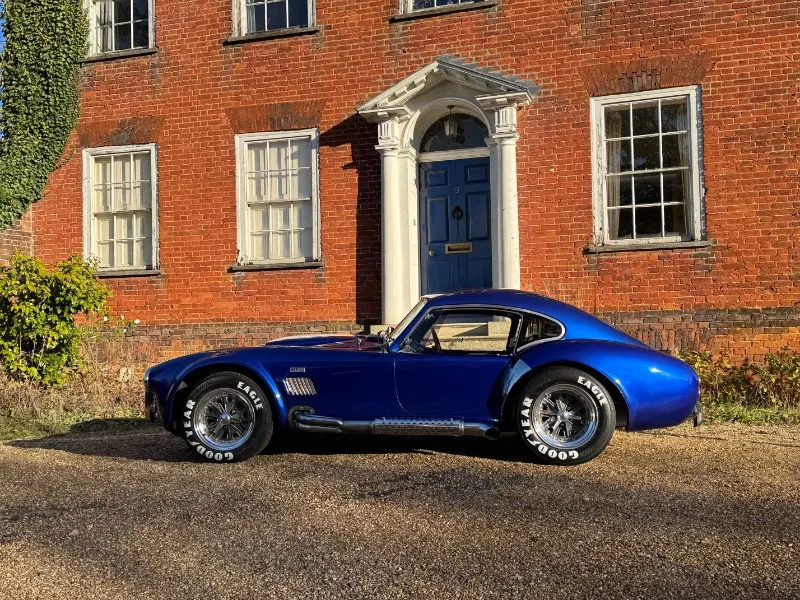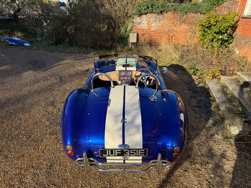 DAX COBRA + 427Hardtops fastback This superb DAX Cobra was correctly registered 21/12/1993 Only 19035 miles Finished in Imperial blue with Wimbledon white stripes Colour coded removable fastback hardtop by 427Hardtops, Grey flocked headlining, Side windows and wind deflectors. Detailed with Chrome bumpers, Stainless steel front splitter, PL700 Headlamps, Cobra badges, Chrome mirrors, Stainless steel wipers, Smoked sun visors, Chrome stone guards, Two single hoop roll bars, Chrome flip top fuel filler. 15” Compomotive Hallibrand alloy wheels with faux aluminium spinners. Tan leather interior with blue piping, Wood dash inlay, Blue wilton carpets, Moto-lita wood rim steering wheel, Smiths instruments, Lucas switches, Cobra gear knob, Willans Harness seat belts. Battery cuts off switch, Fire suppression system . Powered by a 5700cc 350ci H/O Chevrolet V8, See includes Chrome air filter, Holley 4 barrel carburettor, Performance inlet manifold, Aluminium heads, Finned polished aluminium rocker covers, HEI Distributor, Chrome alternator, Chrome pulleys, Braided hoses, Aluminium header tank, Remote oil filter and front oil cooler. Polished aluminium lined engine bay. Stainless steel headers and 4 into 1 stainless steel side pipes with heat shields, 4 Speed top loader manual gear box Powder coated DAX Tojiero chassis Jaguar differential and disc brakes all around Adjustable coil over shock suspension Large history folder with servicing and build recipes including original DAX invoices and registration paperwork Ideal for export as over 30 years since build £44995
