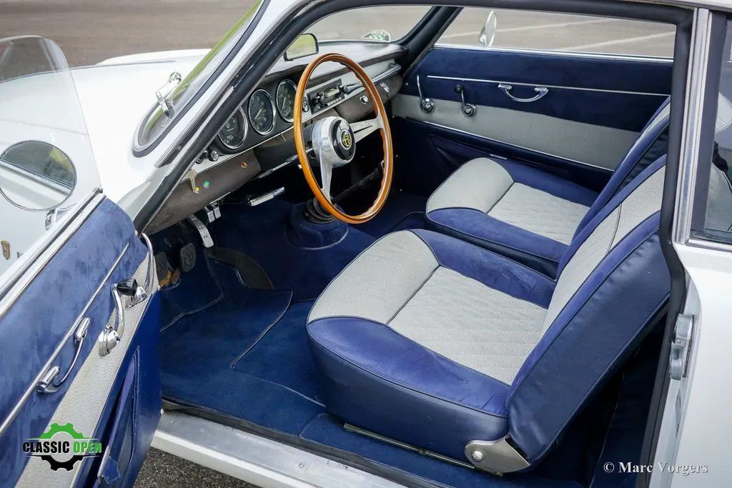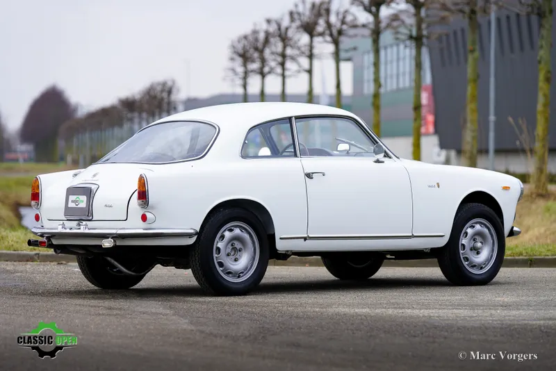Alfa Romeo Giulia 1600 Sprint, year 1963. White exterior colour (Bianco Gardenia) combined with a ‘two-tone’ blue/grey interior. The seats are covered with dark blue Alcantara with grey cloth centres and blue leathercloth sides. Blue carpet and blue sun visors complete the interior. This gorgeous Alfa Romeo Giulia 1600 Sprint was sold new in Italy. In 2009 the car was imported to the Netherlands. Then the car was extensively restored and overhauled, a photo report and many invoices of the works are present in the history file. The interior was also newly upholstered. The 1570 cc twin-cam four-cylinder engine, the five speed gearbox, the clutch, and the brakes (drum brakes around) work and operate perfectly. The engine sound and exhaust note are truly addictive! The car is fitted with wonderful alloy wheels shod with Vredestein Sprint Classic tyres and a fast filler petrol cap on the left back. The latter is a modification to prevent petrol fumes entering the interior because the original petrol filler cap is located inside the boot. The Alfa Romeo Giulietta/Giulia Sprint was designed by Bertone and introduced in 1954. The Giulietta was renamed Giulia in 1962 to fit within the new model programme. The Giulia 1600 Sprint is the final edition of this very successful Alfa Romeo model series. Only 7100 cars of this final edition were built. This example is in a very good to excellent condition throughout, and it will be a great driver car to participate in challenging and fun historic touring events! We speak Dutch, English , German and French. Our cars can be delivered with Dutch, German or Belgium registration. We can assist with the French registration. Transport to your door is possible. We have our own workshop facility with 30 years experience with classic cars.