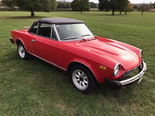 1979 Fiat 124 Spider 2.0 injection. Bright red, Black cloth piped Red and Black soft top. ...