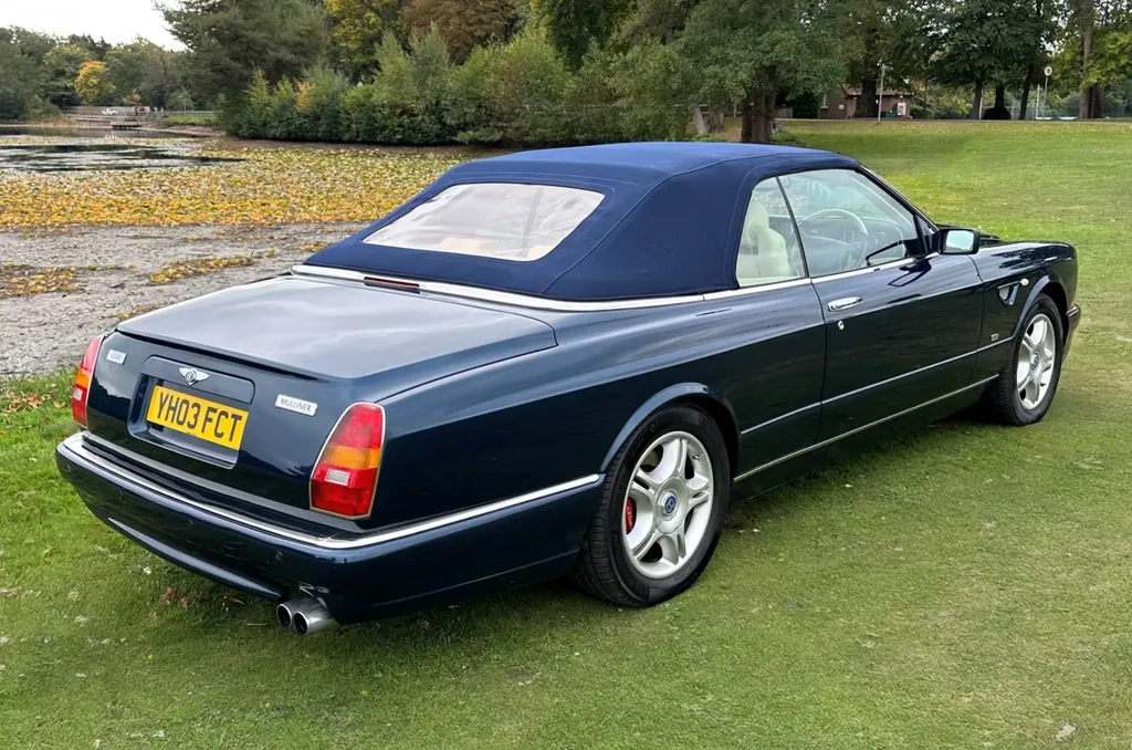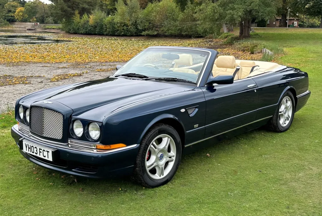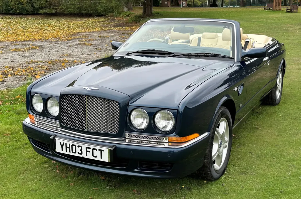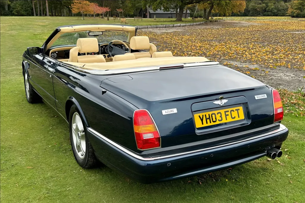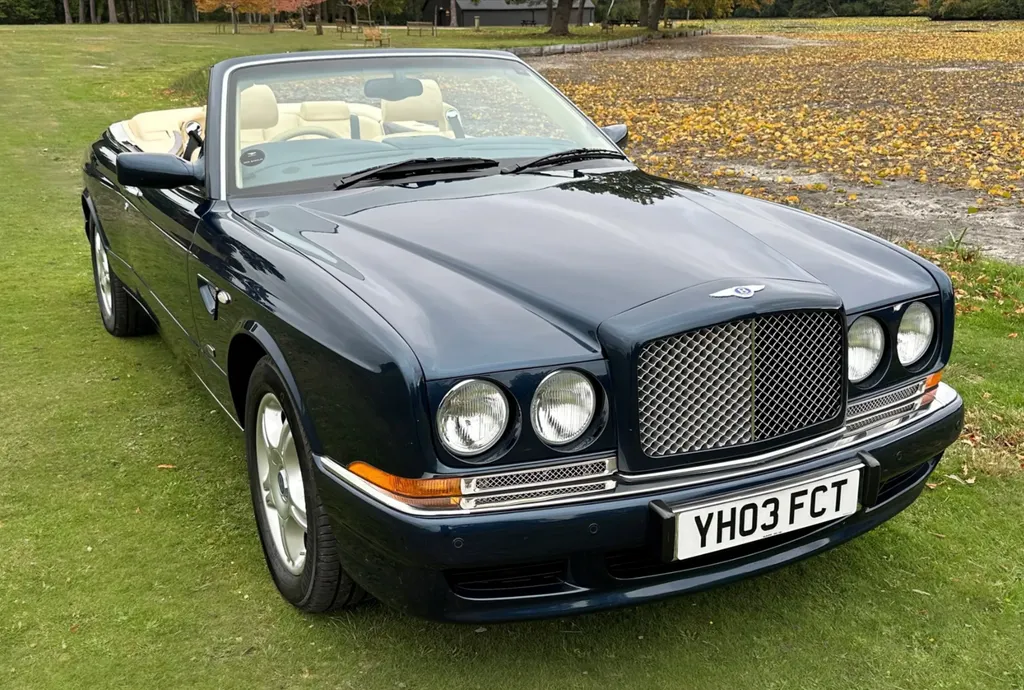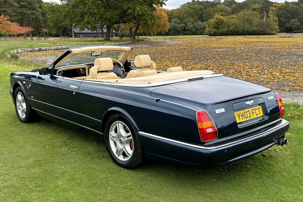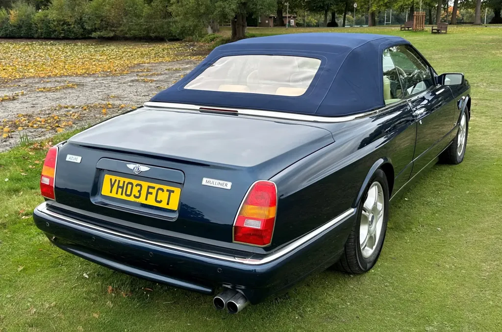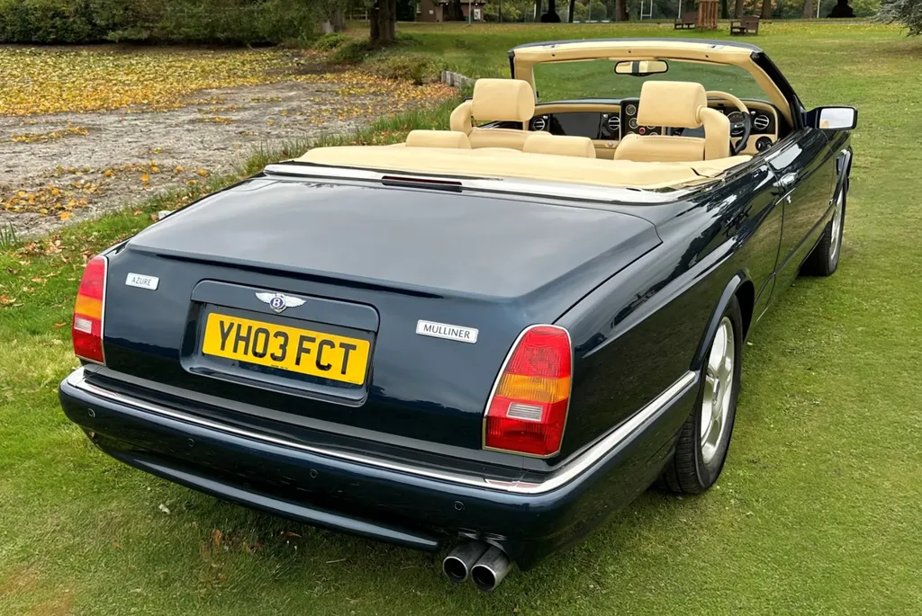 One of just fifteen right hand drive examples of this final variation Two private owners from new, the first from 2003 to 2023 Under 10,000 miles from new Very good main dealer service history and more recently maintained by us One of the most popular colour combinations available In excellent condition in every respect Fitted with wing vents, diamond quilted seats and a raft of special features A top class modern classic in the making and highly collectible. Chassis No SCBZK26EX3CH01203 was originally completed and registered in May of 2003 and supplied by Broughtons of Birmingham. It was specified in Royal Blue with a dark blue cloth hood and a magnolia leather interior. Being an Azure Mulliner Final Series Performance variant, it came with a number of special features which include but were not limited to diamond quilted seats, dark burr walnut woodwork, Bentley wings inlaid in the woodwork waist rails, a Continental T instrument layout, starter button, turbo boost gauge, five spoke alloy wheels, wing vents, Mulliner badges, chrome instrument bezels and drilled pedals. It was retained by the original owner from 2003 to 2023 and comes with excellent main dealer service history, with eleven stamps in the service book. The car was brought to us in late 2023 by the second and present private owner who instructed us to prepare the car for him, with a new set of tyres, plus a service and check over. We are now delighted to be offering this very rare late production for sale. It is one of just sixty-two examples built to this Final Series Performance specification, of which just fifteen were believed to have been built-in right-hand drive. It has covered just under 10,000 miles from new and is in excellent condition in every respect. A top class, low mileage, highly collectible modern classic in the making. The Bentley Continental R was unveiled in 1991 after six years of development and it became an instant success. Its stylish sports coupe coachwork captured the imagination of Bentley enthusiasts, and the orders flooded in. The success of the Continental R and the slightly sportier Continental T made it inevitable that a convertible variant would be developed and in 1995 Sergio Pininfarina was approached and given the task of styling the Bentley Continental R convertible which became known as the Azure. Between 1995 and 2003 just over 1,300 Azures were built, with improvements and modifications implemented as time went by. Several low production variants were made during this time, from the Jack Barclay Special, to the Mulliner Editions, to the Le Mans variant. The final hurrah for this model came in the form of the Azure Mulliner Final Series Performance in 2003.