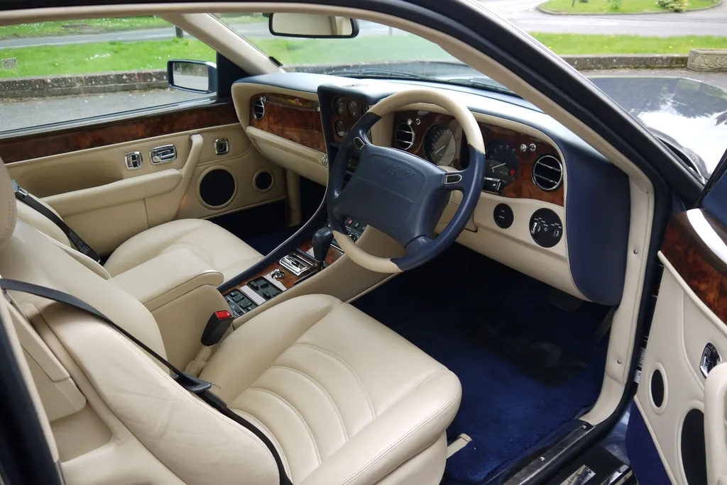 Meteor with Cotswold hide contrast French Navy and Burr Walnut veneer. 40,000 miles with two owners and full service history with some maintenance by P & A Wood. One of only 63 right hand drive Mulliners made, with the Continental T wide body on the R length chassis. Excellent condition and considered as a rare and desirable modern classic Bentley.