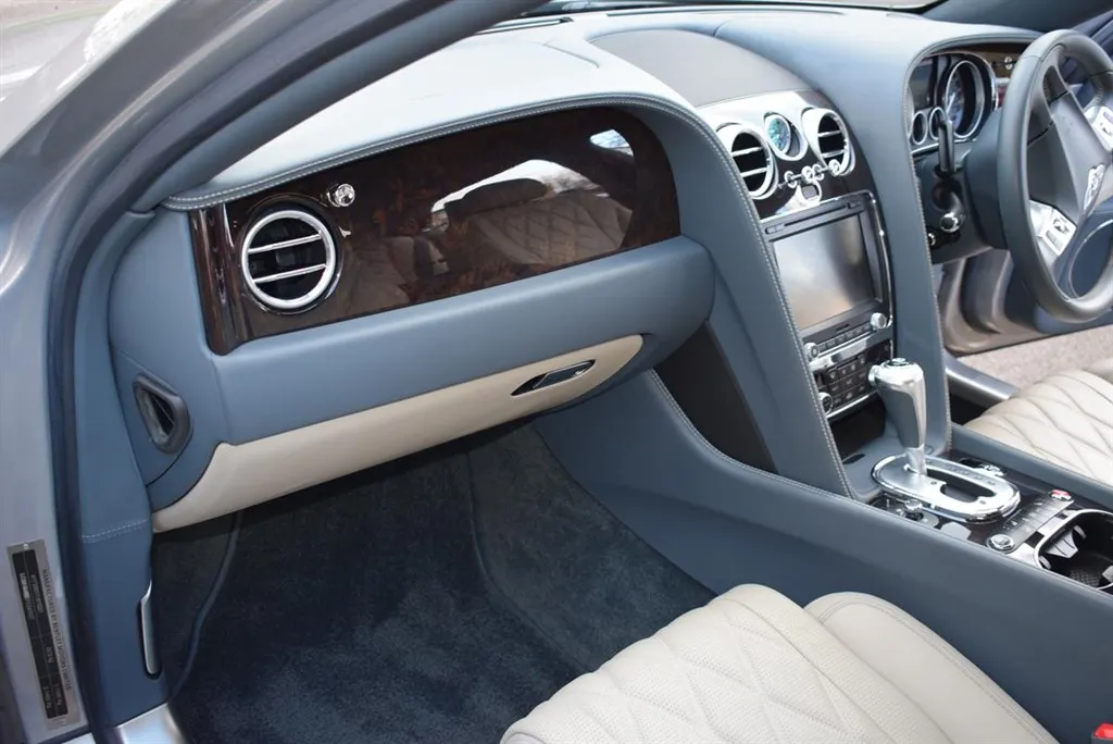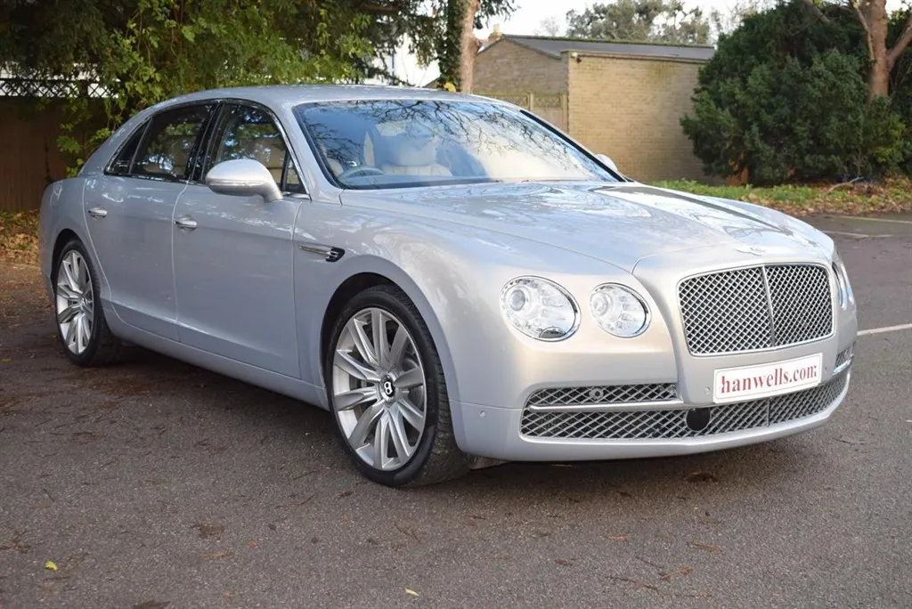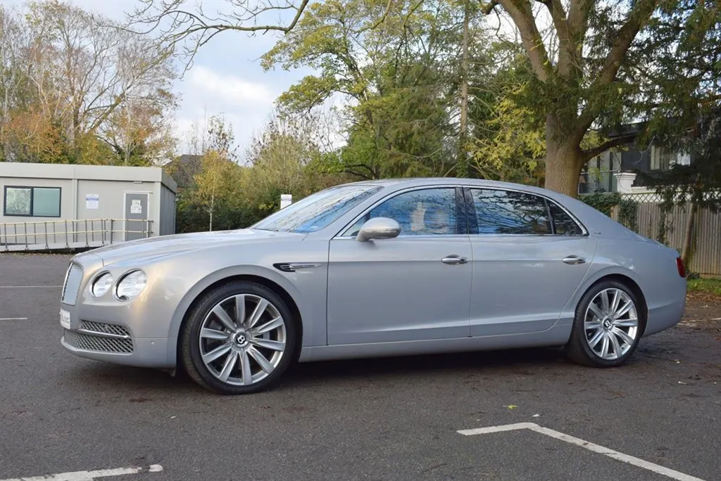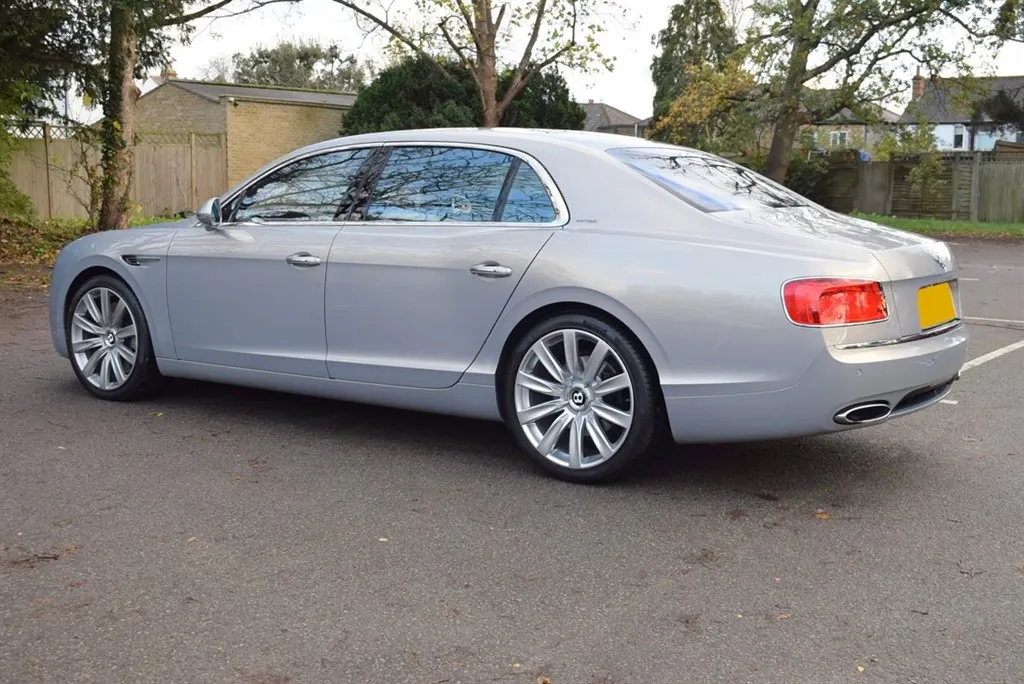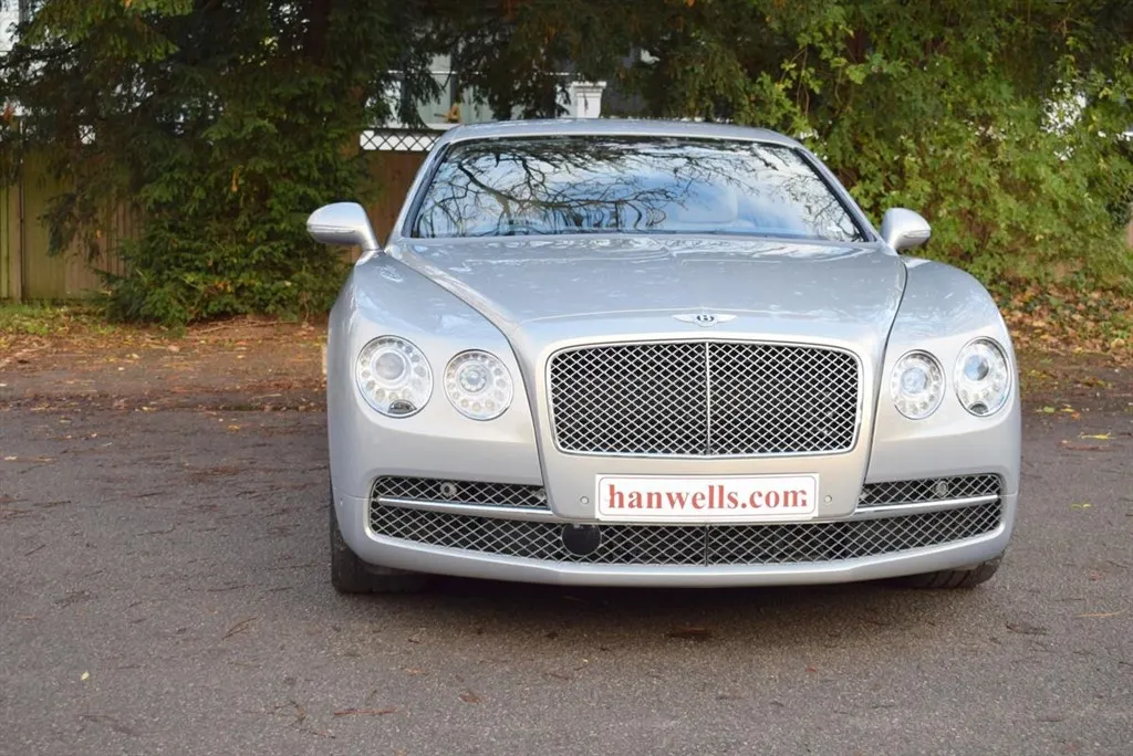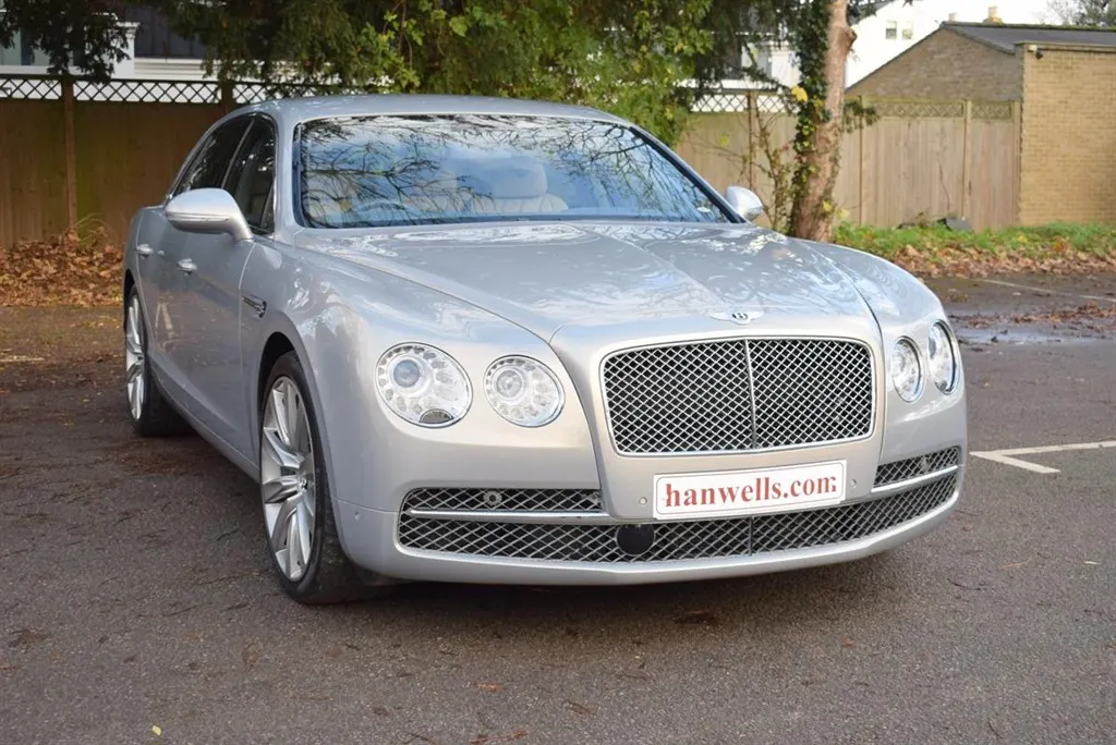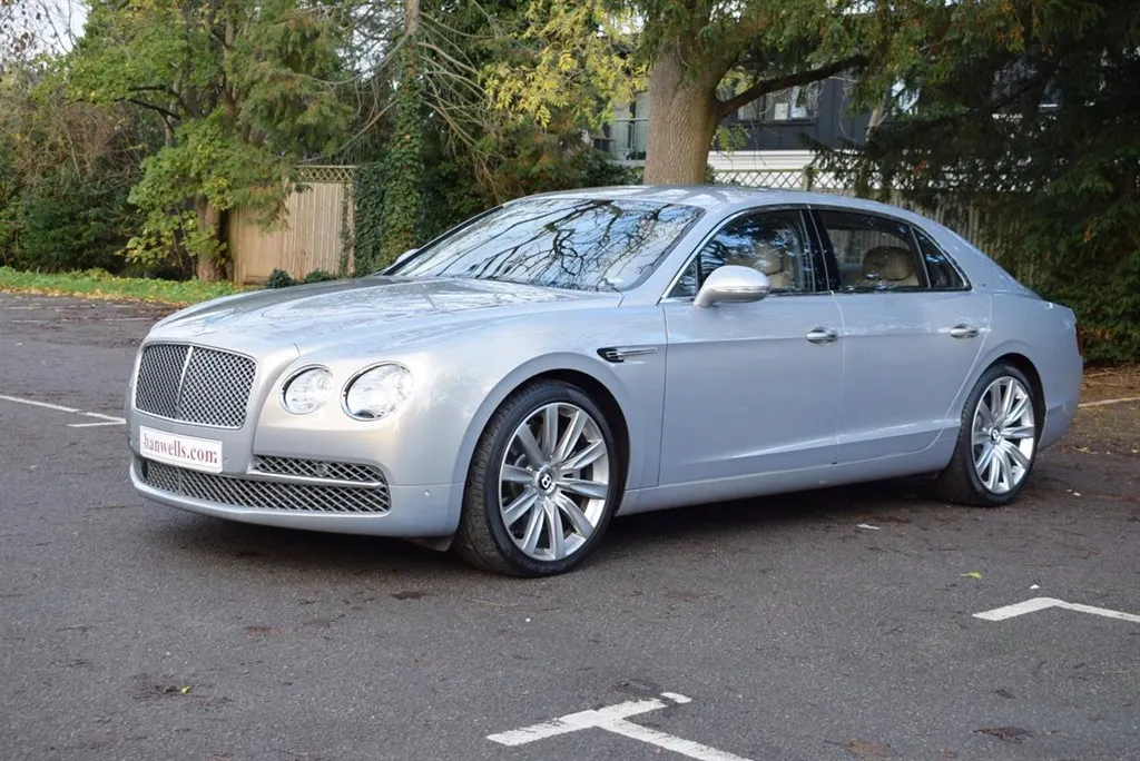 2014/64 (2015 Model) Bentley Flying Spur W12. Finished in unmarked Extreme Silver with ten spoke propeller alloy wheels. The interior is trimmed in Portland leather with Brunel Pale Grey secondary hide, with contrast stitching, embroidered Flying B’s to head restraints and dual trimmed three spoke steering wheel. Full Mulliner specifications including Comfort spec. and full length centre console. Fitted with rear screens, picnic tables, refrigerated bottle cooler and Naim Bentley sound system plus many other extras. Only 38,000 miles with full history. Immaculate throughout, outstanding value at only £41,950