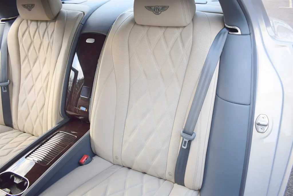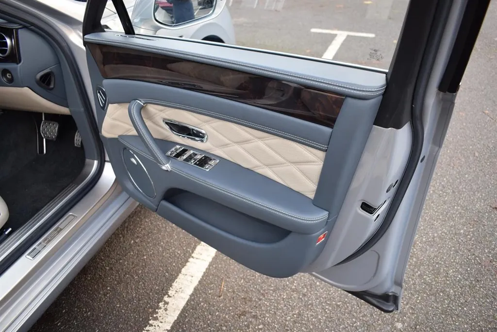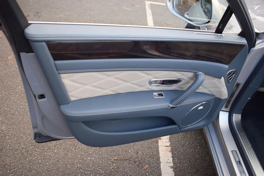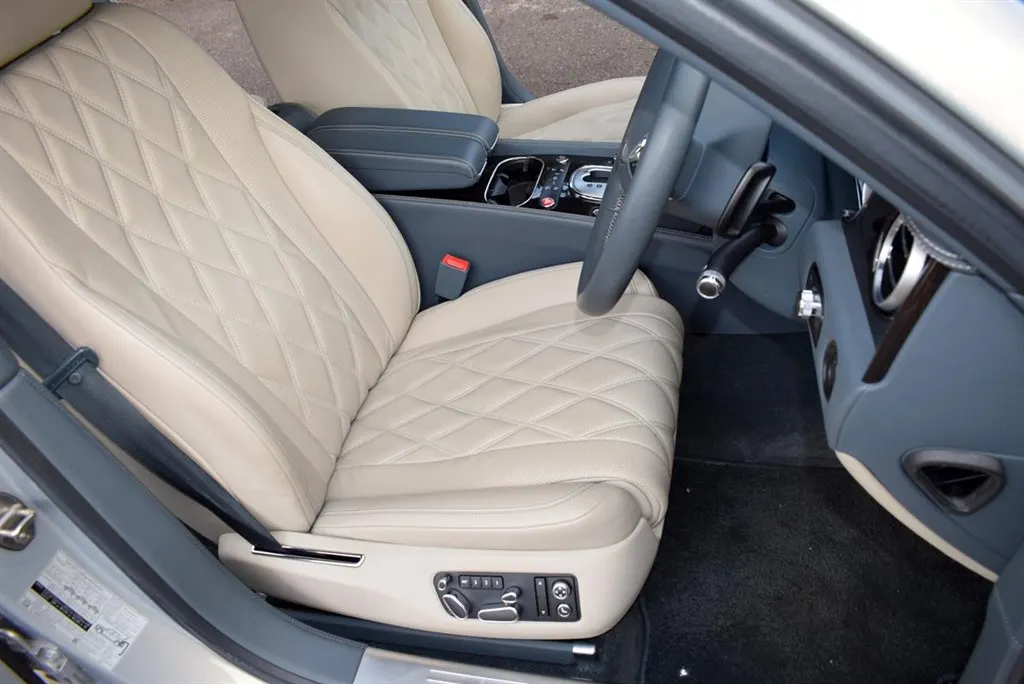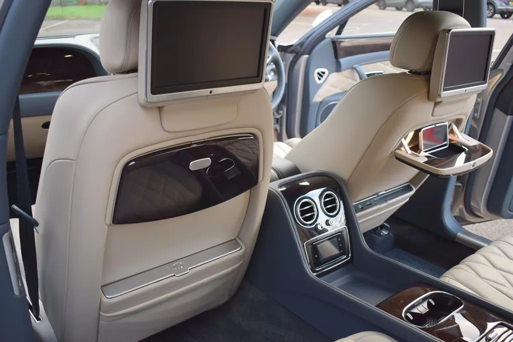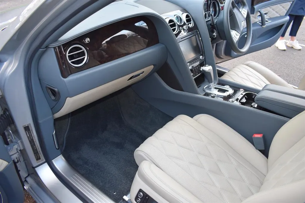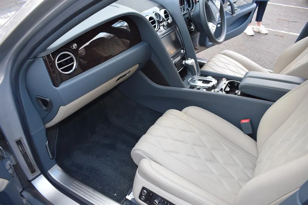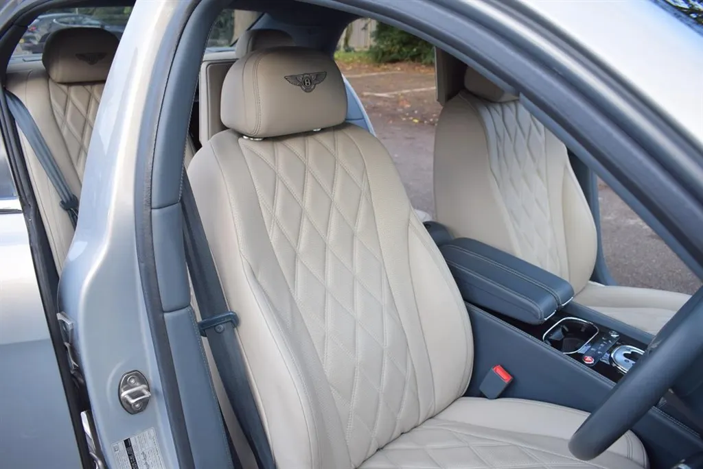 2014/64 (2015 Model) Bentley Flying Spur W12. Finished in unmarked Extreme Silver with ten spoke propeller alloy wheels. The interior is trimmed in Portland leather with Brunel Pale Grey secondary hide, with contrast stitching, embroidered Flying B’s to head restraints and dual trimmed three spoke steering wheel. Full Mulliner specifications including Comfort spec. and full length centre console. Fitted with rear screens, picnic tables, refrigerated bottle cooler and Naim Bentley sound system plus many other extras. Only 38,000 miles with full history. Immaculate throughout, outstanding value at only £41,950