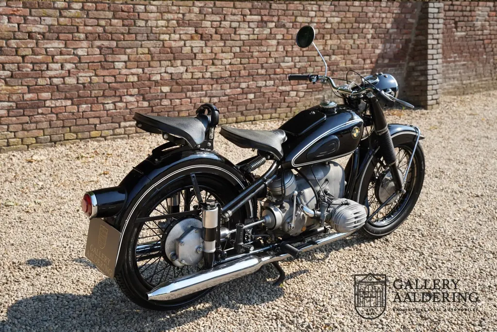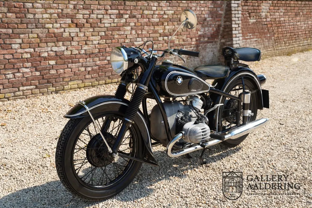 Price reduction!! from €21.950,- now €17.500,- This vehicle is part of Gallery Aaldering’s temporary Price Reduction Campaign. For a limited time, a carefully curated selection of our most distinguished classic and collector cars is being offered at specially reduced prices. Each vehicle embodies the spirit of motoring excellence chosen for its authenticity, heritage, and character. This campaign offers a unique opportunity for enthusiasts and collectors to acquire their next timeless automobile at an exceptional value, while enjoying the uncompromising quality and passion that define Gallery Aaldering since 1975. Don’t wait too long! This sale is only valid for one month and ends on December 15. Contact our team now and discover how this (classic) car could be yours. Your dream car is waiting. An important step forward in the development of BMW‘s long-running flat-twin occurred in 1936 with the introduction of the 494cc R5. Prior to that the BMW engine had been recognisably related to the first of its type, the 1923 R32, and like those of its (500cc) predecessors, the R5’s engine dimensions were ‘square’ at 68x68mm bore/stroke. However, the overhead-valve R5 engine broke new ground by adopting two chain-driven camshafts, a move that permitted shorter pushrods and higher revs. In 1938 the model was up-dated as the R51, gaining a telescopic front fork and plunger rear suspension, and continued in production until 1940. BMW recommenced civilian production in December 1948 with the R24 single, but it would be another 12 months before a twin-cylinder model became available again. This was the R51/2 based, as its designation suggests, on the pre-war R51. Improvements incorporated into the R51/2 included a two-way damped front fork, gearbox main-shaft damper and strengthened frame. In truth, the R51/2 was only a stopgap model to get production under way while BMW worked on something more modern. Its replacement, the R51/3 – arrived in February 1951, and despite the similarity in designation had an entirely new and much neater looking engine incorporating a single gear-driven camshaft and crankshaft-mounted generator among a host of other advances. It is believed that this matching-numbers R51/3 was delivered new to The Netherlands, as a registration document (on file) confirms that it was in that country in 1955. It is also believed that the machine remained in The Netherlands up to the end of the 1990s. Around 2000, the R51/3 was fully restored by the BMW motorcycle specialists Oldlima in Belgium. Since its acquisition by our vendor in 2008 the machine has not been registered in his name, but it does come with a Belgian Demande d’Immatriculation and more importantly its old Dutch registration documents. BMW’s don’t come much more classic than this beautiful R51/3, which is guaranteed to turn more heads at a gathering of enthusiasts than any of the marque’s more modern offerings… Gallery Aaldering is Europe’s leading Classic Cars specialist since 1975! Always 400 Classic and Sportscars in stock, please visit www.gallery-aaldering.com for the current stock list (all offered cars are available in our showroom) and further information. We are located near the German border, 95 km from Düsseldorf and 90 km from Amsterdam. So easy traveling by plane, train, taxi and car. Transport and worldwide shipping can be arranged. No duties/import costs within Europe. We buy, sell and provide consignment sales (selling on behalf of the owner). We can arrange/provide registration/papers for our German (H-Kennzeichen, TÜV, Fahrzeugbrief, Wertgutachten usw.) and Benelux customers. Gallery Aaldering, Arnhemsestraat 47, 6971 AP Brummen, The Netherlands. Tel: 0031-575-564055. Quality, experience and transparency is what sets us apart. We look forward to welcoming you in our showroom