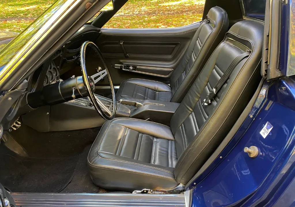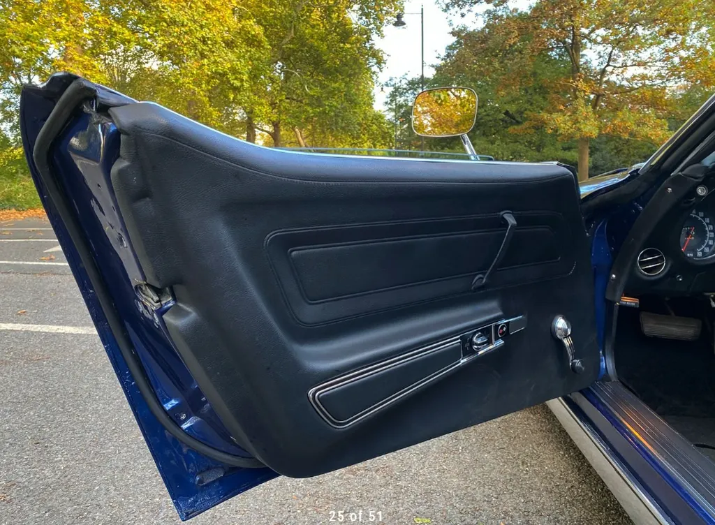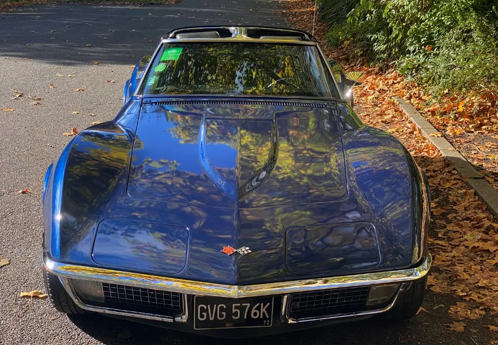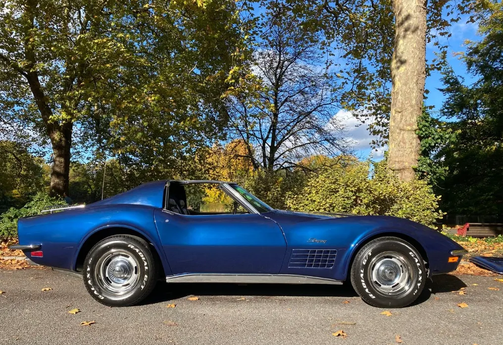 Recently imported from the good old US of A this cracker has been treated to some very worthwhile updates over the last 18 months. Finished in Targa Blue metallic with black interior, factory air conditioning (not connected), power steering and automatic transmission. The newly suppled Vortec engine has been supplied by EMC Performance Parts. Vortec block with worked Vortec heads, competition roller camshaft - the heads were £ 1.000 alone. An Edlebrock AVS2 carburettor sits on a matched Edlebroch inlet manifold - as Edlebrock says themselves, "the future of carburetion". The exhaust system from the manifolds is stainless steel, 2" - 2.5" giving a better exhaust flow and a fruity sound too. The engine builder suggests about 375 - 400bhp. Upon arrival to these shores she was stripped, painted as required and a new interior fitted - seats, foams, covers, dashboard, console, door cards, carpets, seat belts, and a modern Corvette radio adds the finishing touch. Outside new chrome has been fitted as well new badges - all fresh from the States. Tyres, shock absorbers, front end wiring loom replaced, servo's for headlights & wipers have all been replaced too. Whilst looking at the engine, it wouldn't be any good if the drive train was ignored, and yes the gearbox has been rebuilt and the rear axle has been, drained, serviced with new additive & oil. Since arrival and being finished she has trundled down to Le Mans and back again without any issues, apart from the local French villagers stopping conversations until the Corvette passes through and only 2.500 miles have been travelled. So all in all, and car which has been run-in, snagged as required, and ready for the new owner to use in any way required. Oh, almost forgot, T Top covers are in place for storage when not in use (not often found). The '72 version of the Coke Bottle Corvette is the last to enjoy the chrome bumpers at both ends, so the last of the original shape, and all the better for it. The view from the cabin is amazing with the front fenders sooo high you have to be impressed that a manufacturer could build a car with such huge shapes back then. She sounds delightfully American - loud and brash - and that's why we love her.
