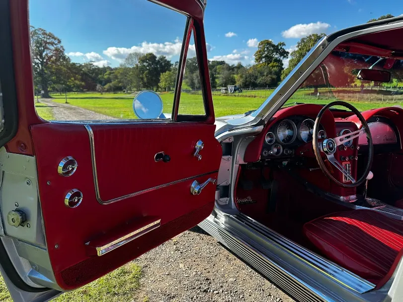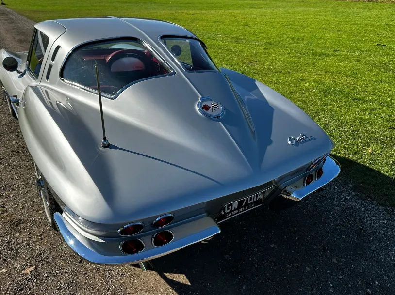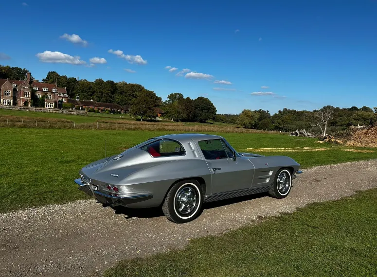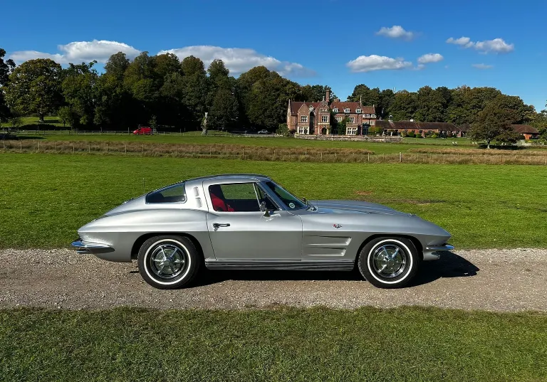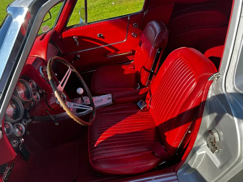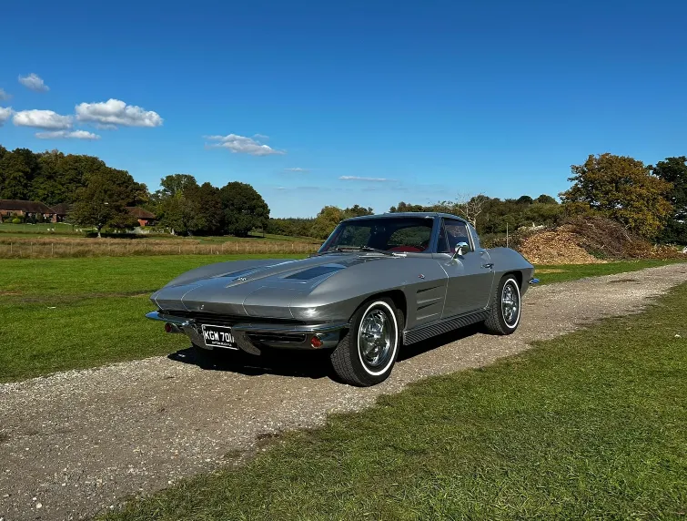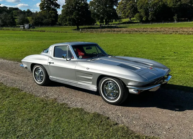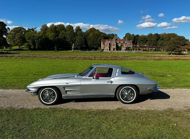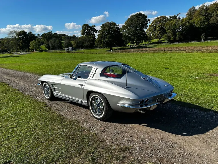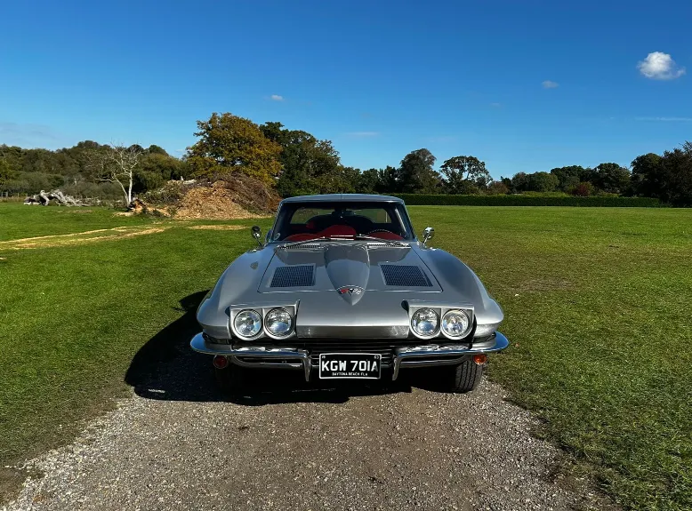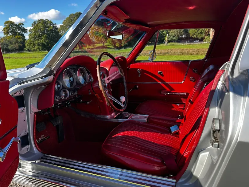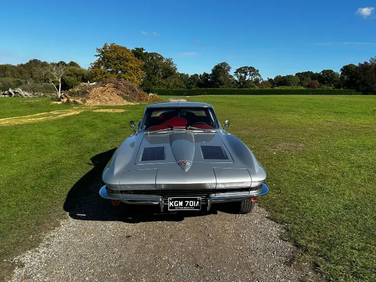 1963 Corvette Stingray Split Window. 56 thousand Kilometres showing. Finished in Sebring Silver with Red Leather interior. Powered by the desirable 327ci 5.4 V8 engine, producing 300 Horsepower. Four speed manual gearbox. On the 15th of April 1963, this Corvette was first delivered to Chevrolet dealer Spence Chevrolet, on Daytona Beach. It has spent most of its life in Florida. The colour and trim are as original with even the seats believed to be original. Correct original AM/FM radio. It is fitted with an ‘LSD Powerlock’ differential and power steering. The front brakes have been upgraded to 1965 specification in interests of safety. The car is sitting on period correct wheels. Flow Master Mufflers. A new fuel tank has also been fitted. The history file includes a NCRS (National Corvetter Registers Society) certificate, a copy of the original bill of sale, various invoices and more. This Corvette is in lovely condition throughout. It is the perfect example for any collector or enthusiast, as the split window was only made in 1963, and also the first Corvette to use the Stingray name. For further enquiries or to arrange a viewing, contact our sales department on 01435489575 or sales@classicconnection.co.uk. £139,995 any inspection welcome and delivery available.