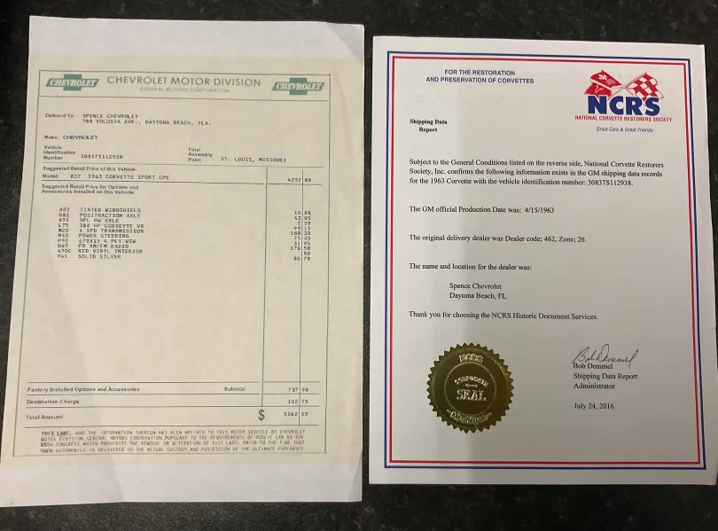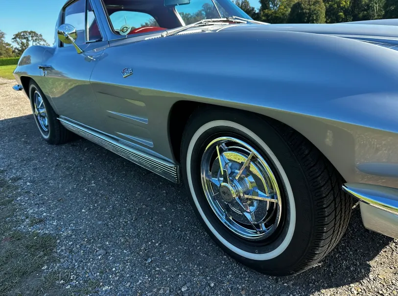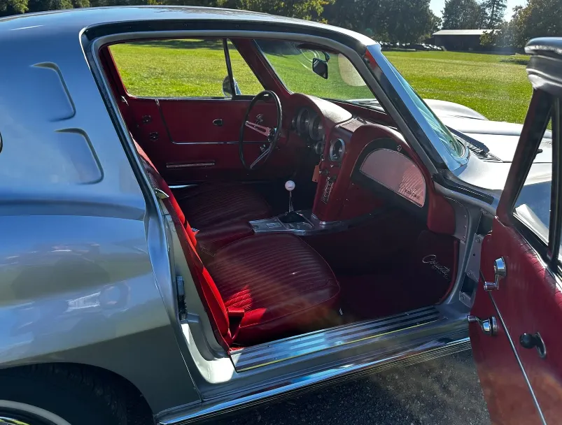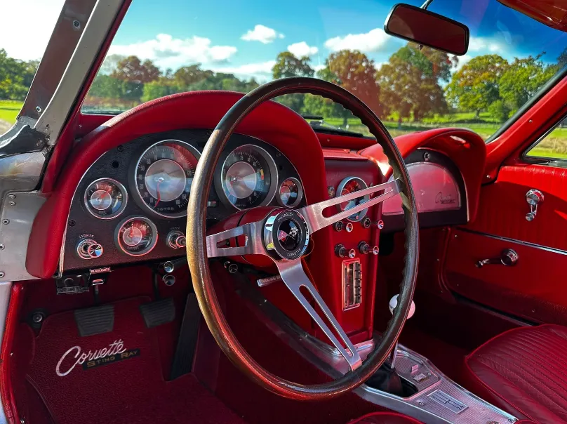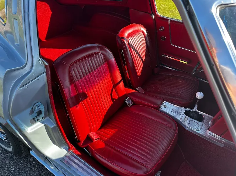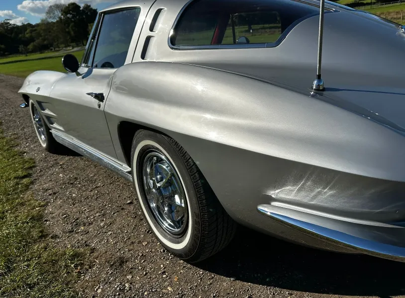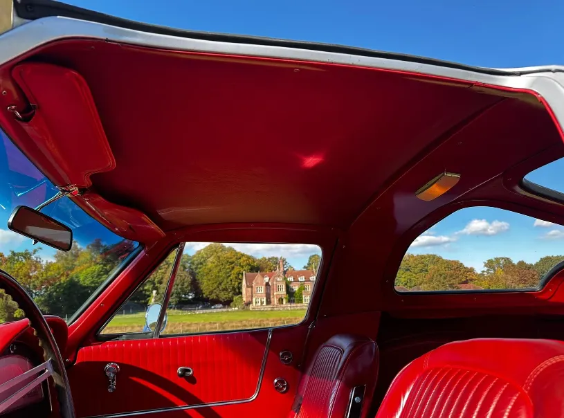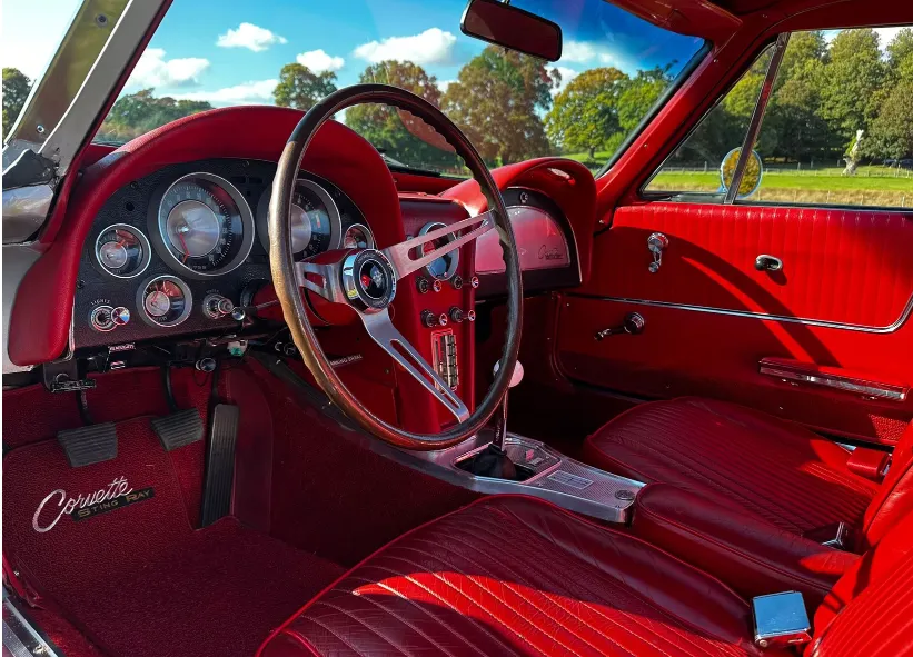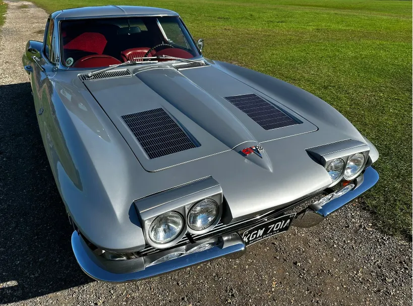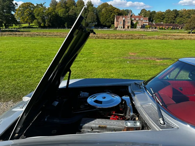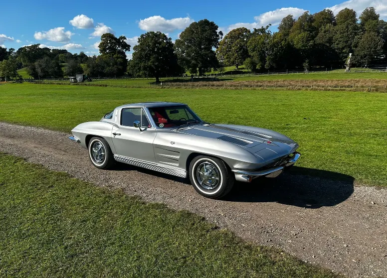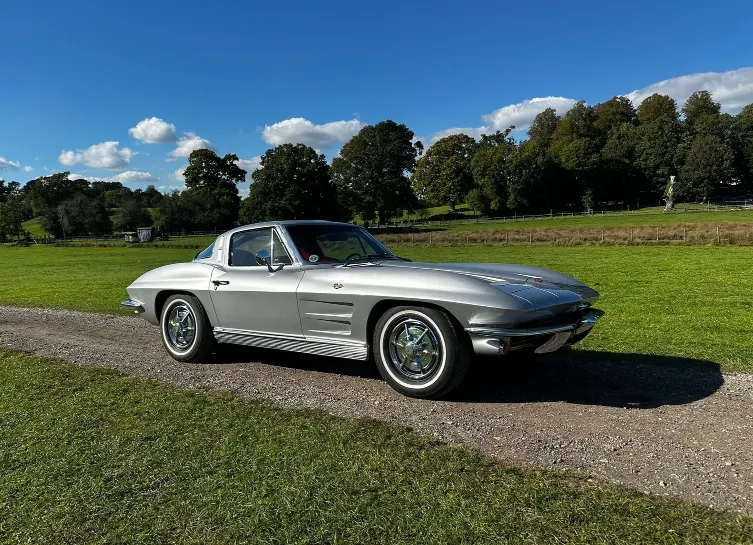 1963 Corvette Stingray Split Window. 56 thousand Kilometres showing. Finished in Sebring Silver with Red Leather interior. Powered by the desirable 327ci 5.4 V8 engine, producing 300 Horsepower. Four speed manual gearbox. On the 15th of April 1963, this Corvette was first delivered to Chevrolet dealer Spence Chevrolet, on Daytona Beach. It has spent most of its life in Florida. The colour and trim are as original with even the seats believed to be original. Correct original AM/FM radio. It is fitted with an ‘LSD Powerlock’ differential and power steering. The front brakes have been upgraded to 1965 specification in interests of safety. The car is sitting on period correct wheels. Flow Master Mufflers. A new fuel tank has also been fitted. The history file includes a NCRS (National Corvetter Registers Society) certificate, a copy of the original bill of sale, various invoices and more. This Corvette is in lovely condition throughout. It is the perfect example for any collector or enthusiast, as the split window was only made in 1963, and also the first Corvette to use the Stingray name. For further enquiries or to arrange a viewing, contact our sales department on 01435489575 or sales@classicconnection.co.uk. £139,995 any inspection welcome and delivery available.