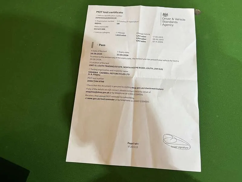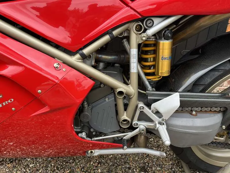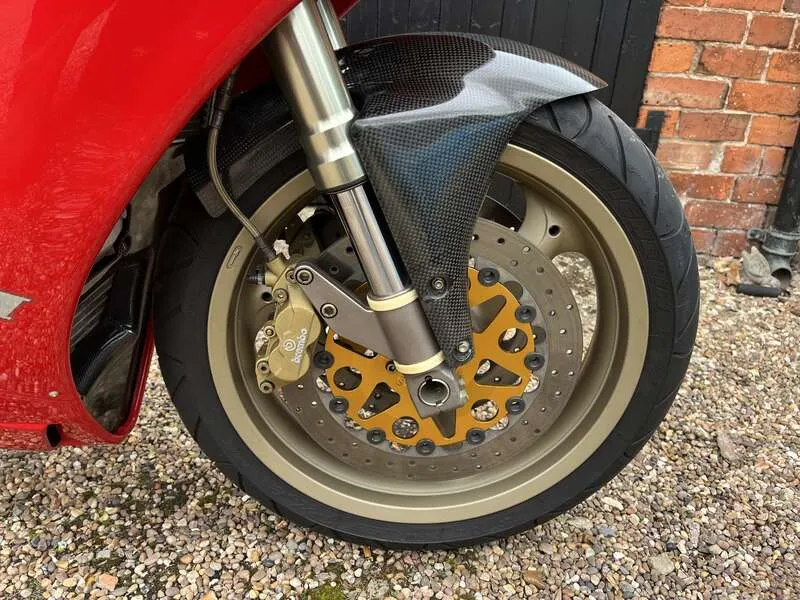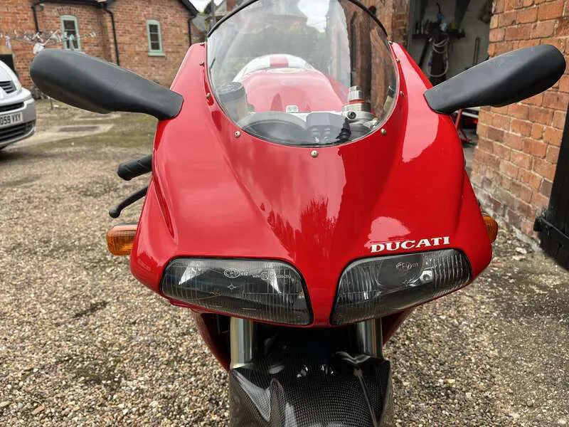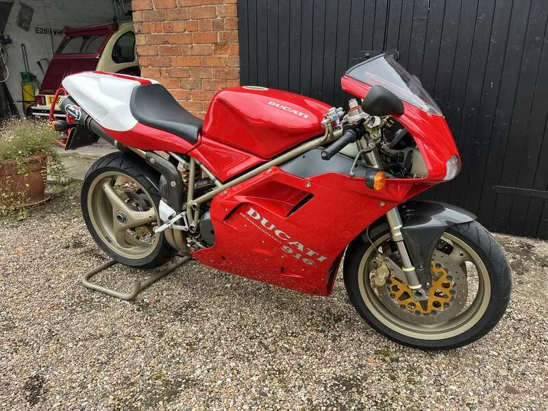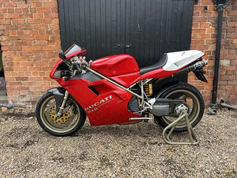 This lot will be auctioned via Iconic Auctioneers, The Iconic Motorcycle Sale at the NEC Classic Motor Show 2025 on Sunday the 9th of November, NEC, Birmingham, B40 1NT. Offering 134bhp and 170mph, the legendary 916 SPS (Sport Production Special) was a truly fearsome machine A limited edition, it retailed at nearly £10,000 more than the standard Biposto It featured Öhlins suspension (rear shock, steering damper), lightweight components, and a strengthened frame for sharper handling Highly sought after today due to its rarity, race pedigree, and being one of the most desirable Ducatis of the era Dating from 1997, this striking example has never been restored, but well maintained and mechanically upgraded With its first owner for two years covering 2,019km. Then purchased by Michael Green (engineer) who upgraded the engine and covered c.800 miles. The current owner has done the rest of the mileage. New speedo head 1,933 miles - previous unit 2,019km Maintenance includes cylinder heads removed, rockers sent to Megacycles (US) for hardening (£1,000+), engine rebuilt, race open clutch cover, carbon fibre hugger, and MPH speedo fitted Last serviced in 2019 (fluids and belts changed). Supplied with the old speedo, upgraded parts, Ducati cover, paddock stand, toolkit, manual and documents