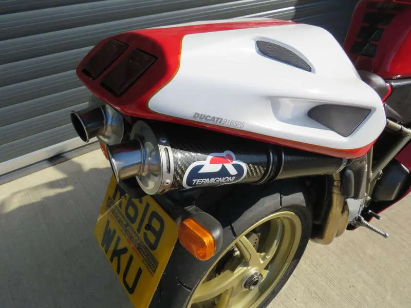 This lot will be auctioned via Iconic Auctioneers, The Iconic Motorcycle Sale at the NEC Classic Motor Show 2025 on Sunday the 9th of November, NEC, Birmingham, B40 1NT. Offering 134bhp and 170mph, the legendary 916 SPS (Sport Production Special) was a truly fearsome machine It retailed at nearly £10,000 more than the standard Biposto as a limited edition This example is presented in original and unrestored condition, fitted with Marchesini wheels with the originals included #176 of the limited edition run UK-registered from new, three previous owners and showing just over 11,000 recorded miles Featured on the 44Teeth YouTube vide where it was unearthed from under a pile of carpets and recommissioned by Rich at Luigi Motors in Bristol including belts, service, tyres and new battery. See attached video Well known bike and a very usable example UK-registered on a current V5C