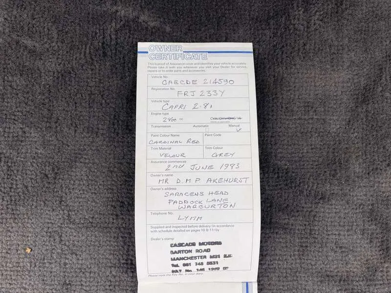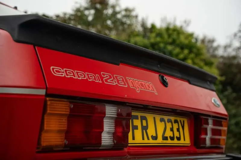 This lot will be auctioned via Iconic Auctioneers, The Classic Sale at the NEC Classic Motor Show 2025 on Sunday the 9th of November, NEC, Birmingham, B40 1NT. In 1982, Ford dropped the Capri's 3-litre V6 in favour of the all new 2.8-litre injection Cologne V6, with a power output of 160bhp and a top speed of 130mph Finished in Cardinal Red with a Grey Velour interior, this 2.6 Capri was supplied to its one and only owner He has sadly passed and his much loved Capri is being offered from his estate 52,137 miles indicated, supported by online MOT history back to September 2005 at 40,843 miles Original stamped service book present, along with many original documents and paperwork New battery recently fitted. Last MOT expired in September 2024