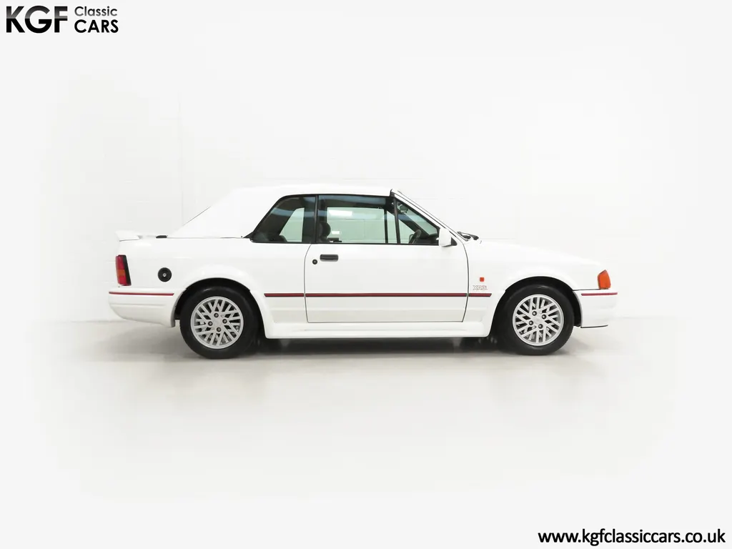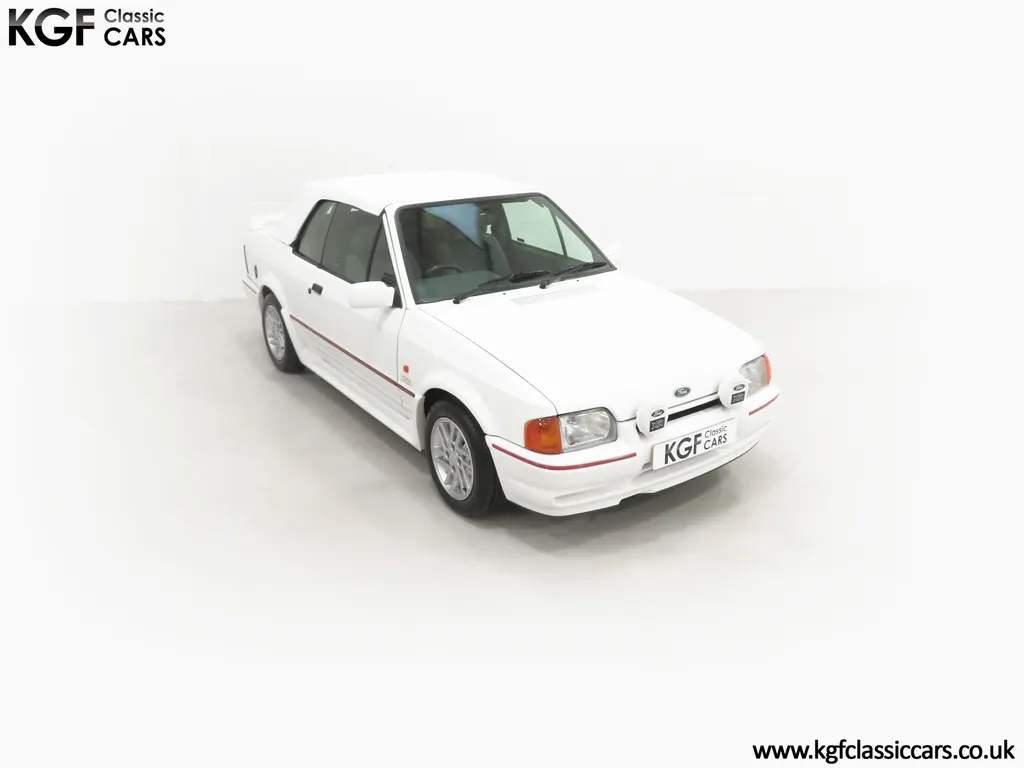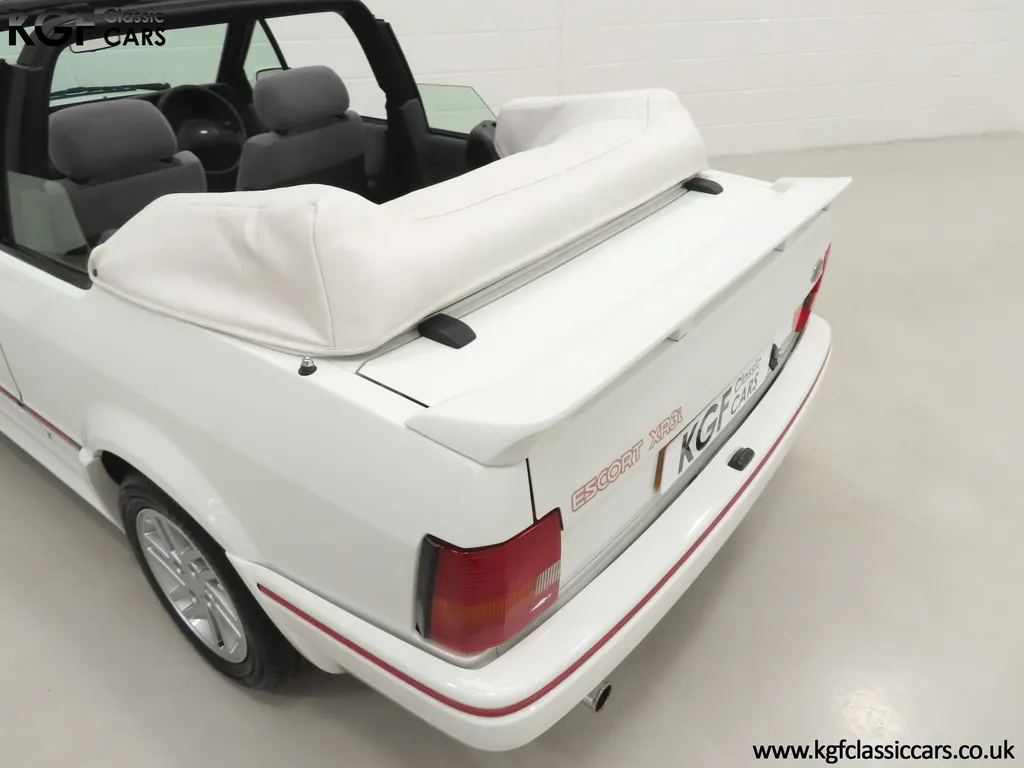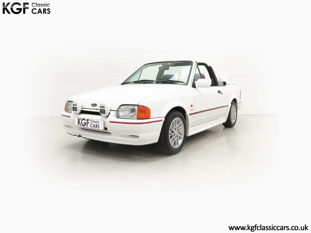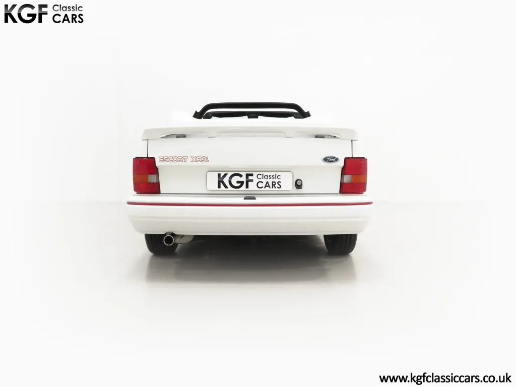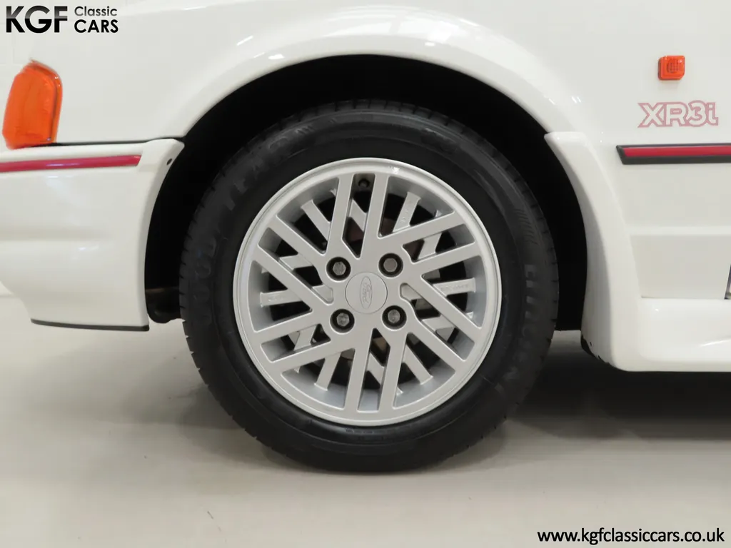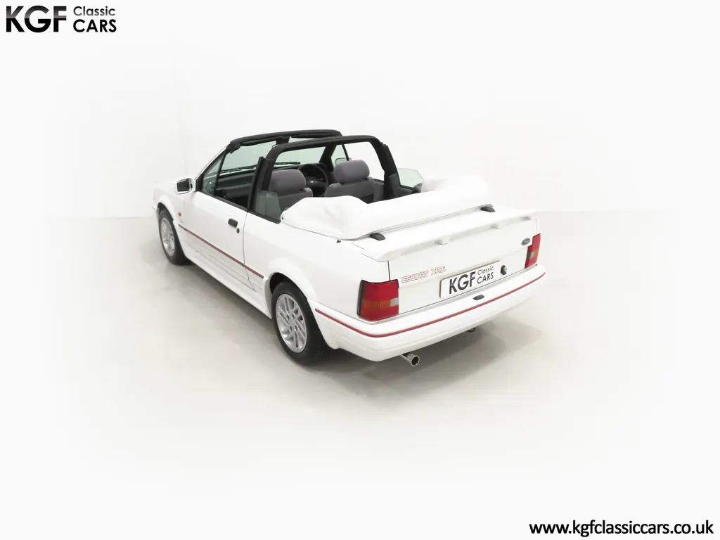 FOR SALE A retro icon Ford Escort XR3i Cabriolet 90-Spec with humongous history. EQUIPMENT 90-Spec body-coloured bumpers with protective red inserts, front spoiler, body-coloured door mirrors, driving lamps, white fast folding fully insulated vinyl roof with heated glass window, white hood cover, integral black roll bar, Quickclear heated front screen, electrically controlled and heated door mirrors, folding rear seats, lockable glovebox, wind-down rear quarter windows, cigar lighter, quartz digital clock, tachometer, Ford Model 2005 radio/cassette with anti-theft coding, four speakers and electric aerial. Factory Options: Alloy wheels size 6 x 14in. Dealer Options: Genuine RS Bodykit with side skirts and rear spoiler. Accessories: Toad CAT 1 alarm with microwave sensor, carpet mats, driving lamp covers. EXTERIOR This deliciously retro XR3i Cabriolet represents an original and unspoilt example of Fords iconic soft-top. Finished in striking Diamond White, (Code BK3), the paintwork boasts a fabulous uniform finish that clearly shows just how much the car has been cherished. All body panels are factory fitment with clearly defined inner wings stamps and the bodywork and shut lines are beautifully straight. Light touched in marks are visible upon close inspection but are entirely forgiven on such an original example as are the slightly faded XR3i decals. The Ford RS bodykit was fitted from new with RS logos clearly visible and the underside is remarkably well preserved. The white soft-top roof is beautifully clean, remains perfect in condition, fit and operation. The matching colour keyed hood cover for use when the hood is lowered is present and spotless. Factory Sigla glass and Ford light clusters remain fitted. INTERIOR A fun and practical option of retro soft-top motoring with space for five and a generous boot! The supportive sports seats trimmed with Zolda fabric in Shadow colour scheme, (Code LU), are in good condition with some very small holes to each front seat, barely noticeable. Door card shrinkage and scratched inner door handles are very common for the model, yet thankfully, there is only minor evidence on this example. The soft top headlining is very clean with no stains, rips or loose material and the heated rear glass screen free from scratches. The dashboard and switchgear are in superb order and all functions and controls operate including the standard Ford 2005 radio/cassette with electric aerial and the roof mounted digital clock. ENGINE & TRANSMISSION A delightfully crisp, responsive and free-revving 1.6 OHC (CVH) engine features electronic fuel injection with Ford’s own EEC IV engine management system (as fitted to later cars replacing the Bosch system). This increased power by 3bhp to give 108bhp to achieve an improved top speed of 116mph and 0-60mph in 9.7 seconds. The engine bay presentation is excellent with original factory stickers, labels and plates intact even on the slam panel! The car performs brilliantly and an expensive stainless steel exhaust replicating the original to give the characteristic rasp! The five-speed gearbox is light and precise and aids the enthusiastic driving XR owners are known for! WHEELS, TYRES & BRAKES Optional extra alloy wheels size 6 x 14in are in pristine condition and are shod in matching branded Goodyear Efficient Grip tyres covering little over 1,000 miles since being fitted in 2022. Stored inside the spare wheel is the original jack. The diagonally split dual-line servo assisted brakes stop the car straight and steady. HISTORY FILE Date of registration of this late 90 Spec example was the 4th July 1991 by Ford Main Dealer, Central Motor Company (Leicester) Ltd. Ownership of the car has been traced right back and the previous owner bought the car in 2016, the lady keeper prior to him having owned the car for around 20 years. The history file is humongous and dates back to when the car was new with masses of paperwork including MOT records dating back to the first in 1994. There are also service book records since the first service carried out in late 1991. Part of the impressive vehicle history is that the car was featured with the previous owner in the April 2018 issue of ClassicFord magazine whereby a prime example was required for a four-page ‘Buying Tips’ article. This very car was used in the feature and several copies of the magazine are in the folder. All handbooks are included as well as both seats of keys with alarm fobs and a Ford range brochure from 1990. In November 2025, the car was serviced and the cambelt and water pump were replaced. Now offered for sale due to the fastidious owner downsizing his collection of classic 1980’s cars, motorbikes and iconic memorabilia such as an unused Sinclair C5! Look no further for a beautifully cherished unspoilt example ready to use and impress at classic car shows and retro outings! MOT December 2026, HPI clear.