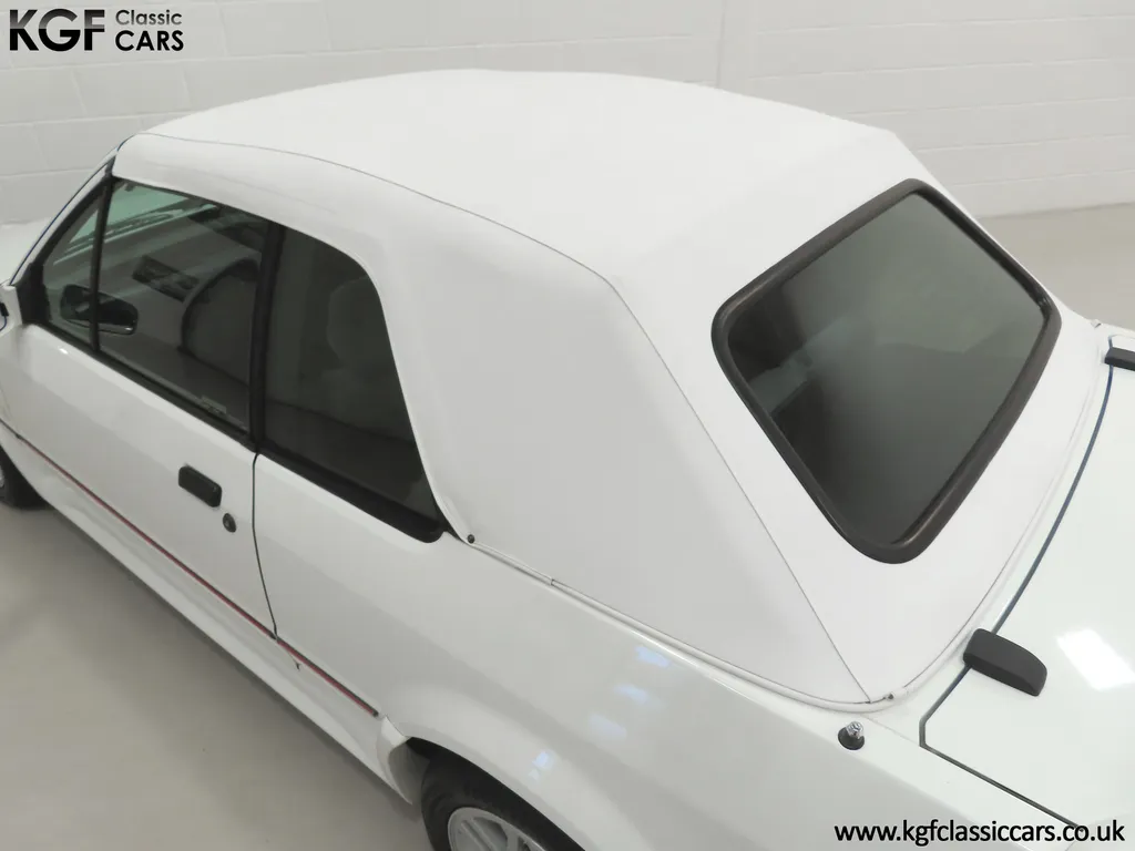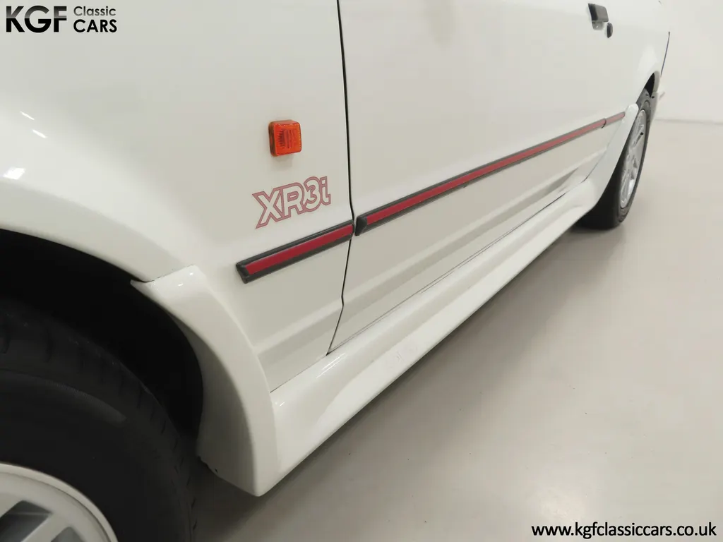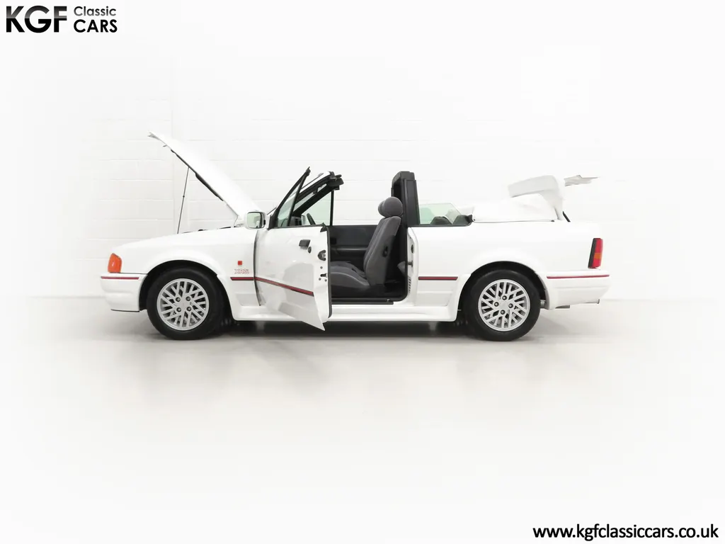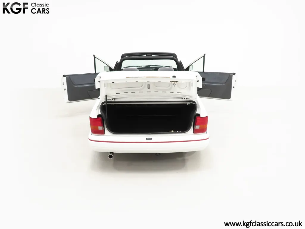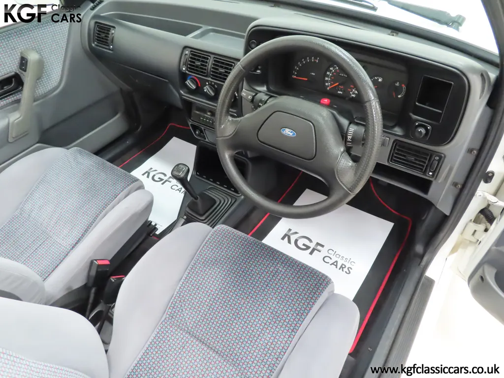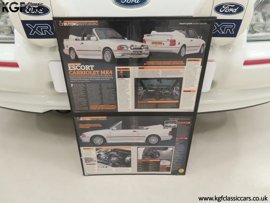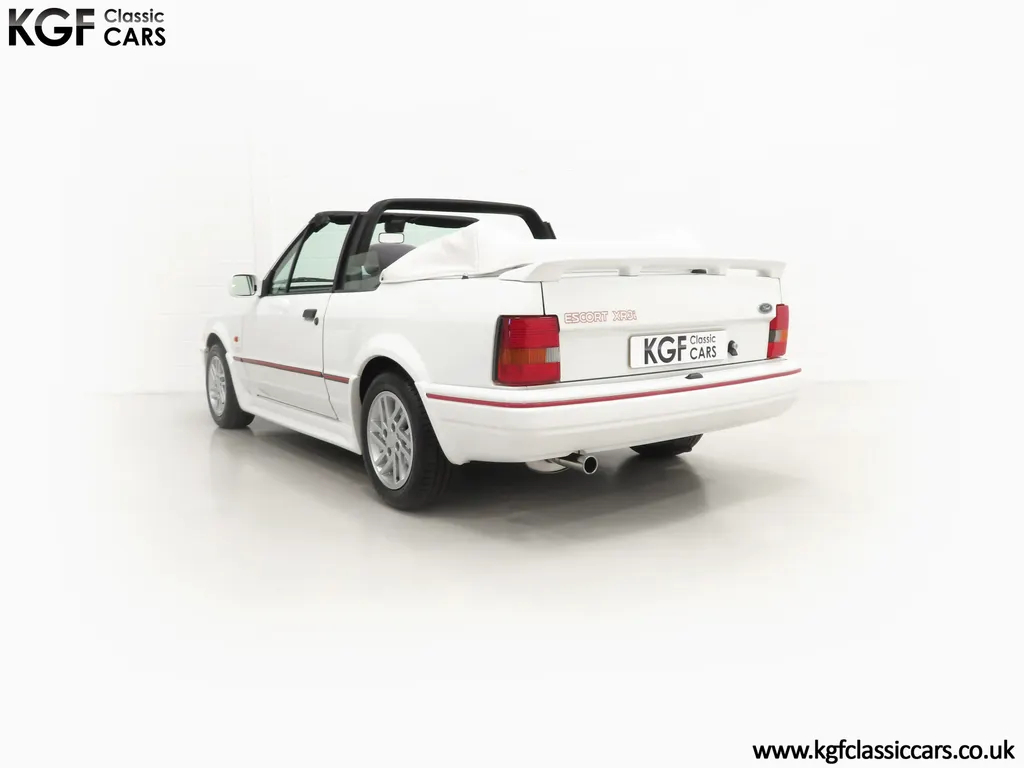 FOR SALE A retro icon Ford Escort XR3i Cabriolet 90-Spec with humongous history. EQUIPMENT 90-Spec body-coloured bumpers with protective red inserts, front spoiler, body-coloured door mirrors, driving lamps, white fast folding fully insulated vinyl roof with heated glass window, white hood cover, integral black roll bar, Quickclear heated front screen, electrically controlled and heated door mirrors, folding rear seats, lockable glovebox, wind-down rear quarter windows, cigar lighter, quartz digital clock, tachometer, Ford Model 2005 radio/cassette with anti-theft coding, four speakers and electric aerial. Factory Options: Alloy wheels size 6 x 14in. Dealer Options: Genuine RS Bodykit with side skirts and rear spoiler. Accessories: Toad CAT 1 alarm with microwave sensor, carpet mats, driving lamp covers. EXTERIOR This deliciously retro XR3i Cabriolet represents an original and unspoilt example of Fords iconic soft-top. Finished in striking Diamond White, (Code BK3), the paintwork boasts a fabulous uniform finish that clearly shows just how much the car has been cherished. All body panels are factory fitment with clearly defined inner wings stamps and the bodywork and shut lines are beautifully straight. Light touched in marks are visible upon close inspection but are entirely forgiven on such an original example as are the slightly faded XR3i decals. The Ford RS bodykit was fitted from new with RS logos clearly visible and the underside is remarkably well preserved. The white soft-top roof is beautifully clean, remains perfect in condition, fit and operation. The matching colour keyed hood cover for use when the hood is lowered is present and spotless. Factory Sigla glass and Ford light clusters remain fitted. INTERIOR A fun and practical option of retro soft-top motoring with space for five and a generous boot! The supportive sports seats trimmed with Zolda fabric in Shadow colour scheme, (Code LU), are in good condition with some very small holes to each front seat, barely noticeable. Door card shrinkage and scratched inner door handles are very common for the model, yet thankfully, there is only minor evidence on this example. The soft top headlining is very clean with no stains, rips or loose material and the heated rear glass screen free from scratches. The dashboard and switchgear are in superb order and all functions and controls operate including the standard Ford 2005 radio/cassette with electric aerial and the roof mounted digital clock. ENGINE & TRANSMISSION A delightfully crisp, responsive and free-revving 1.6 OHC (CVH) engine features electronic fuel injection with Ford’s own EEC IV engine management system (as fitted to later cars replacing the Bosch system). This increased power by 3bhp to give 108bhp to achieve an improved top speed of 116mph and 0-60mph in 9.7 seconds. The engine bay presentation is excellent with original factory stickers, labels and plates intact even on the slam panel! The car performs brilliantly and an expensive stainless steel exhaust replicating the original to give the characteristic rasp! The five-speed gearbox is light and precise and aids the enthusiastic driving XR owners are known for! WHEELS, TYRES & BRAKES Optional extra alloy wheels size 6 x 14in are in pristine condition and are shod in matching branded Goodyear Efficient Grip tyres covering little over 1,000 miles since being fitted in 2022. Stored inside the spare wheel is the original jack. The diagonally split dual-line servo assisted brakes stop the car straight and steady. HISTORY FILE Date of registration of this late 90 Spec example was the 4th July 1991 by Ford Main Dealer, Central Motor Company (Leicester) Ltd. Ownership of the car has been traced right back and the previous owner bought the car in 2016, the lady keeper prior to him having owned the car for around 20 years. The history file is humongous and dates back to when the car was new with masses of paperwork including MOT records dating back to the first in 1994. There are also service book records since the first service carried out in late 1991. Part of the impressive vehicle history is that the car was featured with the previous owner in the April 2018 issue of ClassicFord magazine whereby a prime example was required for a four-page ‘Buying Tips’ article. This very car was used in the feature and several copies of the magazine are in the folder. All handbooks are included as well as both seats of keys with alarm fobs and a Ford range brochure from 1990. In November 2025, the car was serviced and the cambelt and water pump were replaced. Now offered for sale due to the fastidious owner downsizing his collection of classic 1980’s cars, motorbikes and iconic memorabilia such as an unused Sinclair C5! Look no further for a beautifully cherished unspoilt example ready to use and impress at classic car shows and retro outings! MOT December 2026, HPI clear.