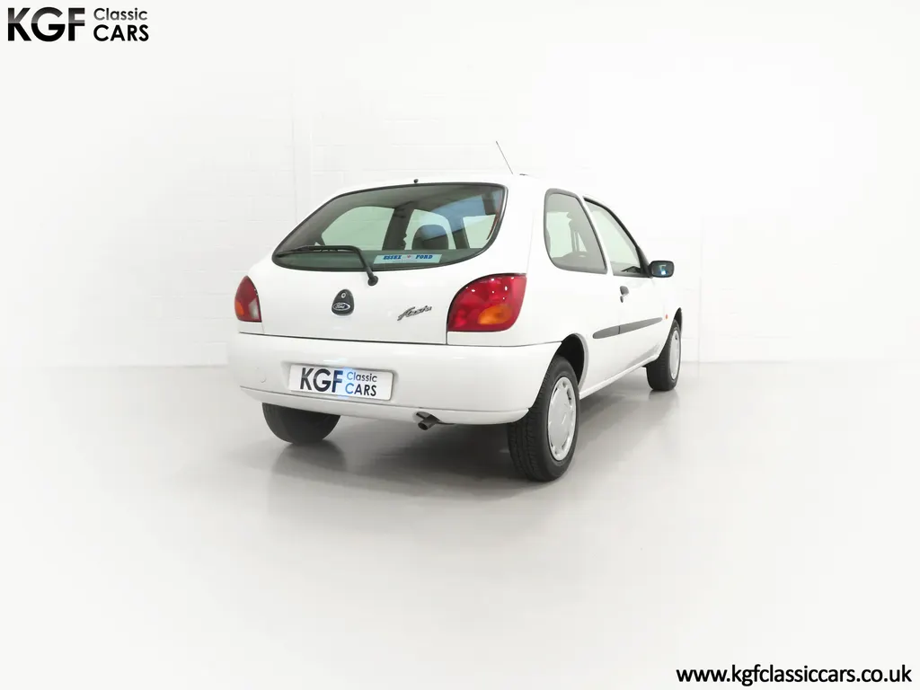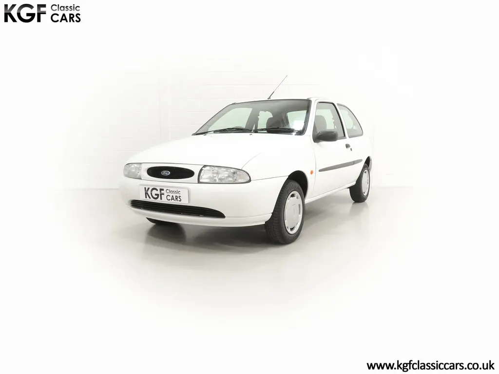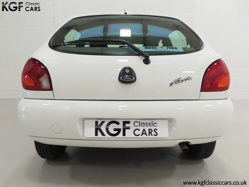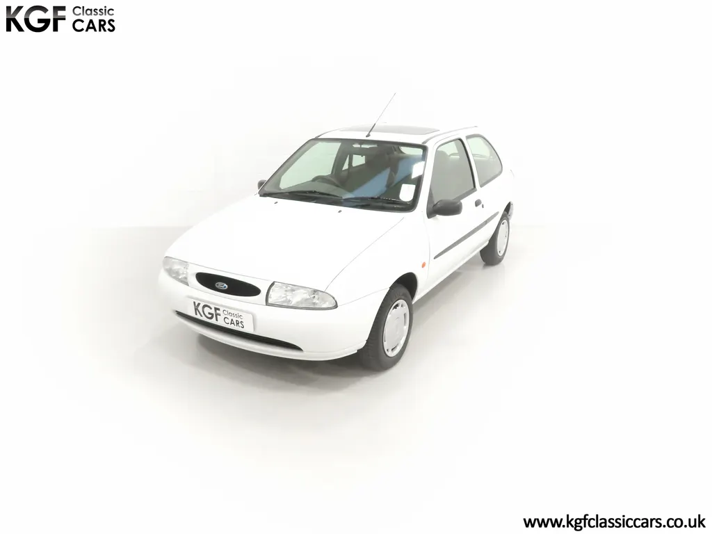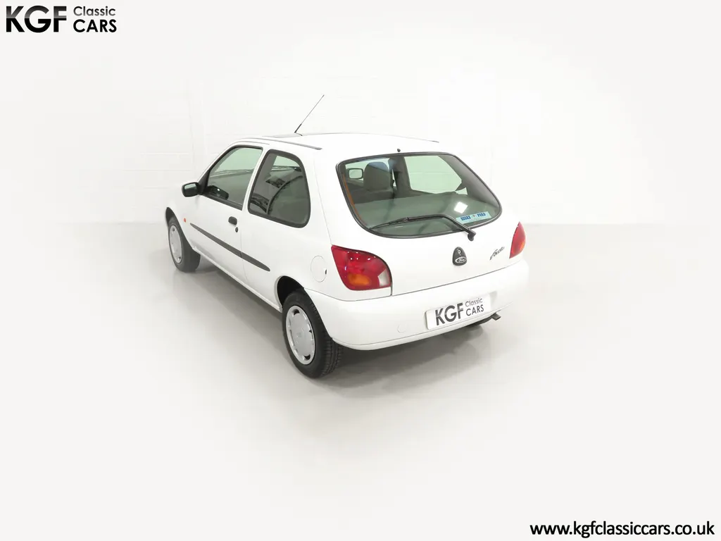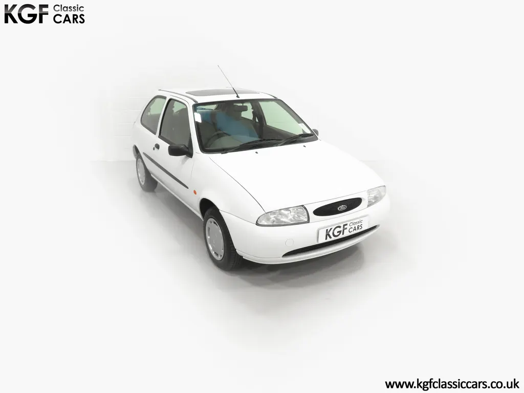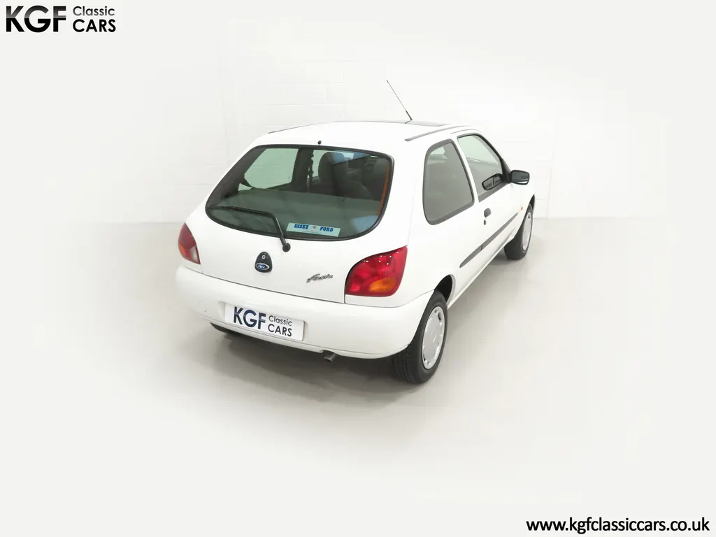 FOR SALE A time warp Ford Fiesta Mk4 Finesse with a miniscule 4,059 miles from new! EQUIPMENT Colour coded moulded bumpers, bodyside rubbing strip, sunroof, power assisted steering, front wipers with intermittent function, rear wash/wipe, halogen headlights, laminated windscreen, locking fuel filler, driver’s airbag, heated rear window, remote door mirrors, digital clock, centre console, 4-speed heating and cooling fan, Ford self-seek Model 3000 Traffic stereo with cassette, courtesy light. EXTERIOR With an astonishing and genuine 4,059 miles from new, this delightful billy basic Finesse model embodies the original Fiesta ethos of simplistic low-cost motoring. In factory original Diamond White, (Code B X), the paintwork to all factory panels is incredible commensurate with the exceptionally low mileage. A small rub mark to the nearside rear bumper corner is barely noticeable. The trim sections are fully intact and supplying Ford dealer number plates, rear screen sticker and tax disc holder remain fitted! The underside is in perfect structural condition and even the fragile label to the rear beam and PDI markings remain. This is a real collector’s car and a worthy Festival Of The Unexceptional contender! INTERIOR An interior entirely reflective or a 4,059-mile car. The cabin space with Midnight Opal fabric trim, (Code 0 0), could be described as showroom fresh! Seats, door cards, headlining and carpets are spotless, and the controls and switchgear have bright clear symbols and fresh feel having been used no more than most new cars have in the first few months! All functions operate flawlessly including the Ford self-seek model 3000 Traffic stereo cassette player. The pristine boot area still has bright yellow jack location labels and a perfect parcel shelf. The new car smell has been retained, instantly familiar as a Ford and ready to transport you back to a Ford showroom in 1999! An astonishing example of an iconic Ford Fiesta with all your basic luxuries! ENGINE & TRANSMISSION The 1.3 litre four-cylinder Endura engine is renowned for its simplicity and durability if not blistering performance! With 60bhp and 103Nm of torque, a respectable top speed of 96mph and 0-60mph in 14.8 seconds is achieved. The absolutely pristine engine bay has original plates, fragile paper stickers/labels, PDI dabs and factory panel stampings clearly visible. The 5-speed gearbox is light and precise, and the 5th gear offers much more relaxed motorway cruising than previous generations of base model Fiesta. WHEELS, TYRES & BRAKES The factory steel wheels wear the original 13in full wheel covers which are as new with no damage whatsoever. The originality seeking collector with be pleased to see factory fitted Pirelli 3000 165/70 R13 tyres all-round which should be renewed if the car is to be put into regular use. The immaculate underslung spare wheel wears the virgin spare tyre which even has the colour banding and rubber nobbles intact. The servo-assisted diagonally split brakes with discs up front and drums at the rear are fully up to date in terms of maintenance and perform well. HISTORY FILE Registered new on the 29th June 1999 by Essex Ford in Basildon, this exceptional example was purchased by Mr Eva who owned the car until 2022 at which time ownership passed to his Nephew. The car has covered a genuine 4,059 miles from new with just two family owners. The vehicle sales invoice is made out to Mr Eva illustrating a price paid of £8,200 less part exchange allowance for his 1987 Citron BX. The history file has the point-of-sale documentation as well as MOT and service records including the most recent service in October 2025 carried out using genuine Ford parts. The original Essex Ford document pack holds the service pack and all handbooks. There are two Ford keys, a Fiesta Finesse brochure and a Fiesta accessories brochure. The ideal entry to modern classic car ownership with this pristine and preserved Fiesta Finesse! MOT July 2026, HPI Clear.