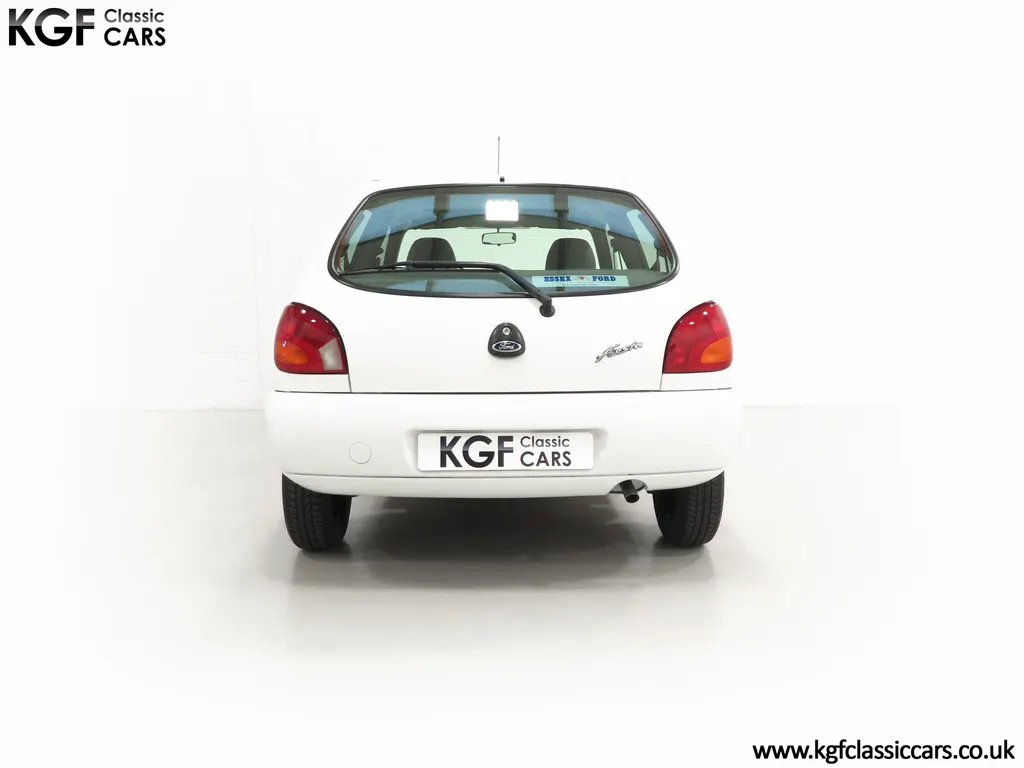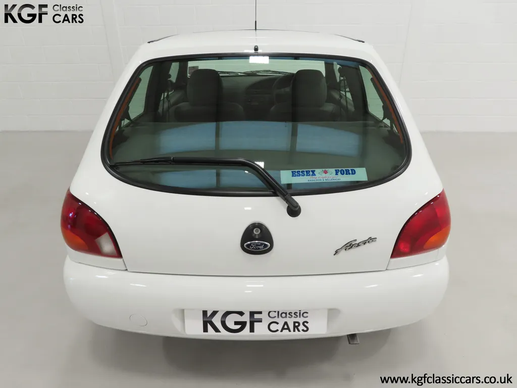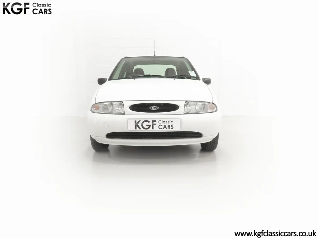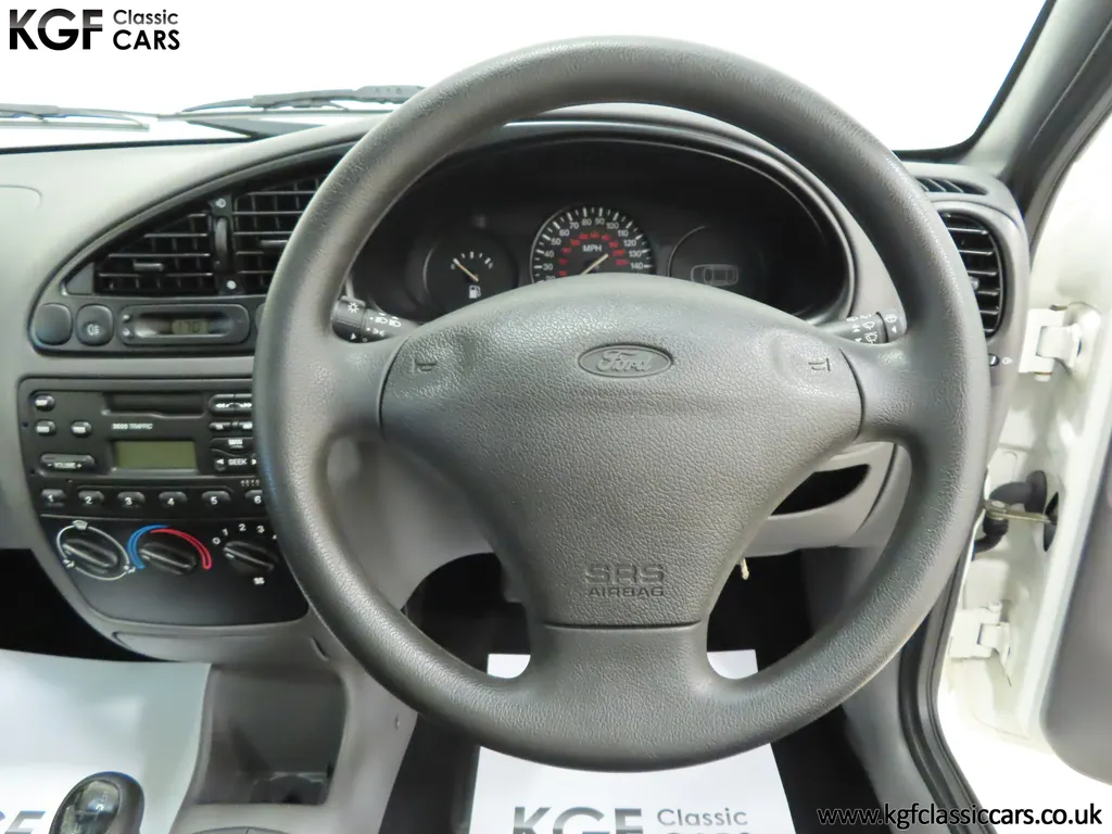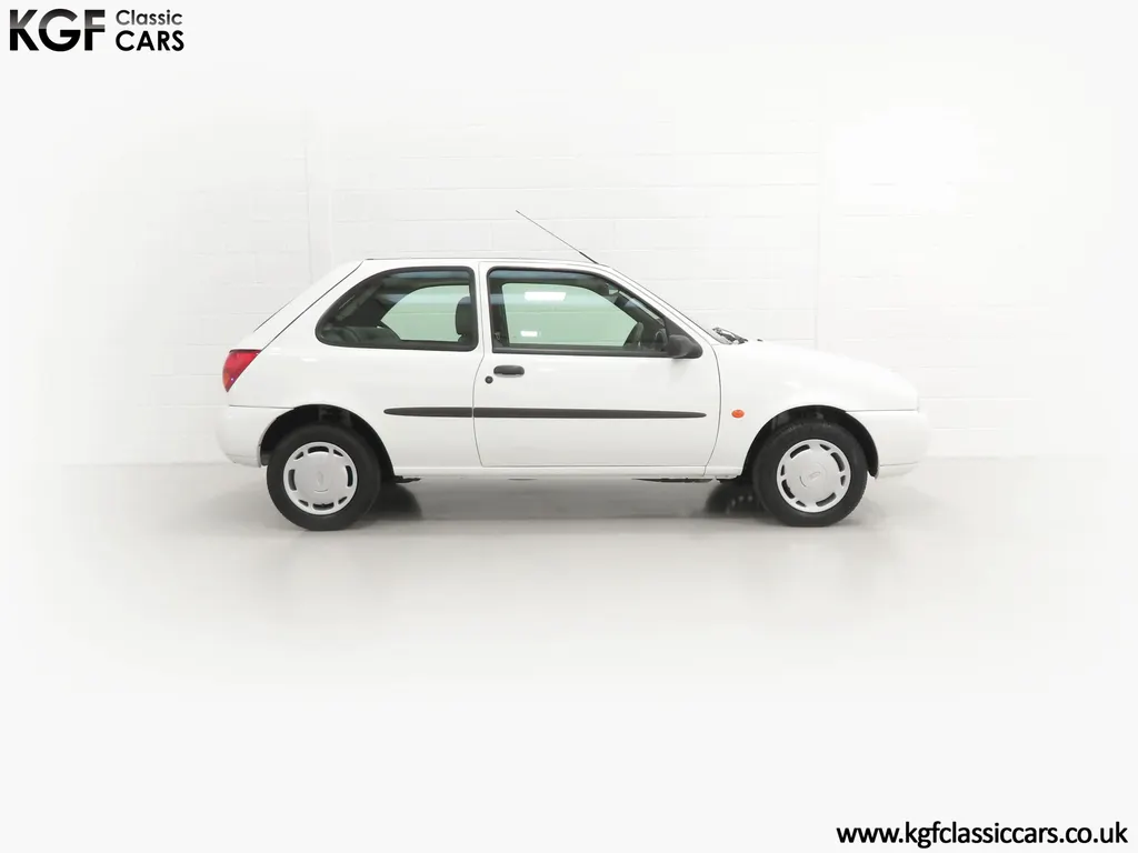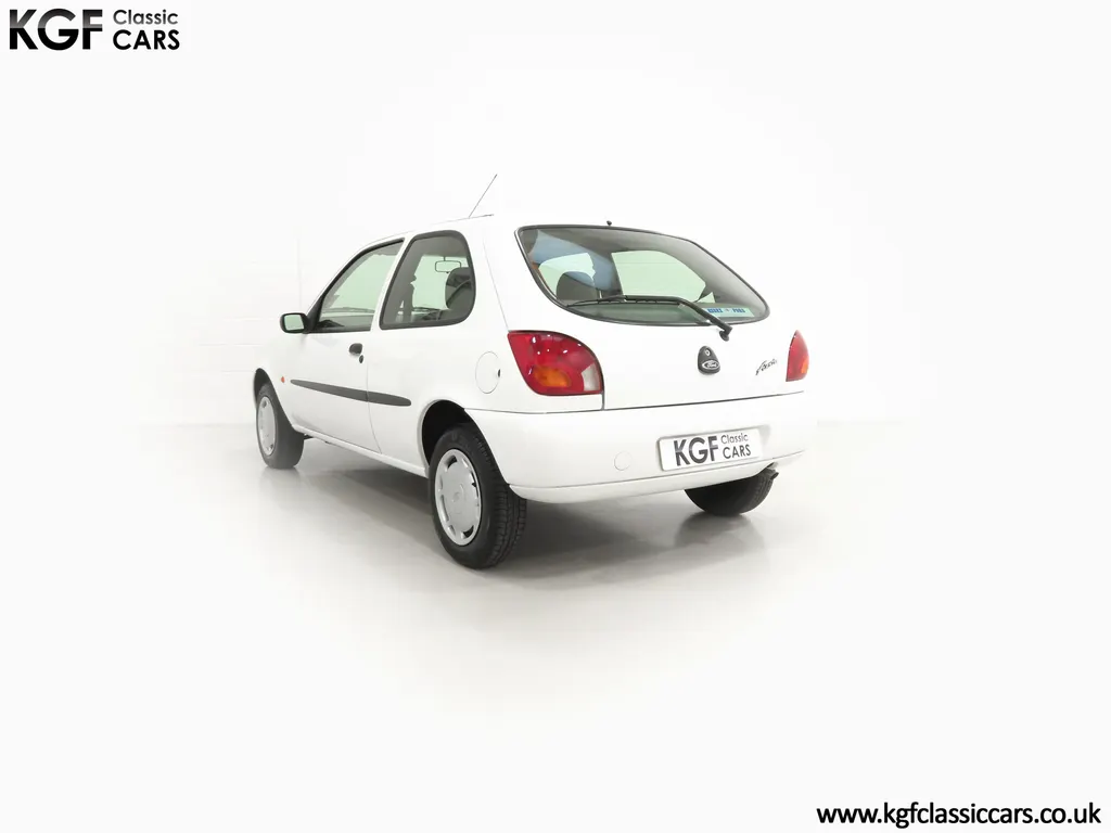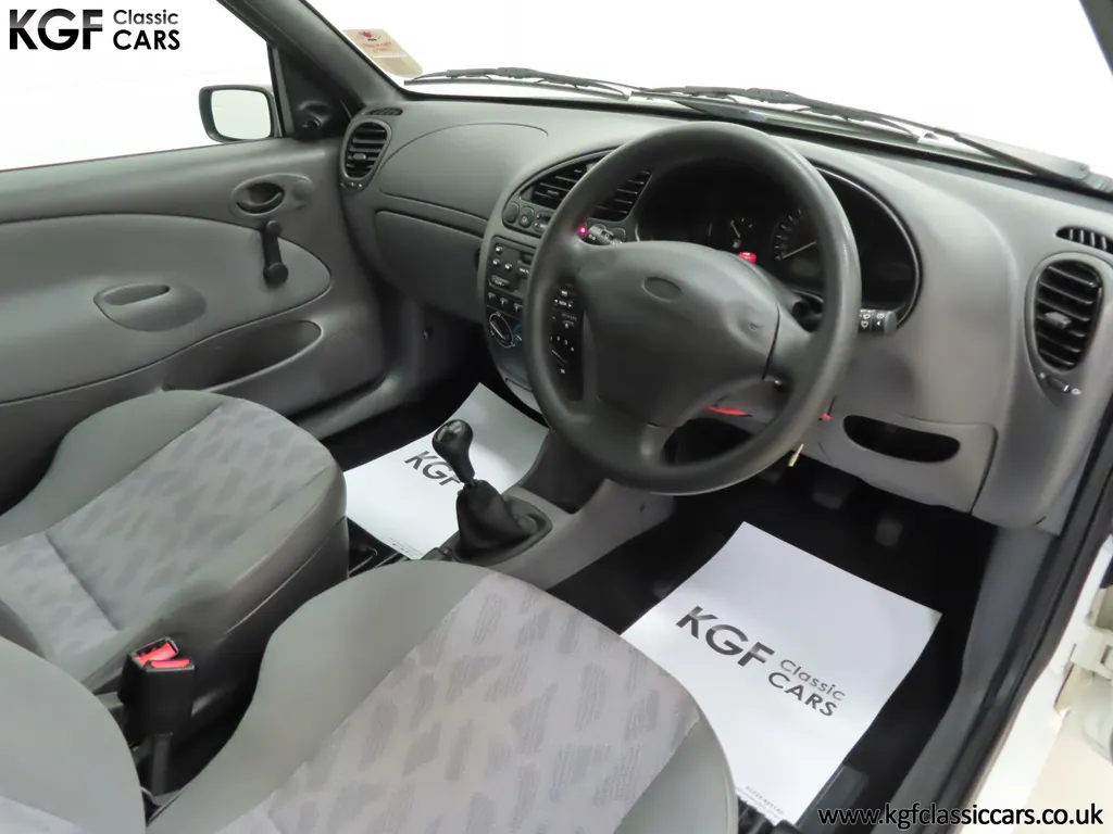 FOR SALE A time warp Ford Fiesta Mk4 Finesse with a miniscule 4,059 miles from new! EQUIPMENT Colour coded moulded bumpers, bodyside rubbing strip, sunroof, power assisted steering, front wipers with intermittent function, rear wash/wipe, halogen headlights, laminated windscreen, locking fuel filler, driver’s airbag, heated rear window, remote door mirrors, digital clock, centre console, 4-speed heating and cooling fan, Ford self-seek Model 3000 Traffic stereo with cassette, courtesy light. EXTERIOR With an astonishing and genuine 4,059 miles from new, this delightful billy basic Finesse model embodies the original Fiesta ethos of simplistic low-cost motoring. In factory original Diamond White, (Code B X), the paintwork to all factory panels is incredible commensurate with the exceptionally low mileage. A small rub mark to the nearside rear bumper corner is barely noticeable. The trim sections are fully intact and supplying Ford dealer number plates, rear screen sticker and tax disc holder remain fitted! The underside is in perfect structural condition and even the fragile label to the rear beam and PDI markings remain. This is a real collector’s car and a worthy Festival Of The Unexceptional contender! INTERIOR An interior entirely reflective or a 4,059-mile car. The cabin space with Midnight Opal fabric trim, (Code 0 0), could be described as showroom fresh! Seats, door cards, headlining and carpets are spotless, and the controls and switchgear have bright clear symbols and fresh feel having been used no more than most new cars have in the first few months! All functions operate flawlessly including the Ford self-seek model 3000 Traffic stereo cassette player. The pristine boot area still has bright yellow jack location labels and a perfect parcel shelf. The new car smell has been retained, instantly familiar as a Ford and ready to transport you back to a Ford showroom in 1999! An astonishing example of an iconic Ford Fiesta with all your basic luxuries! ENGINE & TRANSMISSION The 1.3 litre four-cylinder Endura engine is renowned for its simplicity and durability if not blistering performance! With 60bhp and 103Nm of torque, a respectable top speed of 96mph and 0-60mph in 14.8 seconds is achieved. The absolutely pristine engine bay has original plates, fragile paper stickers/labels, PDI dabs and factory panel stampings clearly visible. The 5-speed gearbox is light and precise, and the 5th gear offers much more relaxed motorway cruising than previous generations of base model Fiesta. WHEELS, TYRES & BRAKES The factory steel wheels wear the original 13in full wheel covers which are as new with no damage whatsoever. The originality seeking collector with be pleased to see factory fitted Pirelli 3000 165/70 R13 tyres all-round which should be renewed if the car is to be put into regular use. The immaculate underslung spare wheel wears the virgin spare tyre which even has the colour banding and rubber nobbles intact. The servo-assisted diagonally split brakes with discs up front and drums at the rear are fully up to date in terms of maintenance and perform well. HISTORY FILE Registered new on the 29th June 1999 by Essex Ford in Basildon, this exceptional example was purchased by Mr Eva who owned the car until 2022 at which time ownership passed to his Nephew. The car has covered a genuine 4,059 miles from new with just two family owners. The vehicle sales invoice is made out to Mr Eva illustrating a price paid of £8,200 less part exchange allowance for his 1987 Citron BX. The history file has the point-of-sale documentation as well as MOT and service records including the most recent service in October 2025 carried out using genuine Ford parts. The original Essex Ford document pack holds the service pack and all handbooks. There are two Ford keys, a Fiesta Finesse brochure and a Fiesta accessories brochure. The ideal entry to modern classic car ownership with this pristine and preserved Fiesta Finesse! MOT July 2026, HPI Clear.
