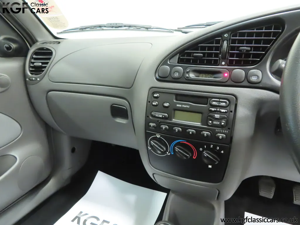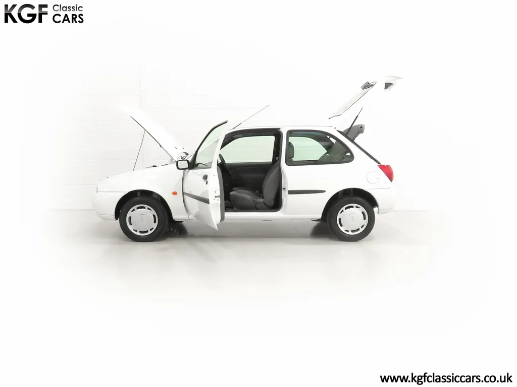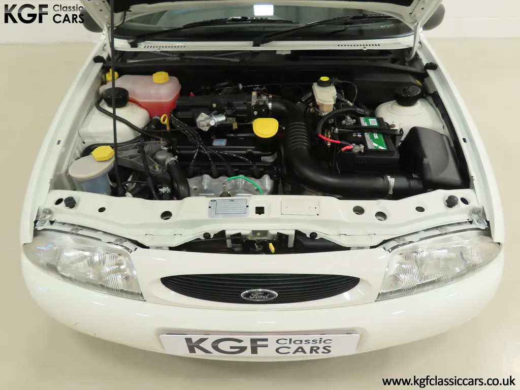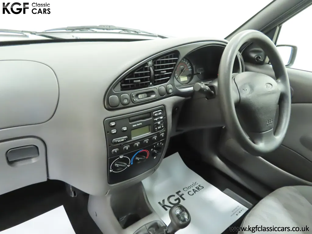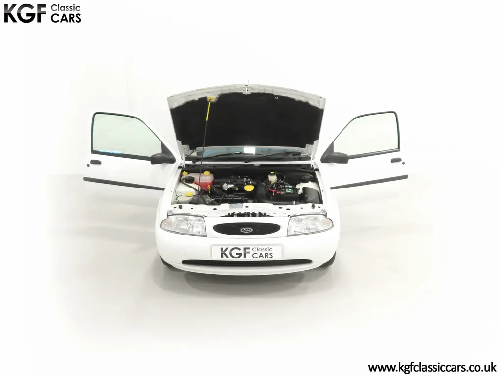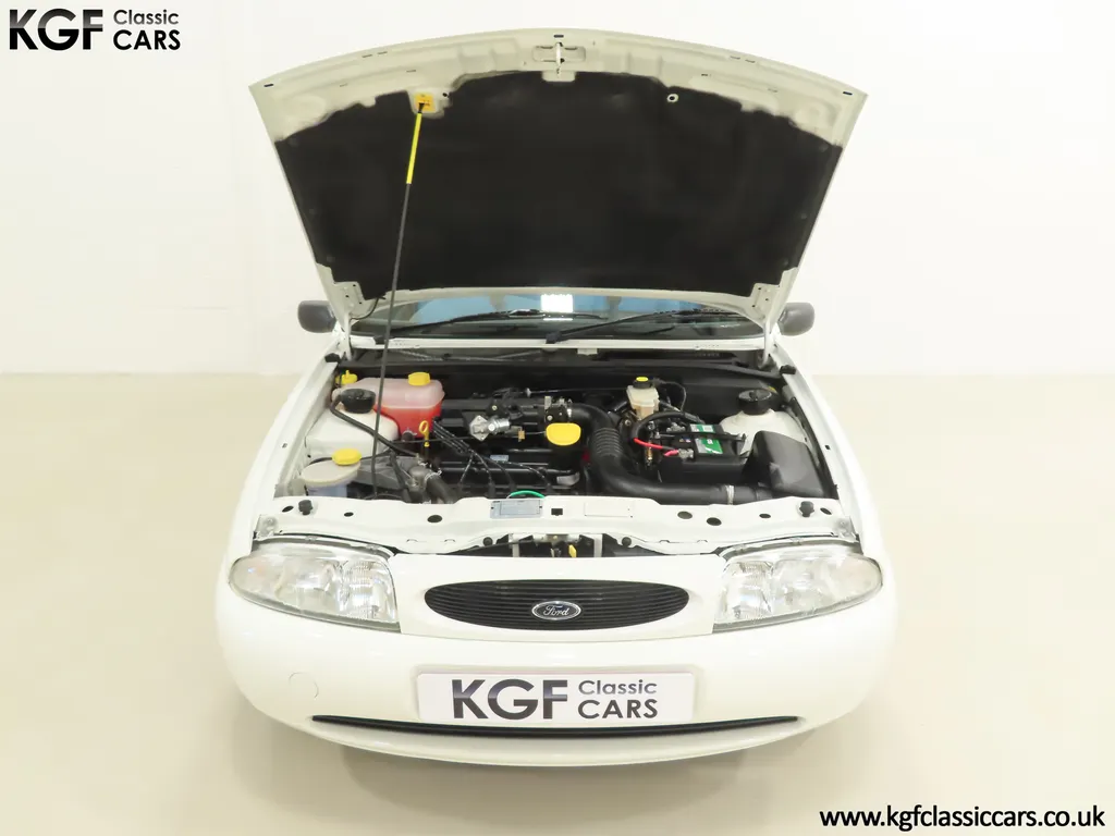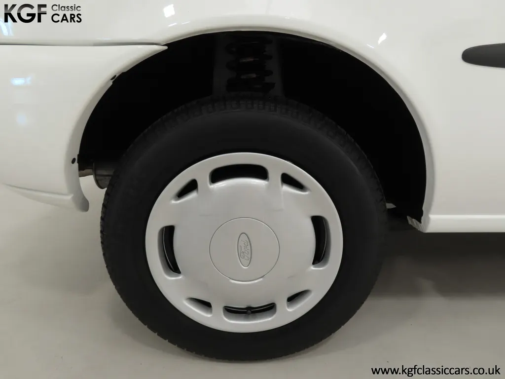 FOR SALE A time warp Ford Fiesta Mk4 Finesse with a miniscule 4,059 miles from new! EQUIPMENT Colour coded moulded bumpers, bodyside rubbing strip, sunroof, power assisted steering, front wipers with intermittent function, rear wash/wipe, halogen headlights, laminated windscreen, locking fuel filler, driver’s airbag, heated rear window, remote door mirrors, digital clock, centre console, 4-speed heating and cooling fan, Ford self-seek Model 3000 Traffic stereo with cassette, courtesy light. EXTERIOR With an astonishing and genuine 4,059 miles from new, this delightful billy basic Finesse model embodies the original Fiesta ethos of simplistic low-cost motoring. In factory original Diamond White, (Code B X), the paintwork to all factory panels is incredible commensurate with the exceptionally low mileage. A small rub mark to the nearside rear bumper corner is barely noticeable. The trim sections are fully intact and supplying Ford dealer number plates, rear screen sticker and tax disc holder remain fitted! The underside is in perfect structural condition and even the fragile label to the rear beam and PDI markings remain. This is a real collector’s car and a worthy Festival Of The Unexceptional contender! INTERIOR An interior entirely reflective or a 4,059-mile car. The cabin space with Midnight Opal fabric trim, (Code 0 0), could be described as showroom fresh! Seats, door cards, headlining and carpets are spotless, and the controls and switchgear have bright clear symbols and fresh feel having been used no more than most new cars have in the first few months! All functions operate flawlessly including the Ford self-seek model 3000 Traffic stereo cassette player. The pristine boot area still has bright yellow jack location labels and a perfect parcel shelf. The new car smell has been retained, instantly familiar as a Ford and ready to transport you back to a Ford showroom in 1999! An astonishing example of an iconic Ford Fiesta with all your basic luxuries! ENGINE & TRANSMISSION The 1.3 litre four-cylinder Endura engine is renowned for its simplicity and durability if not blistering performance! With 60bhp and 103Nm of torque, a respectable top speed of 96mph and 0-60mph in 14.8 seconds is achieved. The absolutely pristine engine bay has original plates, fragile paper stickers/labels, PDI dabs and factory panel stampings clearly visible. The 5-speed gearbox is light and precise, and the 5th gear offers much more relaxed motorway cruising than previous generations of base model Fiesta. WHEELS, TYRES & BRAKES The factory steel wheels wear the original 13in full wheel covers which are as new with no damage whatsoever. The originality seeking collector with be pleased to see factory fitted Pirelli 3000 165/70 R13 tyres all-round which should be renewed if the car is to be put into regular use. The immaculate underslung spare wheel wears the virgin spare tyre which even has the colour banding and rubber nobbles intact. The servo-assisted diagonally split brakes with discs up front and drums at the rear are fully up to date in terms of maintenance and perform well. HISTORY FILE Registered new on the 29th June 1999 by Essex Ford in Basildon, this exceptional example was purchased by Mr Eva who owned the car until 2022 at which time ownership passed to his Nephew. The car has covered a genuine 4,059 miles from new with just two family owners. The vehicle sales invoice is made out to Mr Eva illustrating a price paid of £8,200 less part exchange allowance for his 1987 Citron BX. The history file has the point-of-sale documentation as well as MOT and service records including the most recent service in October 2025 carried out using genuine Ford parts. The original Essex Ford document pack holds the service pack and all handbooks. There are two Ford keys, a Fiesta Finesse brochure and a Fiesta accessories brochure. The ideal entry to modern classic car ownership with this pristine and preserved Fiesta Finesse! MOT July 2026, HPI Clear.