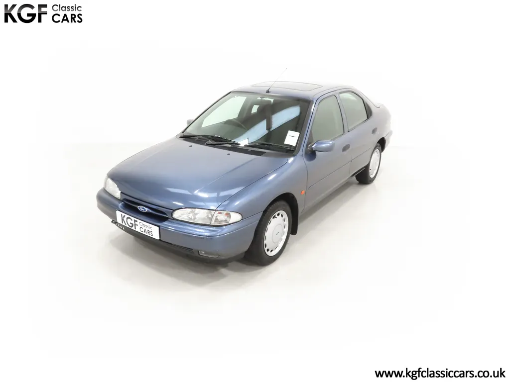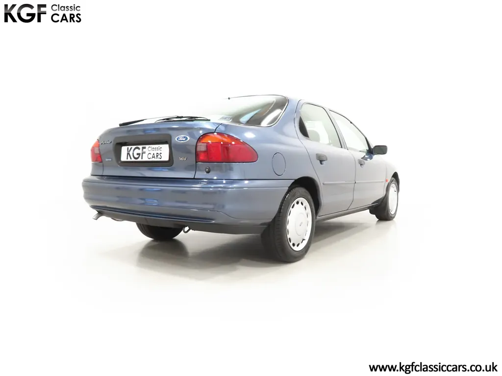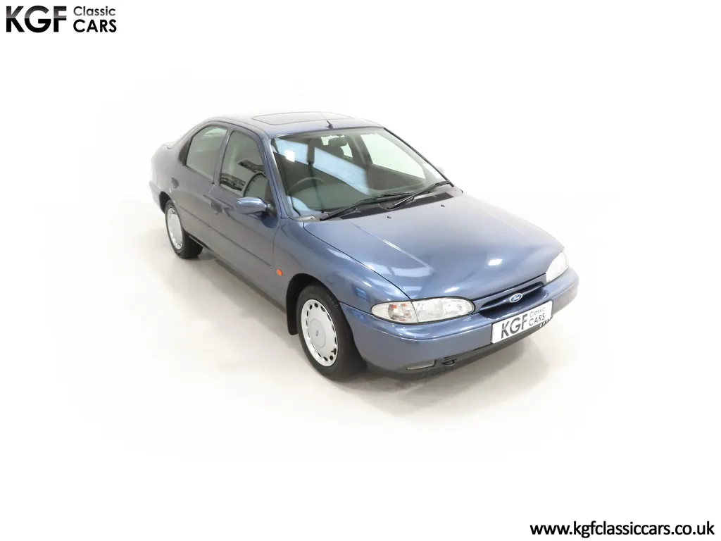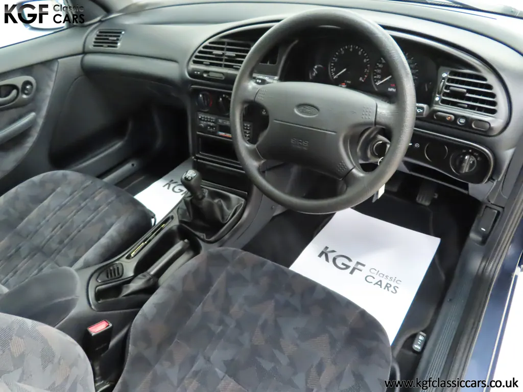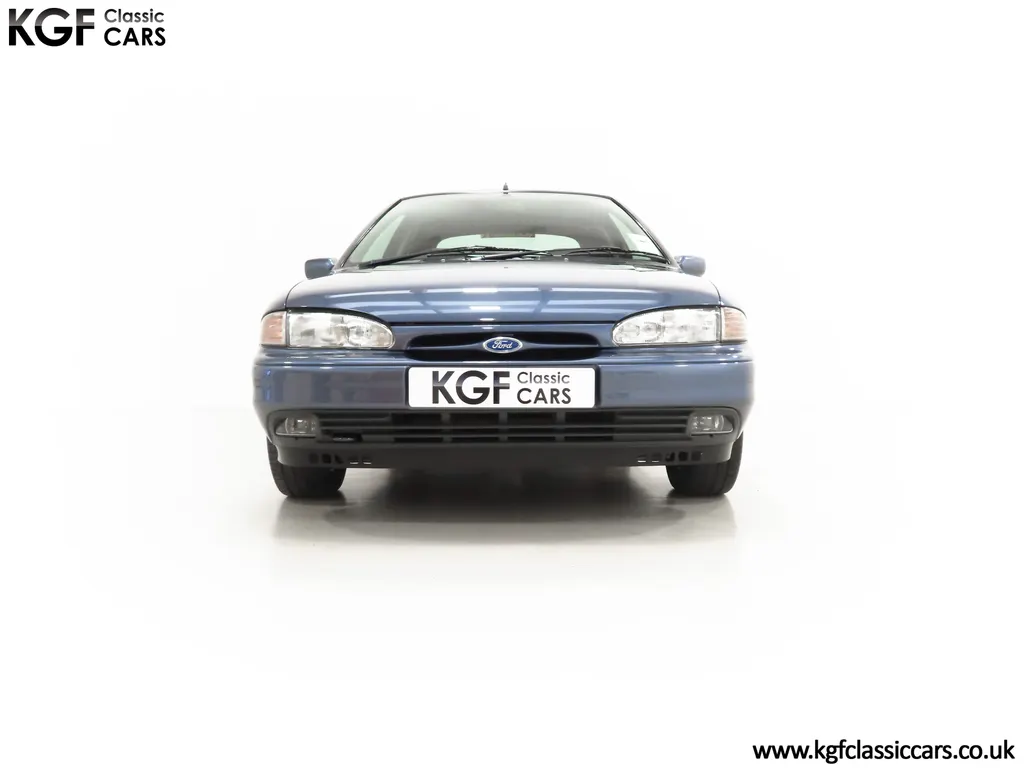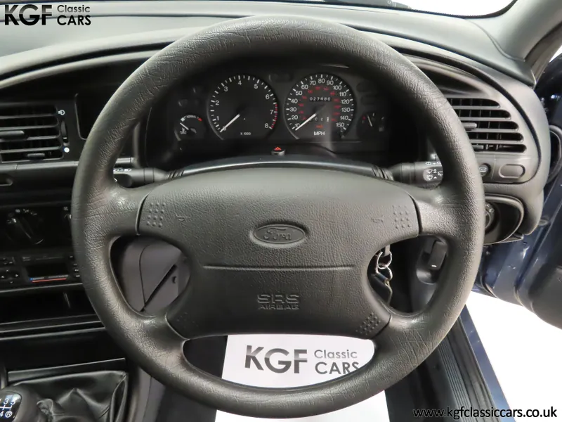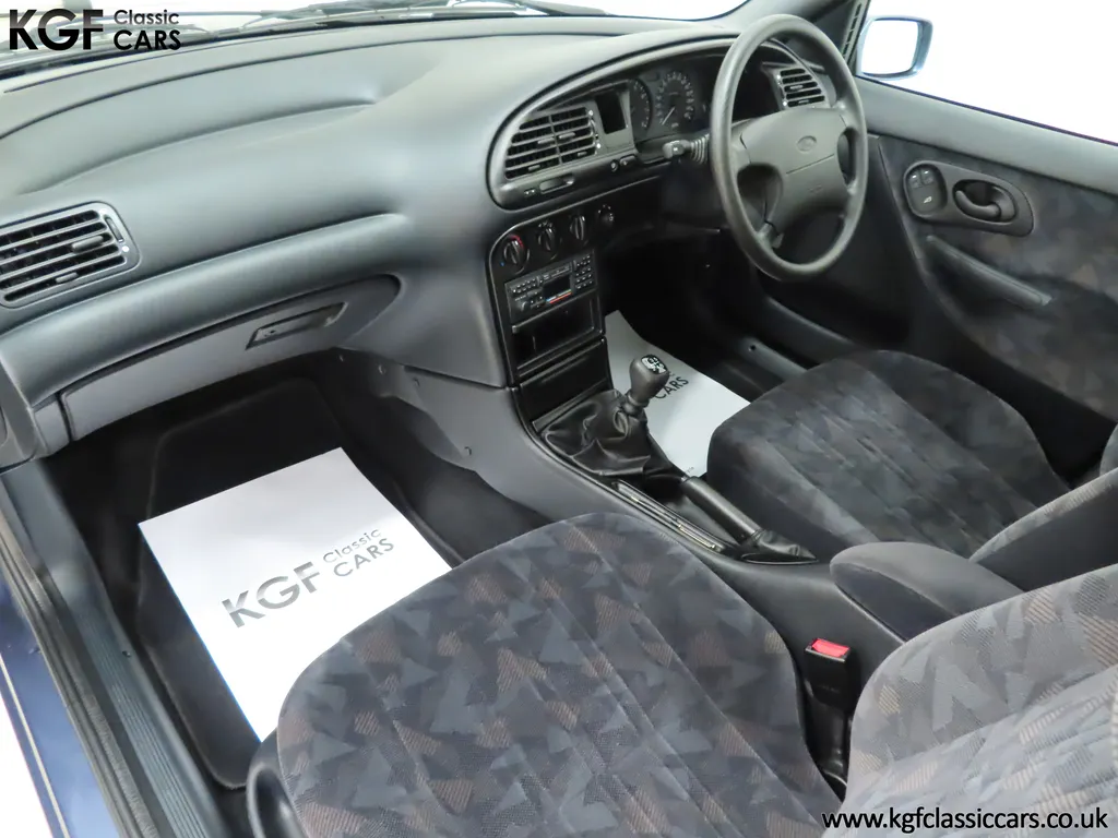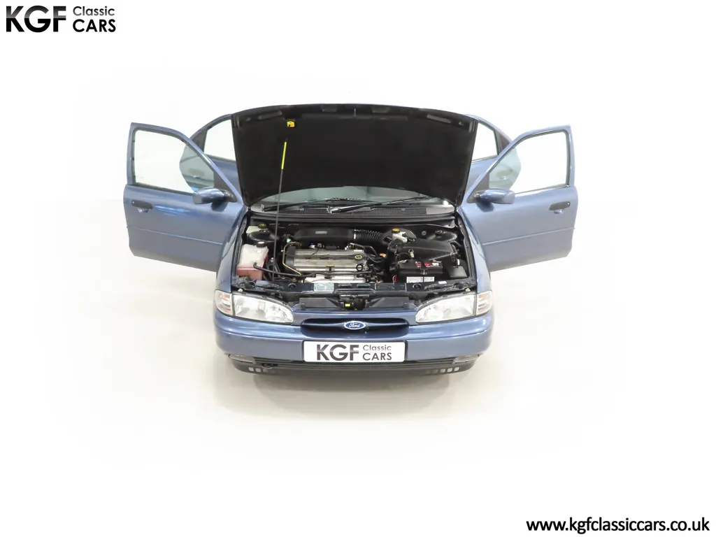 FOR SALE An outstanding Ford Mondeo Mk1 Verona with 27,486 miles and two owners. EQUIPMENT Special Mistral Blue metallic paintwork, unique wheel covers, bodyside mouldings, rear license plate appliqué, halogen headlamps, front and rear fog lamps, reinforced steel safety cage, power steering, driver’s airbag, side impact door beams, front seat belt grabbers, perimeter alarm and safeguard immobiliser, remote central double locking, tinted glass, heated rear window, electric front windows, electrically operated and heated door mirrors, illuminated interior door handles, driver’s seat height adjust, tailgate and fuel flap remote release, courtesy and luggage compartment lighting, tilt/slide sunroof. Factory Options: ‘Quickclear’ heated front screen with heated washer jets. Dealer Options: Supplying dealership branded carpet mats, Protection Pack. Accessories: Blaupunkt Frankfurt RCM DAB retro stereo with Bluetooth phone and audio streaming. (The original Ford Model 2006 Keycode RDS stereo cassette has been retained). EXTERIOR Launched in Europe in 1992 by The Ford Motor Company, the first-generation Mondeo was once a very common sight on UK roads, and with this late Verona Special Edition model fast approaching 30 years old, modern classic status is affirmed. This two owner car has covered a fully verified 27,486 miles from new and boasts total originality and outstanding condition. The factory applied Mistral Blue paintwork, (Code 8 4), is virtually flawless and even close scrutiny fails to reveal any imperfections worthy of mention. All trim, plastics, rubbers and badges are pristine and the underside is factory original with perfect structural integrity. Further wonderful originality is found in the supplying Ford dealer number plates, rear screen sticker and even period Radio station stickers that are brilliantly 90’s and very retro! Astonishing both in condition and complete originality, an absolute credit to its two owners. INTERIOR The interior of this cossetted example is simply perfect. The original Triangles velour fabric Raven upholstery to the sporty wing-back seats, (Code SH), is spotless with no wear or damage to the material whatsoever. The cut pile carpets are pristine having been protected by two sets of floor mats, one being the original supplying dealership branded set. The headlining is perfect and touch points such as the steering wheel and gear knob show no noticable wear. The driver inclined fascia and incorporated switchgear is as new, and all functions operate seamlessly. The very expensive Blaupunkt Frankfurt stereo, a superb piece of kit, is professionally fitted with no alterations to the dashboard and the original Ford stereo has been kept should the new owner wish to reinstall. An enormously comfortable interior and every inch representative of a 1996 showroom example, truly exceptional. ENGINE & TRANSMISSION The 1.8i DOHC 16v engine produces a power output of 115bhp and 158Nm of torque allowing a top speed of 121mph and 0-60mph in 10.5 seconds. The pristine engine bay features all factory stickers, plates, panel stamps, PDI markings and even fragile paper labels fully intact. Fastidiously maintained from new and having covered such low mileage, the car performs beautifully and is a joy to drive. The five-speed gearbox is perfect. WHEELS, TYRES & BRAKES The original and unique Verona model wheel trims remain fitted to the steel wheels and are in perfect condition. Replacement matching brand 195/60 R15 tyres have masses of tread, and the pristine boot area houses the unused spare and perfect plywood wheel cover disc. Diagonally split dual line brakes with servo assistance bring the car up straight and steady. HISTORY FILE Registered new on 4th October 1996 by Henlys Ford of Farnborough, this spectacular Special Edition Mondeo Verona has covered a warranted 27,486 miles from new with just two owners. The amazing history file begins with the new vehicle order form and subsequent sales invoice made out to first owner, Mr Page, whereby the purchase price was £12,793.93. All payment receipts and vehicle point of sale documents have been kept. Mr Page was a newly retired engineer, and as such, the Mondeo was a retirement gift from Mr and Mrs Page to themselves and a photograph outside their home with the car on handover day is a wonderful memento in the history file. A large file of service and maintenance invoices as well as all MOT certificates dating back to the first in 1999 is accompanied by a highly detailed maintenance log dating from when the car was new up to 2017. The log was kept as Mr Page, being a retired engineer, carried out much of the vehicle upkeep himself and wanted this to support the service history. The car was owned by Mr Page until September 2022 and there has been just one owner since. Mr Blake purchased the car for nostalgia reasons as his father owned Mondeo’s in the 1990’s and he and his father wanted to recreate journeys they took at the time. The fastidious upkeep has continued with the second owner who now has decided to sell the car with the upcoming birth of his first child and him feeling he will not have the time to give the car the care it deserves. Absolutely all servicing is fully up to date and since April 2025 alone, the car has had cambelt and water pump, gearbox oil, brake fluid, power steering fluid, new exhaust, brake overhaul and engine service. Completing the history file is the full book packs, four Ford keys including the red master and dealer fobs, and an original Mondeo Verona range sales brochure. KGF Classic Cars are privileged to offer this exceptional example that is a true credit to its two owners from new. MOT July 2026, HPI Clear.