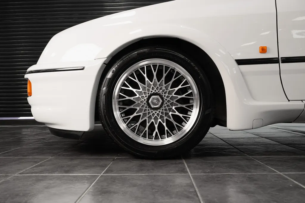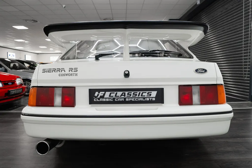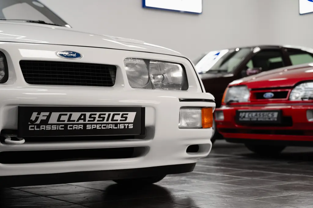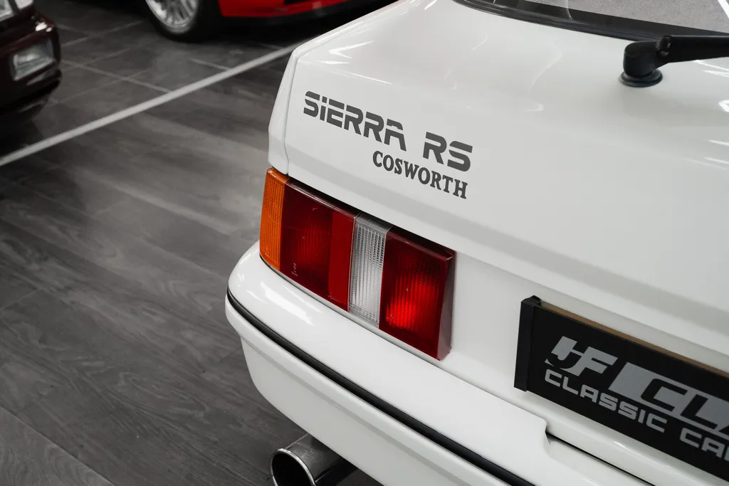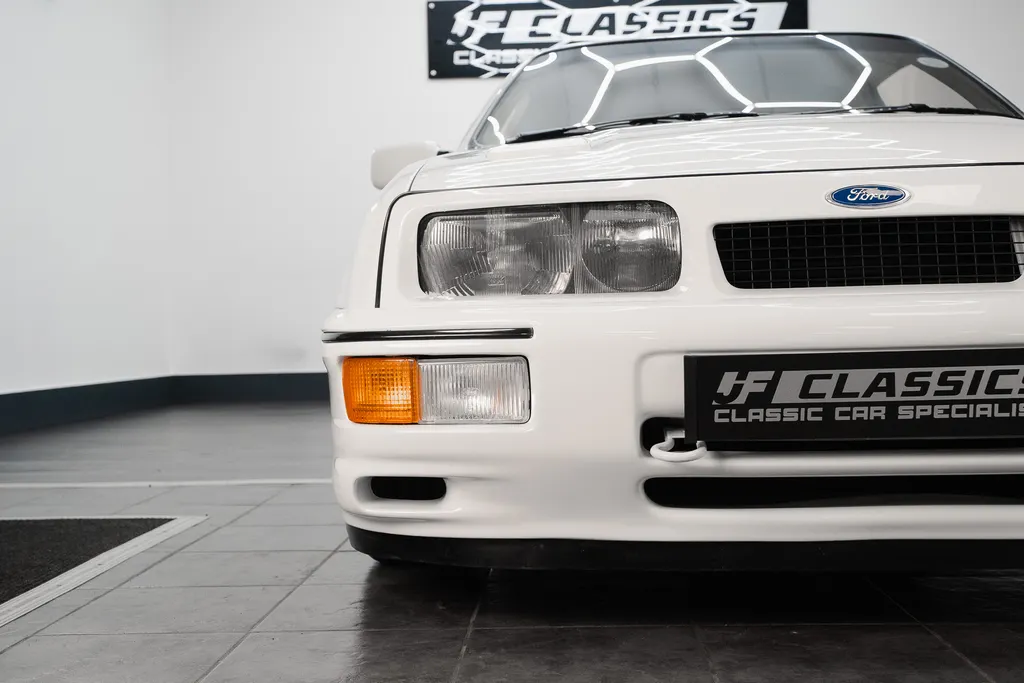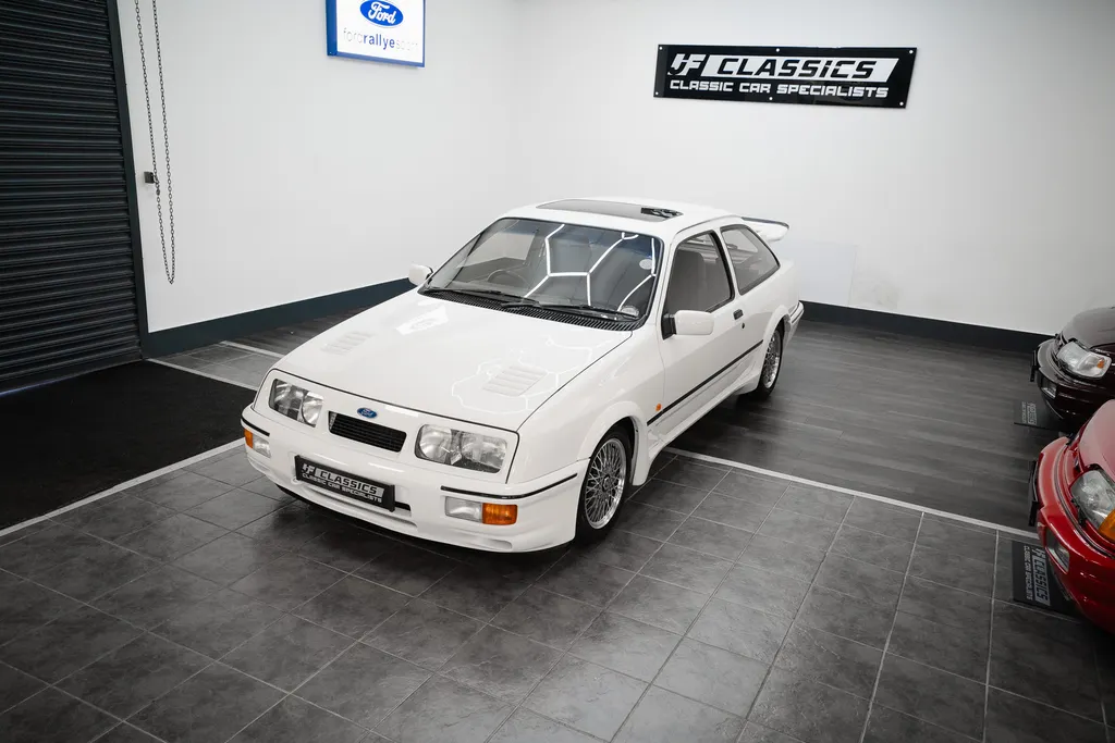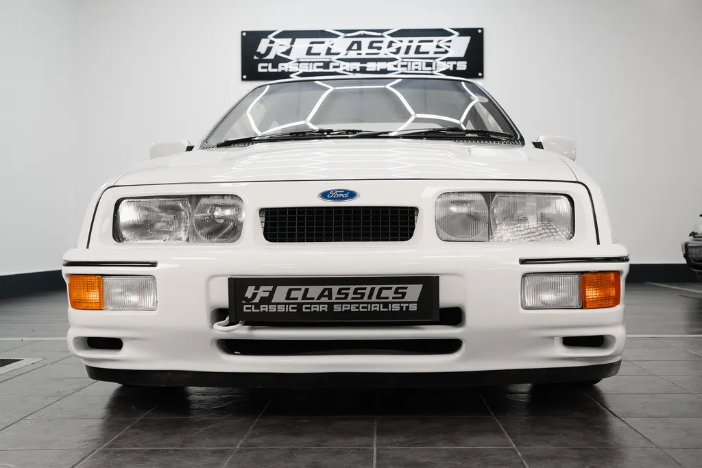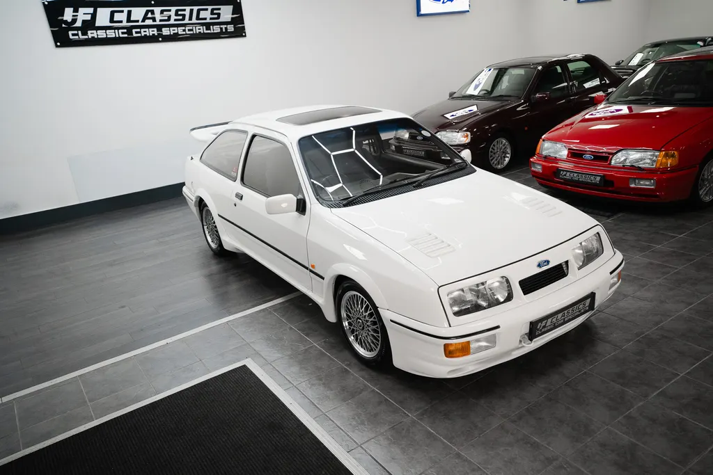 FOR SALE JF Classic Cars present a legendary Ford Sierra RS 'Whale tale' Cosworth in Diamond White with only 73526 miles from new and three former keepers DESCRIPTION Chosen for its aerodynamic profile and ideal proportions, the Ford Sierra provided the perfect foundation for a Group A competition car. Its sleek, wind-cheating design and balanced chassis made it a natural candidate for transformation into something truly special. In a bid to inject excitement and prestige into the Sierra range, Ford launched a high-profile motorsport programme and from that vision, the Sierra RS Cosworth was born. Collaborating with the engineering legends at Cosworth, Ford commissioned the development of a turbocharged variant of the Sierra’s robust 2.0-litre inline-four engine. The result was nothing short of revolutionary a car that combined road-going practicality with race-bred performance, setting new benchmarks for the era. Production took place at Ford’s Genk plant in Belgium, with assembly beginning in July 1986 and continuing through to January 1987, marking the creation of one of Ford’s most celebrated performance icons EXTERNAL Finished in what many enthusiasts regard as the ultimate colour for the Sierra Cosworth Ford Diamond White (Paint Code B3) this example presents in outstanding condition throughout. The paintwork displays a rich, glossy depth across every panel, perfectly reflecting the care and preservation shown by its limited ownership. Panel gaps are tight and consistent from nose to tail, aligning precisely as Ford intended. At the front, the distinctive Cosworth bumper remains free from scuffs or marks and houses the signature array of large cooling intakes designed to channel airflow to both the brakes and radiator. Above, the sculpted nose panel aids air delivery to the intercooler, while the twin bonnet vents allow hot air to escape efficiently from the engine bay a purposeful and defining hallmark of the RS’s motorsport heritage. Wide wheel arch extensions and contoured side skirts emphasise the car’s muscular stance, complemented perfectly by the legendary rear ‘whale-tail’ spoiler that completes this unmistakable Cosworth profile. All exterior trims and colour-coded mirrors are in exceptional condition, showing no signs of ageing or discolouration. The original Cibie headlamp glass remains completely chip- and fade-free, while the rear light clusters are clear and unblemished. Original factory glazing is retained throughout including windscreen, side, and rear glass each pane still displaying the correct factory etchings. Surrounding door and window rubbers remain soft, fresh, and tarnish-free, further underlining the car’s authenticity. Beneath, the underside of the vehicle is every bit as impressive as the bodywork above, remaining remarkably clean and correct, a true reflection of the meticulous preservation this iconic RS Cosworth has enjoyed INTERNAL Stepping inside the cabin of this Sierra RS Cosworth is an experience that transports you straight back to the golden era of Ford performance motoring. The interior can only be described as an absolute pleasure to sit in a perfectly preserved cockpit that blends comfort, functionality, and period charm in equal measure. The factory-fitted Recaro sports seats, finished in Ford Roma Grey cloth, present in very good condition throughout. The deep, supportive bolsters hold you firmly in place exactly as intended when this car first left the showroom. The rear seats appear barely used, matching the condition of the fronts and further reinforcing the car’s cherished history Beneath, the grey luxury-pile carpet remains in very good condition throughout, The door cards, trimmed in matching grey with integrated armrests, present beautifully and remain true to Ford’s original specification. Every element of the cabin retains its factory authenticity. The dashboards crack and fade-free a rare find even among well-preserved examples with all switchgear functioning exactly as Ford intended. The LCD warning display, monitoring bulb failures and open doors, operates perfectly with each indicator light illuminating precisely as it should. Equipment levels were impressive for the time, and this example proudly retains all of its desirable factory features. These include electrically adjustable and heated door mirrors, tinted glass all round, a tailgate wash/wipe system, laminated windscreen, and an extended centre console housing the cigar lighter and quartz digital clock. The fascia light dimmer, leather gear knob, and three-spoke leather sports steering wheel enhance the driver’s connection to the car, while the three-speed heater fan and original Ford electronic sound system (Model ECU2) with power amplifier all function as intended. The Recaro sports front seats are complemented by split-folding rears, and overhead sits the factory tilt and slide glass sunroof. Ahead of the driver, the binnacle displays a tachometer with turbo boost gauge and trip recorder, while the anti-lock braking system with failure warning light ensures confidence under braking. Electric front windows complete the specification, all working precisely as intended Every switch, button, and feature works exactly as it should a testament to careful ownership and proper maintenance. From the unmarked dashboard to the supple Recaro upholstery, this interior remains a beautifully preserved environment a true time-warp example of Ford craftsmanship at its finest. ENGINE & TRANSMISSION The original RS Cosworth power plant warrants little introduction. Fitted with the standard 2.0 Dual Overhead Cam (DOHC) with Garrett AiResearch T3 turbocharger and intercooler, the motorsport pedigree of this car is unrivaled. With an output of 204HP allowing the car to accelerate smoothly with 0-60 achieved in 6.2 seconds and will reach a top speed of 149mph, this truly is a recipe to set the heart racing. The engine starts at the flick of the key with power delivery