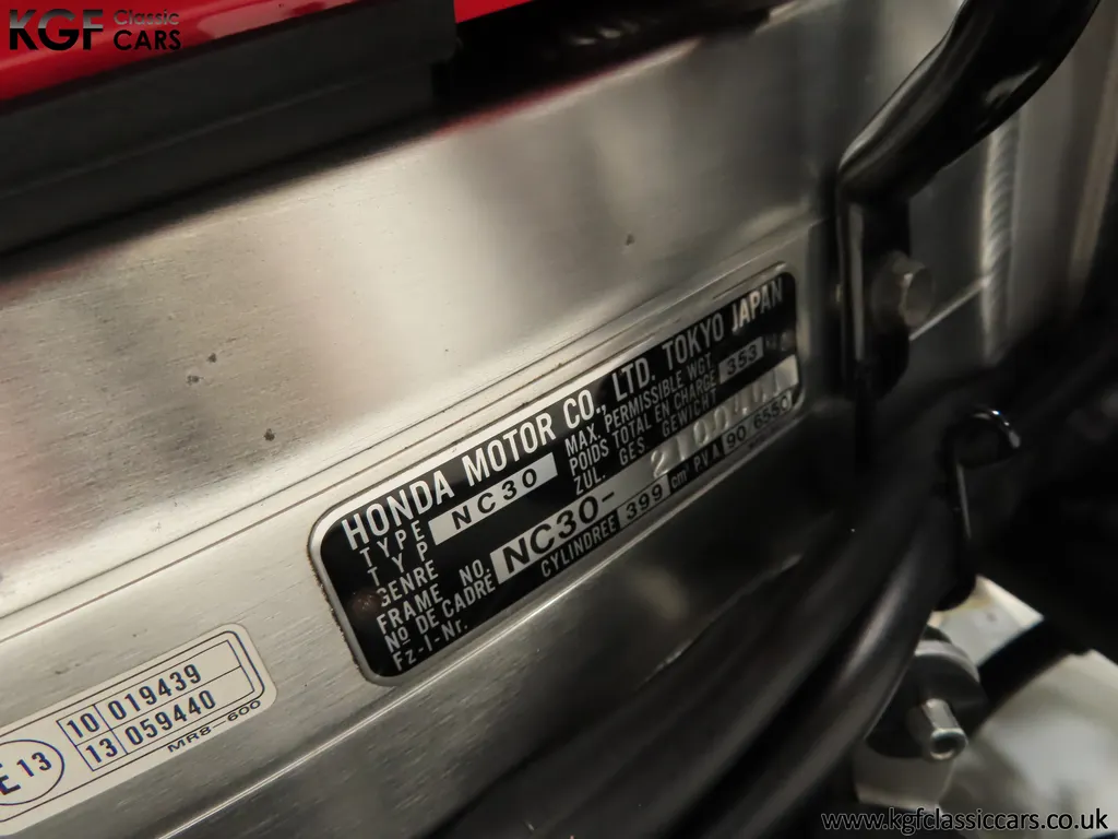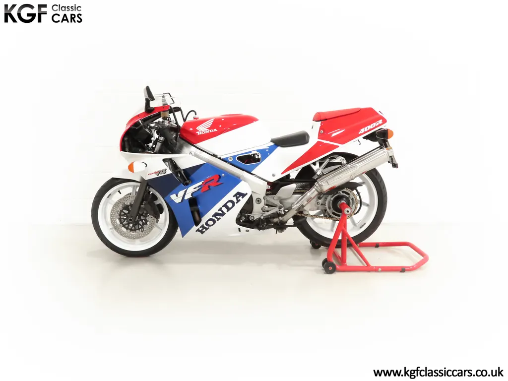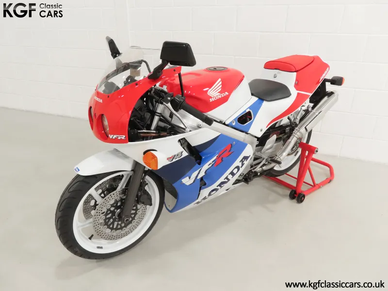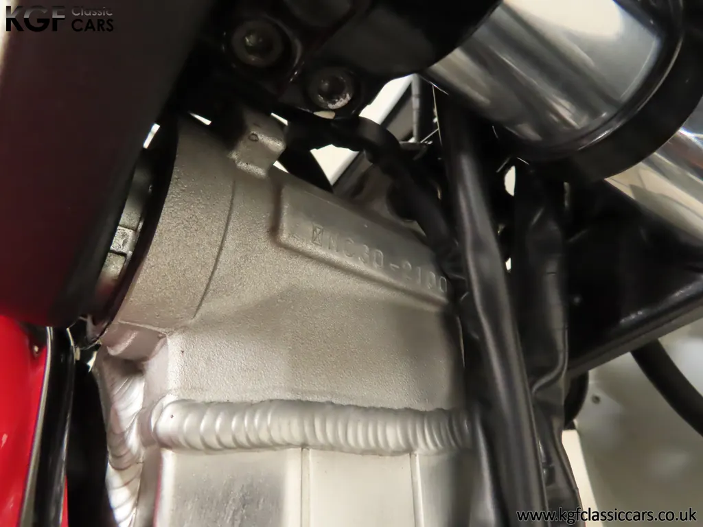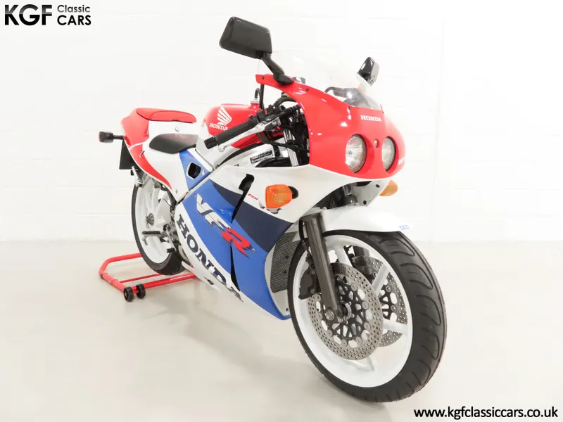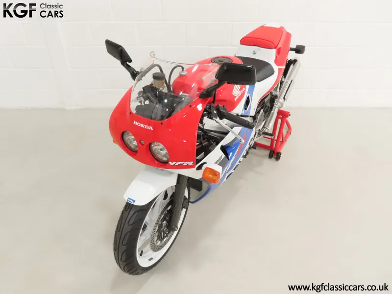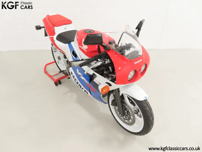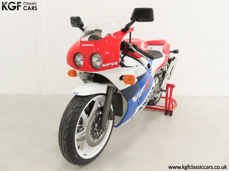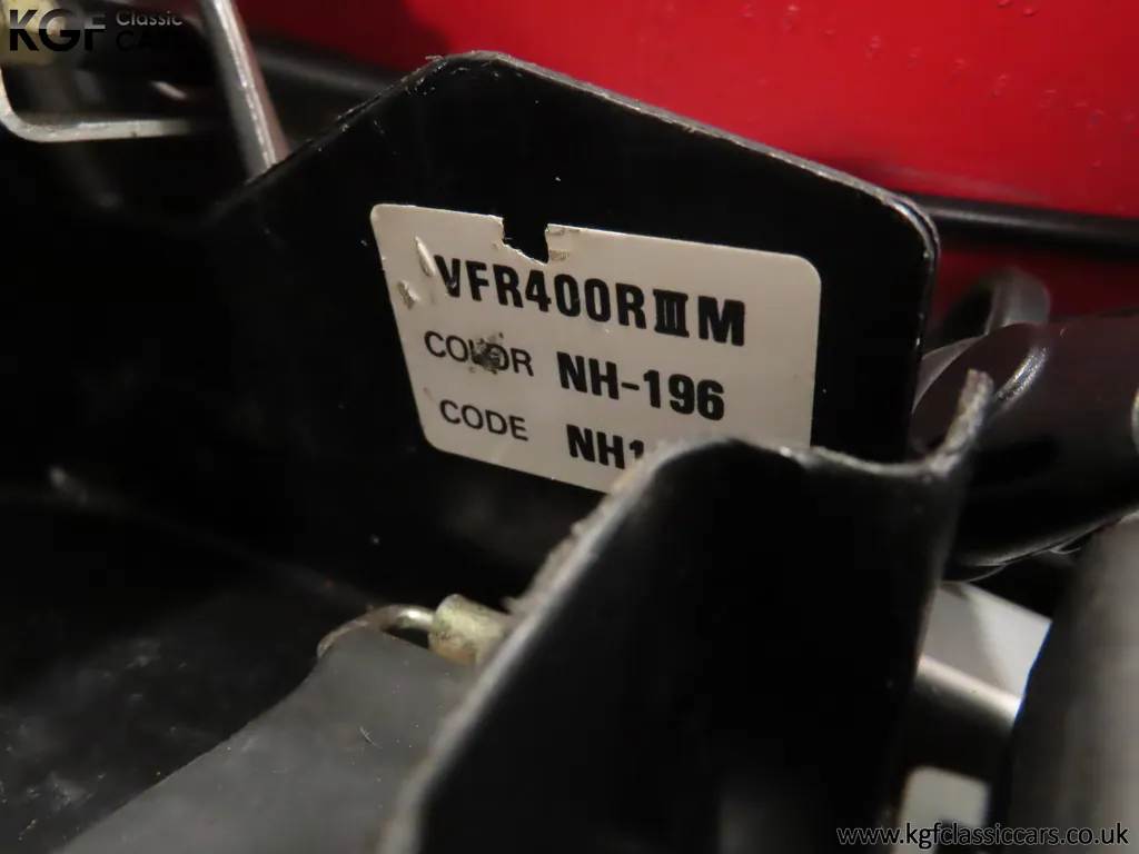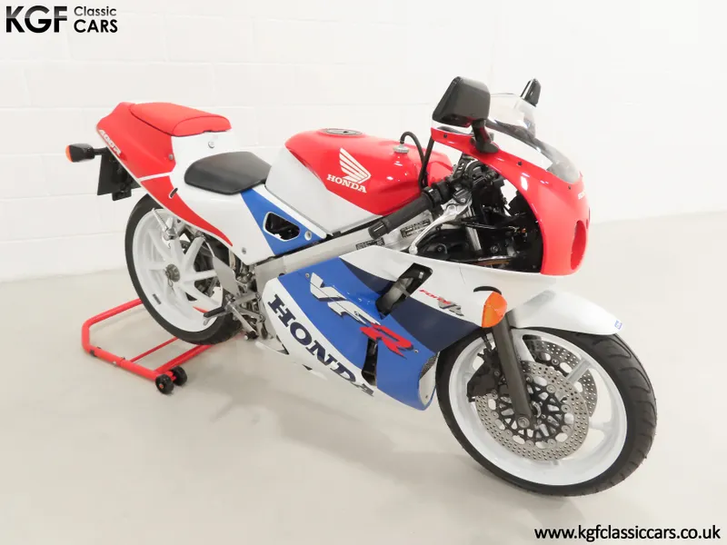 FOR SALE A genuine UK Honda VFR400R NC30 with only 3,946 miles from new. MODEL HISTORY A scaled down version of the larger VFR race models, the UK VFR400R NC30 was horrendously expensive and was similarly priced to 1000cc bikes of the time! Sharing many desirable features of the legendary RC30 homologation model created for World Superbike Championship such as Pro-Arm rear end, endurance style clocks, gear-driven camshafts, close-ratio style gearbox, and 360° firing order (and therefore exhaust note) as its 750cc inspiration. Rare UK bikes differ from their Japanese domestic market examples and are unrestricted with an oil cooler, larger hinged mirrors, separate numberplate lamp and different carbs amongst many more features. With the Honda Racing Corporation (HRC) build quality and rarity, it is no wonder these exotic miniatures are so collectable. EQUIPMENT High-rigidity aluminium frame, aerodynamic faring, twin-headlights, Pro Arm advanced suspension system, centrally fixed wheels, steering lock, lockable seat compartment, helmet holder, side stand down, electric start, mph speedo, coolant temperature gauge, headlight and dimmer switch, passing switch, horn button, oil, neutral, high beam and turn signal lamps, manual choke, tool kit. EXTERIOR To see a pristine and original UK supplied NC30 in the iconic Ross White, Fighting Red, Dakar Blue colour scheme, (Code NH196H), is a wonderful sight. Quality components and exemplary build quality are clearly apparent and more so in this beautifully preserved low mileage example. Factory standard aerodynamic faring remains untouched with original paint and decals, glossy bright and vibrant. The correct olive-green drab plating to components and delicate warning stickers remain attached, even to the chain guard and clear Perspex front screen. The mesh grille behind the front wheel has been dipped and zinc plated to factory specification and the original rear shock has the addition of a small Schrader valve to allow it to be re-gassed. The standard factory supplied Honda HM MR8 exhaust system remains fitted with no marks or dings and the supplying Motorcycle City number plates and front mudguard sticker are still attached. This UK bike is difficult to fault and must be one of the best available. ENGINE & TRANSMISSION The VFR400R’s compact liquid cooled V4 engine has smooth power with full torque to produce exhilarating performance. Being a matching numbers UK example, it is a full power unrestricted model with 63bhp and standard in all respects. Recent and expensive works by renown NC30 specialists, JTR Technica Ltd confirm UK standard E3FA carburettor, needles and jets and optimal running. Advanced features such as two-part radiator to assist cooling, oil cooler and 360° firing order producing a wonderful exhaust note, all add to the thrill on a bike only weighing 176kg. The Race-inspired close-ratio six-speed gearbox utilises every ounce of power. WHEELS, TYRES & BRAKES Pure white cast aluminium wheels are unmarked and are fitted with new, difficult to source and correctly sized, 120/60 R17 front and 150/60 R18 rear tyres to ensure the perfect ride as Honda intended. Powerful hydraulic twin-floating 296mm front discs with 4-pot callipers up front and a single disc to the rear provide controllable braking. HISTORY FILE This rare UK supplied matching numbers VFR400R NC30 was supplied by Motorcycle City (Sales) Ltd in Farnborough on the 11th September 1992 to a Mr Cooper. The New Bike invoice reveals the large sum paid for this model when new along with all other purchase documentation at handover. Mr Cooper enjoyed the bike for a few years before placing it in storage where it remained until he gifted it to his son in April 2019. Father and son lived at the same address as evidenced by issued registration documents. At this point the bike had covered just 3,876 miles and having briefly been put back on the road it was placed back into storage until the third and final keeper purchased it in May 2025. A passionate motorcycle collector, the bike went to NC30 specialists to be fully recommissioned and made roadworthy to enjoy once more. Only made available along with other bikes, cars and a Sinclair C5 that KGF Classic Cars also purchased due to a property investment opportunity. Supplied with all UK handbooks, service book, A4 history file and two sets of keys, (one unused and still its plastic sheaf), this rare and iconic superbike will satisfy the most demanding of connoisseurs and fanatical bike collectors. MOT October 2026, HPI Clear