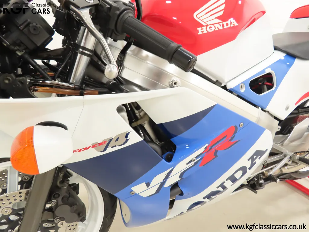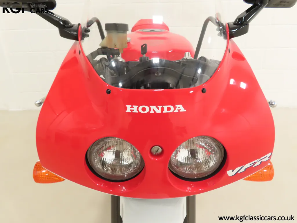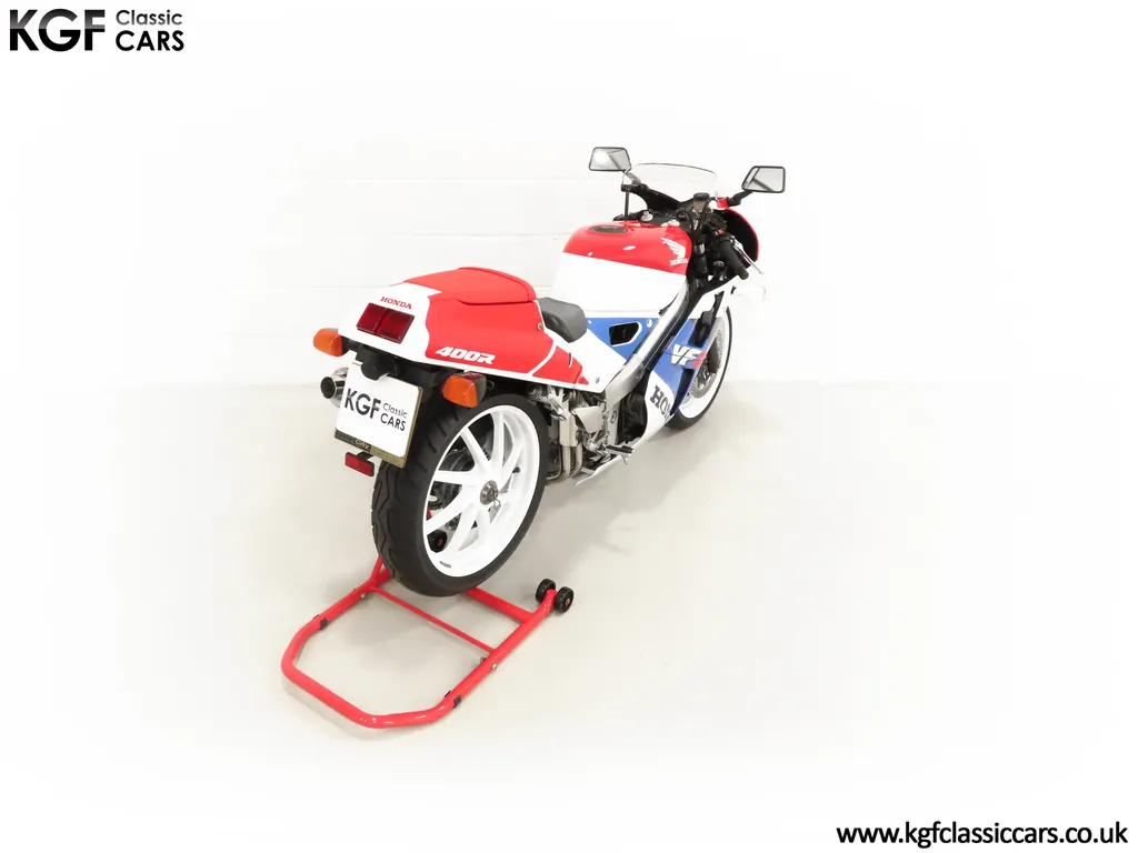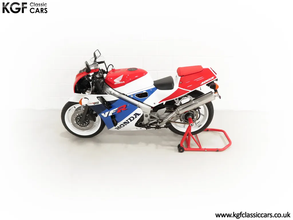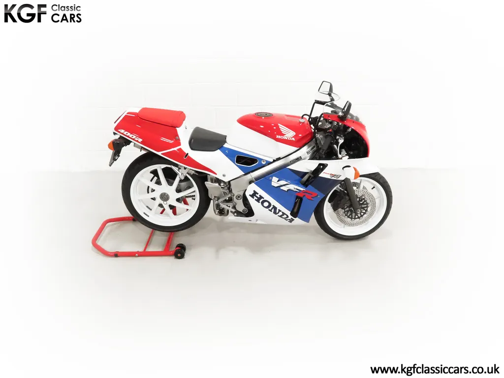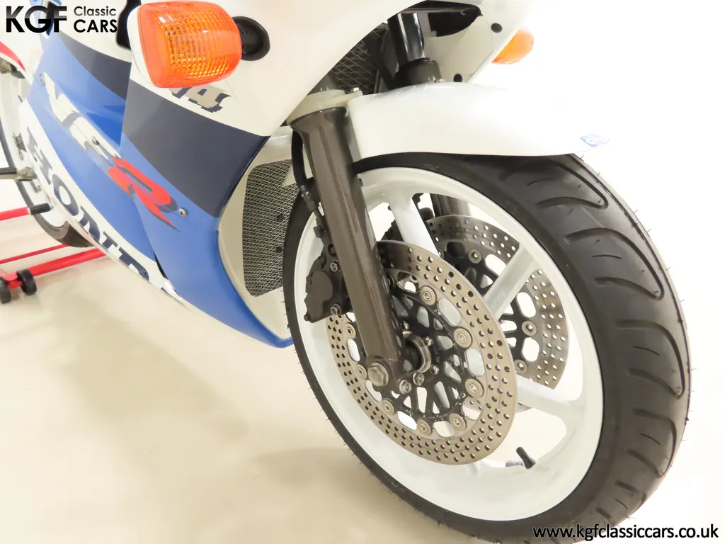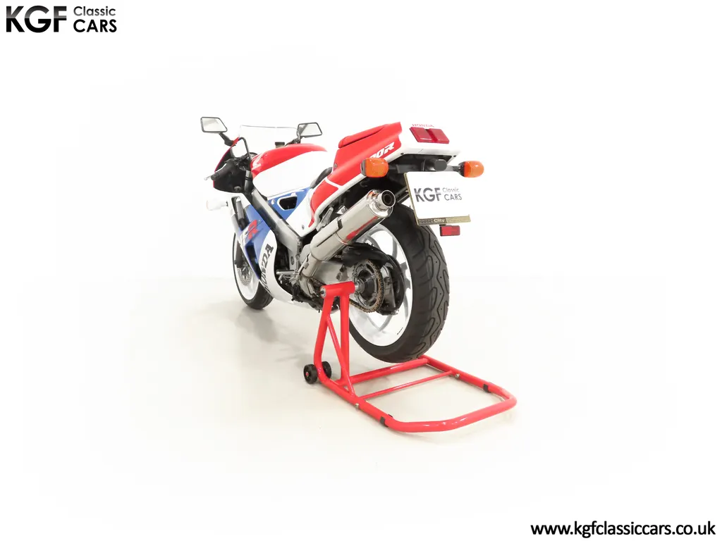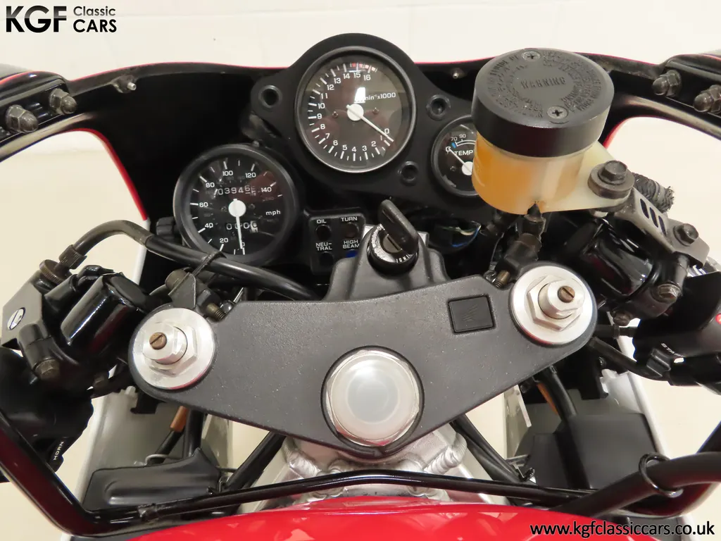 FOR SALE A genuine UK Honda VFR400R NC30 with only 3,946 miles from new. MODEL HISTORY A scaled down version of the larger VFR race models, the UK VFR400R NC30 was horrendously expensive and was similarly priced to 1000cc bikes of the time! Sharing many desirable features of the legendary RC30 homologation model created for World Superbike Championship such as Pro-Arm rear end, endurance style clocks, gear-driven camshafts, close-ratio style gearbox, and 360° firing order (and therefore exhaust note) as its 750cc inspiration. Rare UK bikes differ from their Japanese domestic market examples and are unrestricted with an oil cooler, larger hinged mirrors, separate numberplate lamp and different carbs amongst many more features. With the Honda Racing Corporation (HRC) build quality and rarity, it is no wonder these exotic miniatures are so collectable. EQUIPMENT High-rigidity aluminium frame, aerodynamic faring, twin-headlights, Pro Arm advanced suspension system, centrally fixed wheels, steering lock, lockable seat compartment, helmet holder, side stand down, electric start, mph speedo, coolant temperature gauge, headlight and dimmer switch, passing switch, horn button, oil, neutral, high beam and turn signal lamps, manual choke, tool kit. EXTERIOR To see a pristine and original UK supplied NC30 in the iconic Ross White, Fighting Red, Dakar Blue colour scheme, (Code NH196H), is a wonderful sight. Quality components and exemplary build quality are clearly apparent and more so in this beautifully preserved low mileage example. Factory standard aerodynamic faring remains untouched with original paint and decals, glossy bright and vibrant. The correct olive-green drab plating to components and delicate warning stickers remain attached, even to the chain guard and clear Perspex front screen. The mesh grille behind the front wheel has been dipped and zinc plated to factory specification and the original rear shock has the addition of a small Schrader valve to allow it to be re-gassed. The standard factory supplied Honda HM MR8 exhaust system remains fitted with no marks or dings and the supplying Motorcycle City number plates and front mudguard sticker are still attached. This UK bike is difficult to fault and must be one of the best available. ENGINE & TRANSMISSION The VFR400R’s compact liquid cooled V4 engine has smooth power with full torque to produce exhilarating performance. Being a matching numbers UK example, it is a full power unrestricted model with 63bhp and standard in all respects. Recent and expensive works by renown NC30 specialists, JTR Technica Ltd confirm UK standard E3FA carburettor, needles and jets and optimal running. Advanced features such as two-part radiator to assist cooling, oil cooler and 360° firing order producing a wonderful exhaust note, all add to the thrill on a bike only weighing 176kg. The Race-inspired close-ratio six-speed gearbox utilises every ounce of power. WHEELS, TYRES & BRAKES Pure white cast aluminium wheels are unmarked and are fitted with new, difficult to source and correctly sized, 120/60 R17 front and 150/60 R18 rear tyres to ensure the perfect ride as Honda intended. Powerful hydraulic twin-floating 296mm front discs with 4-pot callipers up front and a single disc to the rear provide controllable braking. HISTORY FILE This rare UK supplied matching numbers VFR400R NC30 was supplied by Motorcycle City (Sales) Ltd in Farnborough on the 11th September 1992 to a Mr Cooper. The New Bike invoice reveals the large sum paid for this model when new along with all other purchase documentation at handover. Mr Cooper enjoyed the bike for a few years before placing it in storage where it remained until he gifted it to his son in April 2019. Father and son lived at the same address as evidenced by issued registration documents. At this point the bike had covered just 3,876 miles and having briefly been put back on the road it was placed back into storage until the third and final keeper purchased it in May 2025. A passionate motorcycle collector, the bike went to NC30 specialists to be fully recommissioned and made roadworthy to enjoy once more. Only made available along with other bikes, cars and a Sinclair C5 that KGF Classic Cars also purchased due to a property investment opportunity. Supplied with all UK handbooks, service book, A4 history file and two sets of keys, (one unused and still its plastic sheaf), this rare and iconic superbike will satisfy the most demanding of connoisseurs and fanatical bike collectors. MOT October 2026, HPI Clear