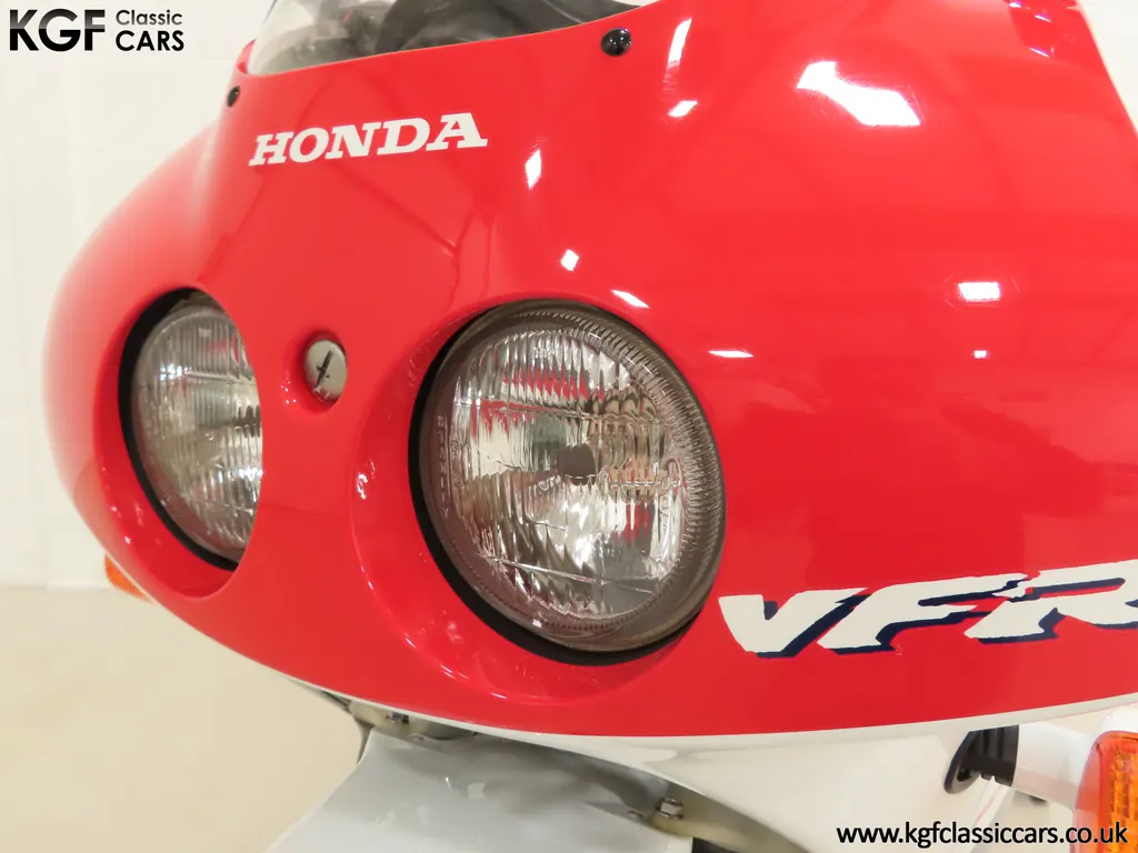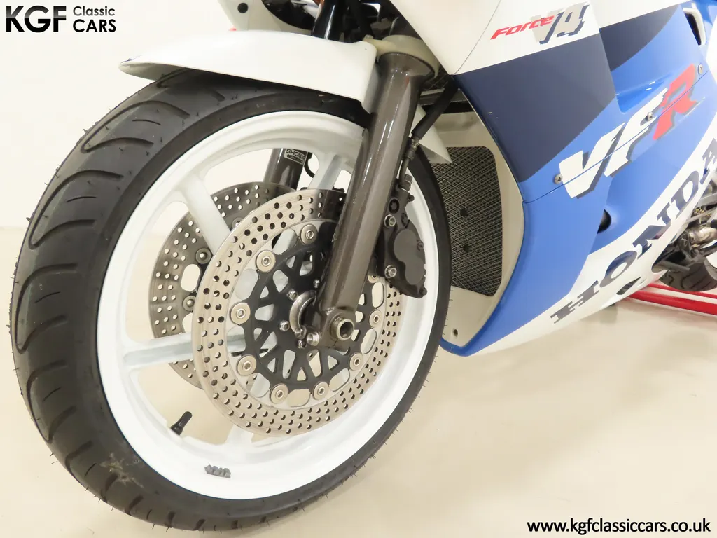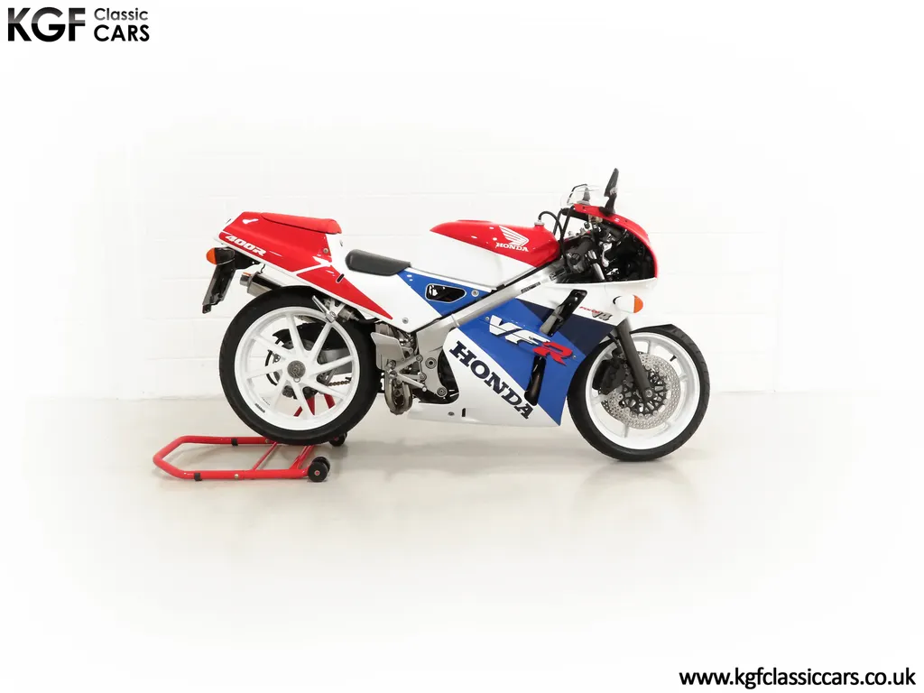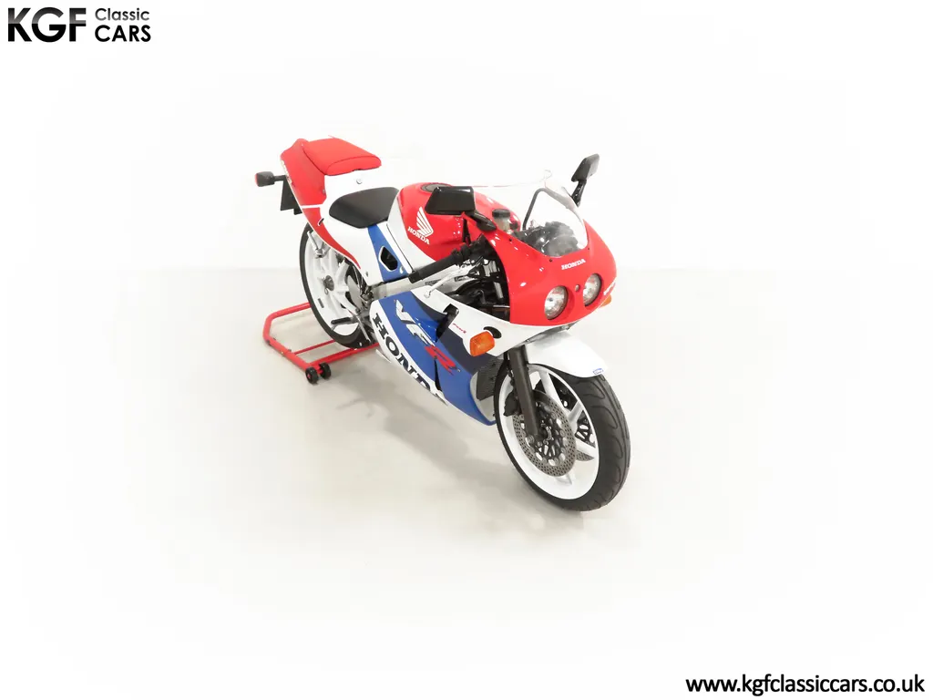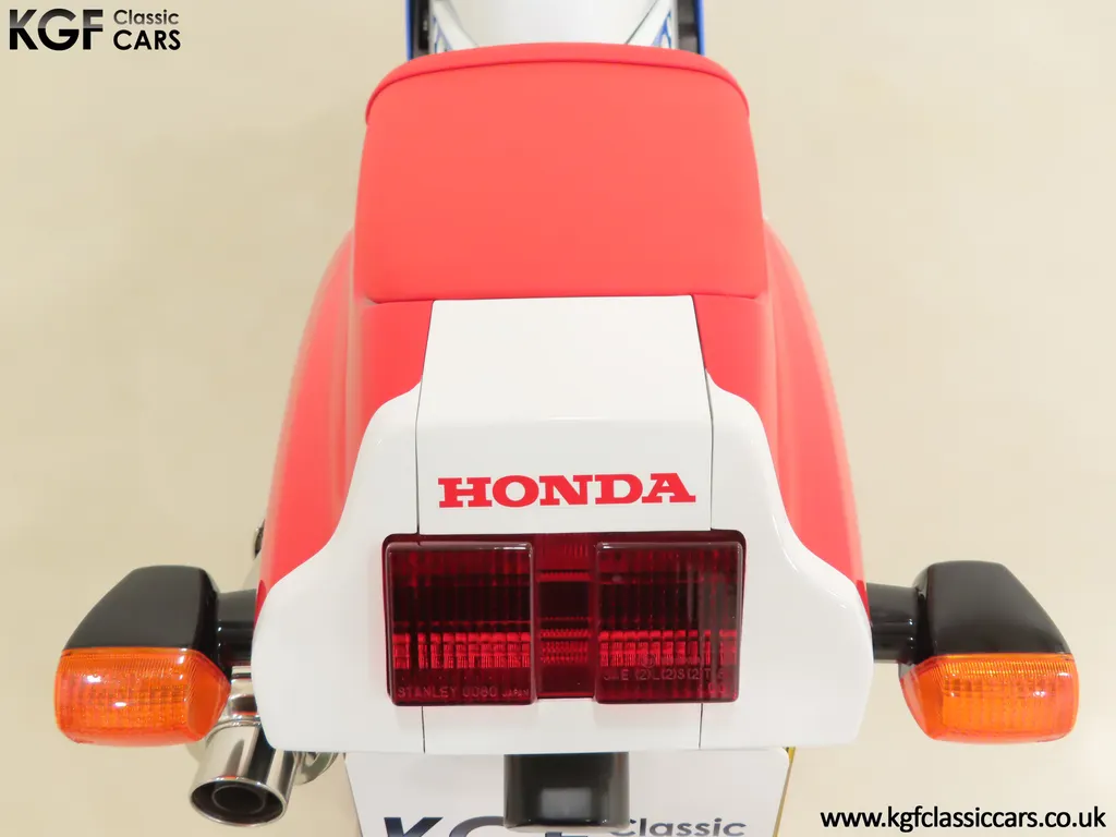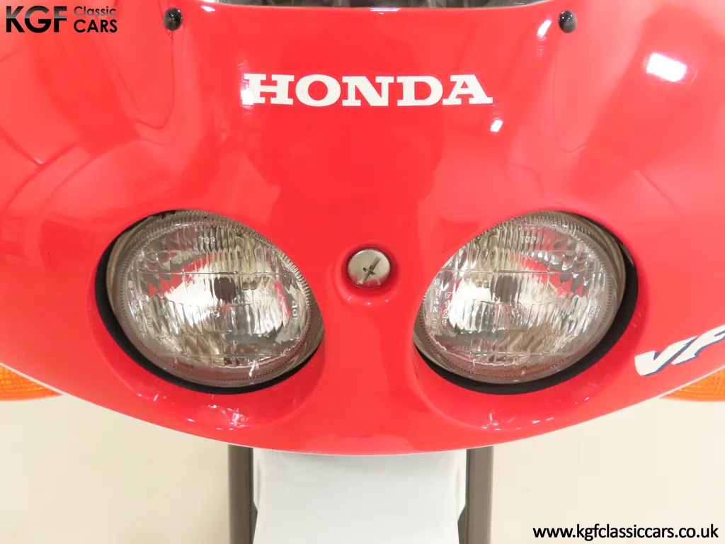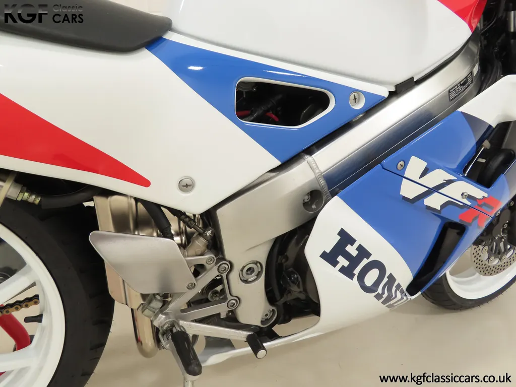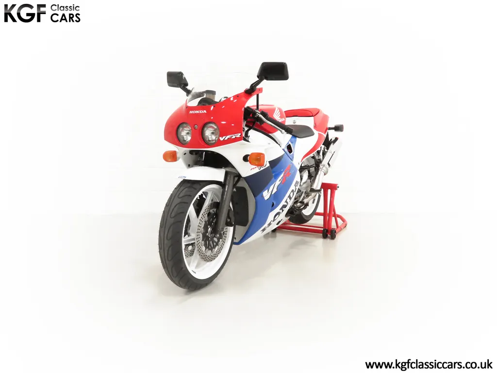 FOR SALE A genuine UK Honda VFR400R NC30 with only 3,946 miles from new. MODEL HISTORY A scaled down version of the larger VFR race models, the UK VFR400R NC30 was horrendously expensive and was similarly priced to 1000cc bikes of the time! Sharing many desirable features of the legendary RC30 homologation model created for World Superbike Championship such as Pro-Arm rear end, endurance style clocks, gear-driven camshafts, close-ratio style gearbox, and 360° firing order (and therefore exhaust note) as its 750cc inspiration. Rare UK bikes differ from their Japanese domestic market examples and are unrestricted with an oil cooler, larger hinged mirrors, separate numberplate lamp and different carbs amongst many more features. With the Honda Racing Corporation (HRC) build quality and rarity, it is no wonder these exotic miniatures are so collectable. EQUIPMENT High-rigidity aluminium frame, aerodynamic faring, twin-headlights, Pro Arm advanced suspension system, centrally fixed wheels, steering lock, lockable seat compartment, helmet holder, side stand down, electric start, mph speedo, coolant temperature gauge, headlight and dimmer switch, passing switch, horn button, oil, neutral, high beam and turn signal lamps, manual choke, tool kit. EXTERIOR To see a pristine and original UK supplied NC30 in the iconic Ross White, Fighting Red, Dakar Blue colour scheme, (Code NH196H), is a wonderful sight. Quality components and exemplary build quality are clearly apparent and more so in this beautifully preserved low mileage example. Factory standard aerodynamic faring remains untouched with original paint and decals, glossy bright and vibrant. The correct olive-green drab plating to components and delicate warning stickers remain attached, even to the chain guard and clear Perspex front screen. The mesh grille behind the front wheel has been dipped and zinc plated to factory specification and the original rear shock has the addition of a small Schrader valve to allow it to be re-gassed. The standard factory supplied Honda HM MR8 exhaust system remains fitted with no marks or dings and the supplying Motorcycle City number plates and front mudguard sticker are still attached. This UK bike is difficult to fault and must be one of the best available. ENGINE & TRANSMISSION The VFR400R’s compact liquid cooled V4 engine has smooth power with full torque to produce exhilarating performance. Being a matching numbers UK example, it is a full power unrestricted model with 63bhp and standard in all respects. Recent and expensive works by renown NC30 specialists, JTR Technica Ltd confirm UK standard E3FA carburettor, needles and jets and optimal running. Advanced features such as two-part radiator to assist cooling, oil cooler and 360° firing order producing a wonderful exhaust note, all add to the thrill on a bike only weighing 176kg. The Race-inspired close-ratio six-speed gearbox utilises every ounce of power. WHEELS, TYRES & BRAKES Pure white cast aluminium wheels are unmarked and are fitted with new, difficult to source and correctly sized, 120/60 R17 front and 150/60 R18 rear tyres to ensure the perfect ride as Honda intended. Powerful hydraulic twin-floating 296mm front discs with 4-pot callipers up front and a single disc to the rear provide controllable braking. HISTORY FILE This rare UK supplied matching numbers VFR400R NC30 was supplied by Motorcycle City (Sales) Ltd in Farnborough on the 11th September 1992 to a Mr Cooper. The New Bike invoice reveals the large sum paid for this model when new along with all other purchase documentation at handover. Mr Cooper enjoyed the bike for a few years before placing it in storage where it remained until he gifted it to his son in April 2019. Father and son lived at the same address as evidenced by issued registration documents. At this point the bike had covered just 3,876 miles and having briefly been put back on the road it was placed back into storage until the third and final keeper purchased it in May 2025. A passionate motorcycle collector, the bike went to NC30 specialists to be fully recommissioned and made roadworthy to enjoy once more. Only made available along with other bikes, cars and a Sinclair C5 that KGF Classic Cars also purchased due to a property investment opportunity. Supplied with all UK handbooks, service book, A4 history file and two sets of keys, (one unused and still its plastic sheaf), this rare and iconic superbike will satisfy the most demanding of connoisseurs and fanatical bike collectors. MOT October 2026, HPI Clear