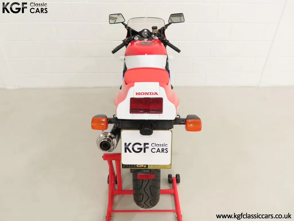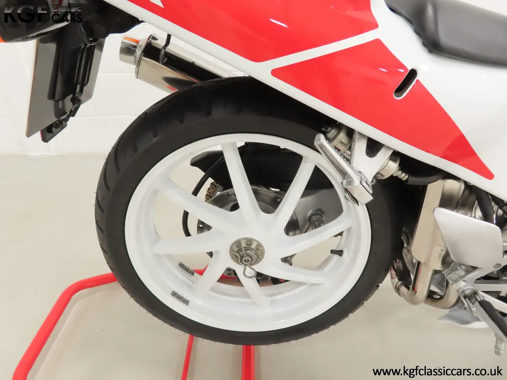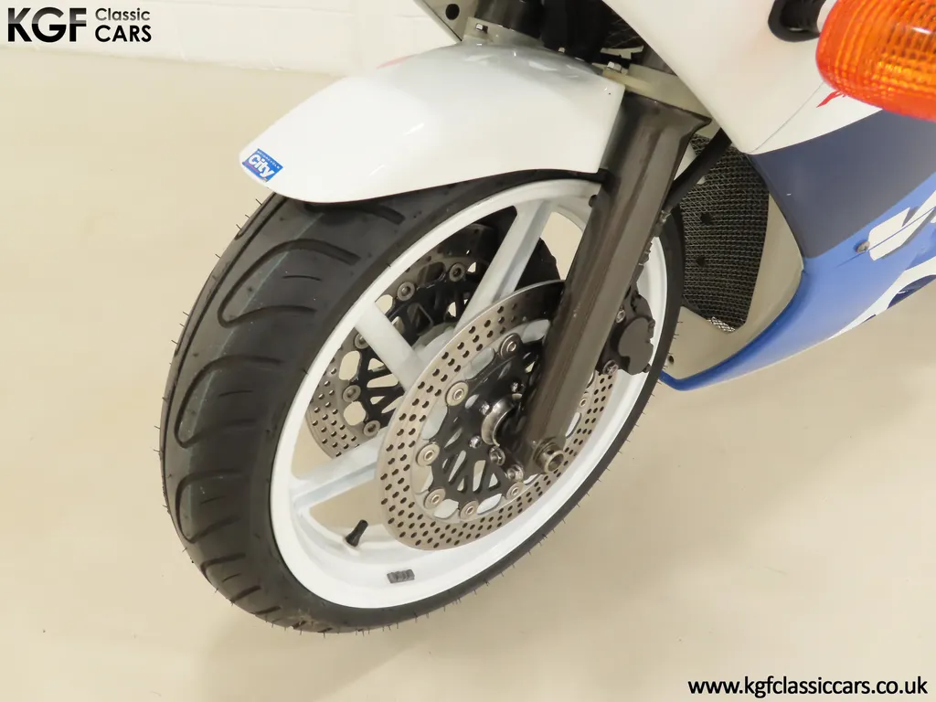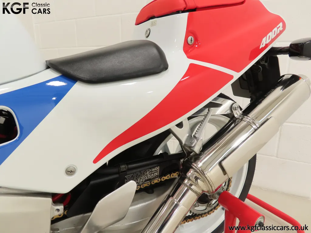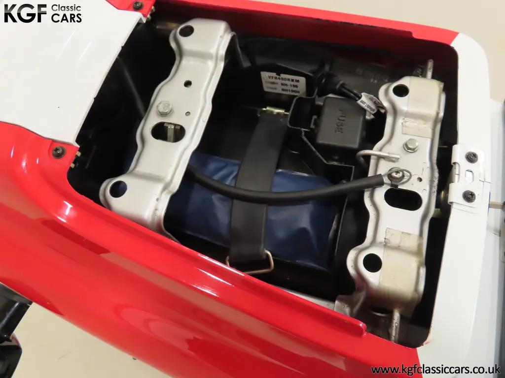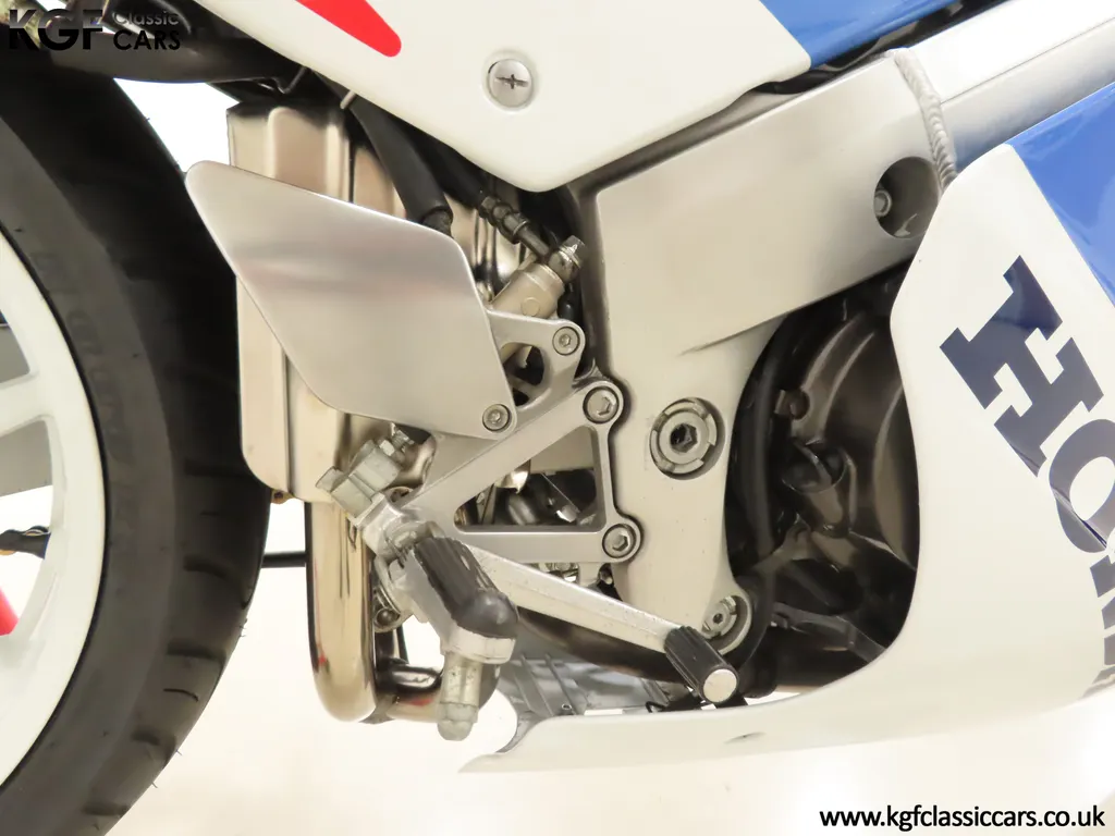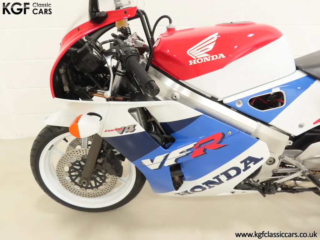 FOR SALE A genuine UK Honda VFR400R NC30 with only 3,946 miles from new. MODEL HISTORY A scaled down version of the larger VFR race models, the UK VFR400R NC30 was horrendously expensive and was similarly priced to 1000cc bikes of the time! Sharing many desirable features of the legendary RC30 homologation model created for World Superbike Championship such as Pro-Arm rear end, endurance style clocks, gear-driven camshafts, close-ratio style gearbox, and 360° firing order (and therefore exhaust note) as its 750cc inspiration. Rare UK bikes differ from their Japanese domestic market examples and are unrestricted with an oil cooler, larger hinged mirrors, separate numberplate lamp and different carbs amongst many more features. With the Honda Racing Corporation (HRC) build quality and rarity, it is no wonder these exotic miniatures are so collectable. EQUIPMENT High-rigidity aluminium frame, aerodynamic faring, twin-headlights, Pro Arm advanced suspension system, centrally fixed wheels, steering lock, lockable seat compartment, helmet holder, side stand down, electric start, mph speedo, coolant temperature gauge, headlight and dimmer switch, passing switch, horn button, oil, neutral, high beam and turn signal lamps, manual choke, tool kit. EXTERIOR To see a pristine and original UK supplied NC30 in the iconic Ross White, Fighting Red, Dakar Blue colour scheme, (Code NH196H), is a wonderful sight. Quality components and exemplary build quality are clearly apparent and more so in this beautifully preserved low mileage example. Factory standard aerodynamic faring remains untouched with original paint and decals, glossy bright and vibrant. The correct olive-green drab plating to components and delicate warning stickers remain attached, even to the chain guard and clear Perspex front screen. The mesh grille behind the front wheel has been dipped and zinc plated to factory specification and the original rear shock has the addition of a small Schrader valve to allow it to be re-gassed. The standard factory supplied Honda HM MR8 exhaust system remains fitted with no marks or dings and the supplying Motorcycle City number plates and front mudguard sticker are still attached. This UK bike is difficult to fault and must be one of the best available. ENGINE & TRANSMISSION The VFR400R’s compact liquid cooled V4 engine has smooth power with full torque to produce exhilarating performance. Being a matching numbers UK example, it is a full power unrestricted model with 63bhp and standard in all respects. Recent and expensive works by renown NC30 specialists, JTR Technica Ltd confirm UK standard E3FA carburettor, needles and jets and optimal running. Advanced features such as two-part radiator to assist cooling, oil cooler and 360° firing order producing a wonderful exhaust note, all add to the thrill on a bike only weighing 176kg. The Race-inspired close-ratio six-speed gearbox utilises every ounce of power. WHEELS, TYRES & BRAKES Pure white cast aluminium wheels are unmarked and are fitted with new, difficult to source and correctly sized, 120/60 R17 front and 150/60 R18 rear tyres to ensure the perfect ride as Honda intended. Powerful hydraulic twin-floating 296mm front discs with 4-pot callipers up front and a single disc to the rear provide controllable braking. HISTORY FILE This rare UK supplied matching numbers VFR400R NC30 was supplied by Motorcycle City (Sales) Ltd in Farnborough on the 11th September 1992 to a Mr Cooper. The New Bike invoice reveals the large sum paid for this model when new along with all other purchase documentation at handover. Mr Cooper enjoyed the bike for a few years before placing it in storage where it remained until he gifted it to his son in April 2019. Father and son lived at the same address as evidenced by issued registration documents. At this point the bike had covered just 3,876 miles and having briefly been put back on the road it was placed back into storage until the third and final keeper purchased it in May 2025. A passionate motorcycle collector, the bike went to NC30 specialists to be fully recommissioned and made roadworthy to enjoy once more. Only made available along with other bikes, cars and a Sinclair C5 that KGF Classic Cars also purchased due to a property investment opportunity. Supplied with all UK handbooks, service book, A4 history file and two sets of keys, (one unused and still its plastic sheaf), this rare and iconic superbike will satisfy the most demanding of connoisseurs and fanatical bike collectors. MOT October 2026, HPI Clear