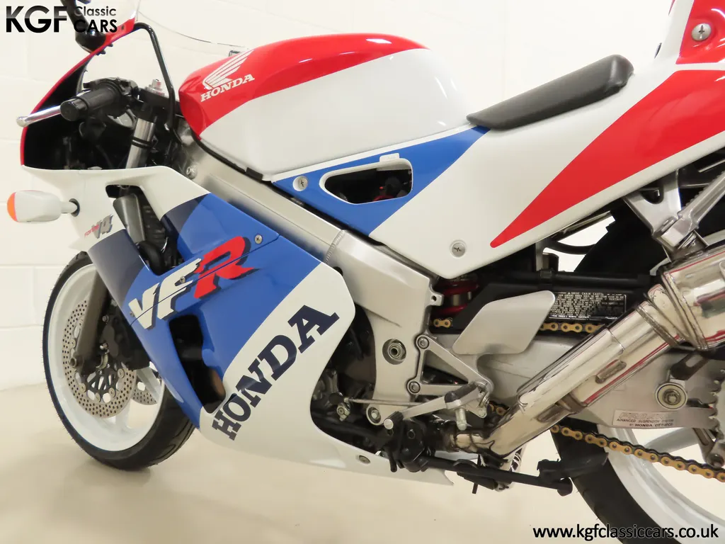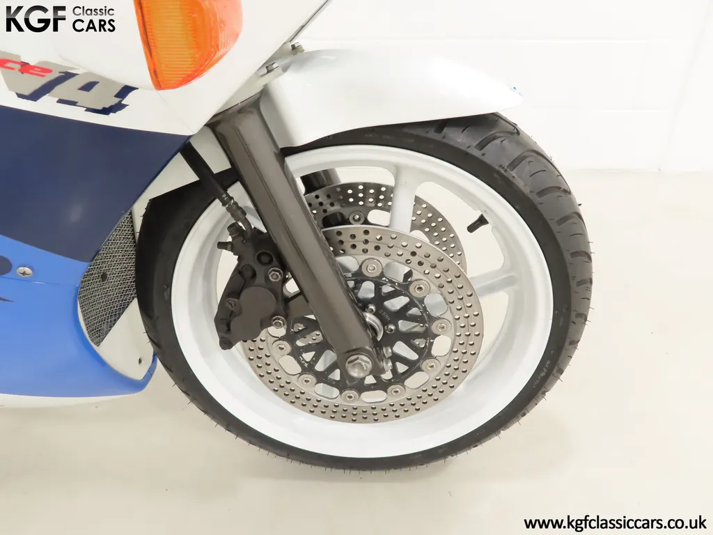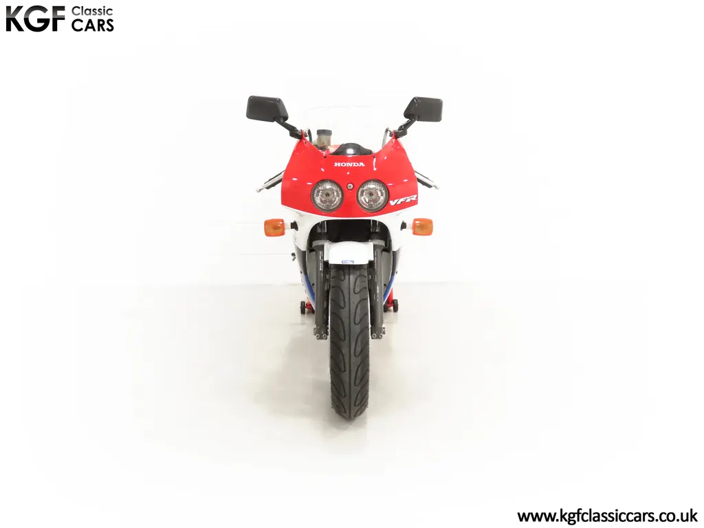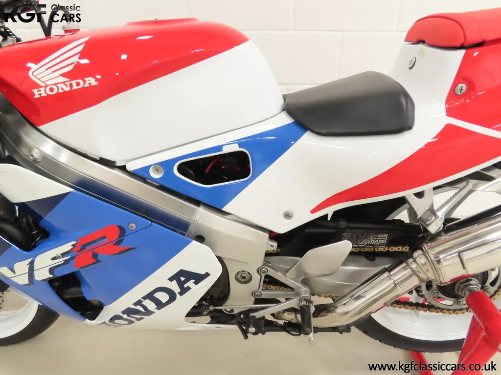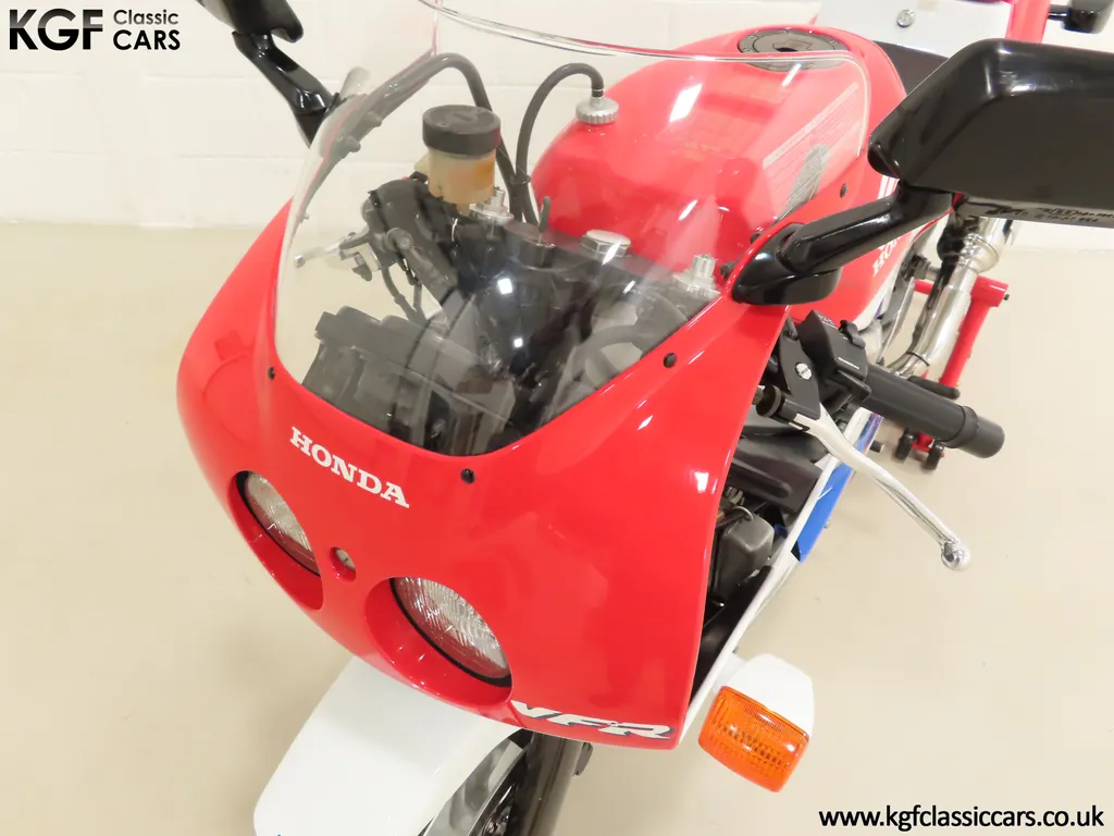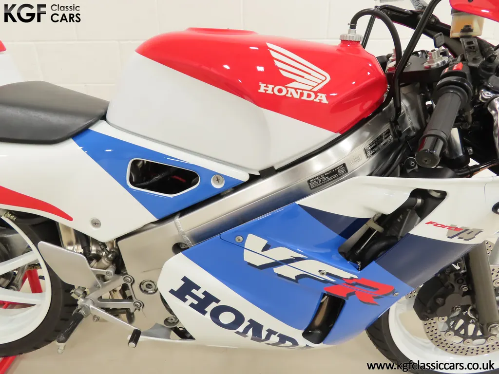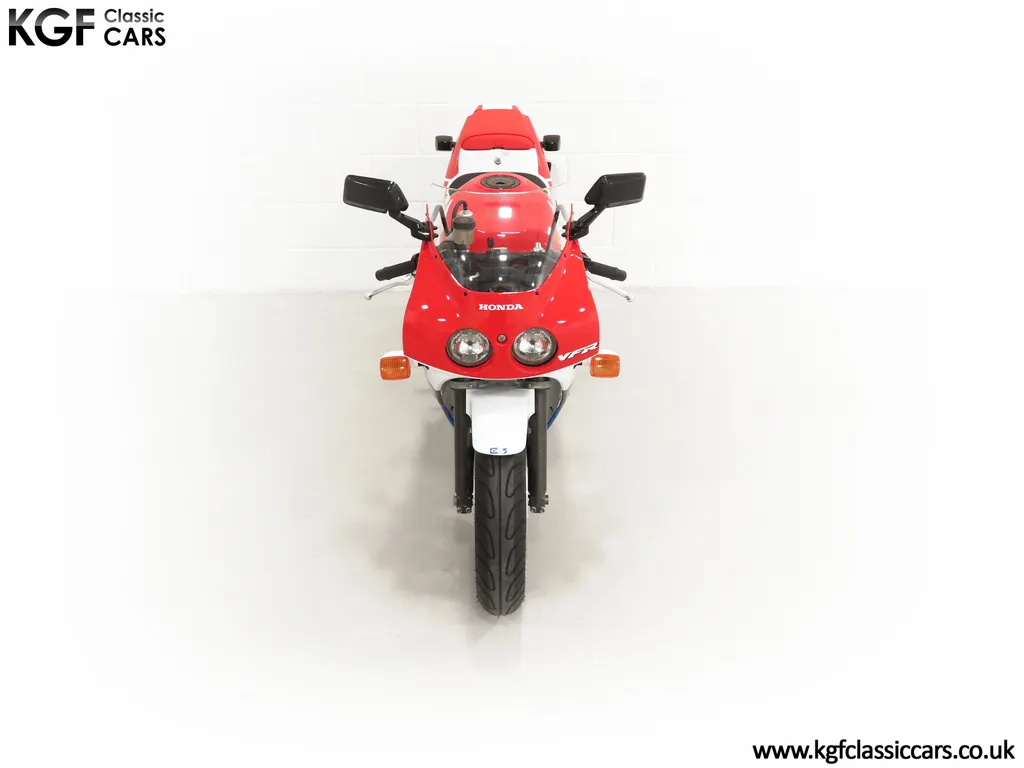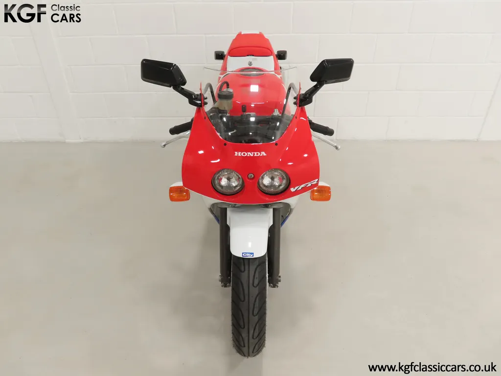 FOR SALE A genuine UK Honda VFR400R NC30 with only 3,946 miles from new. MODEL HISTORY A scaled down version of the larger VFR race models, the UK VFR400R NC30 was horrendously expensive and was similarly priced to 1000cc bikes of the time! Sharing many desirable features of the legendary RC30 homologation model created for World Superbike Championship such as Pro-Arm rear end, endurance style clocks, gear-driven camshafts, close-ratio style gearbox, and 360° firing order (and therefore exhaust note) as its 750cc inspiration. Rare UK bikes differ from their Japanese domestic market examples and are unrestricted with an oil cooler, larger hinged mirrors, separate numberplate lamp and different carbs amongst many more features. With the Honda Racing Corporation (HRC) build quality and rarity, it is no wonder these exotic miniatures are so collectable. EQUIPMENT High-rigidity aluminium frame, aerodynamic faring, twin-headlights, Pro Arm advanced suspension system, centrally fixed wheels, steering lock, lockable seat compartment, helmet holder, side stand down, electric start, mph speedo, coolant temperature gauge, headlight and dimmer switch, passing switch, horn button, oil, neutral, high beam and turn signal lamps, manual choke, tool kit. EXTERIOR To see a pristine and original UK supplied NC30 in the iconic Ross White, Fighting Red, Dakar Blue colour scheme, (Code NH196H), is a wonderful sight. Quality components and exemplary build quality are clearly apparent and more so in this beautifully preserved low mileage example. Factory standard aerodynamic faring remains untouched with original paint and decals, glossy bright and vibrant. The correct olive-green drab plating to components and delicate warning stickers remain attached, even to the chain guard and clear Perspex front screen. The mesh grille behind the front wheel has been dipped and zinc plated to factory specification and the original rear shock has the addition of a small Schrader valve to allow it to be re-gassed. The standard factory supplied Honda HM MR8 exhaust system remains fitted with no marks or dings and the supplying Motorcycle City number plates and front mudguard sticker are still attached. This UK bike is difficult to fault and must be one of the best available. ENGINE & TRANSMISSION The VFR400R’s compact liquid cooled V4 engine has smooth power with full torque to produce exhilarating performance. Being a matching numbers UK example, it is a full power unrestricted model with 63bhp and standard in all respects. Recent and expensive works by renown NC30 specialists, JTR Technica Ltd confirm UK standard E3FA carburettor, needles and jets and optimal running. Advanced features such as two-part radiator to assist cooling, oil cooler and 360° firing order producing a wonderful exhaust note, all add to the thrill on a bike only weighing 176kg. The Race-inspired close-ratio six-speed gearbox utilises every ounce of power. WHEELS, TYRES & BRAKES Pure white cast aluminium wheels are unmarked and are fitted with new, difficult to source and correctly sized, 120/60 R17 front and 150/60 R18 rear tyres to ensure the perfect ride as Honda intended. Powerful hydraulic twin-floating 296mm front discs with 4-pot callipers up front and a single disc to the rear provide controllable braking. HISTORY FILE This rare UK supplied matching numbers VFR400R NC30 was supplied by Motorcycle City (Sales) Ltd in Farnborough on the 11th September 1992 to a Mr Cooper. The New Bike invoice reveals the large sum paid for this model when new along with all other purchase documentation at handover. Mr Cooper enjoyed the bike for a few years before placing it in storage where it remained until he gifted it to his son in April 2019. Father and son lived at the same address as evidenced by issued registration documents. At this point the bike had covered just 3,876 miles and having briefly been put back on the road it was placed back into storage until the third and final keeper purchased it in May 2025. A passionate motorcycle collector, the bike went to NC30 specialists to be fully recommissioned and made roadworthy to enjoy once more. Only made available along with other bikes, cars and a Sinclair C5 that KGF Classic Cars also purchased due to a property investment opportunity. Supplied with all UK handbooks, service book, A4 history file and two sets of keys, (one unused and still its plastic sheaf), this rare and iconic superbike will satisfy the most demanding of connoisseurs and fanatical bike collectors. MOT October 2026, HPI Clear