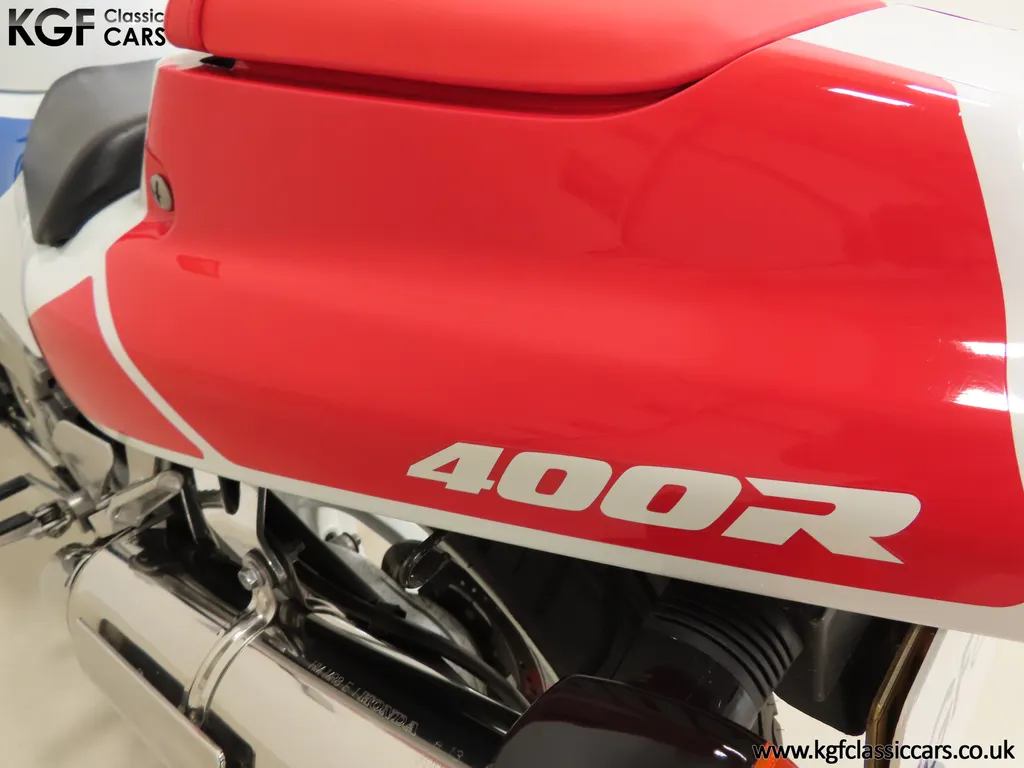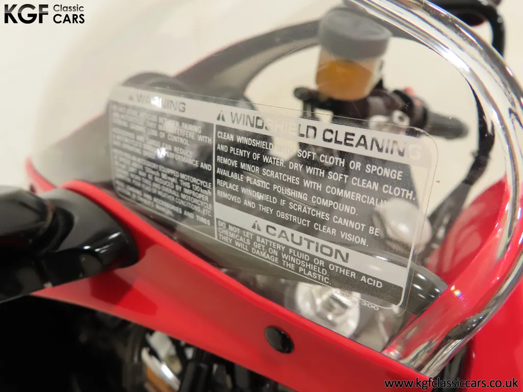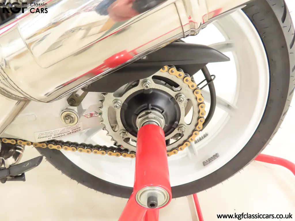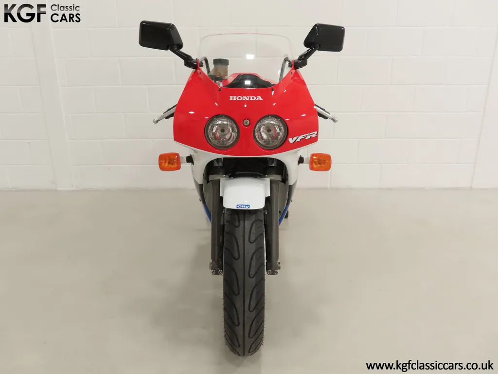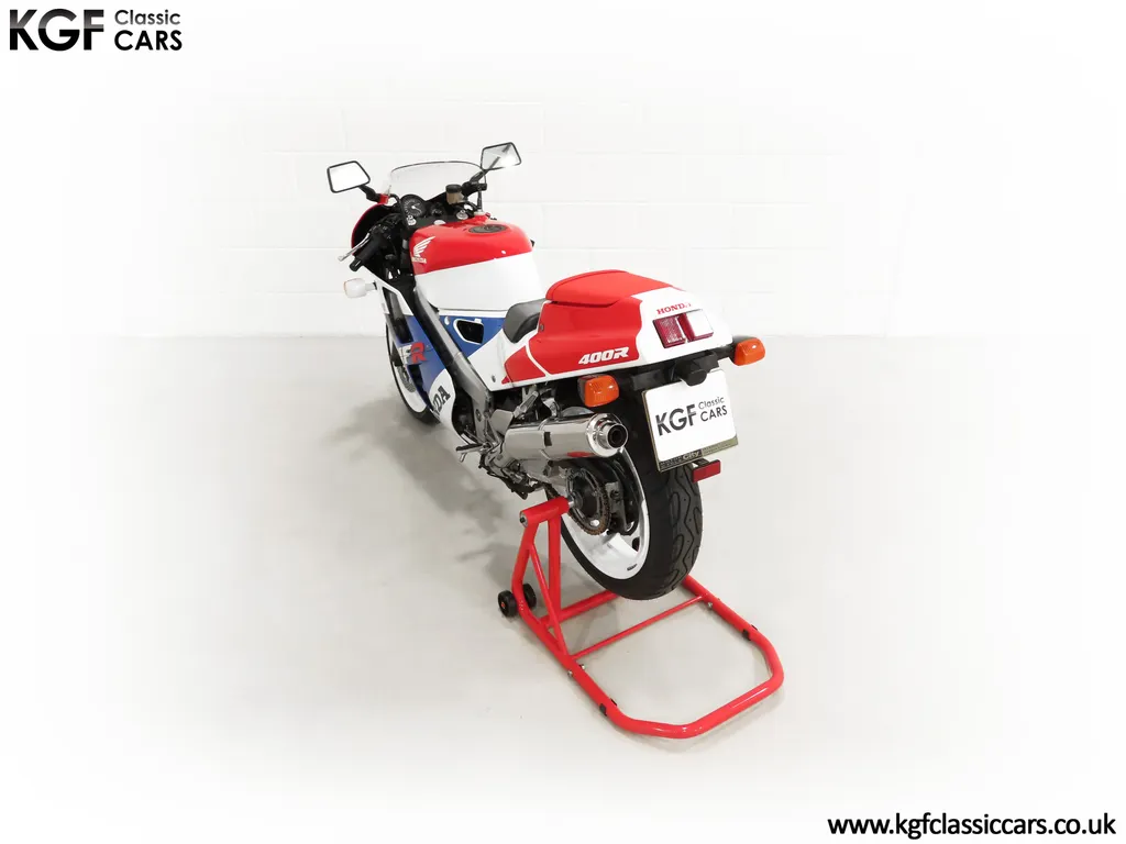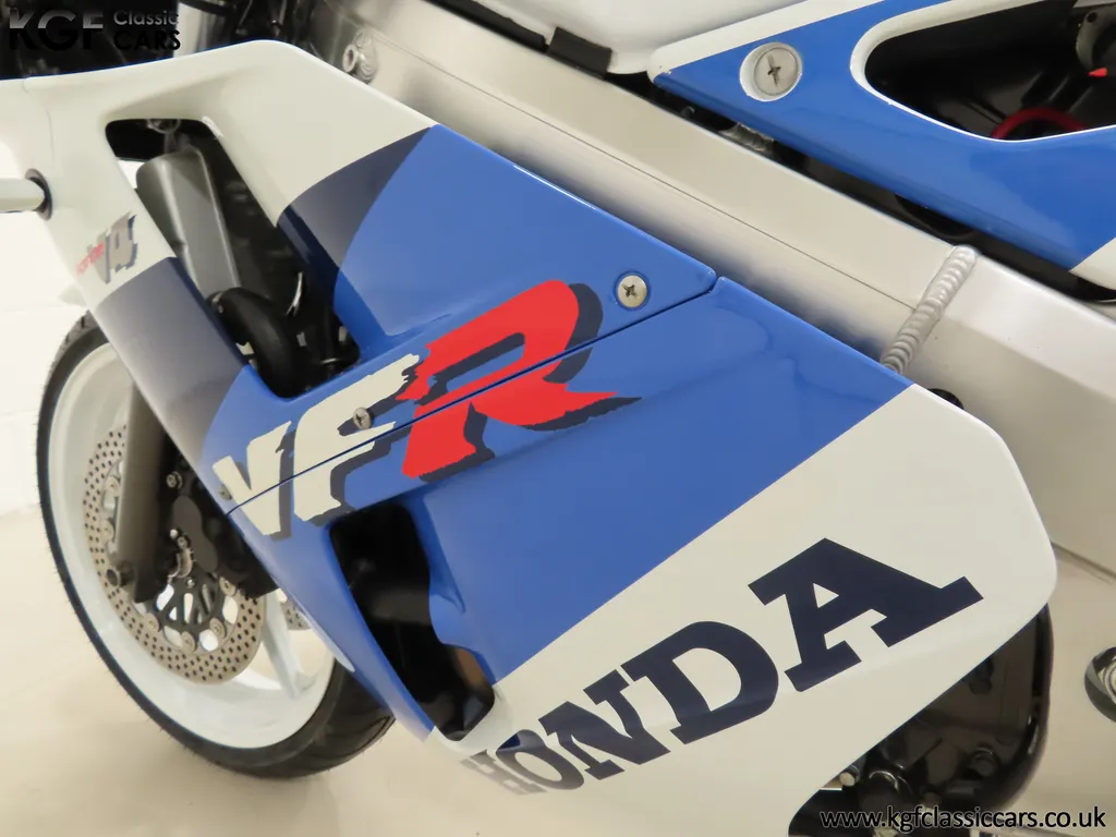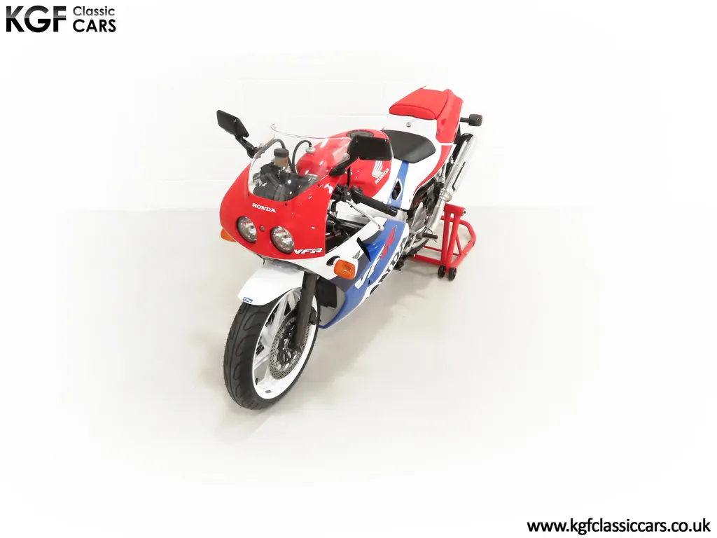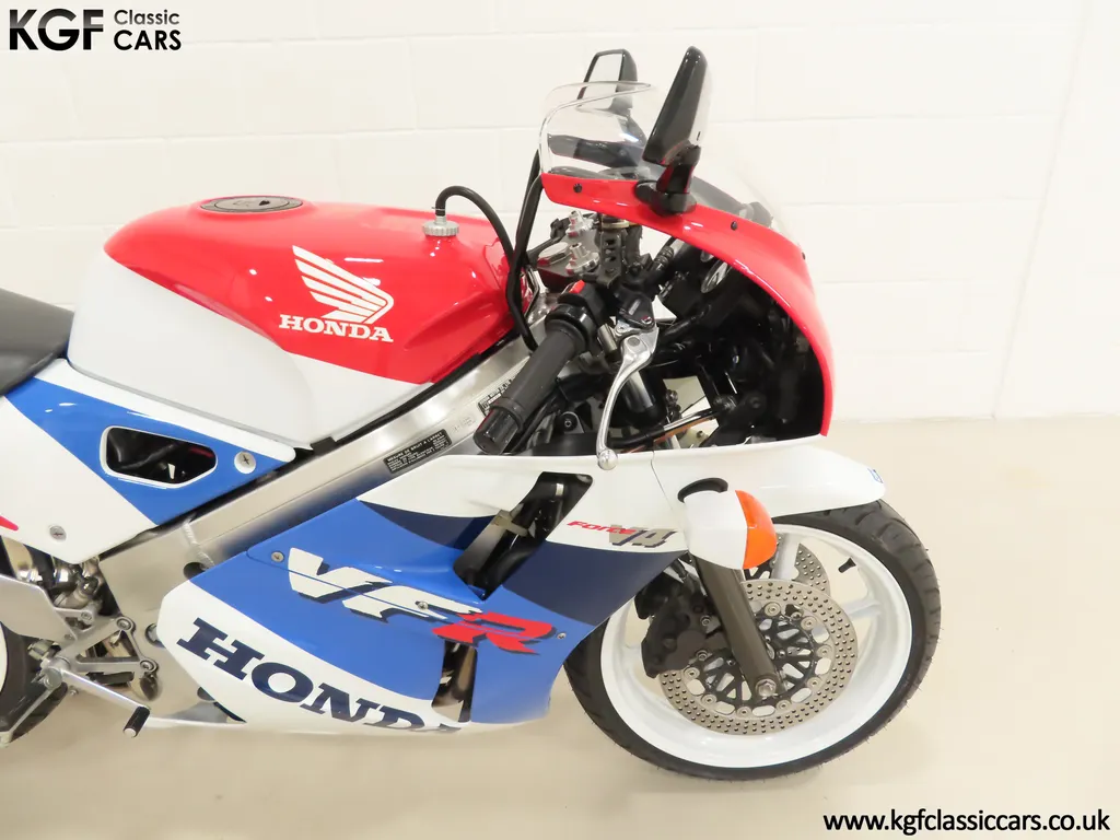 FOR SALE A genuine UK Honda VFR400R NC30 with only 3,946 miles from new. MODEL HISTORY A scaled down version of the larger VFR race models, the UK VFR400R NC30 was horrendously expensive and was similarly priced to 1000cc bikes of the time! Sharing many desirable features of the legendary RC30 homologation model created for World Superbike Championship such as Pro-Arm rear end, endurance style clocks, gear-driven camshafts, close-ratio style gearbox, and 360° firing order (and therefore exhaust note) as its 750cc inspiration. Rare UK bikes differ from their Japanese domestic market examples and are unrestricted with an oil cooler, larger hinged mirrors, separate numberplate lamp and different carbs amongst many more features. With the Honda Racing Corporation (HRC) build quality and rarity, it is no wonder these exotic miniatures are so collectable. EQUIPMENT High-rigidity aluminium frame, aerodynamic faring, twin-headlights, Pro Arm advanced suspension system, centrally fixed wheels, steering lock, lockable seat compartment, helmet holder, side stand down, electric start, mph speedo, coolant temperature gauge, headlight and dimmer switch, passing switch, horn button, oil, neutral, high beam and turn signal lamps, manual choke, tool kit. EXTERIOR To see a pristine and original UK supplied NC30 in the iconic Ross White, Fighting Red, Dakar Blue colour scheme, (Code NH196H), is a wonderful sight. Quality components and exemplary build quality are clearly apparent and more so in this beautifully preserved low mileage example. Factory standard aerodynamic faring remains untouched with original paint and decals, glossy bright and vibrant. The correct olive-green drab plating to components and delicate warning stickers remain attached, even to the chain guard and clear Perspex front screen. The mesh grille behind the front wheel has been dipped and zinc plated to factory specification and the original rear shock has the addition of a small Schrader valve to allow it to be re-gassed. The standard factory supplied Honda HM MR8 exhaust system remains fitted with no marks or dings and the supplying Motorcycle City number plates and front mudguard sticker are still attached. This UK bike is difficult to fault and must be one of the best available. ENGINE & TRANSMISSION The VFR400R’s compact liquid cooled V4 engine has smooth power with full torque to produce exhilarating performance. Being a matching numbers UK example, it is a full power unrestricted model with 63bhp and standard in all respects. Recent and expensive works by renown NC30 specialists, JTR Technica Ltd confirm UK standard E3FA carburettor, needles and jets and optimal running. Advanced features such as two-part radiator to assist cooling, oil cooler and 360° firing order producing a wonderful exhaust note, all add to the thrill on a bike only weighing 176kg. The Race-inspired close-ratio six-speed gearbox utilises every ounce of power. WHEELS, TYRES & BRAKES Pure white cast aluminium wheels are unmarked and are fitted with new, difficult to source and correctly sized, 120/60 R17 front and 150/60 R18 rear tyres to ensure the perfect ride as Honda intended. Powerful hydraulic twin-floating 296mm front discs with 4-pot callipers up front and a single disc to the rear provide controllable braking. HISTORY FILE This rare UK supplied matching numbers VFR400R NC30 was supplied by Motorcycle City (Sales) Ltd in Farnborough on the 11th September 1992 to a Mr Cooper. The New Bike invoice reveals the large sum paid for this model when new along with all other purchase documentation at handover. Mr Cooper enjoyed the bike for a few years before placing it in storage where it remained until he gifted it to his son in April 2019. Father and son lived at the same address as evidenced by issued registration documents. At this point the bike had covered just 3,876 miles and having briefly been put back on the road it was placed back into storage until the third and final keeper purchased it in May 2025. A passionate motorcycle collector, the bike went to NC30 specialists to be fully recommissioned and made roadworthy to enjoy once more. Only made available along with other bikes, cars and a Sinclair C5 that KGF Classic Cars also purchased due to a property investment opportunity. Supplied with all UK handbooks, service book, A4 history file and two sets of keys, (one unused and still its plastic sheaf), this rare and iconic superbike will satisfy the most demanding of connoisseurs and fanatical bike collectors. MOT October 2026, HPI Clear
