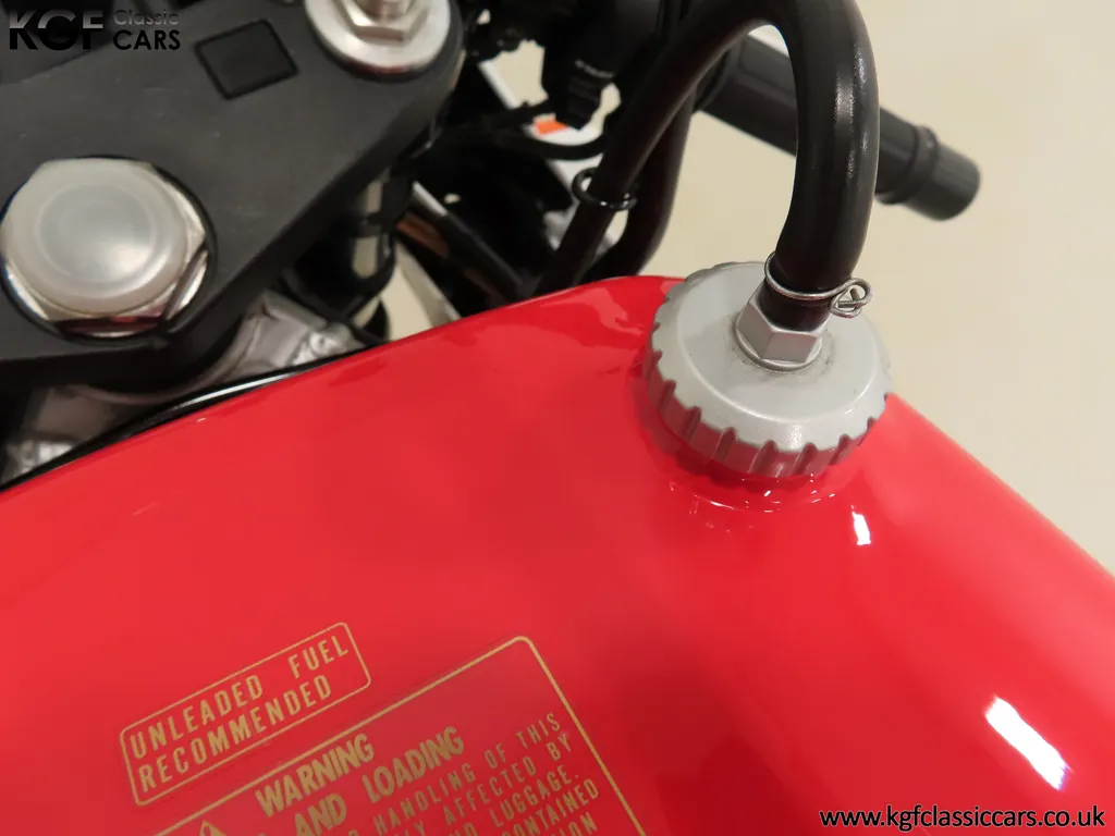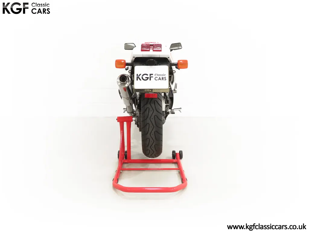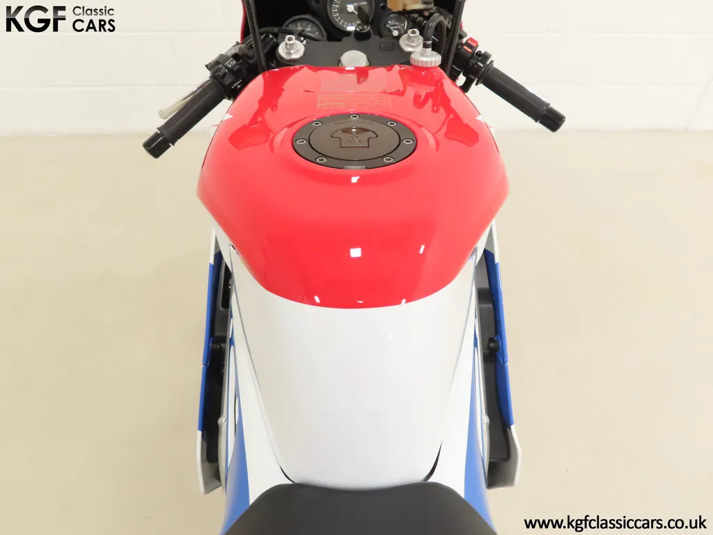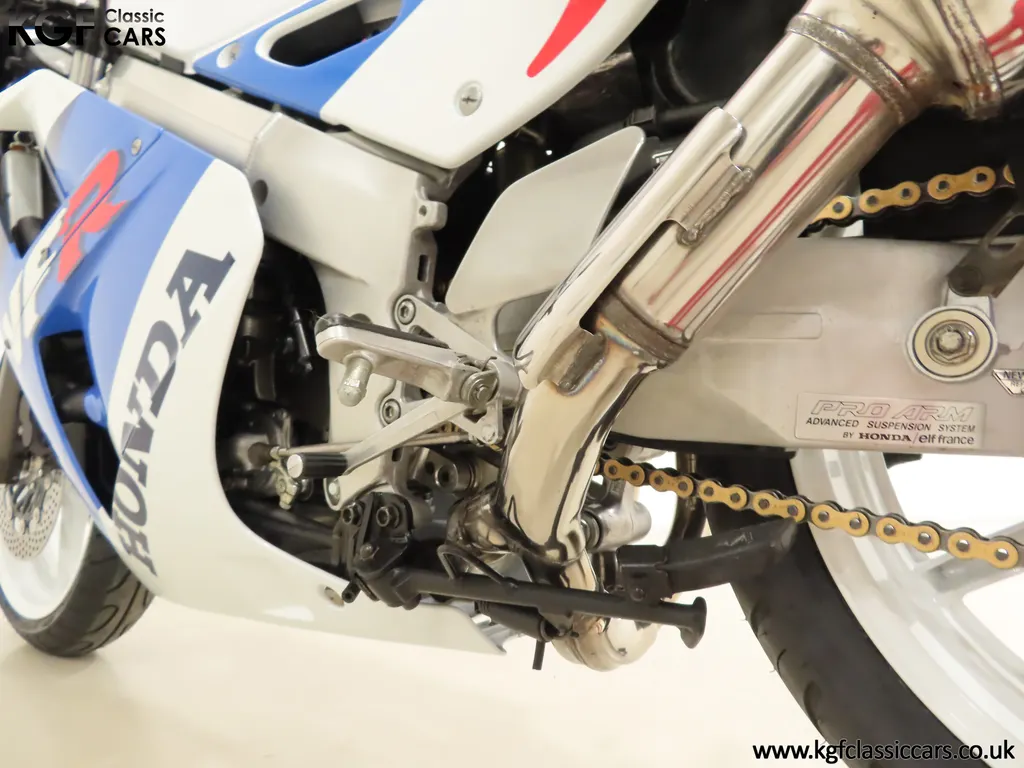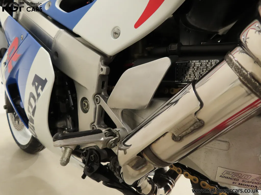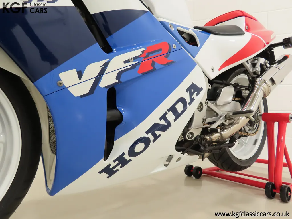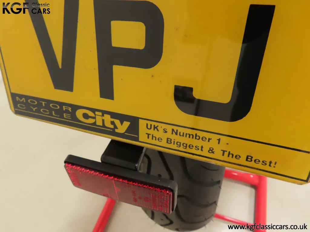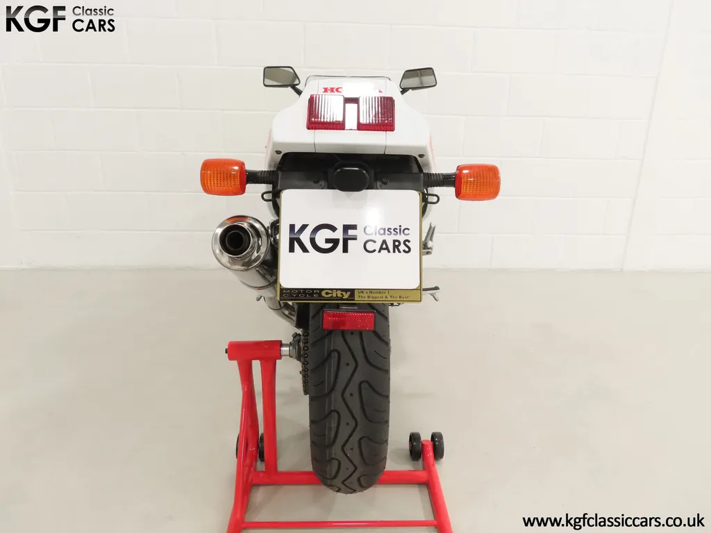 FOR SALE A genuine UK Honda VFR400R NC30 with only 3,946 miles from new. MODEL HISTORY A scaled down version of the larger VFR race models, the UK VFR400R NC30 was horrendously expensive and was similarly priced to 1000cc bikes of the time! Sharing many desirable features of the legendary RC30 homologation model created for World Superbike Championship such as Pro-Arm rear end, endurance style clocks, gear-driven camshafts, close-ratio style gearbox, and 360° firing order (and therefore exhaust note) as its 750cc inspiration. Rare UK bikes differ from their Japanese domestic market examples and are unrestricted with an oil cooler, larger hinged mirrors, separate numberplate lamp and different carbs amongst many more features. With the Honda Racing Corporation (HRC) build quality and rarity, it is no wonder these exotic miniatures are so collectable. EQUIPMENT High-rigidity aluminium frame, aerodynamic faring, twin-headlights, Pro Arm advanced suspension system, centrally fixed wheels, steering lock, lockable seat compartment, helmet holder, side stand down, electric start, mph speedo, coolant temperature gauge, headlight and dimmer switch, passing switch, horn button, oil, neutral, high beam and turn signal lamps, manual choke, tool kit. EXTERIOR To see a pristine and original UK supplied NC30 in the iconic Ross White, Fighting Red, Dakar Blue colour scheme, (Code NH196H), is a wonderful sight. Quality components and exemplary build quality are clearly apparent and more so in this beautifully preserved low mileage example. Factory standard aerodynamic faring remains untouched with original paint and decals, glossy bright and vibrant. The correct olive-green drab plating to components and delicate warning stickers remain attached, even to the chain guard and clear Perspex front screen. The mesh grille behind the front wheel has been dipped and zinc plated to factory specification and the original rear shock has the addition of a small Schrader valve to allow it to be re-gassed. The standard factory supplied Honda HM MR8 exhaust system remains fitted with no marks or dings and the supplying Motorcycle City number plates and front mudguard sticker are still attached. This UK bike is difficult to fault and must be one of the best available. ENGINE & TRANSMISSION The VFR400R’s compact liquid cooled V4 engine has smooth power with full torque to produce exhilarating performance. Being a matching numbers UK example, it is a full power unrestricted model with 63bhp and standard in all respects. Recent and expensive works by renown NC30 specialists, JTR Technica Ltd confirm UK standard E3FA carburettor, needles and jets and optimal running. Advanced features such as two-part radiator to assist cooling, oil cooler and 360° firing order producing a wonderful exhaust note, all add to the thrill on a bike only weighing 176kg. The Race-inspired close-ratio six-speed gearbox utilises every ounce of power. WHEELS, TYRES & BRAKES Pure white cast aluminium wheels are unmarked and are fitted with new, difficult to source and correctly sized, 120/60 R17 front and 150/60 R18 rear tyres to ensure the perfect ride as Honda intended. Powerful hydraulic twin-floating 296mm front discs with 4-pot callipers up front and a single disc to the rear provide controllable braking. HISTORY FILE This rare UK supplied matching numbers VFR400R NC30 was supplied by Motorcycle City (Sales) Ltd in Farnborough on the 11th September 1992 to a Mr Cooper. The New Bike invoice reveals the large sum paid for this model when new along with all other purchase documentation at handover. Mr Cooper enjoyed the bike for a few years before placing it in storage where it remained until he gifted it to his son in April 2019. Father and son lived at the same address as evidenced by issued registration documents. At this point the bike had covered just 3,876 miles and having briefly been put back on the road it was placed back into storage until the third and final keeper purchased it in May 2025. A passionate motorcycle collector, the bike went to NC30 specialists to be fully recommissioned and made roadworthy to enjoy once more. Only made available along with other bikes, cars and a Sinclair C5 that KGF Classic Cars also purchased due to a property investment opportunity. Supplied with all UK handbooks, service book, A4 history file and two sets of keys, (one unused and still its plastic sheaf), this rare and iconic superbike will satisfy the most demanding of connoisseurs and fanatical bike collectors. MOT October 2026, HPI Clear