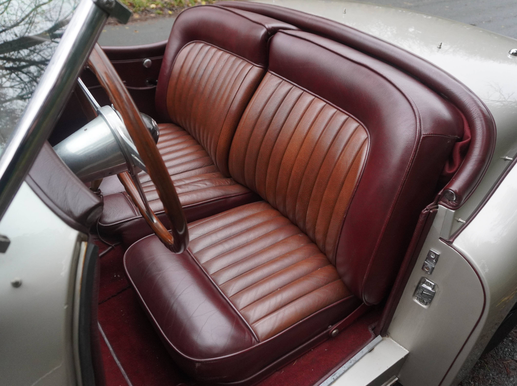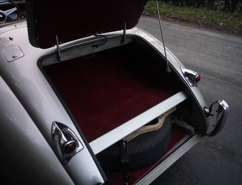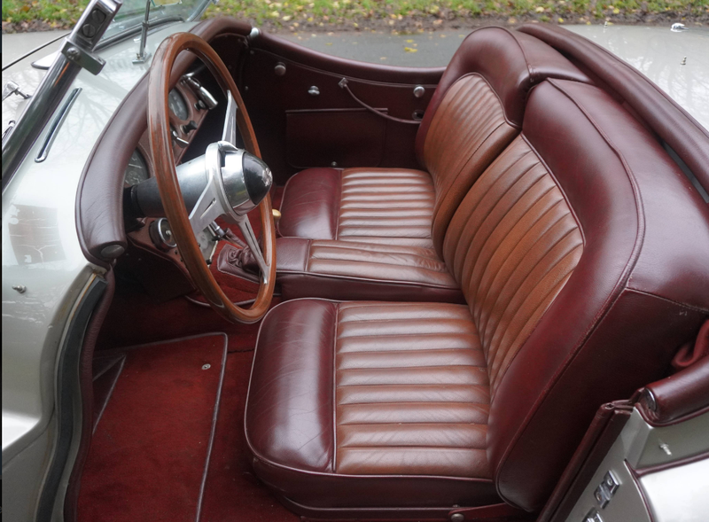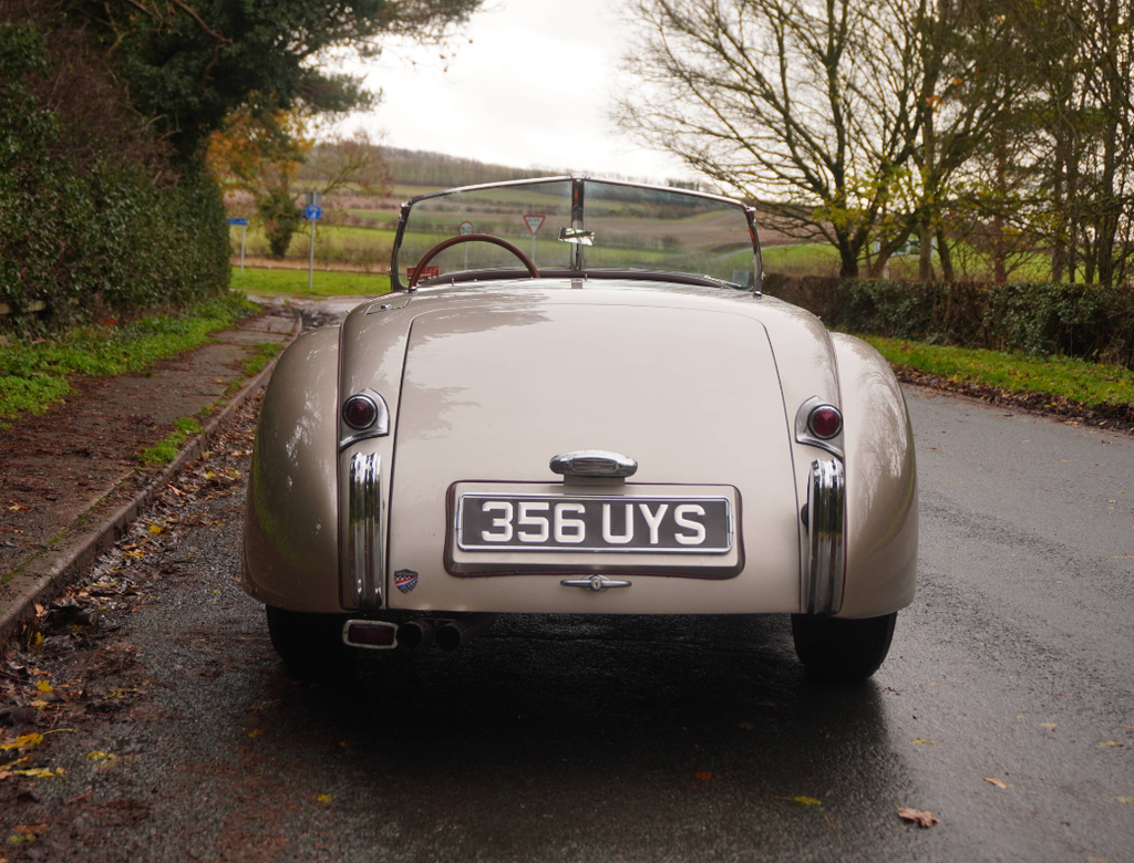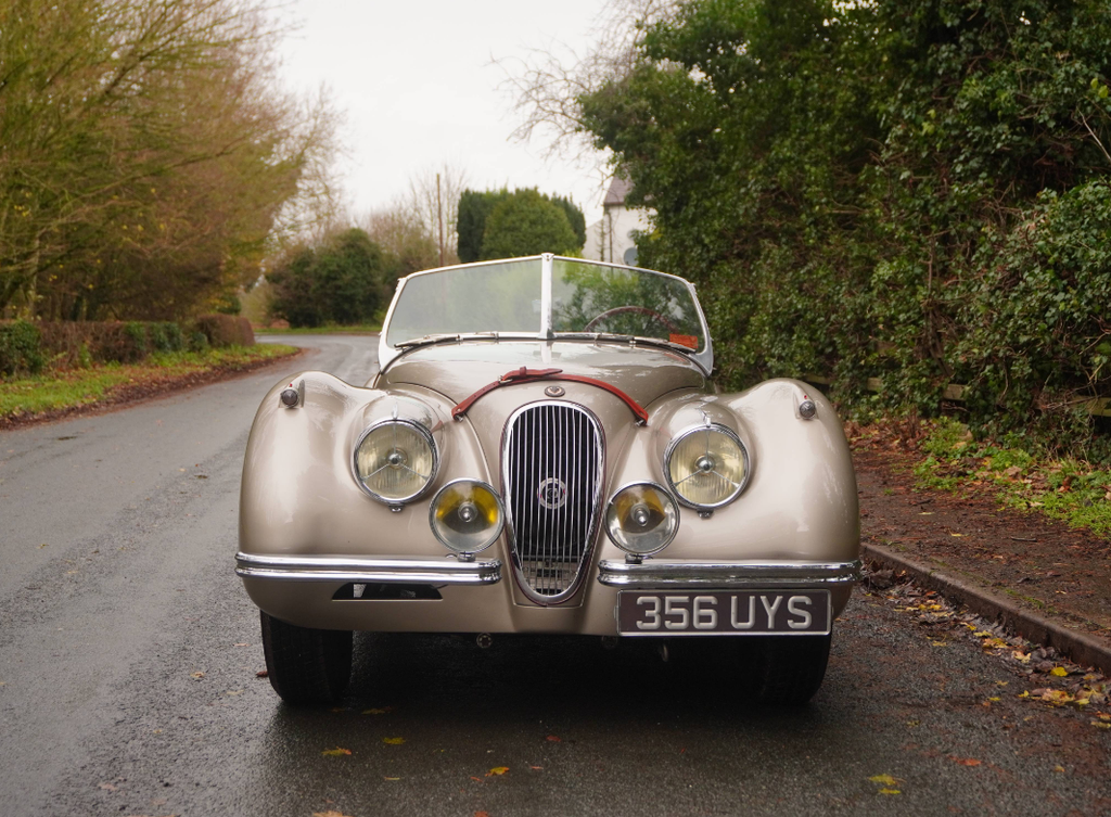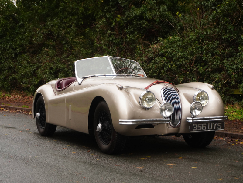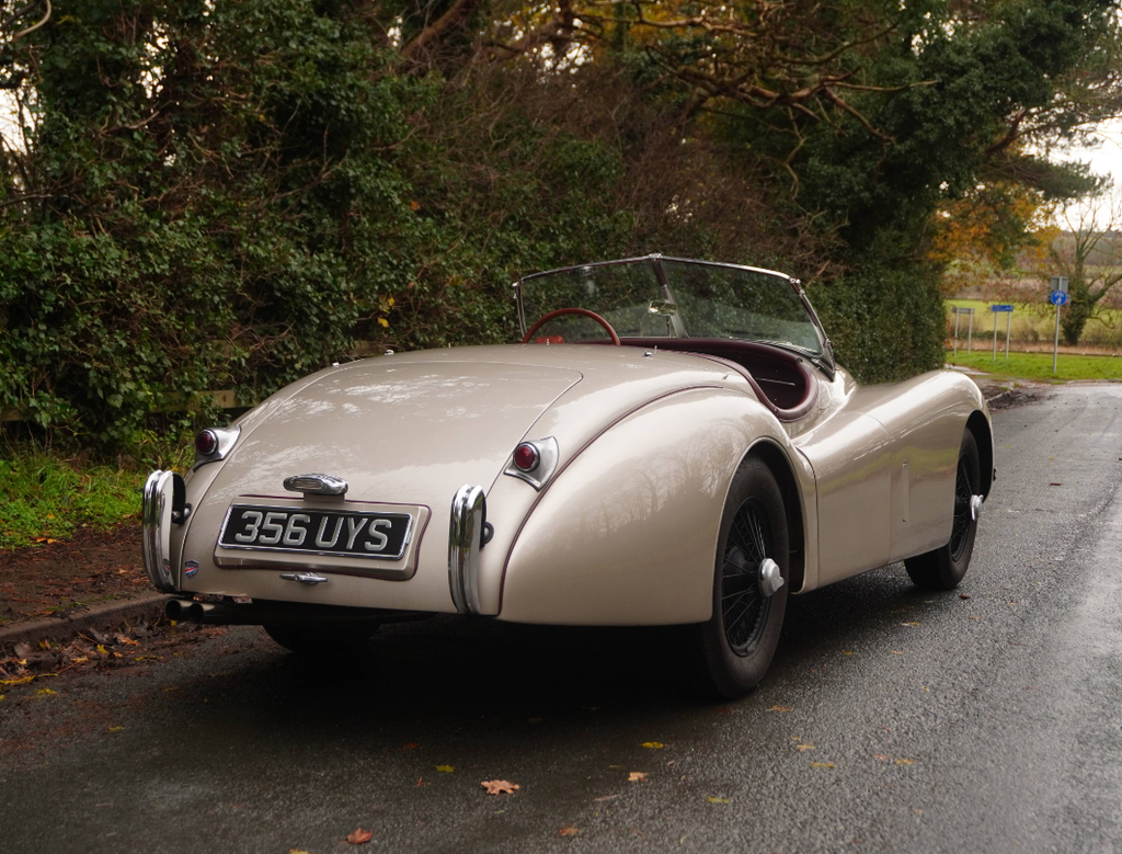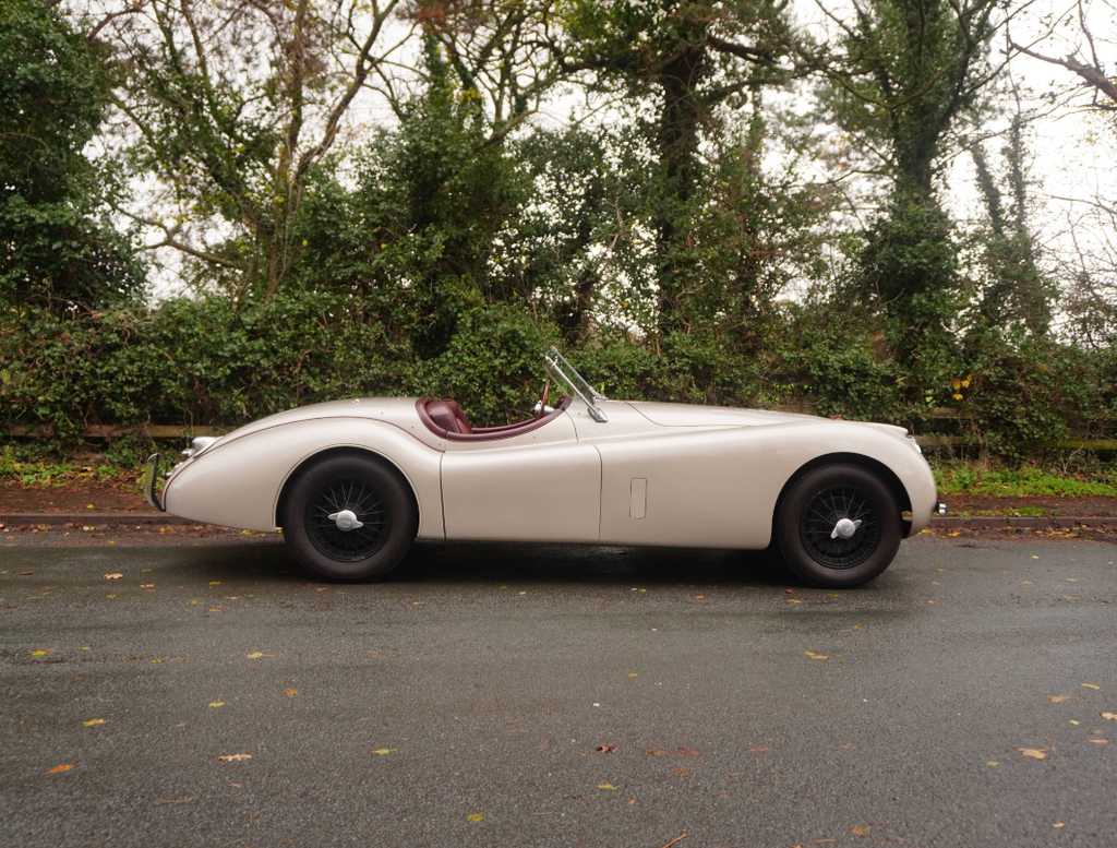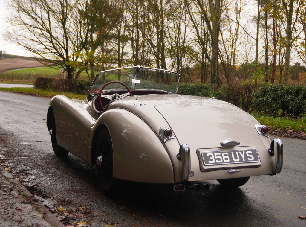 This is a perfect car for open top on the Continent European touring. This original matching numbers LHD Jaguar XK120 OTS is a true California car dispatched on the 3rd of March 1953 to Hornburg on Sunset Boulevard in Los Angeles. Charles H Hornburg established the LA Jaguar dealership in 1947 and played a key role in introducing the Jaguar brand to the United States market after World War II as the very first Jaguar importer and dealership. This stunning XK comes with a very well documented history that gives the car some wonderful provenance. By 1964 the car was in Miami, Florida owned by a Mr Smith who had a keen interest in sports cars. The paperwork confirms the XK at the time was the fastest car he could afford and four years into ownership he removed the engine and enhanced it for increaed performance. The block was taken to an engineer who bored out the cylinders by .040" and fitted high compression pistons along with high lift camshafts. This engine work allowed Mr Smith to better his time at Time Trial races he competed in during the 1960's. Around the same time as the engine work was done the transmission was completely rebuilt, the leaf springs were reinforced, and the hood support was moved to the front of the engine to reduce flex when propped open. As well as time trials the car was used daily to get to and from work, but in 1973, Mr Swift had a new fascination with Ferrari's and bought a new Dino. Having had a fantastic nine years of daily use and time trials, the XK120 was then parked up, unused and garaged for 25 years. Following this long period of ownership, the XK embarked on a transatlantic arriving in the Netherlands, via Antwerp in 1998. Whilst in Holland, the XK120 was subject to a comprehensive body off restoration that has been beautifully captured in a detailed photo album. After its long period of storage, the engine was removed and sent away to the UK where VSE the renowned Jaguar Engine specialists carried out a full rebuild on the unit. The body was rebuilt and fully repainted in its lovely Champagne colour which holds a deep finish, testament to the quality of the program of work. Black wire wheels were fitted giving a beautiful finishing touch contrasted against the bright chromework found throughout. The interior was retrimmed in beautiful Burgundy offering a truly classy appearance against the Champagne body. In 2016, 356 UYS arrived back in the U.K. for the first time in 63 years. 9 years of ownership, and just 16,000 miles since its outstanding restoration, this XK represents a fantastic opportunity to acquire a stunning LHD Jaguar XK120 OTS perfect for overseas touring. There is no doubt this is a beautiful example of a Jaguar XK120 OTS with a fantastic story, and history. With just 16,000 miles completed since its first-class body-off restoration it presents superbly and drives remarkably well. Accompanying the car is a detailed photographic record of the restoration and engine rebuild, a Jaguar Daimler Heritage Trust Certificate, and an original XK120 sales brochure.