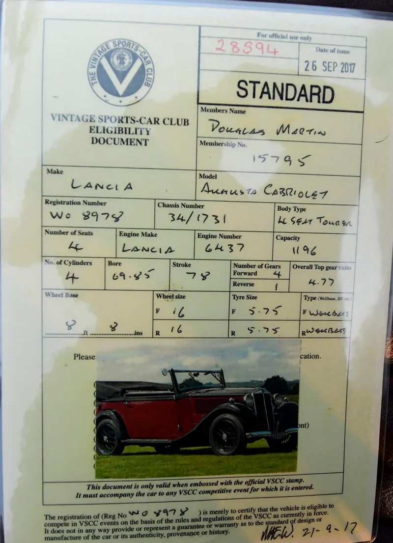 1934 Lancia Augusta Cabriolet Chassis number: 341731 Registration number: WO8978 Mille Miglia eligible. A lovely and rare foursome drop head from Lancia. The Lancia Augusta Cabriolet is fitted with the well-known, and powerful for its size, narrow angle Lancia 1,100cc V4. This engine was used to power a variety of smaller Lancia models. The Lancia Augusta was no ordinary car; it had a monocoque construction, independent sliding pillar front suspension, an overhead cam V4 engine and hydraulic brakes. The Augusta was successful in track events, and were the chosen transport of several leading Italian racing drivers including Tazio Nuvolari who kept one for several years. WO8978 is a very rare Lancia factory produced drop head cabriolet, designed by Battista “Pinin” Farina, one of his first designs. It has wind up windows and a clever spring loaded hood, which can be erected in seconds. In summer it is a full 4 seat tourer and in the winter with the hood and windows up is as good as any saloon. The car is a very smart and well sorted car being a regular class and award winner at the VSSC Welsh and Measham Rallies. It won Best Pre-war Car at the 2019 Festival of Transport, and featured in July 2019 Auto Italia. It has a Certificate of Origin from Classiche Lancia, a FIVA I.D. Card, a ACI Fiche certificate, a VSCC Buff Form, and is registered with the Registro 1000 Miglia meaning she is pre-approved and ready for an entry in the Mille Miglia. The Lancia engine starts readily and pulls well whilst making all the right Italian noises. A full complement of period instruments are located on the black painted dash board. The Lancia Augusta Cabriolet is finished in burgundy over black paintwork. To the interior is burgundy leather with matching door cards and maroon carpets. The car is fitted with four newish tyres and also to the rear mounted spare fitted to the spring loaded boot lid. The recently rebuilt wire wheels are equipped with lancia knock off spinner hubs. The Lancia Augusta Cabriolet has had a fairly comprehensive restoration in recent years and has covered few miles since. It is very useable being spacious & providing comfortable seating for four people. It is also a sprightly perfomaer with a surprising turn of speed from its smooth V4 engine. Call Richard Biddulph. Mobile ++44 (0) 7967 260673 Simone Della Corte Mobile ++44 (0) 7377070943 Sales & Valuations Vintage & Prestige of Northampton Ltd. richard@vandp.net www.vandp.net Showroom: 2 Ryehill Ct, Lodge Farm Industrial Estate, Northampton NN5 7UA Viewings & Visits Strictly by appointment only please. We have on site long term storage for over 200 cars with 24 hour security & covered trailer delivery to customers anywhere in Europe.