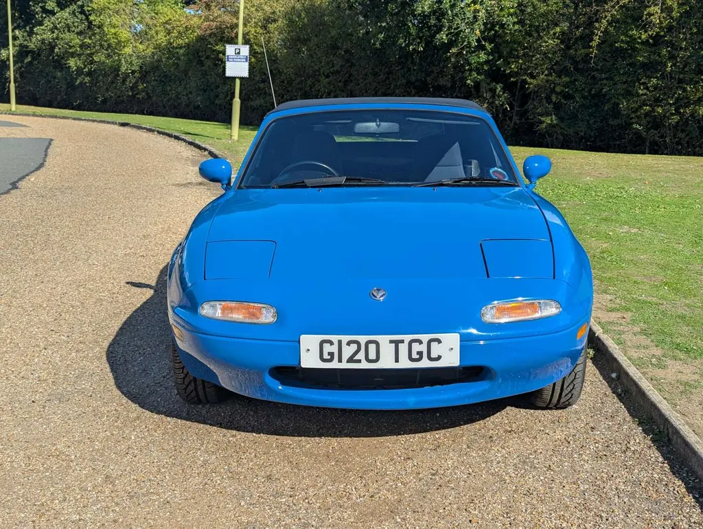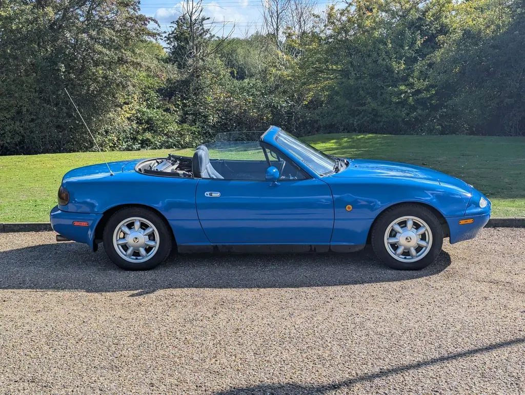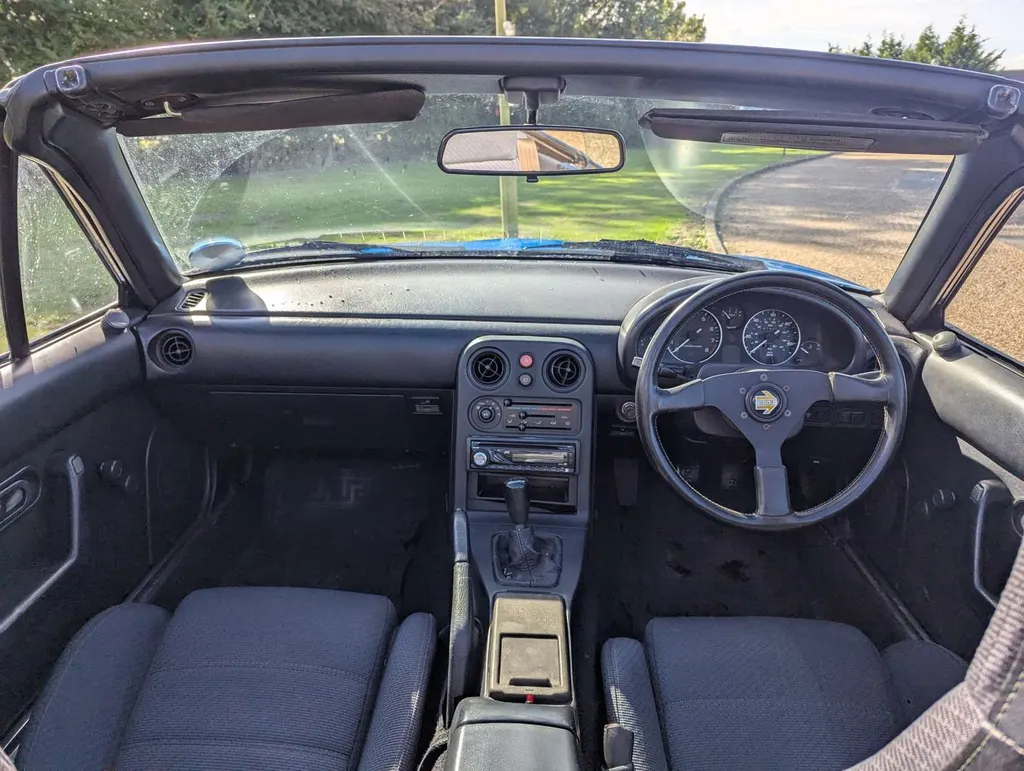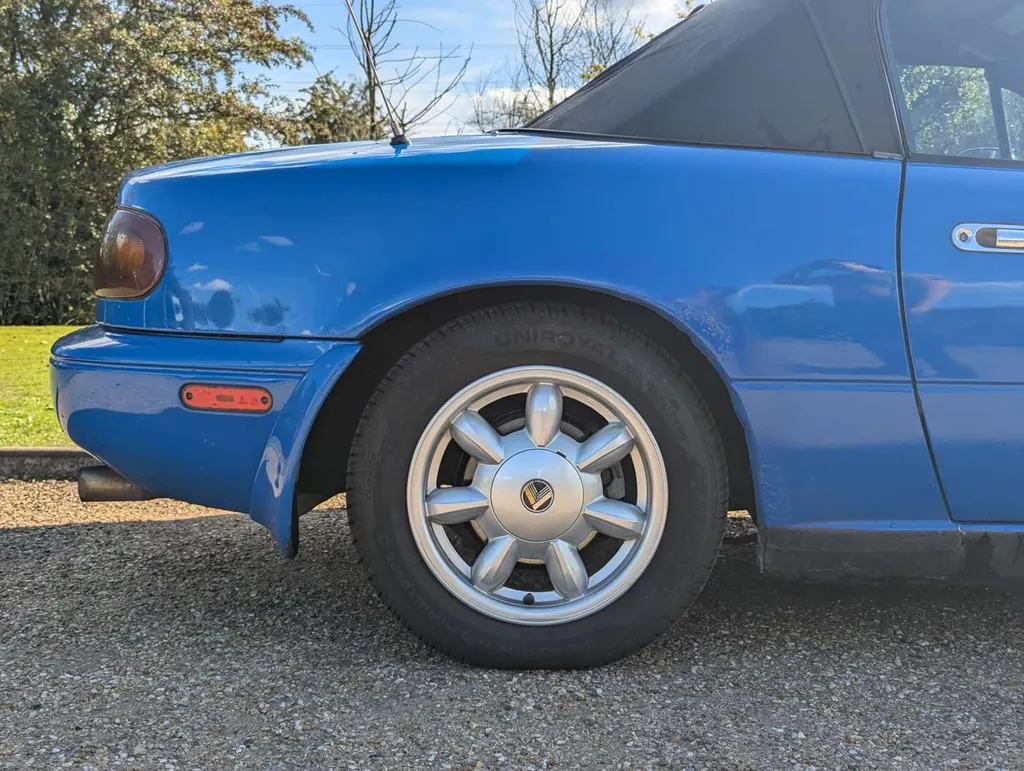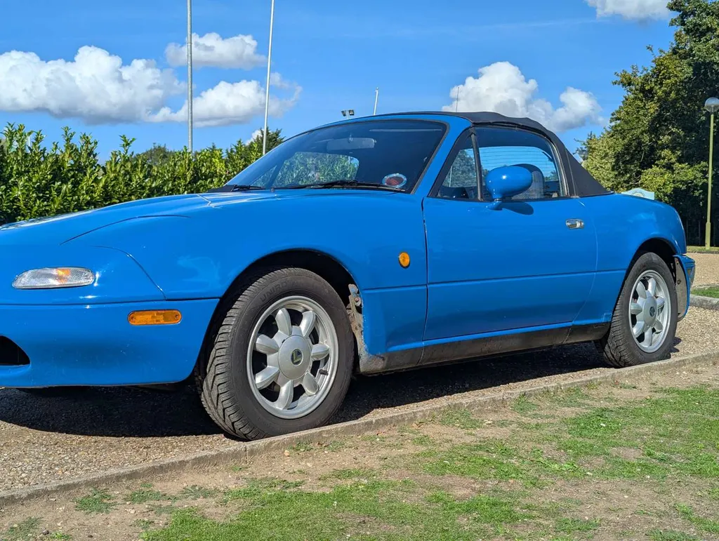 1600cc. This blue Mazda MX-5 was manufactured in 1990, spent its first decade in Japan and was first registered in the UK on 5th January 2001. The vendor, who has owned it since 2007, tells us it has been an excellent runner and very reliable. The car was declared a Category C write-off in 2006 but it has continued to be put through an MoT almost annually, including during the last few years while kept in secure storage. Its current certificate will remain valid to 18th September 2026. The hood and rear heated glass were replaced in 2010, and the car received a new cambelt and 2 auxiliary belts in 2018, around 2000 miles ago.It comes with a spare key, jack, and elasticated half-cover for the roof. Paperwork includes a printed list of all works during the current owner's tenure, plus a good collection of receipts for maintenance and repairs, and the latest V5C which is in the vendor's name. The odometer is reading 167,420km (104,030 miles). Not specified