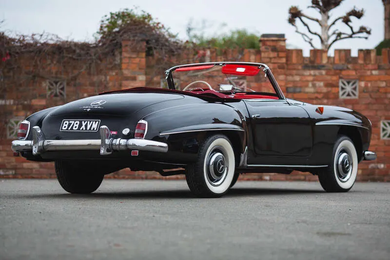 This lot will be auctioned via Iconic Auctioneers, The Iconic Sale at the NEC Classic Motor Show 2025 on Saturday the 8th of November, NEC, Birmingham, B40 1NT. Please note this lot is subject to vendor approval and may change. During the 1950s, when Mercedes-Benz dominated top-level motorsport, the firm’s road-going flagship was the breathtaking 300 SL. However, with its price well beyond the reach of most enthusiasts, Mercedes-Benz sought to offer similar glamour and engineering in a more accessible package. The result was the 190 SL, introduced as the 300 SL’s smaller stablemate and built to the same high standards of design, refinement and quality. Powered by a new, slightly over-square 1.9-litre straight-four SOHC engine producing 120bhp via twin-choke dual Solex carburettors and mated to a 4-speed manual gearbox, the sleek and comparatively light 190 SL was capable of 115mph and 0-60mph in around 13 seconds. While its ride was more ‘boulevard’ than overtly sporting, and some rivals offered greater performance for less money, the 190 SL’s blend of elegance, build quality and long-distance ability cemented Mercedes-Benz’s reputation for producing aspirational grand tourers. Unsurprisingly, most of the 26,000 examples built were sold to the North American market. According to the accompanying V5C, this particular 190 SL was manufactured on 12 January 1956 and is notably rare in its colour combination. It was purchased from European Collectables in the Netherlands on 12 June 2017 before being UK-registered on 1 December 2020. An older restored example, it presents well with straight bodywork and a deep shine to the gloss black paintwork. Inside, the original red leather interior remains intact and displays a delightful, honest patina that adds to the car’s character. Purchased by our vendors in 2024, the Mercedes has not been used during their ownership and will require light recommissioning prior to returning to active use. A stylish and highly desirable 1950s Mercedes-Benz roadster with UK registration, original interior, attractive presentation and the opportunity for gentle improvement to bring it back to full touring form.