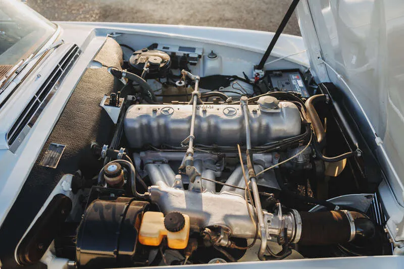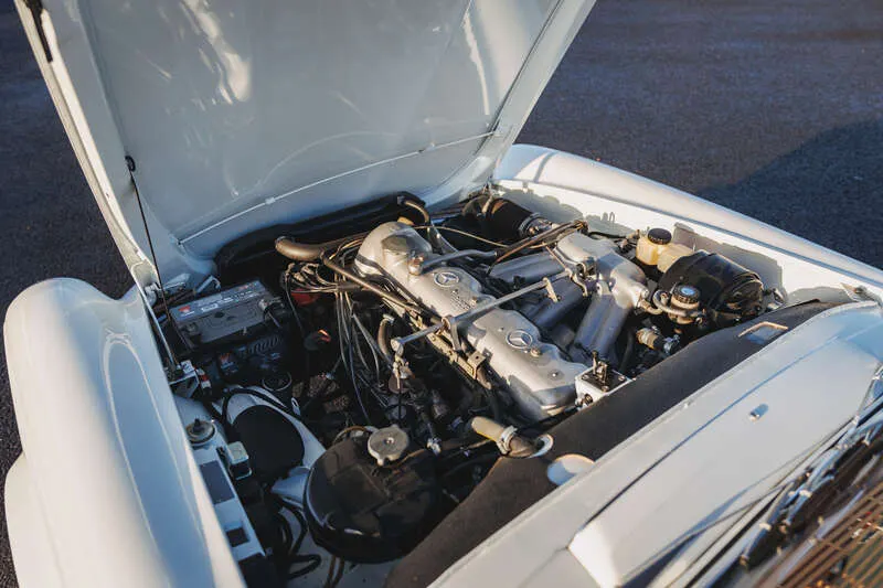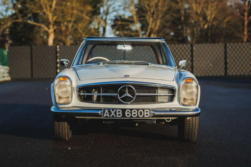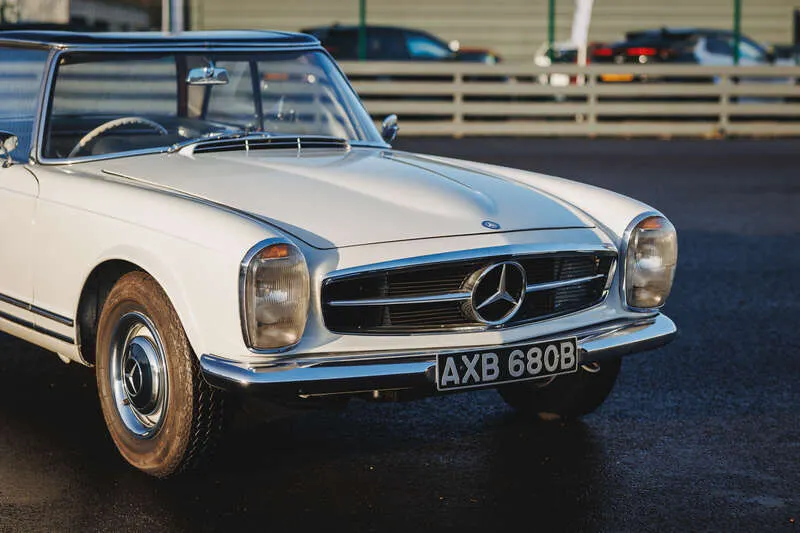 This lot will be auctioned via Iconic Auctioneers, The Classic Sale at the Practical Classics Classic Car and Restoration Show 2026 on Saturday the 21st of March - Sunday the 22nd of March, NEC, Birmingham, B40 1NT. Introduced in 1963 and produced until 1971, the Paul Bracq-designed W113 SL range replaced the 190 SL and 300 SL, blending sporting intent with comfort and safety, with the 230 SL as the first iteration and now well established in the collector market Powered by a 2,306cc straight-six engine with mechanical fuel injection offering 150bhp and 145lb/ft of torque driving the rear wheels through a manual gearbox and benefiting from independent rear suspension for assured road manners First registered on 15th May 1964 to Lady Katie Fraser of Allander, wife of Sir Hugh Fraser, it was garaged for much of its life with long-term family ownership from 1996 and current ownership since 2018, having seen little use and extended periods in storage Presented in Mercedes White (050) white with a dark blue removable hardtop complemented by a dark blue leather interior, and specified with the optional side-facing third seat Fitted with a stainless steel exhaust. We understand that the car will be serviced prior to our sale Supplied with MOT certificates dating back to 1981, the original buff log book, sundry invoices, the original spare wheel and Mercedes-Benz jack This original UK-delivered, right-hand drive 230 SL with manual transmission presents an appealing opportunity to acquire a usable and collectible Pagoda