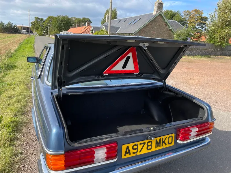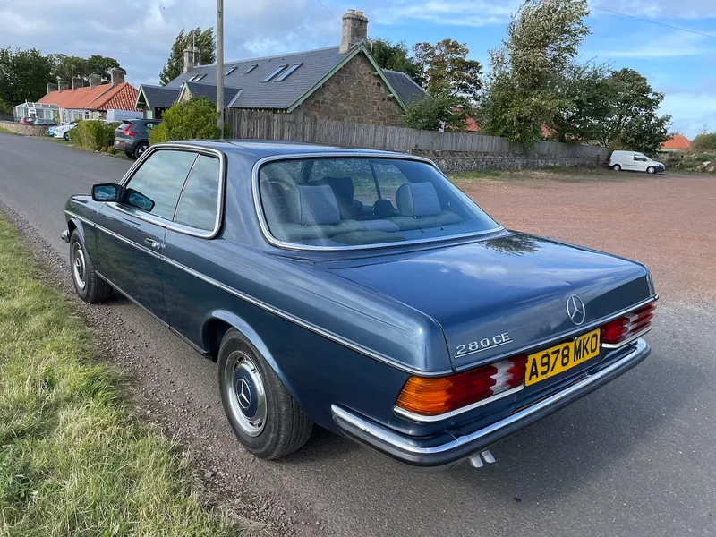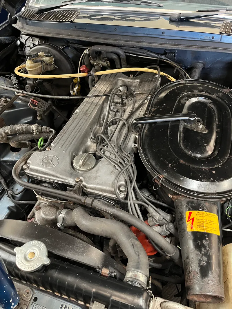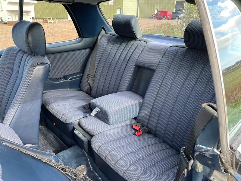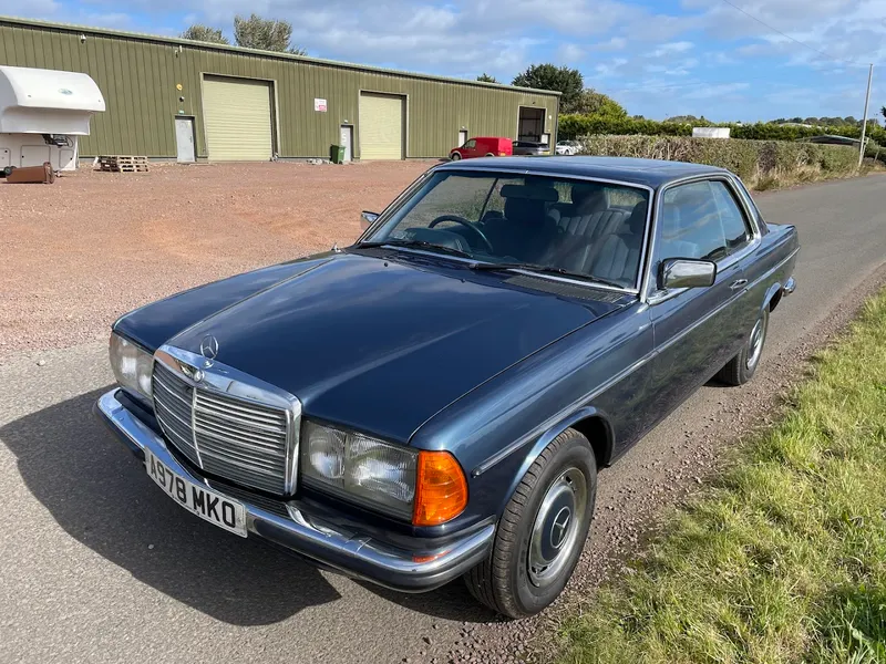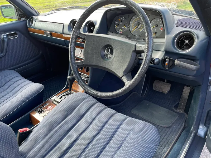 Classy Mercedes 80’s, C123 coupe in dark-blue metallic with hard-wearing navy/light blue stripe cloth seats and door card inserts and zebrano wood. Historic tax and MoT exempt. Having undergone light preparation, this car is now ready for sale. For more details and photographs, see our website.