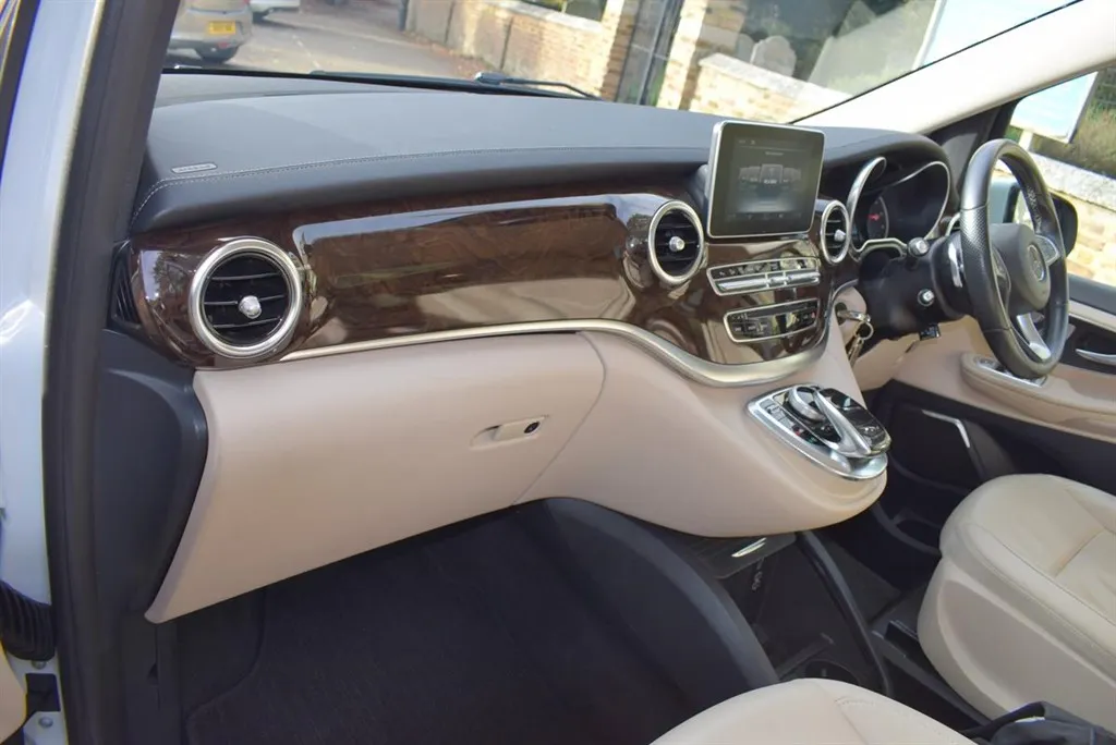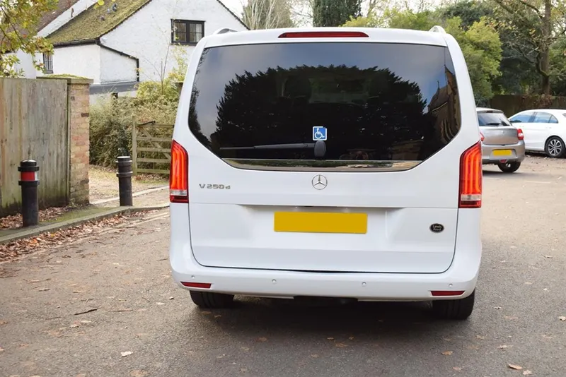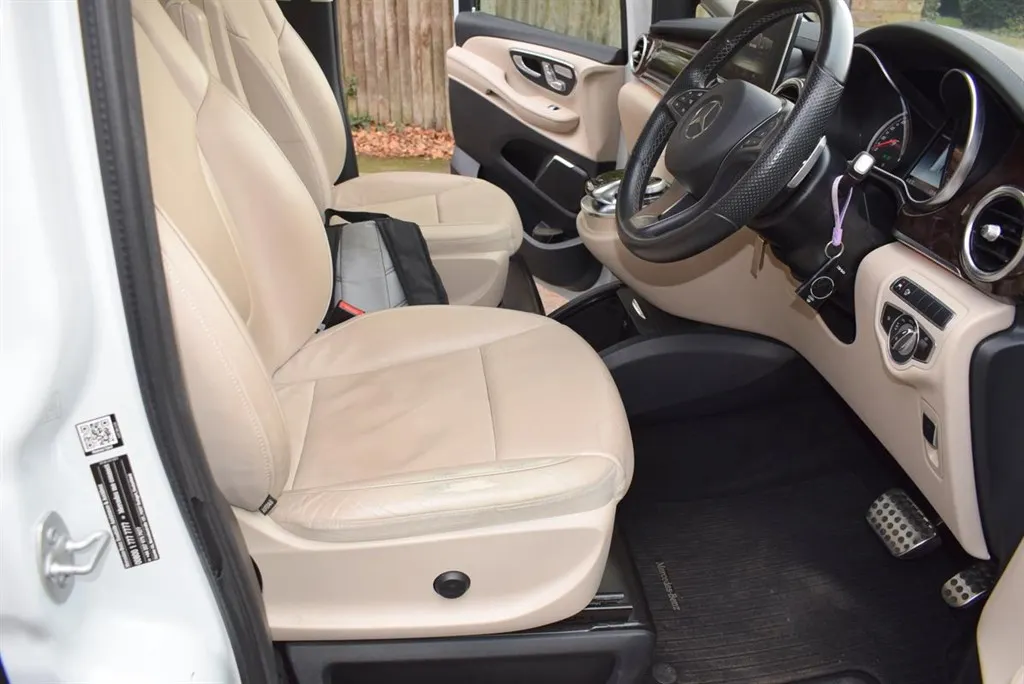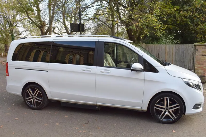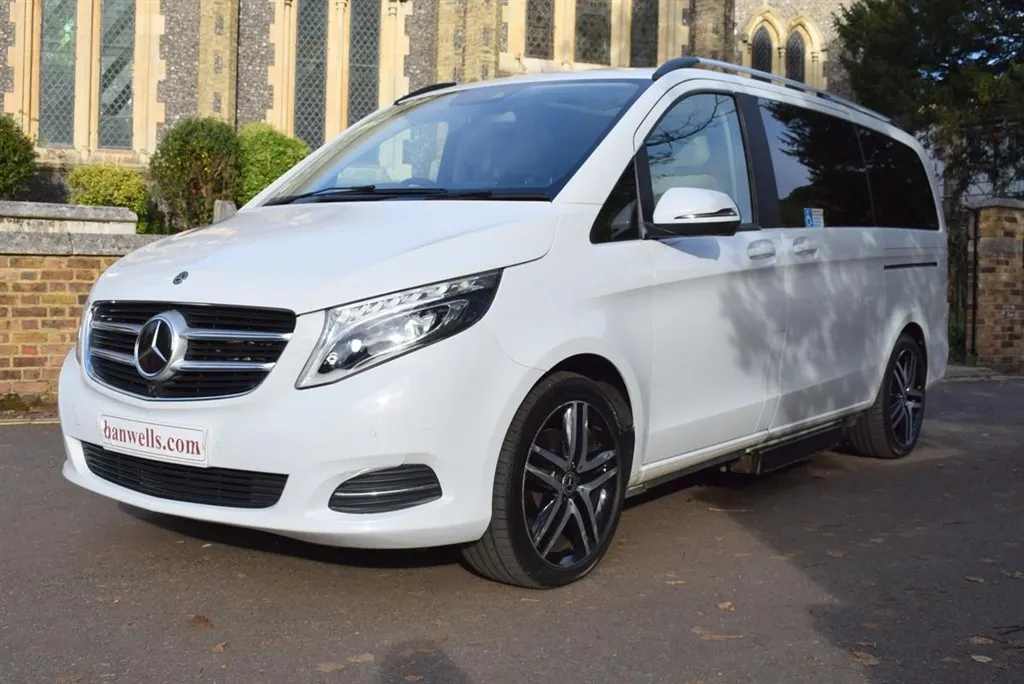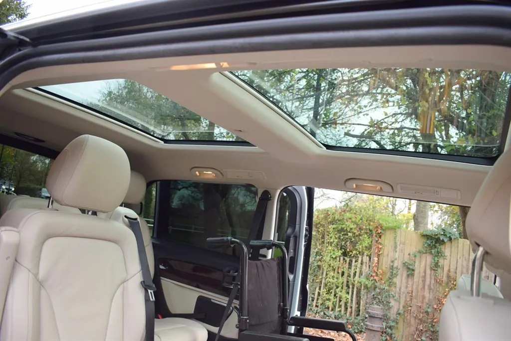 2018/68 Mercedes V250 D Sport 5 Door Auto with side wheel chair lift. 6 + 1 seater finished in unmarked White with panoramic roofs, alloy wheels and Cream leather interior. Only 21,000 miles with full Mercedes history. Fully loaded, Driving Assist, Towing Package, Memory Package, Comand, 360 camera and Burmester Surround Sound. Outstanding value at only £37,500