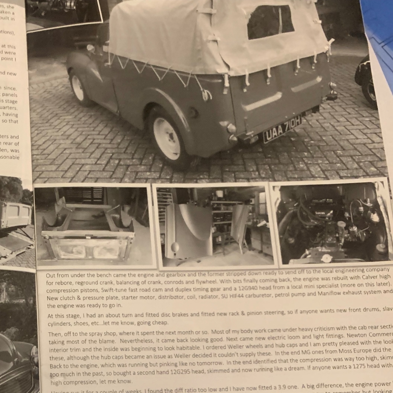 1969 Morris Minor quarter ton pickup. List Price : £14,000 plus VAT. Registration Number: UAA 710H. Recorded mileage: under 200 since restoration. - 3 owners since new. - Fully restored and tastefully uprated. The engine was re-bored and balanced and then completely rebuilt, uprated with high compression pistons and a Mini Cooper cylinder head with a fast-road camshaft. The rebuilt engine was reinstalled with a complete new clutch, starter motor coil, SU carburettor, fuel pump and Maniflow exhaust system. Another useful upgrade was disc brakes to the front, with new master/slave cylinders and brake pipes. Cooling is improved with a new radiator, the suspension has also been uprated, a new loom has been fitted, as have new light fittings. And much more. - Invoices on file for all restoration works. - Full restoration photos on file. Any questions please do message.