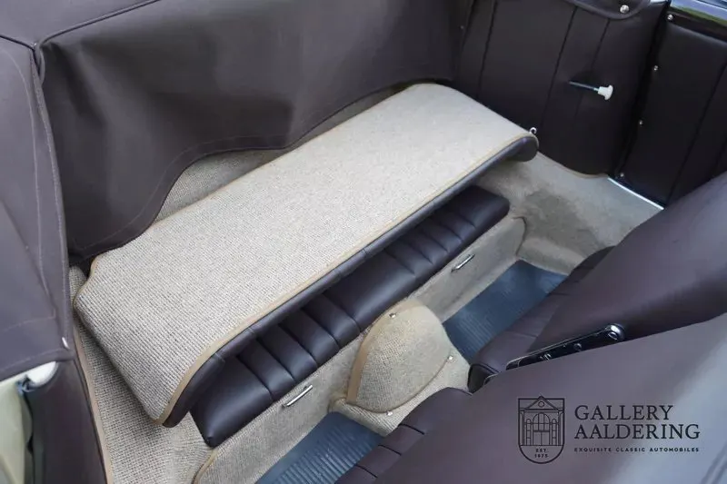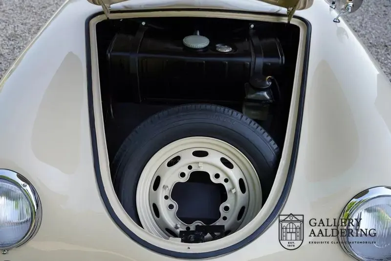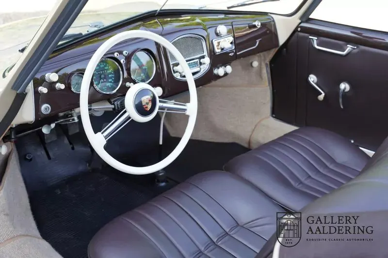 Road & Track made it very clear in November 1952: “…after a turn at the wheel of the new Porsche… one is forced to admit that this is the Car of Tomorrow. That appears, on its face, to be an exaggerated statement, but experience with the car has given an entirely new driving experience to the test staff. It is safe to say that no car in the history of Road & Track has offered so many different and new driving sensations.” – Road & Track on the Porsche 356, November 1952. Despite Ferdinand Porsche’s early involvement in the automotive industry in the 1930s, it would take until 1949 for his name to appear on a car. While many people start small, it turns out that Porsche, looking back now, put his name for the first time on a model that has gone down in history as one of the greatest sports cars of all time, the 356. The first models were built in collaboration with the bodybuilders at Reutter, at the old location in Stuttgart. From 1955, production took place at the factory in Zuffenhausen. The Porsche 356 was built on a platform-type chassis with an air-cooled engine in the rear. Together with a torsion bar and fully independent suspension made the car feel even sportier than the chassis would suggest. That chassis was primarily sourced from Volkswagen. Continuous development of the model meant a better car every year. Initially equipped with a 1,100 cc four-cylinder engine, later variants featured a 1,300 and 1,500 cc engine. In 1952, the two-piece windshield was replaced with a curved one, and the gearbox became synchronized. By the time we reach 1954, the first owner of this 356 1500 is in for a treat, as his unit of the 328 produced that year is ready. According to the data card, the car was delivered in February 1954 in Denmark. The document also shows that the 356 is equipped with a 55 hp 1,488 cc engine and of course the manual four-speed gearbox. The car underwent a complete restoration a few years ago, and as expected for a car of this class, it was done to the highest standards. The body was completely stripped and expertly rebuilt, finished in beige paint. Combined with the chocolate brown leather interior, it creates an incredible combination. The bodywork is exceptionally clean, with no imperfections to be found. The wheels, hidden deep within the body, have beautiful chrome hubcaps and are in pristine condition. The rear, with its distinctive black taillights and the single grille on the hood, is extremely beautiful. The dark brown soft-top stands out when viewed from behind, accompanied by a stunning tonneau cover in the same colour. Looking inside, the eye is drawn to a beautifully restored interior. The dark brown leather seats, the matching lacquered dashboard with the brilliant original Becker Mexico radio, and, of course, the black dials with mint green markings—all contribute to making the 356’s interior truly exceptional. And then there’s the engine, a story of its own. The car is Matching Numbers; we can be brief about that. The original 1500 engine is still with the car. “But shouldn’t an engine be inside the car?” you might ask. That’s correct, but during the restoration, it was decided to install a more common 1600 cc engine instead, as the original 1500 was not used to prevent any potential engine damage in the future. However, the original engine is still present with the car, so those who appreciate authenticity can easily choose to restore the car to its original state. This 356 is in excellent condition and is really perfect both optically and technically and comes with the necessary documentation about the past of the car. Finding another one like it, especially with such a tasteful finish, would be a rarity
