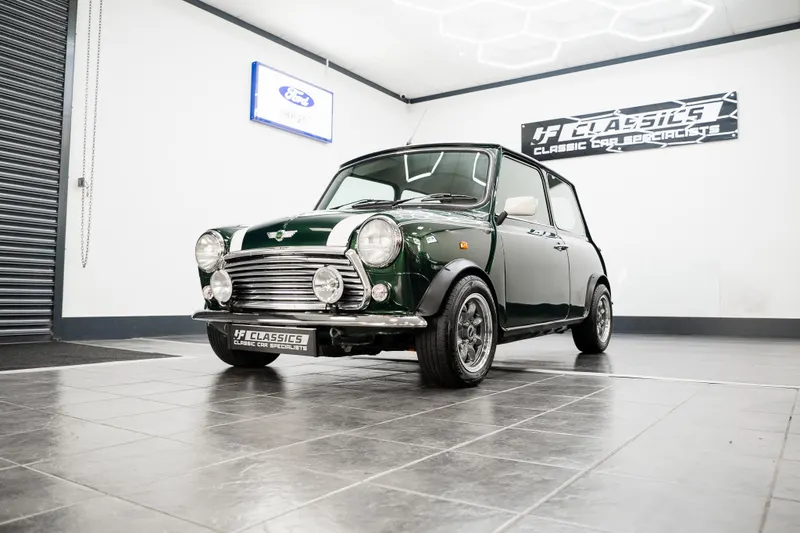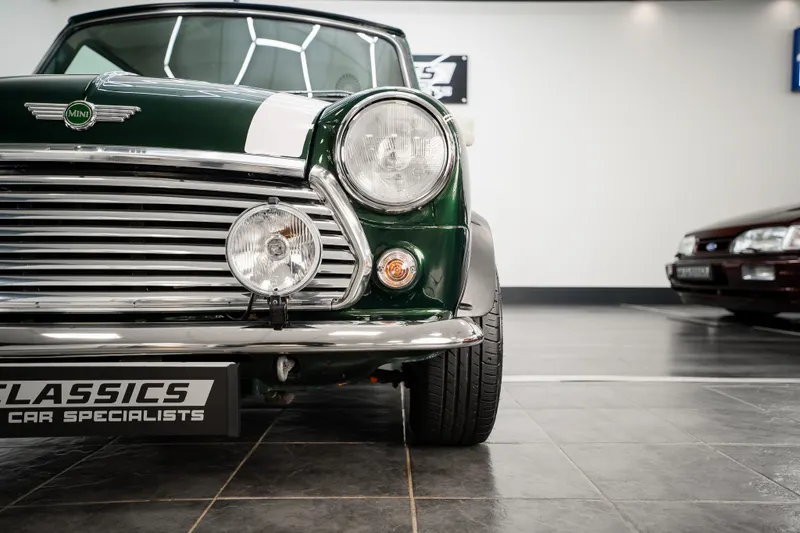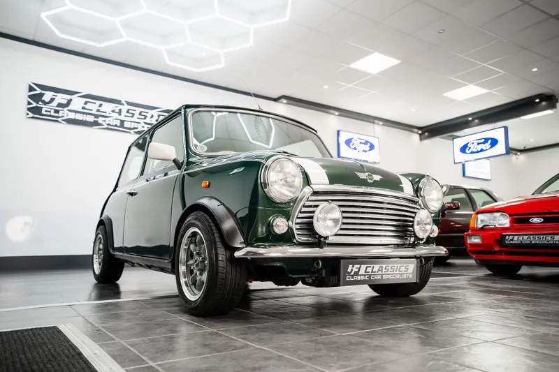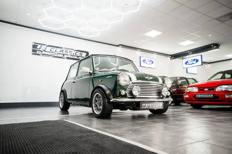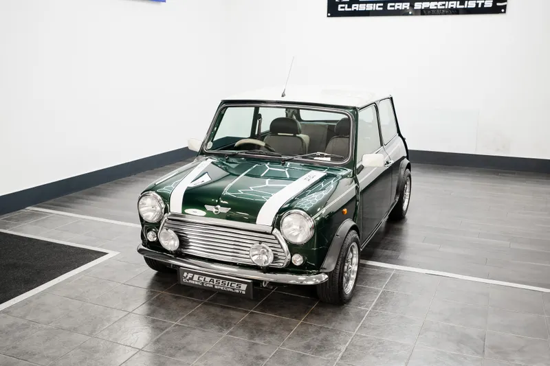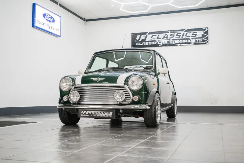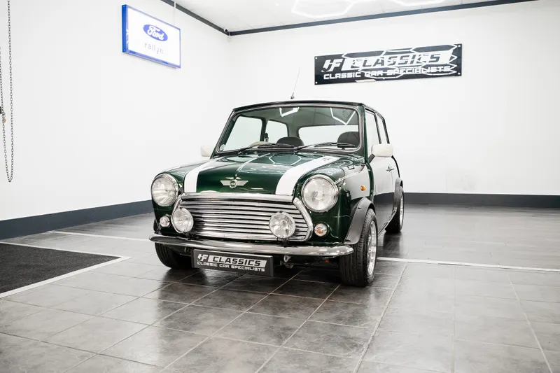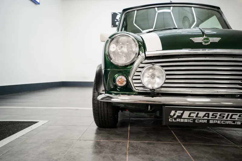 FOR SALE JF Classic Cars are pleased to offer an outstanding time-capsule example of the 2000 Rover Mini Cooper 1.3i, With low mileage from new, this remarkable Cooper presents in a condition that is rarely seen and even more rarely offered for sale. It perfectly encapsulates the final years of classic Mini production, capturing the charm, character and appeal that made the Cooper name legendary. Quite simply, this is a superb survivor that remains remarkably close to showroom condition, offering a unique opportunity to acquire a truly special example of British motoring history EXTERNAL Finished in the iconic British Racing Green (Paint Code: WEO), this 2000 Rover Mini Cooper presents exactly as a Cooper should...timeless, instantly recognisable and beautifully proportioned. The paintwork displays a deep, uniform gloss from front to rear, with a vibrant, lustrous finish that highlights the Mini’s crisp panel lines and unmistakable profile. Condition throughout is exceptional, with the exterior clearly benefiting from careful ownership and minimal use. The front elevation is defined by a full slatted chrome grille, gleaming and free from corrosion, complemented by a full wrap-around chrome front bumper that sits perfectly aligned and presents in superb order. All exterior chrome trim remains bright and untarnished, enhancing the car’s classic character. Clear front indicators and the original circular headlamps remain chip and damage free, while the factory-fitted Oban-mounted spotlights complete the authentic Cooper look. Running along each flank are the legendary white Cooper pin stripes, crisp and correctly positioned, adding contrast against the rich green paintwork. A Mini Cooper crest positioned correctly sits proudly on the rear wing, while the white bonnet decals bearing the John Cooper signature further underline the car’s heritage and authenticity. The contrasting cream-coloured roof provides a perfect visual balance, matched by cream colour-coded door mirrors, both of which remain fresh, bright and free from marking. Chrome door handles present beautifully, retaining their original finish without tarnish or pitting. Originality continues with factory glazing throughout, all clear and unmarked, alongside original rear light lenses that remain bright and free from fading or damage. To the rear, a wrap-around chrome bumper mirrors the quality of the front, while all badging front and rear remains original and correctly positioned, exactly as Rover intended. A final detail is the chrome petrol filler cap, adding a subtle yet period-correct flourish, along with a black-mounted roof aerial, neatly positioned and in excellent order. Overall, this Mini Cooper’s exterior is a superb showcase of originality, presentation and classic British style a beautifully preserved example that would sit comfortably in any serious collection INTERNAL The interior of this 2000 Rover Mini Cooper 1.3i is a beautifully preserved and highly evocative space, finished in the desirable Ash Cloth with Black Leather trim (Trim Code: SMM) and presented in very, very good overall condition. Opening the doors instantly transports you back to the late nineties and early noughties, capturing the unmistakable atmosphere of a period Rover showroom with remarkable authenticity. The front seats are upholstered in the correct ash cloth centres with supportive black leather bolsters, all of which remain exceptionally well preserved, showing no unsightly marking or wear. They are complemented by black headrests with beige piping, adding a subtle yet distinctive contrast. To the rear, the seats present as virtually unused, their condition suggesting they may well have seen little to no occupancy since new. All seat adjustment and folding mechanisms operate exactly as intended. The black interior carpeting remains immaculate throughout, protected from day one by the original Mini Cooper embossed overmats, which remain fitted and in excellent order. Front and rear black leather-effect door cards present in equally fine condition and are complete with front door pockets, wind-down window handles and door release levers, all functioning smoothly and correctly. Above, the beige headlining sits taut and mark-free, maintaining a fresh and original appearance. The focal point of the cabin is the walnut-effect dashboard, which remains unmarked and beautifully finished, its wood grain displayed elegantly and without fading or damage. To the passenger side sits a chrome directional heater vent alongside the push-button dash-mounted glovebox, while centrally positioned is the classic analogue time clock, reinforcing the Mini’s traditional charm. A period-correct Pioneer flip-off face CD head unit (DEM2920MP) is neatly installed, perfectly in keeping with the era. The driver’s binnacle houses three circular, cream-backed instruments with black numerals. To the left, the speedometer displays a remarkably low 27,228 miles from new; centrally sit the fuel and temperature gauges, with the tachometer positioned to the right. All cursory warning lights illuminate and extinguish exactly as per manufacturer specification. Further controls are thoughtfully arranged, with the headlamp adjuster switch positioned to the right of the binnacle alongside the driver’s chrome heater vent. Below the audio system, a row of push-button switches includes the rear fog lamp, brake system warning test, hazard switch and heated rear screen. A two-speed interior fan button and the directional air vent slider switch, both operating correctly. Finishing touches include a beige leather gear gaiter in excellent condition, paired with the correct beige and black gear knob, and a three-spoke black and beige steering wheel proudly displaying the Mini Cooper crest at its centre. To the rear, the snap-clasp rear windows function exactly as intended, completing an interior that feels cohesive, original and remarkably well preserved. Overall, this cabin is