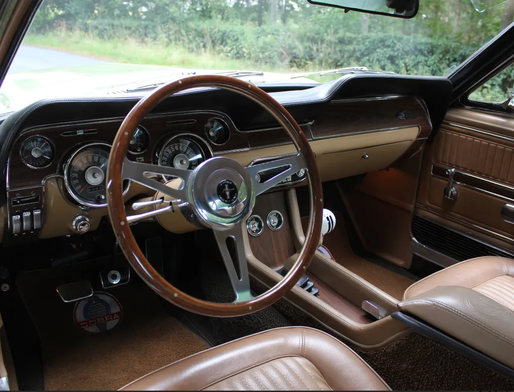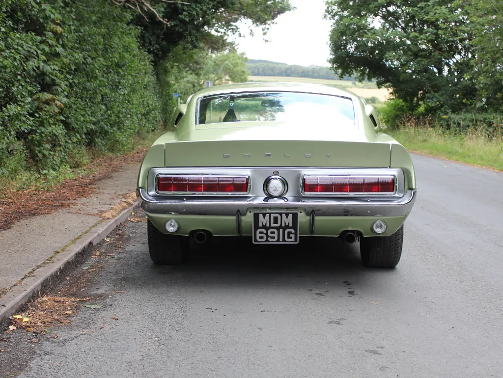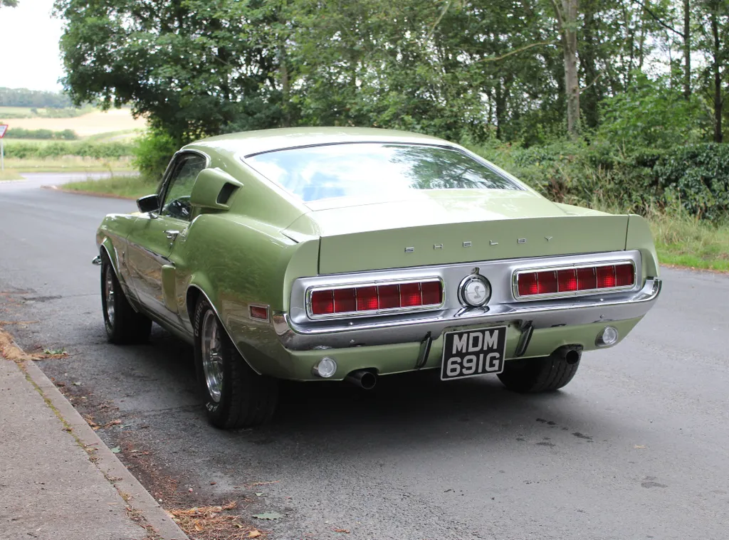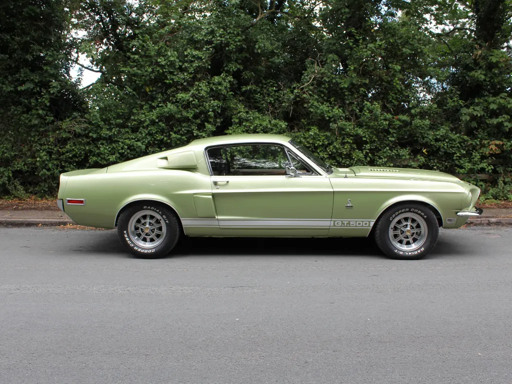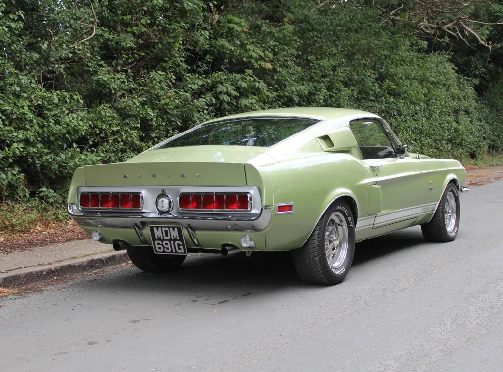 This beautifully rebuilt genuine Shelby Mustang GT500 was built on the on the 11th January 1968 at the Metuchen plant, finished in beautiful Lime Gold paint and Saddle Vinyl luxury interior. MDM 691G returns to us from a regular customer who has enjoyed many faultless miles and carried out meticulous detailing in the engine bay. The car was supplied new by Kimnach Ford Inc, Virginia Beach, Norfolk, VA and featured shoulder harness, extra cooling package, wheel lip mouldings, power disc brakes, power steering and tilt away steering wheel, all confirmed by the Marti Auto Works report. Our example has been subject of a two major bare shell rebuilds by a UK specialist and has completed minimal miles since completion. The car was brought over to the UK in 1989 and from old MOT certificates we can see the Mustang covered around 1000 miles up to 2001. The Shelby along with a collection of other cars was then dry stored for almost 15 years and discovered in 2015 when the full restoration was commissioned. The rebuild was finished to an exceptionally high standard and completed by 2017. A comprehensive file of paperwork accompanies the car detailing thousands of pounds worth of expenditure. Photos show the bare shell being prepared and fully painted, including underside, then fitted up with some new and some re chromed brightwork. The interior was fully re-trimmed and the car mechanically overhauled as required. The original engine was treated to various work to include new pistons, con rods, main bearings, oil pump, a five speed gearbox was fitted, new power steering and the brakes and suspension overhauled along with various ancillaries. The car has been finished to an exceptional standard, It is mechanically outstanding and presents beautifully in showroom condition. The underside is presented in first class order with beautifully painted floor pans, the engine bay is of show quality and the bodywork and paint finish are top quality. The interior has been beautifully finished, and on the road the car offers incredible power and performance, and will most certainly not disappoint. A true collectors piece.