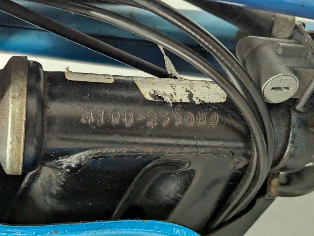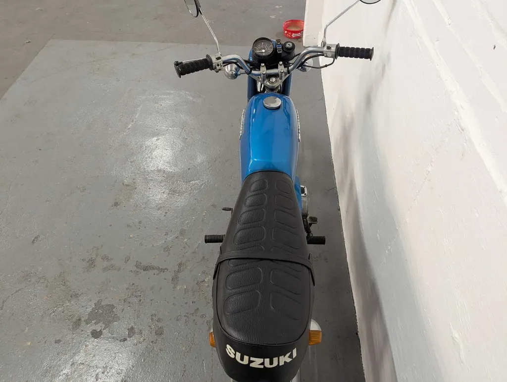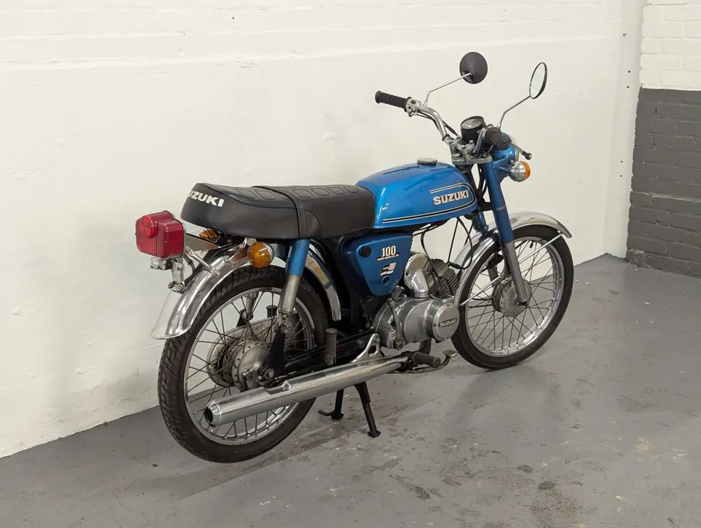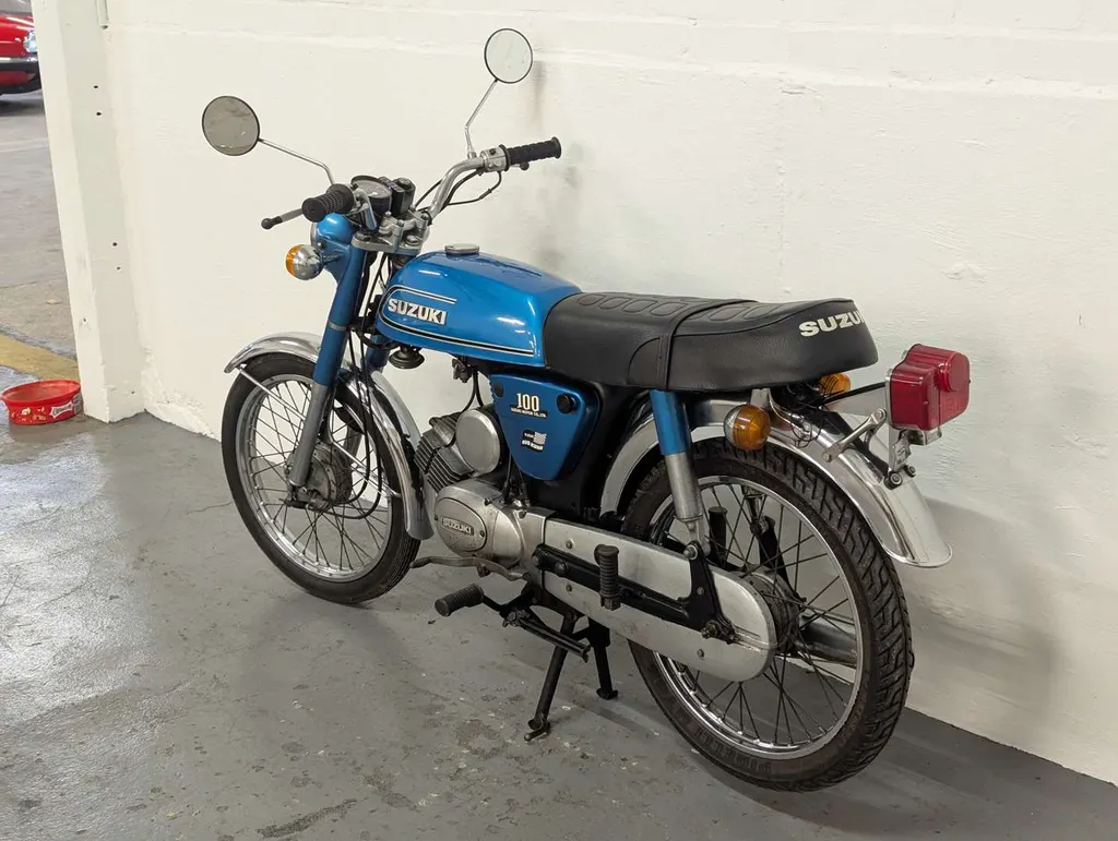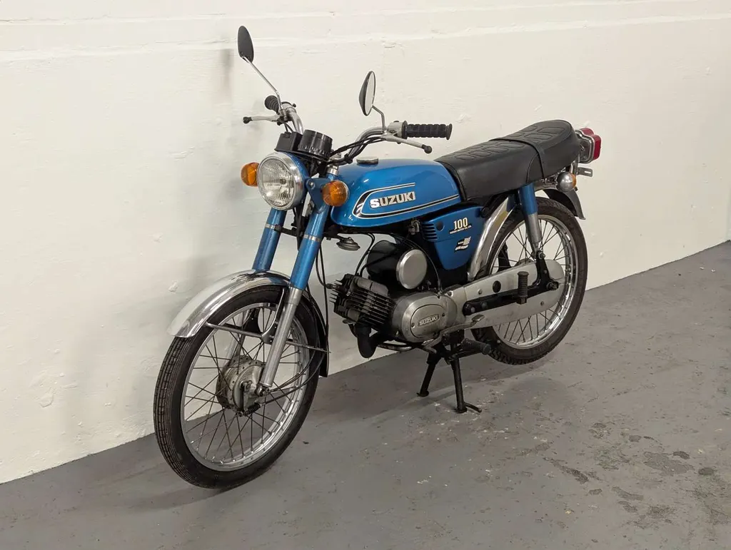 98cc. This Suzuki A100 has been off the road for several years. It was last MoT'd in 2014 at 13,010 miles and has covered one mile since. DVLA records show a colour change from red to blue in 1978. Comes with V5 and MoT history for 2006, 2007 and 2014. Five registered owners from new Not specified