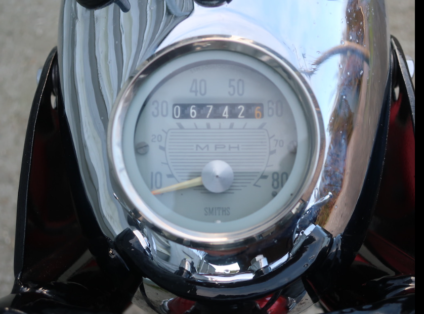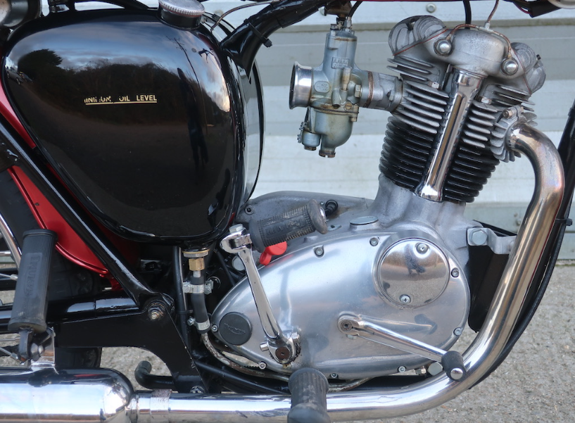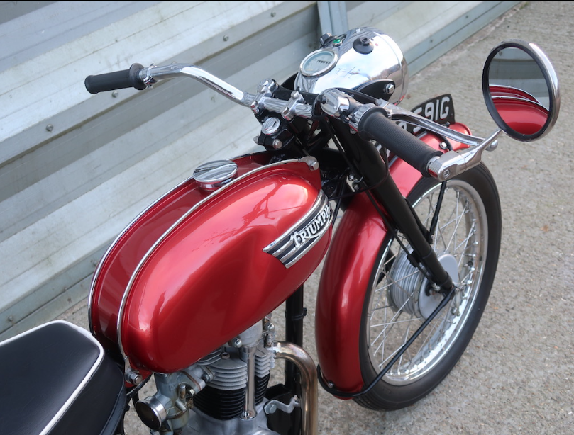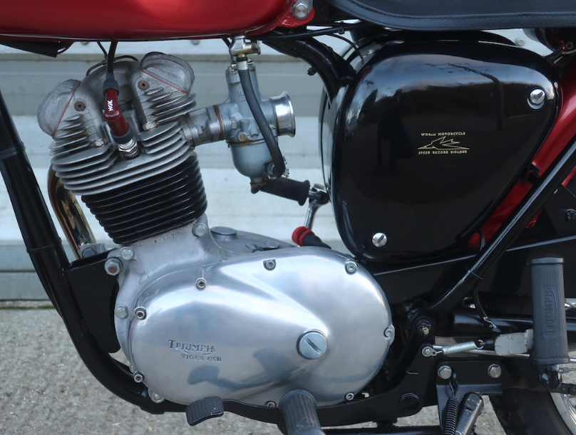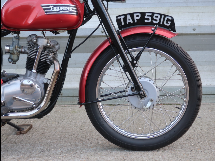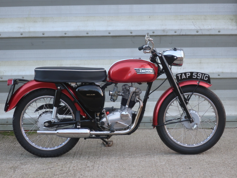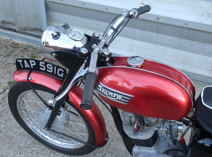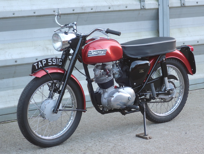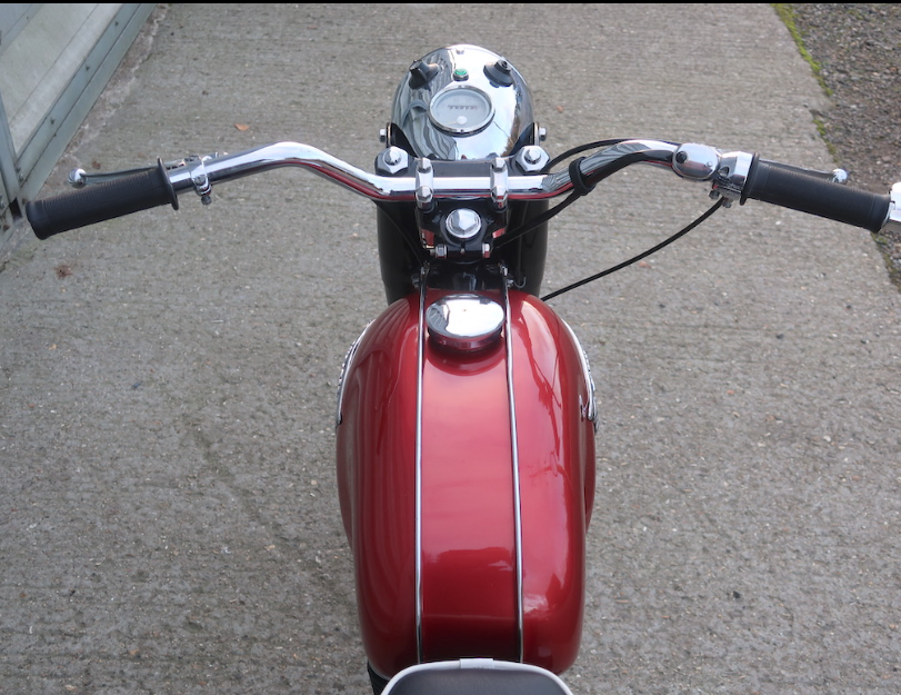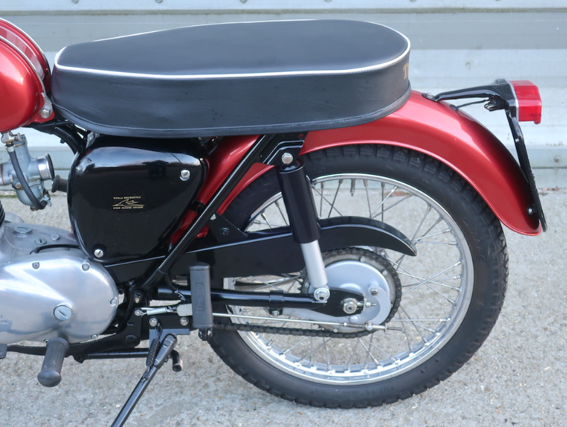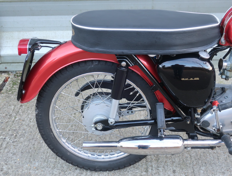 Triumph had been owned by BSA since the early 1950’s and gradually started to share components on their models to save on manufacturing costs. As such the some of the Tiger Cub production was moved from the Triumph factory in Meriden ( Coventry ) up the road to the the BSA factory in Small Heath Birmingham in 1966. Thus the T120B ‘Bantam Cub’ was born utilising the 200cc Triumph Tiger Cub engine in the Bantam D7 and later D10 frames creating the best of both worlds, the powerful Cub engine and the stronger long wheel base Bantam frame. This fine example registered 1966 and is one of only about 2,500 built. Comprehensively restored in 2016 it comes with a history file detailing some of the work which included an engine rebuilt. Still on 6v points ignition it remains in good running order and in very nice overall condition. This matching numbers bike showing 6742 miles is also supplied with a workshop manual and parts book.