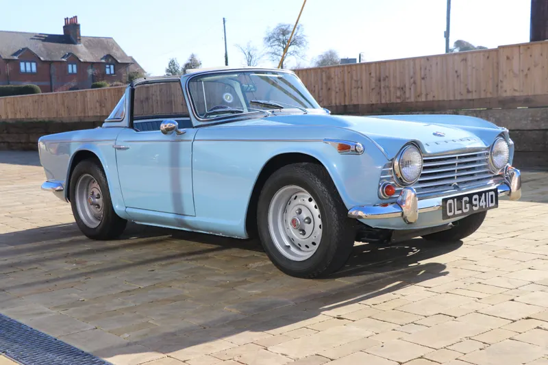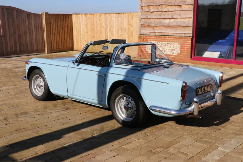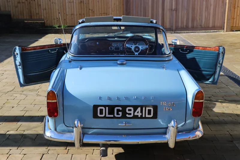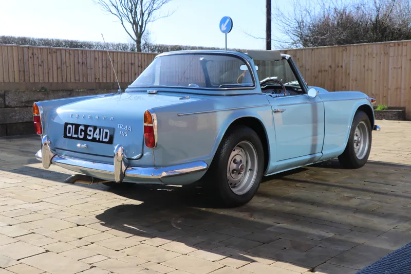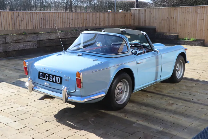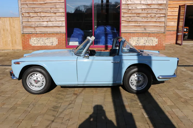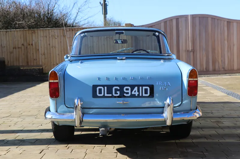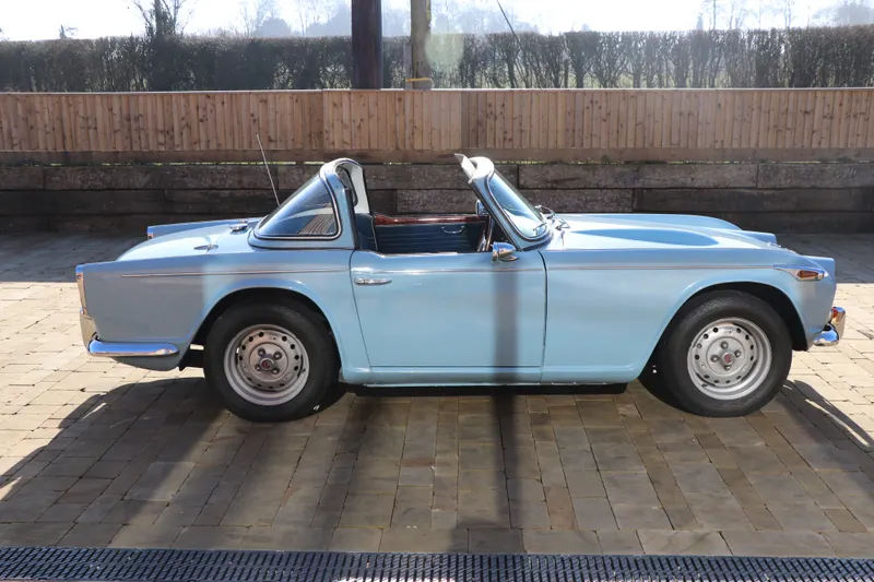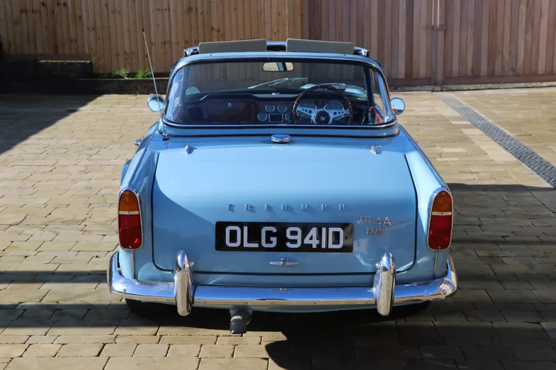 This a lovely example of the Triumph TR4A. The TR4 was always a great looking car designed by Italian stylist Michelotti, however in 1965 it was upgraded to the TR4A, this major upgrade bought with it all new independent rear suspension (IRS) which provided significantly improved ride and handling. Mechanically this car has the benefit of electronic ignition and an electric cooling fan with a spin on oil filter, a narrow belt alternator and a pair of refurbished Stromberg 175CD carbs. The exhaust system is stainless steel from manifold to tailpipe. The overdrive system works entirely as it should on second, third and fourth gears giving a total of seven gears! Underneath the car has been protected with stone guard treatment and wheel arch liners and is in very good condition. The interior is in excellent condition with a recently installed burr elm dashboard and door card tops and a new wooden gear knob and three spoke Moto Lita steering wheel, carpets are all new and additional soundproofing has been added under these. Another great feature of this car is the “Surrey Top” which gives the option of a targa top and open air driving. The car comes with a comprehensive list of paperwork and receipts.