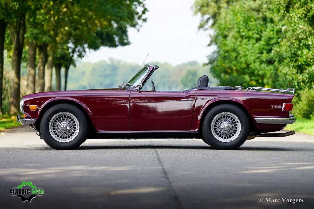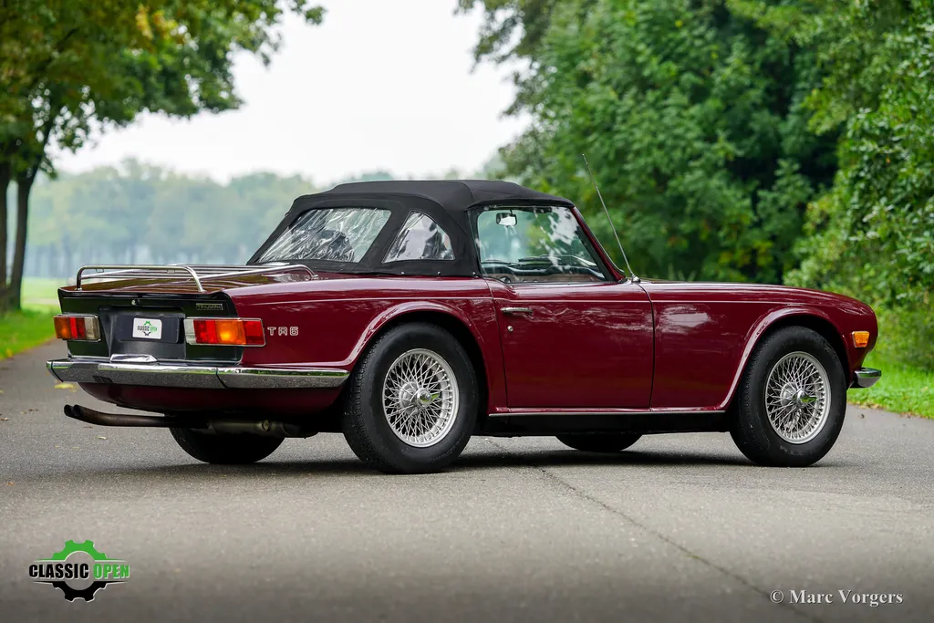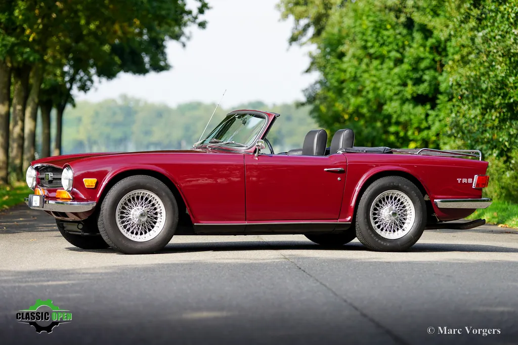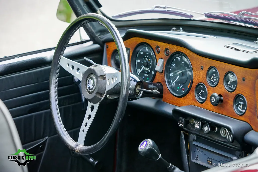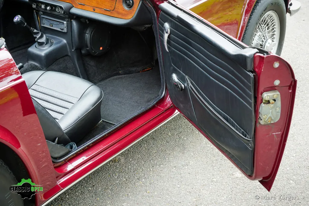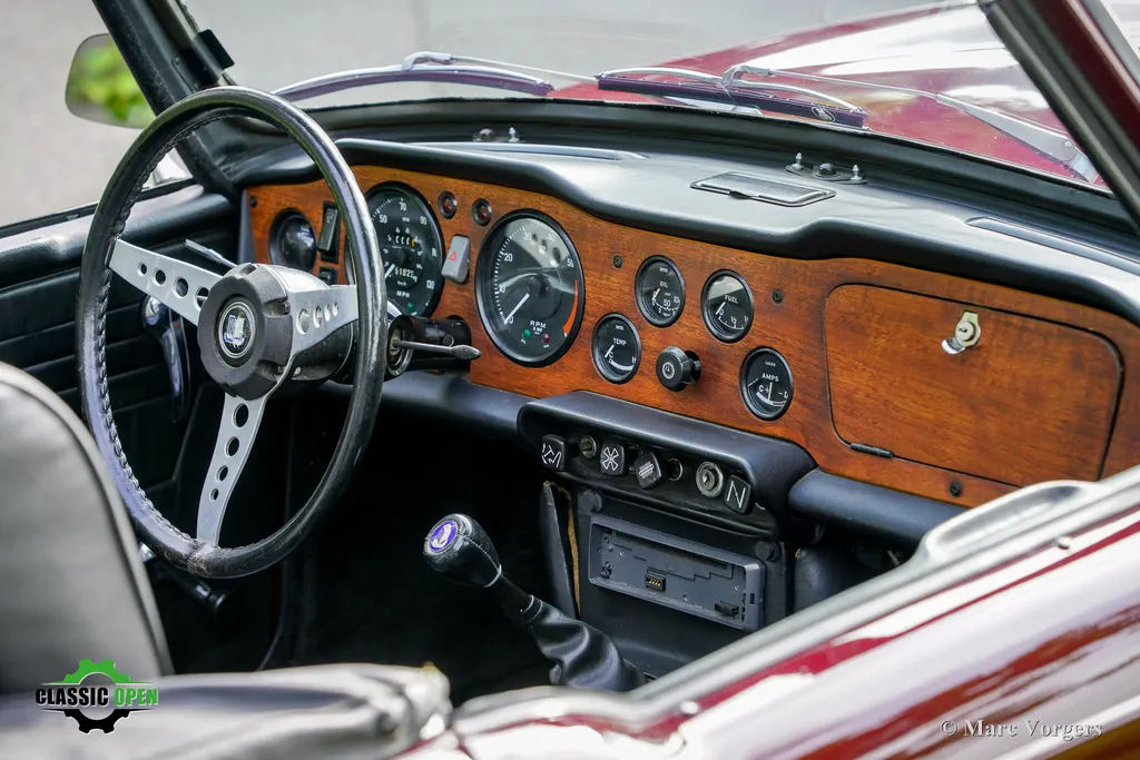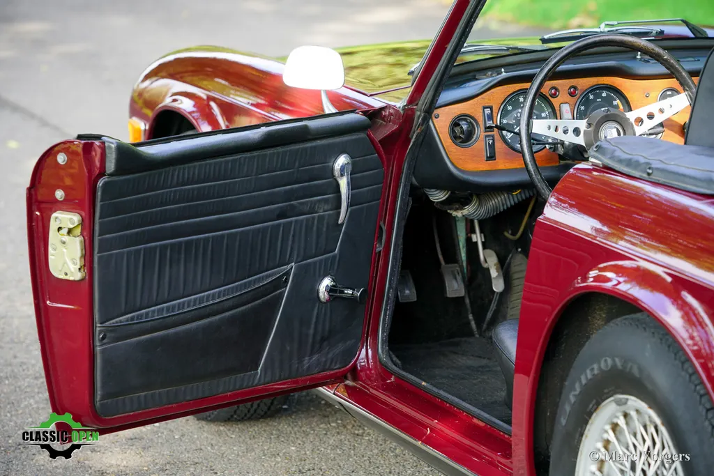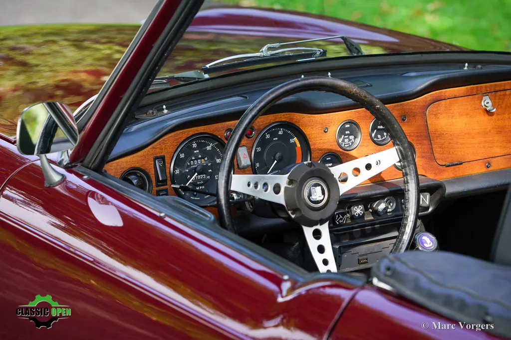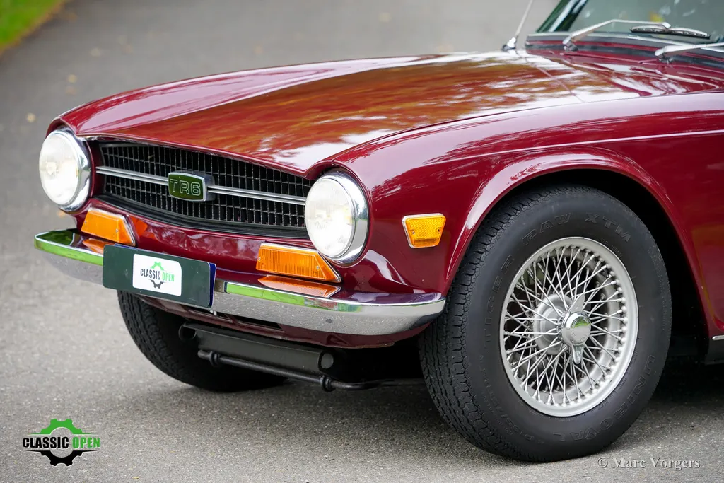 Triumph TR6, year 1969. Bodywork finished in dark red (Damson) combined with a black faux leather interior and a black mohair soft-top. This fantastic Triumph TR6 was sold new in the USA and imported to the Netherlands in 1999. The car has known only one caring owner ever since. This Triumph TR6 is a seldom seen early version still sporting unique details like the safety seats with the high headrests and the unique 3-spoke steering wheel with holes in the spokes. The headrests are foldable to make it possible to fit a tonneau cover. The car was fully repainted and given new upholstery and carpet in the past. SU carburettors were fitted, electronic ignition, and sports air-filters. The suspension was fitted with ‘road-spec’ polyurethane bushes. This magnificent early TR6 shows all the original details, it drives and sounds delightfully and is in a very good condition! Cars coming from long year caring active ownership are the best driver cars you can buy in our opinion. This wonderful example features the coveted overdrive option and silver metallic painted wire wheels with chrome ‘knock on’ wheel nuts and a chrome baggage rack. A British Motor Heritage certificate is also present. The Triumph TR6 is the British sports car that gives the most driving fun for its money, and it is practical and comfortable enough to be enjoyed for weekend road trips and ‘pan European’ holiday trips! We speak Dutch, English , German and French. Our cars can be delivered with Dutch, German or Belgium registration. We can assist with the French registration. Transport to your door is possible. We have our own workshop facility with 30 years experience with classic cars.