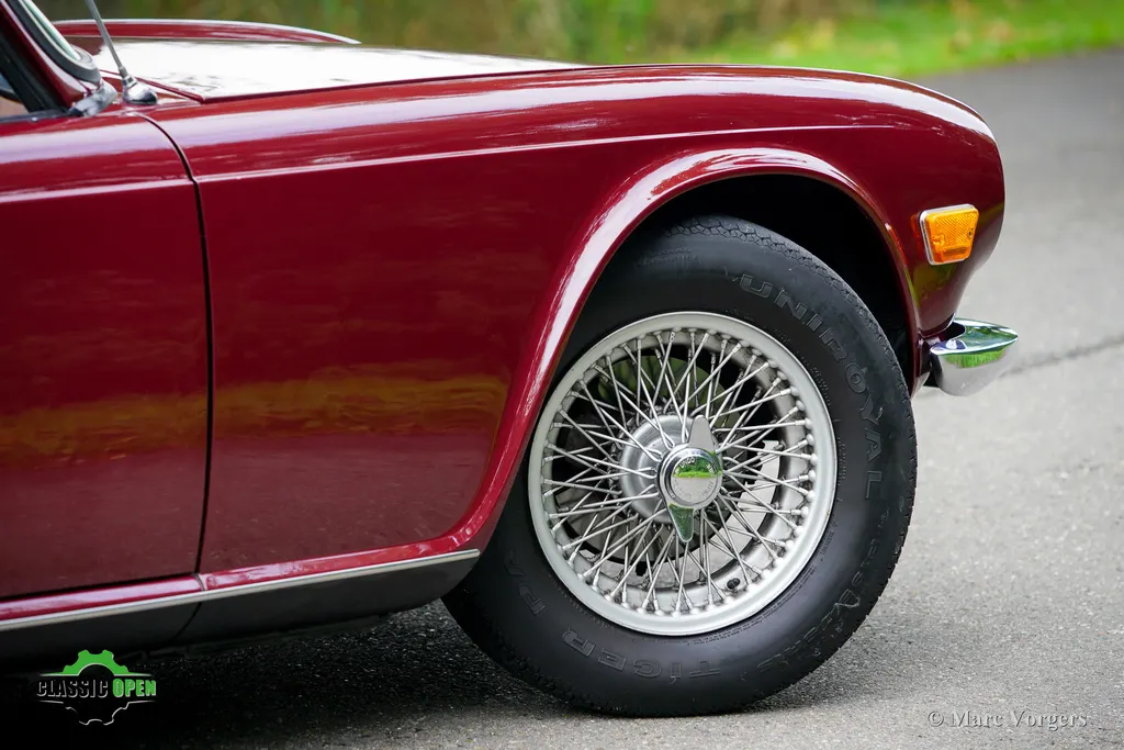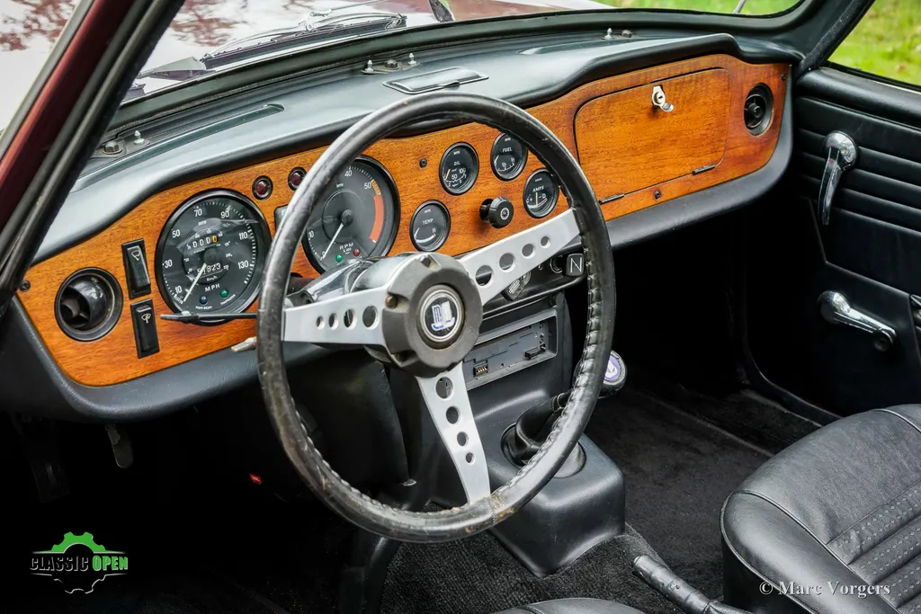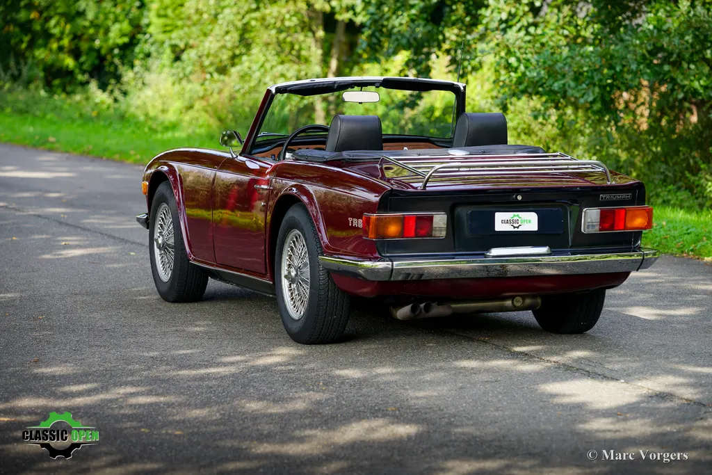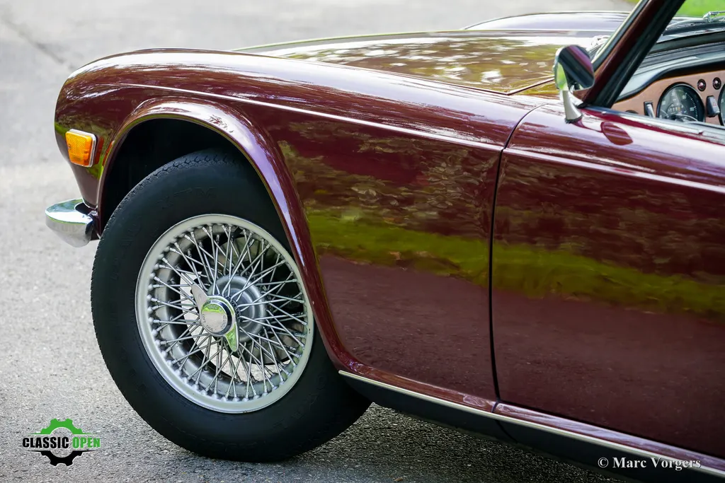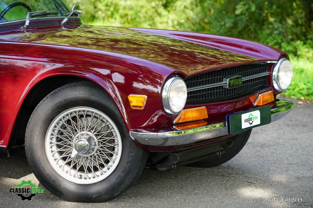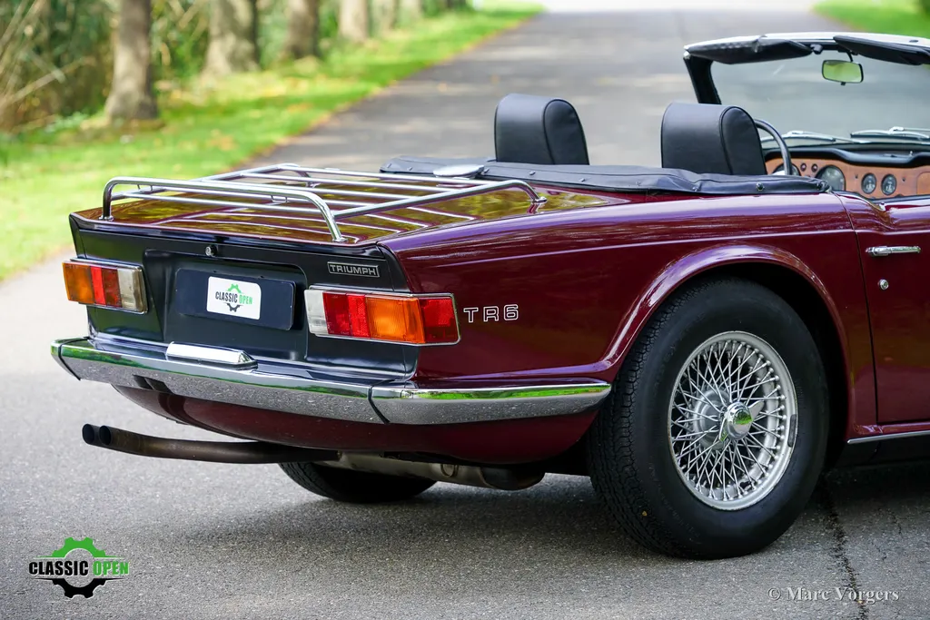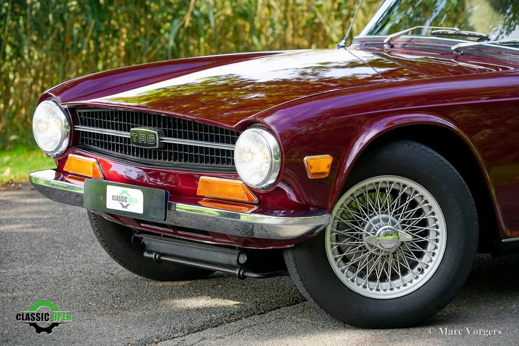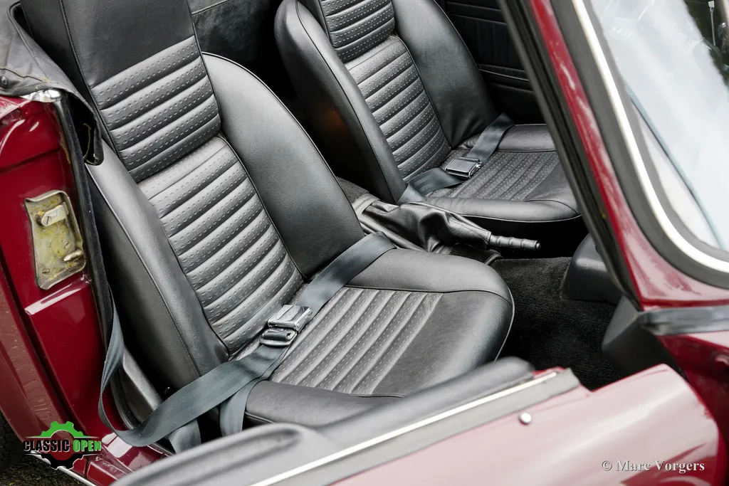 Triumph TR6, year 1969. Bodywork finished in dark red (Damson) combined with a black faux leather interior and a black mohair soft-top. This fantastic Triumph TR6 was sold new in the USA and imported to the Netherlands in 1999. The car has known only one caring owner ever since. This Triumph TR6 is a seldom seen early version still sporting unique details like the safety seats with the high headrests and the unique 3-spoke steering wheel with holes in the spokes. The headrests are foldable to make it possible to fit a tonneau cover. The car was fully repainted and given new upholstery and carpet in the past. SU carburettors were fitted, electronic ignition, and sports air-filters. The suspension was fitted with ‘road-spec’ polyurethane bushes. This magnificent early TR6 shows all the original details, it drives and sounds delightfully and is in a very good condition! Cars coming from long year caring active ownership are the best driver cars you can buy in our opinion. This wonderful example features the coveted overdrive option and silver metallic painted wire wheels with chrome ‘knock on’ wheel nuts and a chrome baggage rack. A British Motor Heritage certificate is also present. The Triumph TR6 is the British sports car that gives the most driving fun for its money, and it is practical and comfortable enough to be enjoyed for weekend road trips and ‘pan European’ holiday trips! We speak Dutch, English , German and French. Our cars can be delivered with Dutch, German or Belgium registration. We can assist with the French registration. Transport to your door is possible. We have our own workshop facility with 30 years experience with classic cars.