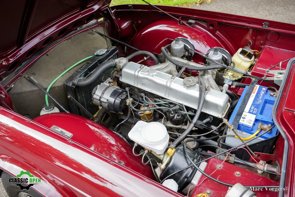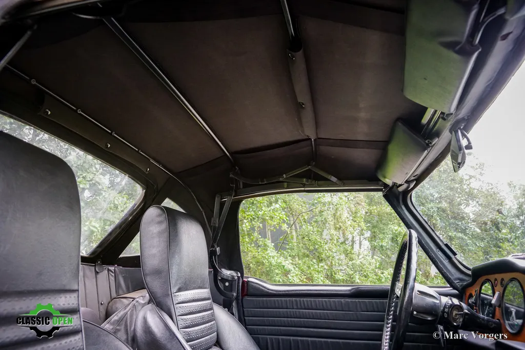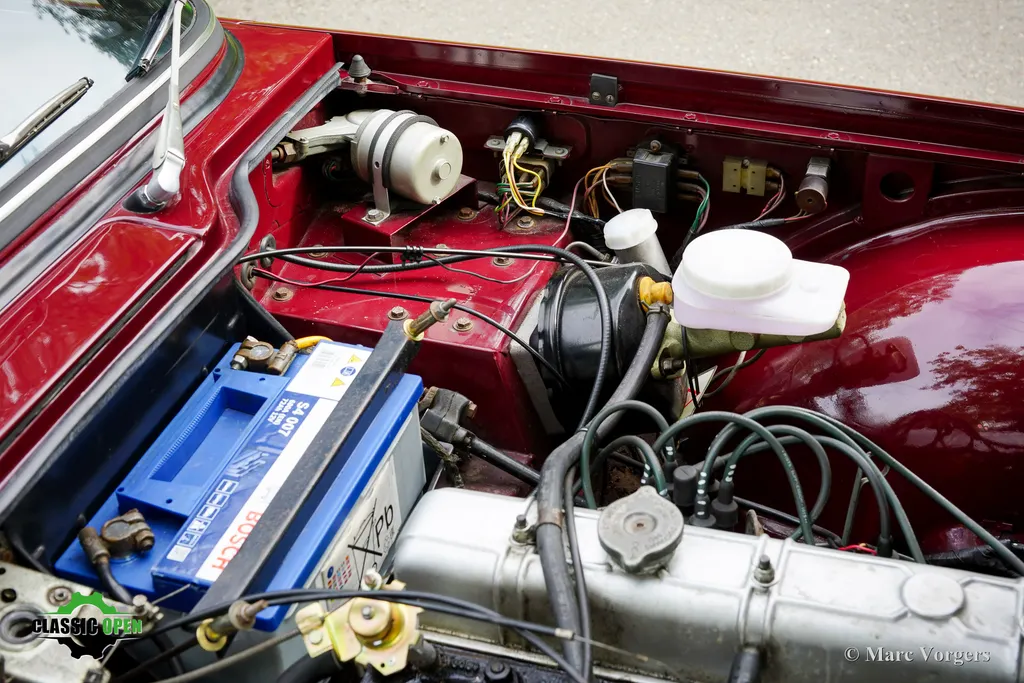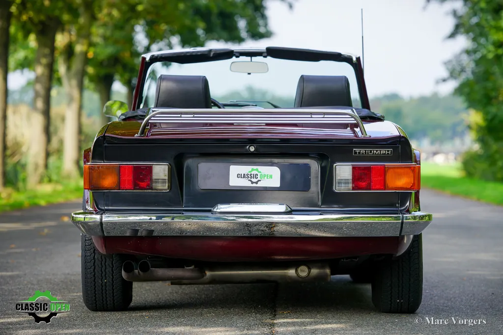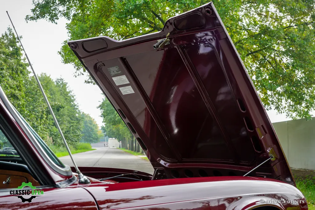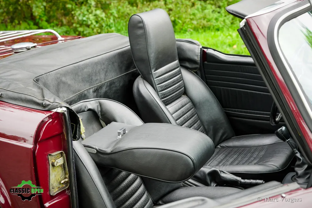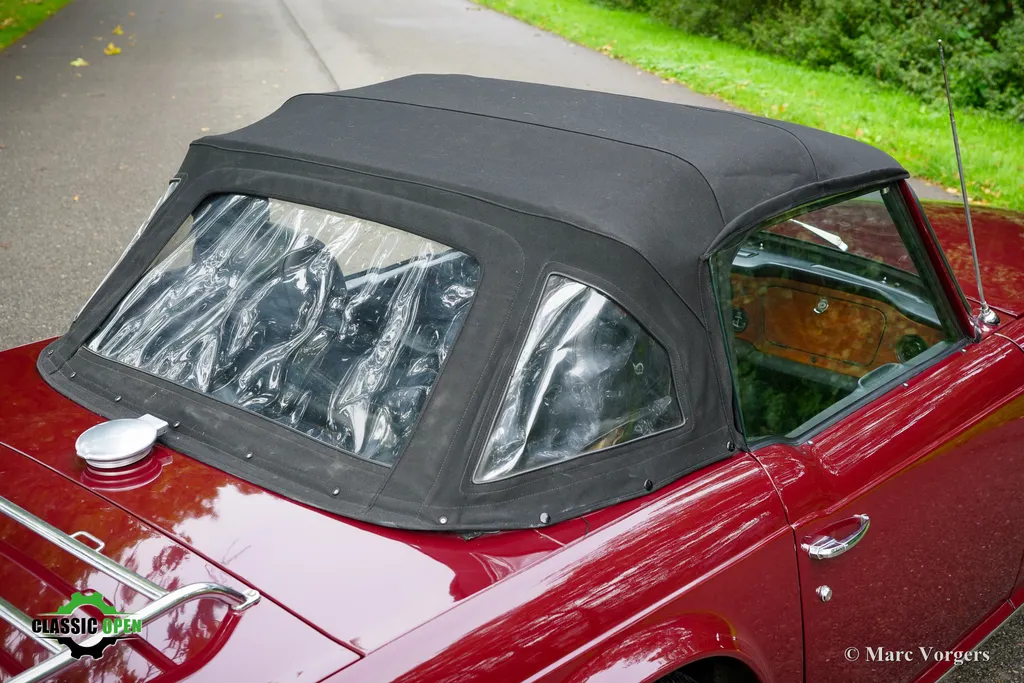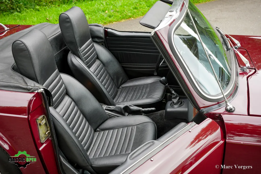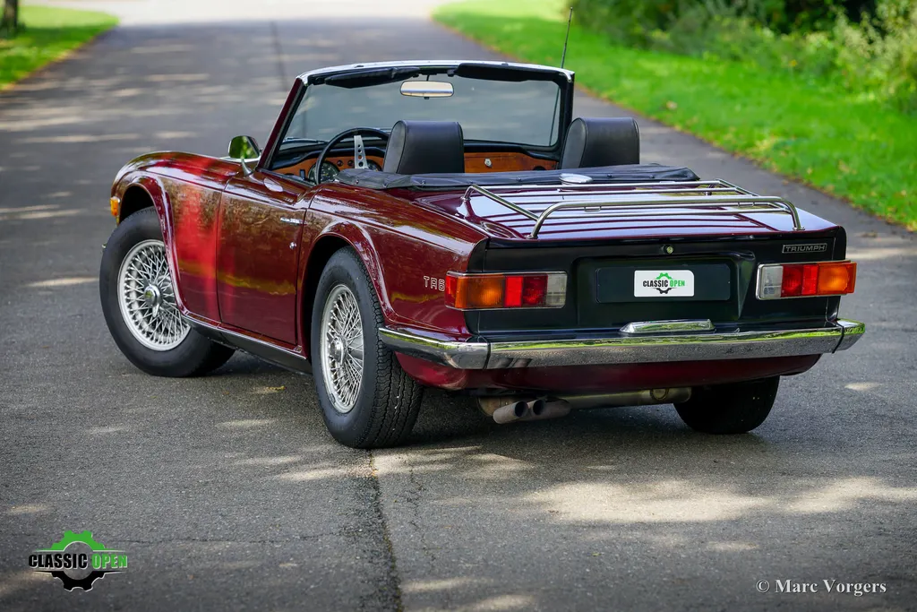Triumph TR6, year 1969. Bodywork finished in dark red (Damson) combined with a black faux leather interior and a black mohair soft-top. This fantastic Triumph TR6 was sold new in the USA and imported to the Netherlands in 1999. The car has known only one caring owner ever since. This Triumph TR6 is a seldom seen early version still sporting unique details like the safety seats with the high headrests and the unique 3-spoke steering wheel with holes in the spokes. The headrests are foldable to make it possible to fit a tonneau cover. The car was fully repainted and given new upholstery and carpet in the past. SU carburettors were fitted, electronic ignition, and sports air-filters. The suspension was fitted with ‘road-spec’ polyurethane bushes. This magnificent early TR6 shows all the original details, it drives and sounds delightfully and is in a very good condition! Cars coming from long year caring active ownership are the best driver cars you can buy in our opinion. This wonderful example features the coveted overdrive option and silver metallic painted wire wheels with chrome ‘knock on’ wheel nuts and a chrome baggage rack. A British Motor Heritage certificate is also present. The Triumph TR6 is the British sports car that gives the most driving fun for its money, and it is practical and comfortable enough to be enjoyed for weekend road trips and ‘pan European’ holiday trips! We speak Dutch, English , German and French. Our cars can be delivered with Dutch, German or Belgium registration. We can assist with the French registration. Transport to your door is possible. We have our own workshop facility with 30 years experience with classic cars.