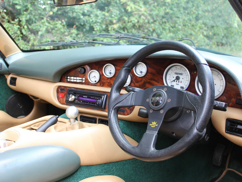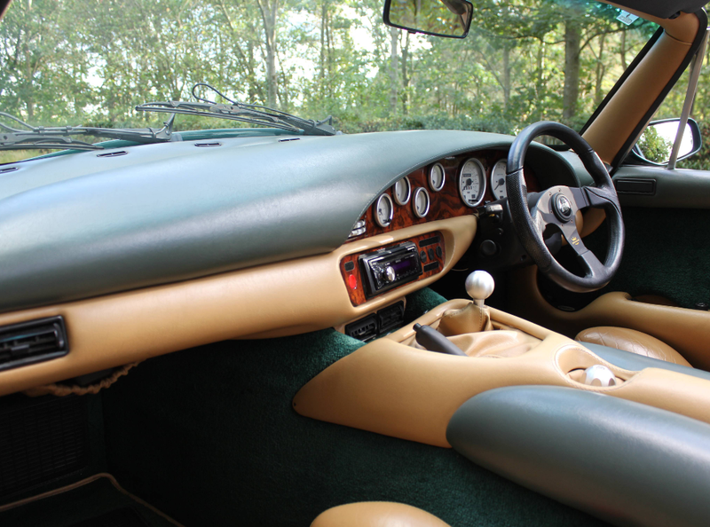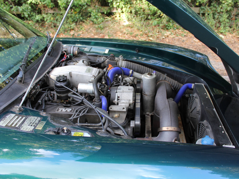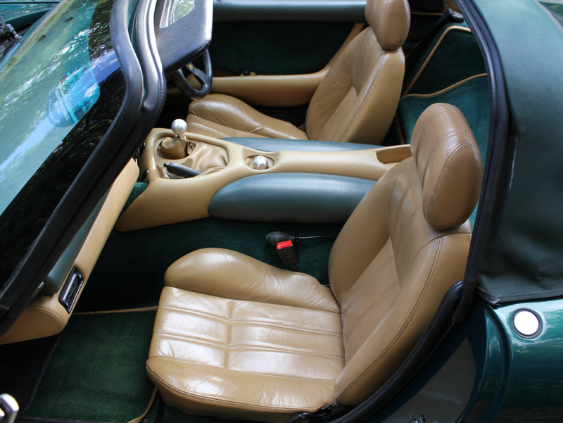 This 1996 TVR Chimaera 400 in British Racing Green is a striking example of a classic British sports car, blending raw performance with distinctive styling. N697 MAM is a very well maintained and usable example that has benefitted from a recent course of meticulous ownership. Currently presenting with only 76,000 miles a fastidious maintenance throughout its history, this TVR is a brilliant choice of a classic roadster. Services in the book are documented at 919, 2129, 5553, 6619, 10078 12885, 12996, 13879, and 16450 miles with David Hendry Cars, the supplying dealer of this TVR. Further stamps are recorded at 22428, 28092, 34542, 40427, 50423, 60558, 61445, and 73460 miles. In addition to the fantastic service history, the recent owner compiled a list of works carried out throughout his enjoyable ownership between touring the country. In 2021, the TVR was treated to a recommissioning of the suspension to include new shock absorbers, new wishbones, new rear springs, both roll bars, as well as having the track rod ends, steering rack boots replaced. Routine maintenance was thorough with a gearbox oil change being carried out, air filter, fuel filter and plugs being replaced. 2023 saw the Chimera with new front discs and pads, rear discs and pads, a new handbrake cable and another engine service. N697 MAM is a brilliant two-seater convertible, built by TVR, it's a roadster designed for driving enthusiasts, offering a balance of power, lightweight construction, and a more refined touring experience compared to its sibling, the TVR Griffith. This Chimaera 400 in British Racing Green exudes timeless elegance with its deep, glossy green finish, a color synonymous with British automotive heritage. The lightweight fiberglass body, a hallmark of TVR's construction, gives the car its sleek, curvaceous lines. Inside the TVR you are met with a blend of functionality and quirky British character, designed to accommodate taller drivers (thanks to TVR boss Peter Wheeler's own stature). Luggage room is plentiful, with a capacious boot and plenty of cabin room, it makes for a superbly practical car for long weekends away.At the heart of the Chimera is a 4.0-liter Rover V8 engine, producing 240 horsepower which sings through the rev range hand in hand with precise gear changes throughout the BorgWarner T5 five-speed manual gearbox. The all-around independent suspension gives both a comfortable yet direct feeling throughout winding country roads with help from the reassuring disc brakes and ABS.The TVR Chimaera was TVR's best-selling model, with around 6,000 units produced between 1992 and 2003. The 1996 Chimaera 400, with its facelifted design and refined mechanicals, represents a sweet spot in the lineup, offering a balance of performance and usability. Its BRG livery, paired with the iconic Rover V8 and minimalist engineering, makes it a quintessential British roadster.
