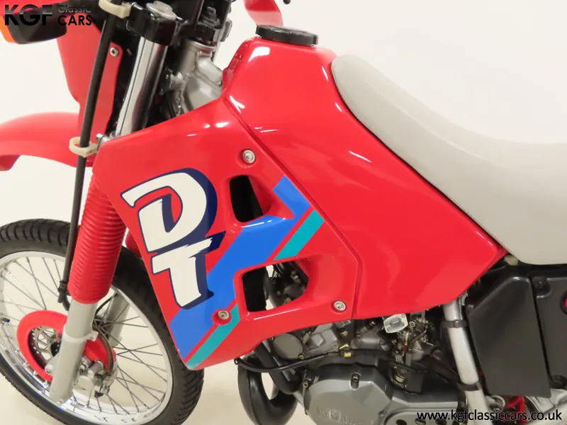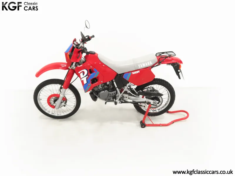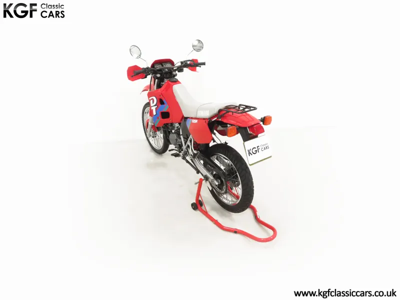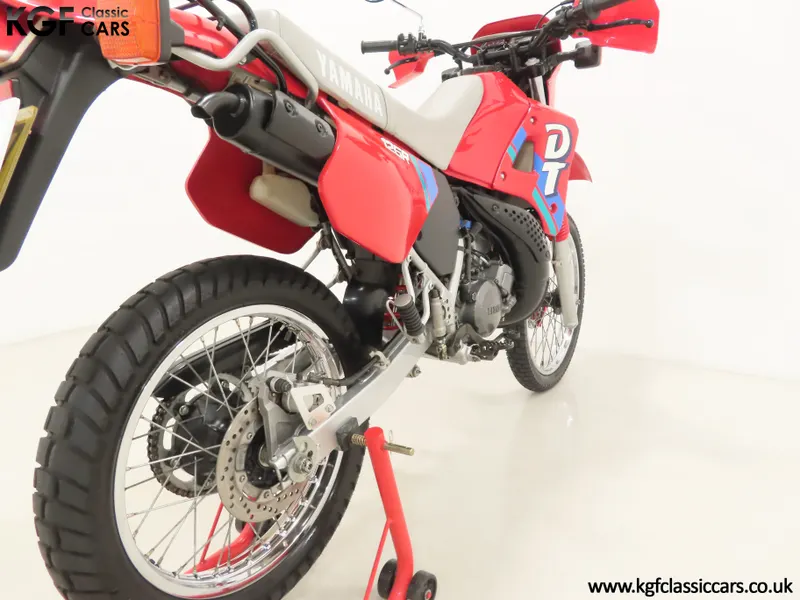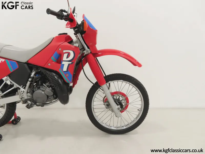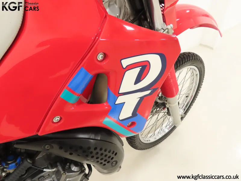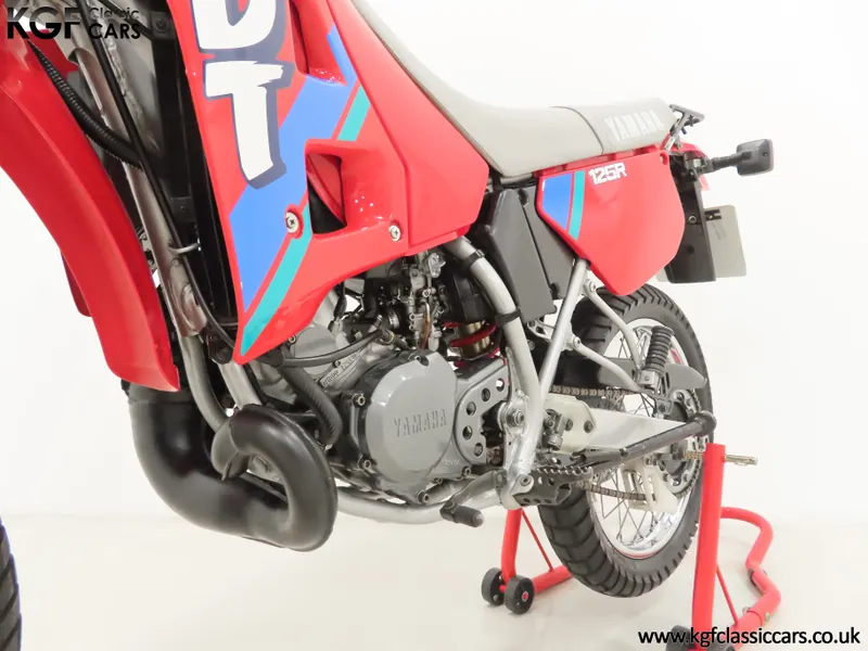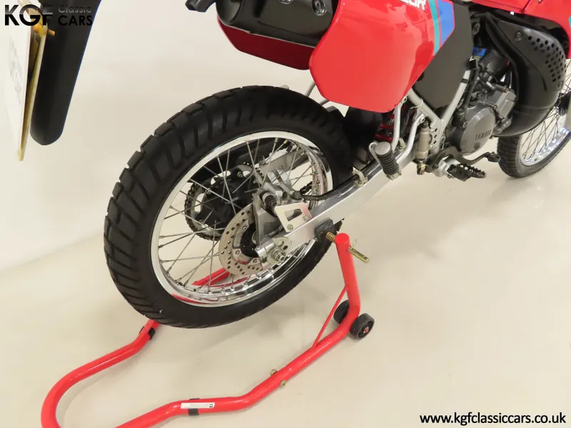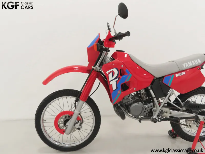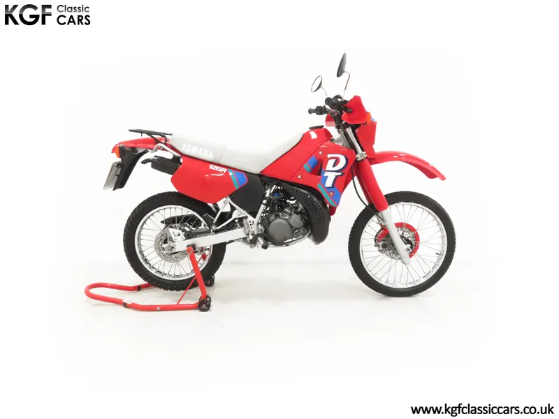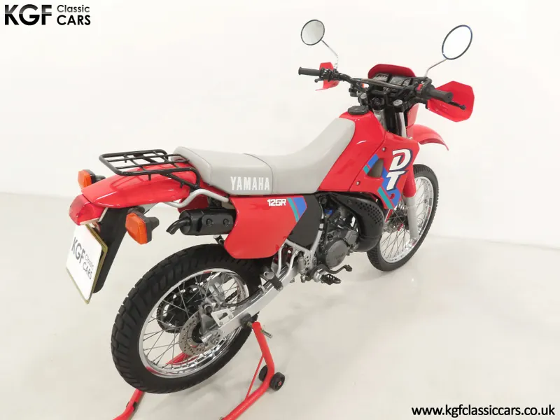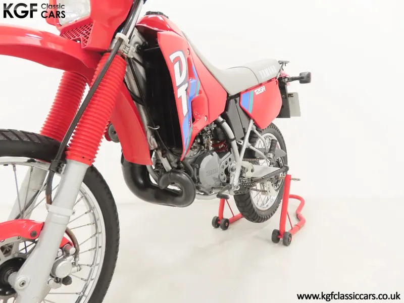 FOR SALE A stunningly pampered Yamaha DT125R stored in the owners lounge! EQUIPMENT Monocross rear suspension with De Carbon type shock absorber, box-section swinging arm, long-travel front forks with 41mm stanchions, lockable fuel filler cap, speedometer, tachometer, water temperature gauge, ignition switch incorporating park light, turn signal switch, headlight switch, neutral indicator, two-stroke oil light, horn, steering lock, rear luggage rack, rear footrests, helmet holder. EXTERIOR Based on race winning YZ motorcross machinery, the Yamaha DT125R was a favoured choice amongst both first time riders and experienced motorcyclists. This stunning original example presents incredibly well with a gloss shine to the bright red 10 litre fuel tank and vibrant factory decals to all undamaged plastic panels. The deeply padded dual light grey seat has no wear or rips with a clear white Yamaha logo and all light units are factory fitment. Honest markings to areas such as the side stand and luggage rack are entirely forgiven and even the olive drab finish is present on components, long lost on poorly stored and restored examples. All dials and gauges function correctly and the switchgear looks like new along with the footrest and gearchange rubbers! The rear mudguard is uncut. It is hard to imagine a nicer existing example of this successful machine. ENGINE & TRANSMISSION Powered by a liquid cooled 2 stroke motor, the DT breathes through a 28mm flat slide Mikuni carburettor which feeds the fuel/air mix straight into the crankcases to give instant throttle response. Advanced features such Yamaha Power Valve System, (YPVS) and Yamaha Energy Induction System, (YEIS), gives strong low and mid-range torque combined with a great top end powerband! Being a French European model, it benefits from being unrestricted. The 6-speed transmission is smooth and precise and helps keep the engine in the sweet spot. WHEELS, TYRES & BRAKES The Takasago chrome wheels have a brilliant mirror shine with slight markings and are shod in premium Continental Escape measuring 2.75-21 upfront and 4.10-18 to the rear for great all-round performance. The DT125R features YZ style drilled discs at the front and rear to dissipate heat, measuring 230mm up front and 220mm to the rear and uses the same caliper and master cylinder as YZ motorcross racers to offer controllable stopping power. HISTORY FILE This fabulous Yamaha DT125R was registered on the 24th June 1991 and was sourced by Unit 5 Motocyles for a discerning bike collector wanting the very best example. Residing on display in a French motorcycles dealers showroom as a one owner bike with only 2,039 miles, it was purchased and UK registered in 2016 and owned by the same collector ever since. On display in his lounge it has been well maintained with light regular use and now has a documented 3,579 miles, (5,761km), and performs fabulously, especially being an unrestricted full power YPVS model! The owners testimonial is also included with the history file. Supplied with its handbook, purchase documents, previous MOT certificates, spare keys and brochures, it is ready for the next appreciative enthusiast. MOT July 2026, HPI Clear