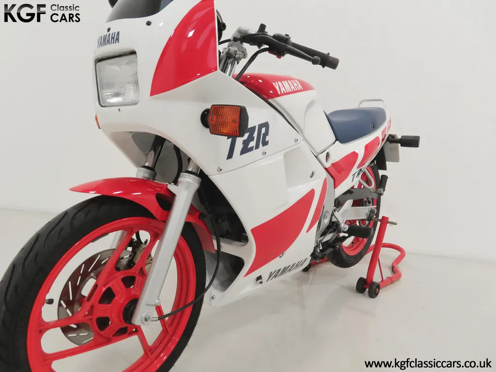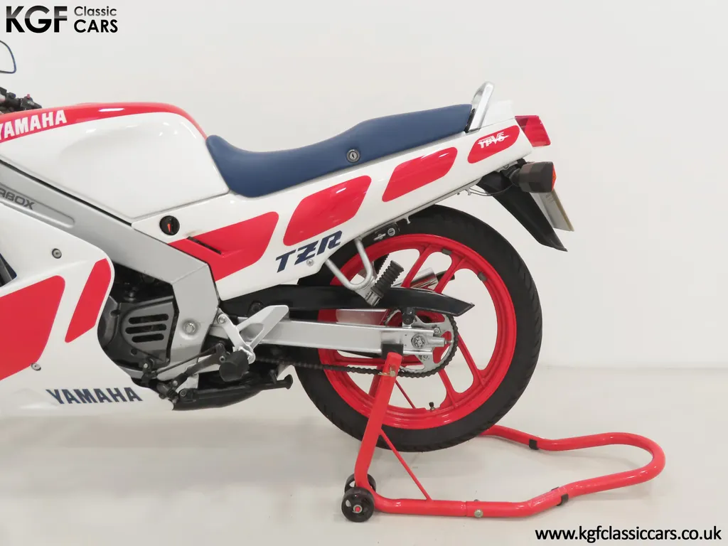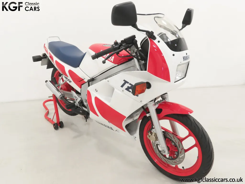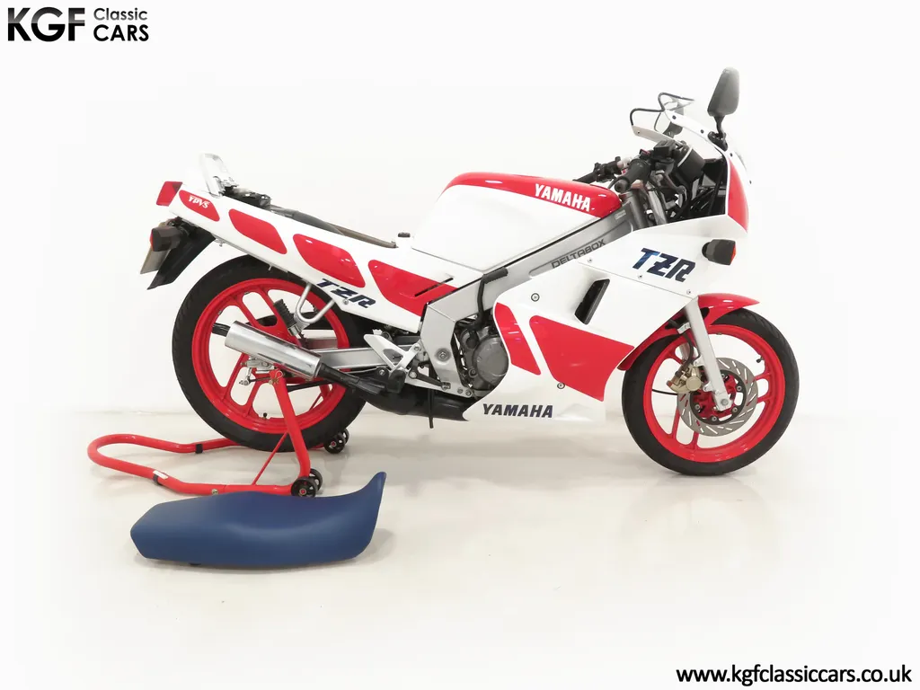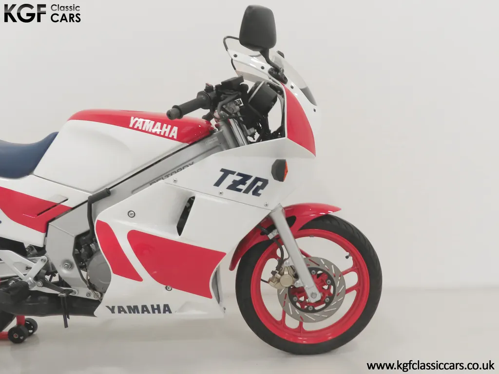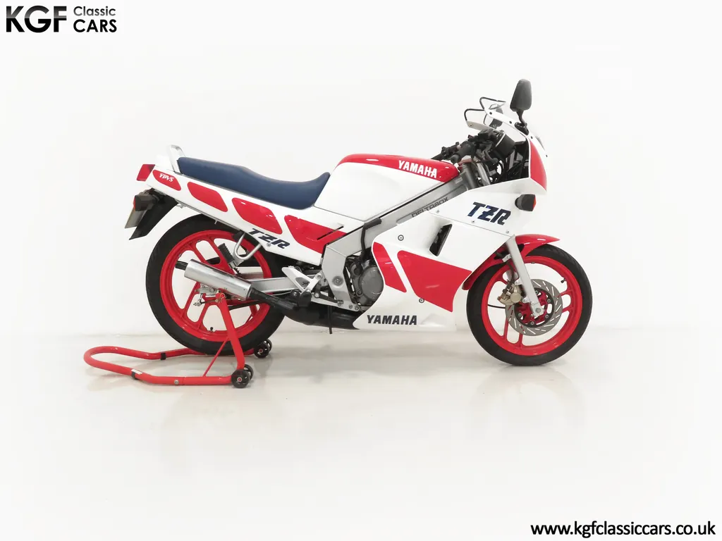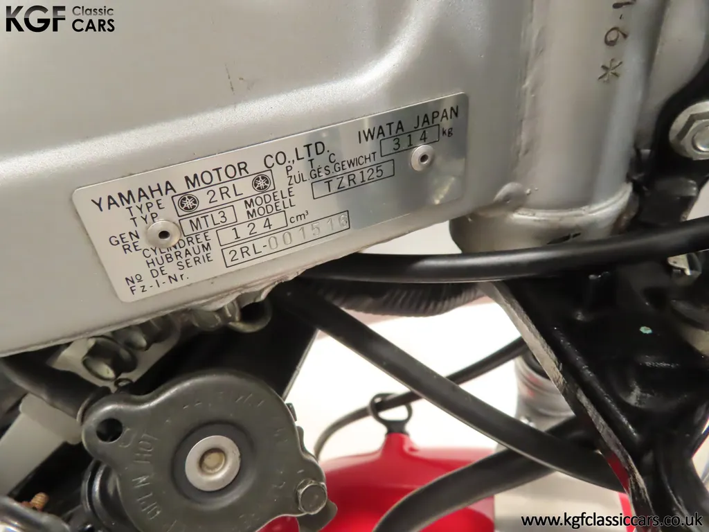 FOR SALE A matching numbers Yamaha TZR125 presented in collector quality condition. EQUIPMENT DELTABOX frame fabricated from high-quality steel pressings, Monocross suspension with box-section high-tensile steel swinging arm, De Carbon-type shock absorber, racer-style clip-on handlebars, rectangular headlight, windscreen, twin rear view mirrors, 12 litre fuel tank with flush-fitting aircraft-type cap, square tube passenger grab rail, cast alloy triple-spoke wheels, YEIS (Yamaha Energy Induction System) boost chamber, YPVS (Yamaha Power Valve System), liquid cooling, speedometer, tachometer, water temperature gauge, ignition switch incorporating park light, turn signal switch, headlight switch, neutral indicator, horn, steering lock, rear footrests, locking helmet holder. Factory Options: Full fairing kit. EXTERIOR Following on from the traditions of Yamaha’s famous RD models but taking on groundbreaking technology, the TZR125 was yet another world-beating supersports lightweight machine. This exceptional specimen is finished in the red and white colour scheme that the bike and the optional full fairing was made with. Many components of this example are unrestored with the exception of the stunning paintwork to the tank and fairings that was entrusted to renowned Pauls Custom Paintwork of West Kingsdown who specialises in ‘all paint no stickers’ finishing. The white is done in Pearl finish so, at a glance, it appears standard but in sunlight it looks amazing with a pearl fleck. Originality is seen extensively with the original olive drab green finish to fittings as well as factory switchgear, hand grips and foot peg rubbers. The windscreen shows some faint stress crazing to the top section. Light patina to the unrestored components is fully acceptable and the bike showcases the perfect mix of pleasing originality and flawless paintwork. The seat is professionally retrimmed in the correct blue covering, underneath which is the original Yamaha toolkit. This is a very special bike. ENGINE & TRANSMISSION Powered by a liquid cooled 2 stroke motor, this TZR125 is basically half of Yamaha’s sensational TZR250 which is itself based directly on the World Championship-winning TZ road racers. Featuring the Mikuni VM26SS carburettor as well as technological advancements at the time such Yamaha Power Valve System, (YPVS) and Yamaha Energy Induction System, (YEIS). This being a French European model, it benefits from being unrestricted with full use of the fully operational YPV System. The engine number is stamped to the left side of the engine casing and matches that of the clearly visible frame stock stamp and VIN plate to confirm this as a matching numbers machine. The original Yamaha 2RL-14711 exhaust remains fitted. The 6-speed transmission is precise and the factory fitted strengthened clutch and wider final chain drive enables it to cope with the extra power. WHEELS, TYRES & BRAKES The cast alloy triple-spoke wheels retain the original unrestored red finish with prominent cast stampings and are shod in premium Michelin PilotStreet 80/90-16 front and 100/90-18 rear tyres. The TZR features a hydraulic disc front brake with slotted rotor to aid cooling and a correct gold finish opposed-piston caliper. The rear brake incorporates a weatherproof drum integral with the wheel. A great combination to generate maximum braking force. HISTORY FILE This amazing Yamaha TZR125 is a French European example that was brought into the UK in 2018 believed to be a one owner bike. The bike is UK registered on an age-related D prefix and fully roadworthy with valid MOT until May 2026. A Dating Certificate from Paul Dawkins, Motorcycle Historian and Dating Officer at the UK based Aircooled RD Club, confirms the bike was manufactured in June 1987 and that the colour and component specification is correct for the model year. Purchased and UK registered in 2019 and owned by the same collector ever since, the bike has been on display in his home showroom alongside many other 1980’s motorcycles, cars and retro memorabilia including an unused Sinclair C5! It has been well maintained with light regular use and performs fabulously, especially being an unrestricted full power YPVS model! The owner’s testimonial is also included with the history file. Supplied with its handbook, UK registration documents, previous MOT certificates and brochure, it is ready for the next appreciative enthusiast. MOT May 2026, HPI clear.