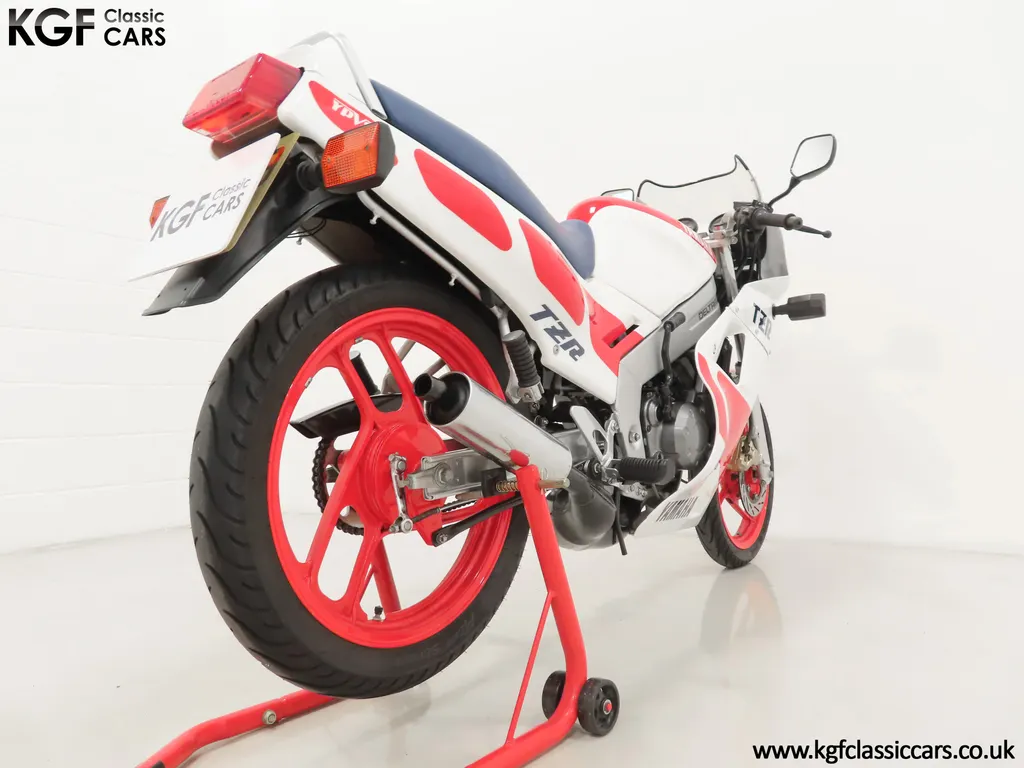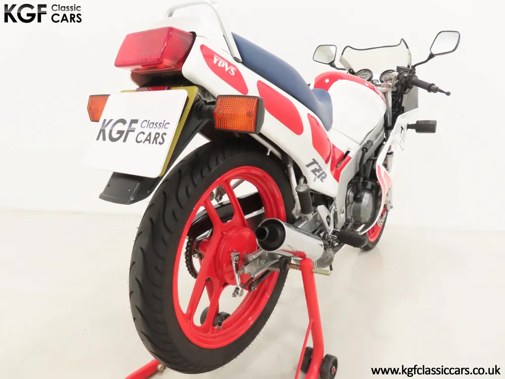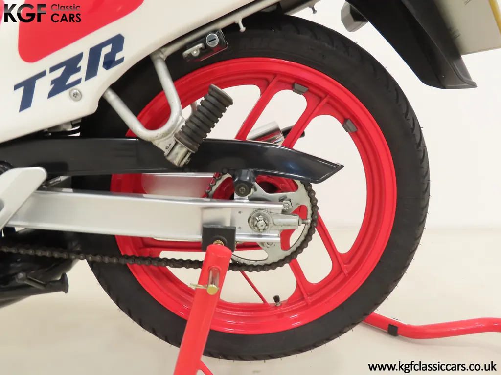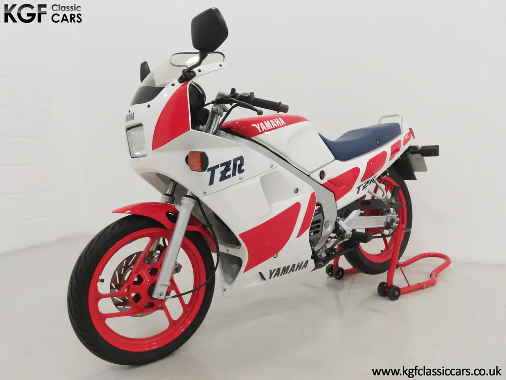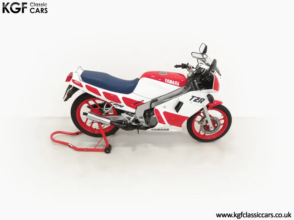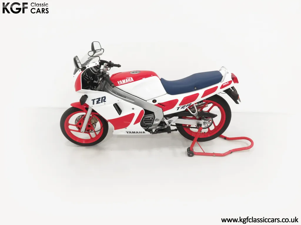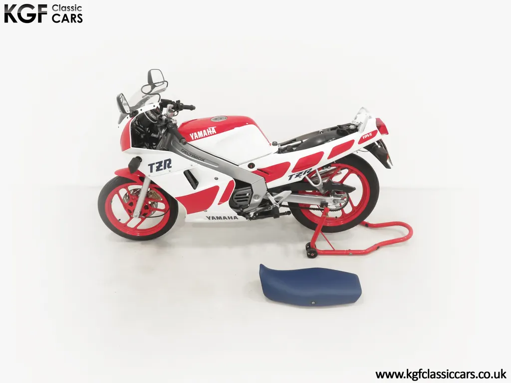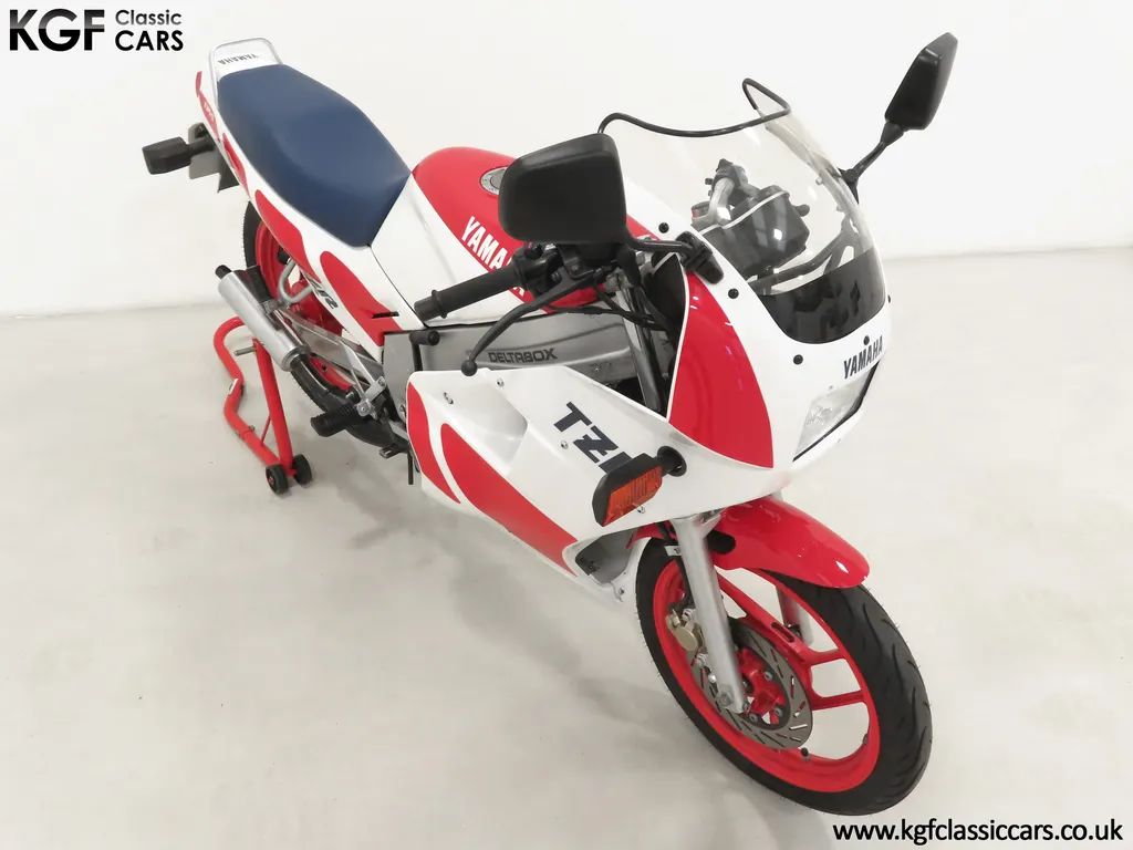 FOR SALE A matching numbers Yamaha TZR125 presented in collector quality condition. EQUIPMENT DELTABOX frame fabricated from high-quality steel pressings, Monocross suspension with box-section high-tensile steel swinging arm, De Carbon-type shock absorber, racer-style clip-on handlebars, rectangular headlight, windscreen, twin rear view mirrors, 12 litre fuel tank with flush-fitting aircraft-type cap, square tube passenger grab rail, cast alloy triple-spoke wheels, YEIS (Yamaha Energy Induction System) boost chamber, YPVS (Yamaha Power Valve System), liquid cooling, speedometer, tachometer, water temperature gauge, ignition switch incorporating park light, turn signal switch, headlight switch, neutral indicator, horn, steering lock, rear footrests, locking helmet holder. Factory Options: Full fairing kit. EXTERIOR Following on from the traditions of Yamaha’s famous RD models but taking on groundbreaking technology, the TZR125 was yet another world-beating supersports lightweight machine. This exceptional specimen is finished in the red and white colour scheme that the bike and the optional full fairing was made with. Many components of this example are unrestored with the exception of the stunning paintwork to the tank and fairings that was entrusted to renowned Pauls Custom Paintwork of West Kingsdown who specialises in ‘all paint no stickers’ finishing. The white is done in Pearl finish so, at a glance, it appears standard but in sunlight it looks amazing with a pearl fleck. Originality is seen extensively with the original olive drab green finish to fittings as well as factory switchgear, hand grips and foot peg rubbers. The windscreen shows some faint stress crazing to the top section. Light patina to the unrestored components is fully acceptable and the bike showcases the perfect mix of pleasing originality and flawless paintwork. The seat is professionally retrimmed in the correct blue covering, underneath which is the original Yamaha toolkit. This is a very special bike. ENGINE & TRANSMISSION Powered by a liquid cooled 2 stroke motor, this TZR125 is basically half of Yamaha’s sensational TZR250 which is itself based directly on the World Championship-winning TZ road racers. Featuring the Mikuni VM26SS carburettor as well as technological advancements at the time such Yamaha Power Valve System, (YPVS) and Yamaha Energy Induction System, (YEIS). This being a French European model, it benefits from being unrestricted with full use of the fully operational YPV System. The engine number is stamped to the left side of the engine casing and matches that of the clearly visible frame stock stamp and VIN plate to confirm this as a matching numbers machine. The original Yamaha 2RL-14711 exhaust remains fitted. The 6-speed transmission is precise and the factory fitted strengthened clutch and wider final chain drive enables it to cope with the extra power. WHEELS, TYRES & BRAKES The cast alloy triple-spoke wheels retain the original unrestored red finish with prominent cast stampings and are shod in premium Michelin PilotStreet 80/90-16 front and 100/90-18 rear tyres. The TZR features a hydraulic disc front brake with slotted rotor to aid cooling and a correct gold finish opposed-piston caliper. The rear brake incorporates a weatherproof drum integral with the wheel. A great combination to generate maximum braking force. HISTORY FILE This amazing Yamaha TZR125 is a French European example that was brought into the UK in 2018 believed to be a one owner bike. The bike is UK registered on an age-related D prefix and fully roadworthy with valid MOT until May 2026. A Dating Certificate from Paul Dawkins, Motorcycle Historian and Dating Officer at the UK based Aircooled RD Club, confirms the bike was manufactured in June 1987 and that the colour and component specification is correct for the model year. Purchased and UK registered in 2019 and owned by the same collector ever since, the bike has been on display in his home showroom alongside many other 1980’s motorcycles, cars and retro memorabilia including an unused Sinclair C5! It has been well maintained with light regular use and performs fabulously, especially being an unrestricted full power YPVS model! The owner’s testimonial is also included with the history file. Supplied with its handbook, UK registration documents, previous MOT certificates and brochure, it is ready for the next appreciative enthusiast. MOT May 2026, HPI clear.